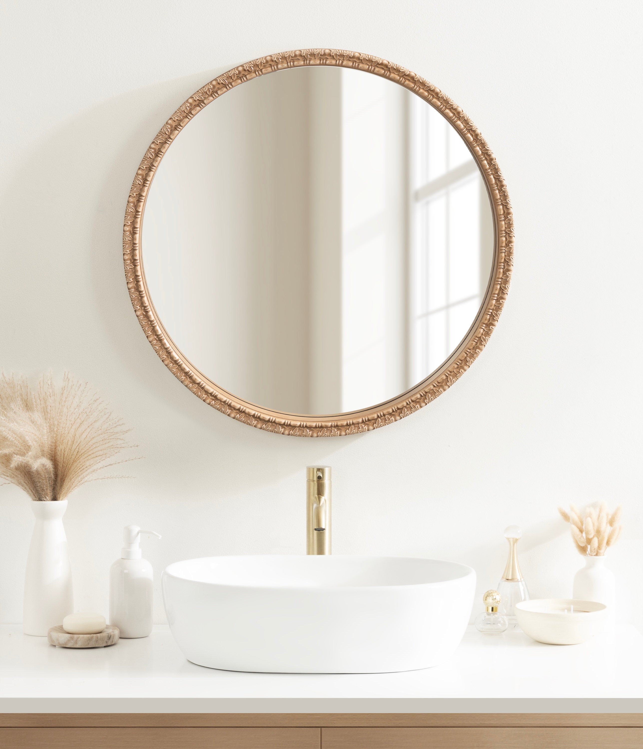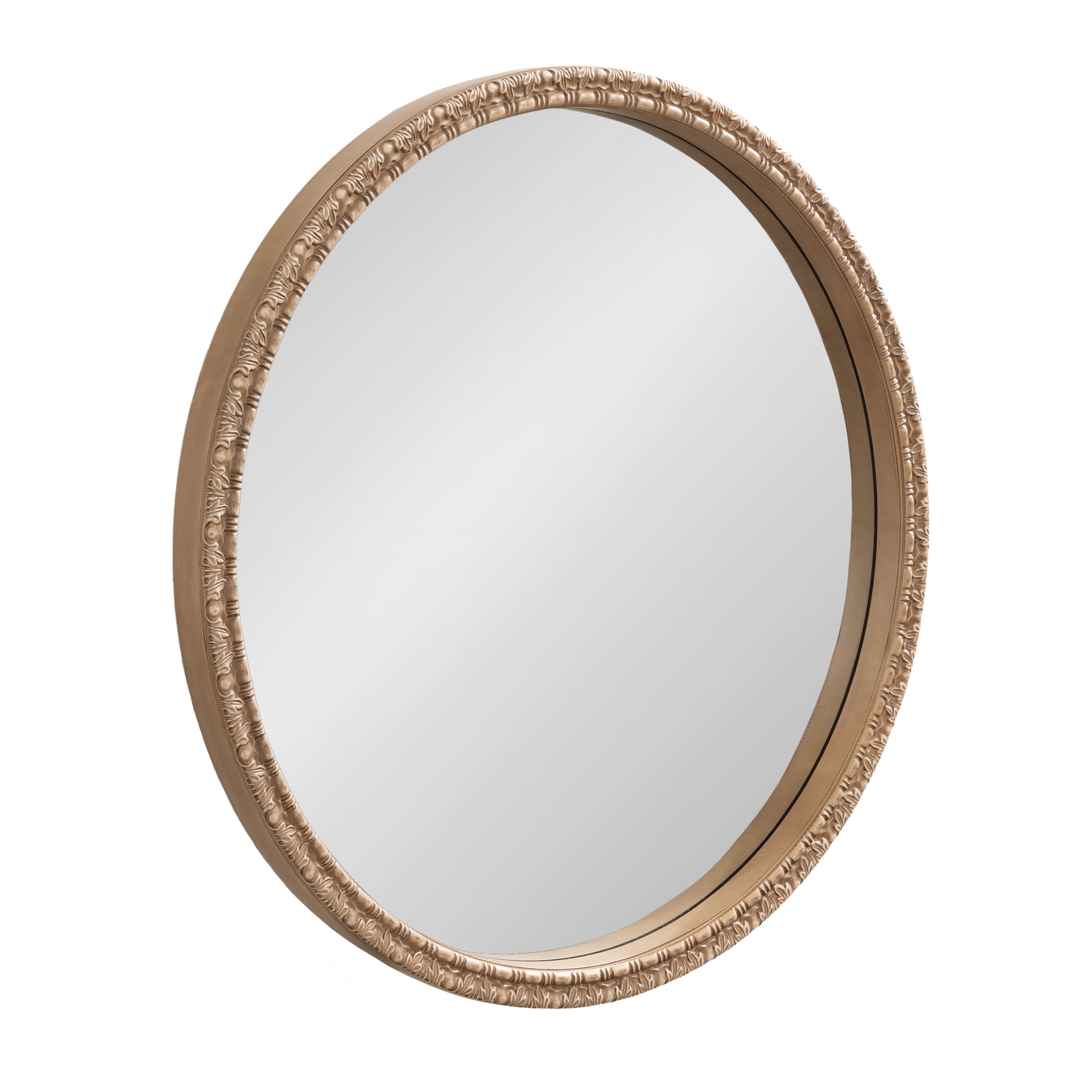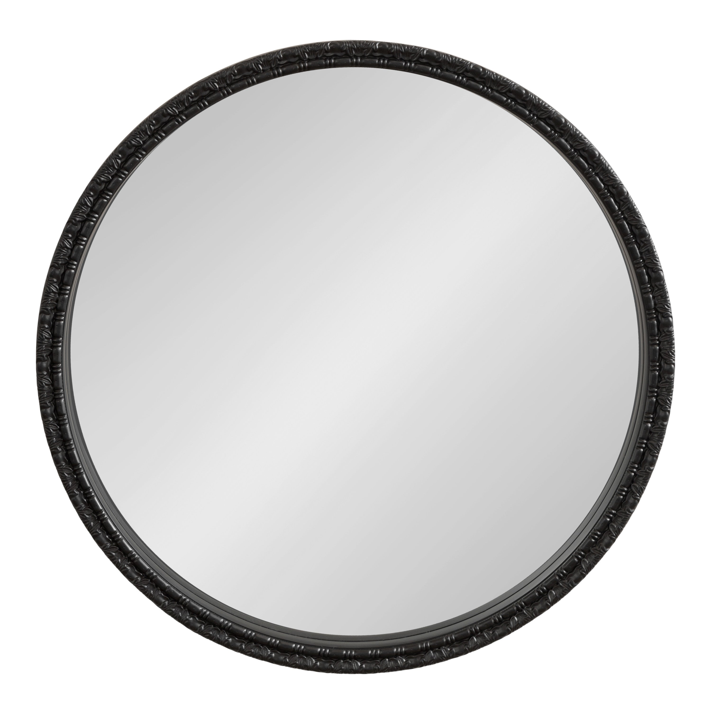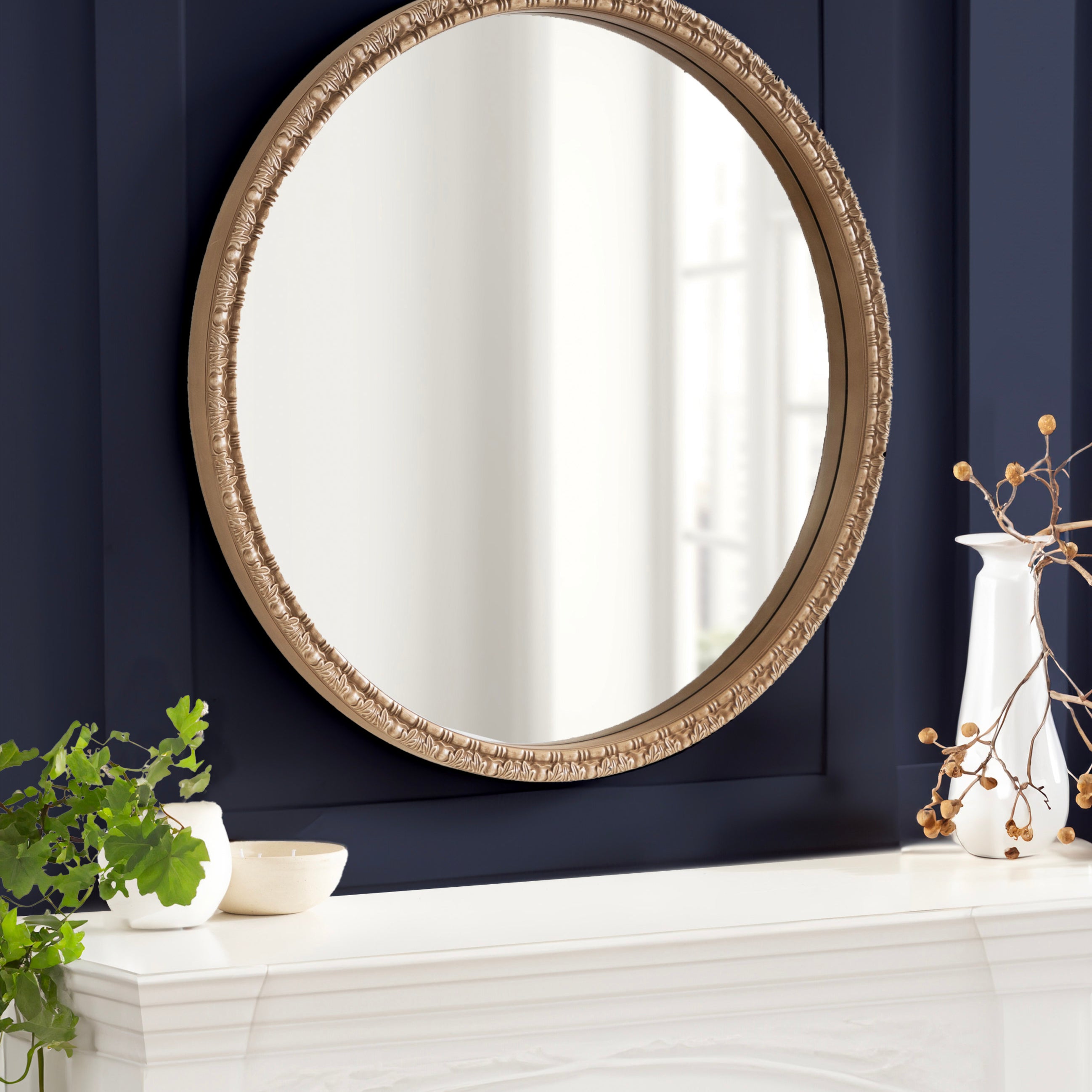 Looking for a charming ornate mirror to elevate your space? Look no further than the Stallworth round mirror with its slim frame and textured detailing. This circular mirror couples quality craftsmanship with a unique wooden frame. Use it as a bathroom vanity mirror, a textured addition to a living room, a refined bedroom accent, or even as a hallway mirror. This low-profile mirror features some light distressing along with two ornate patterns, giving you a detailed, thoughtful design.
