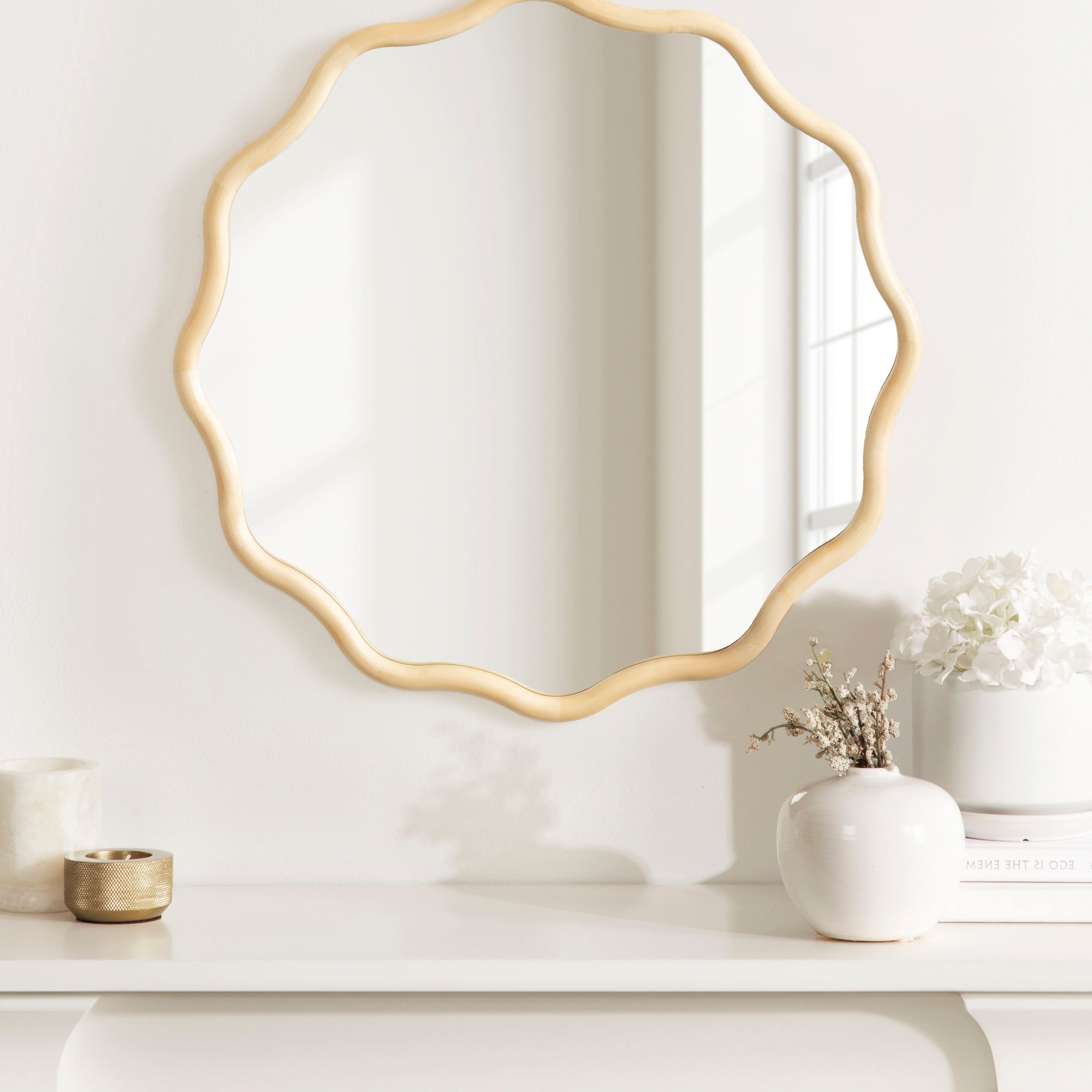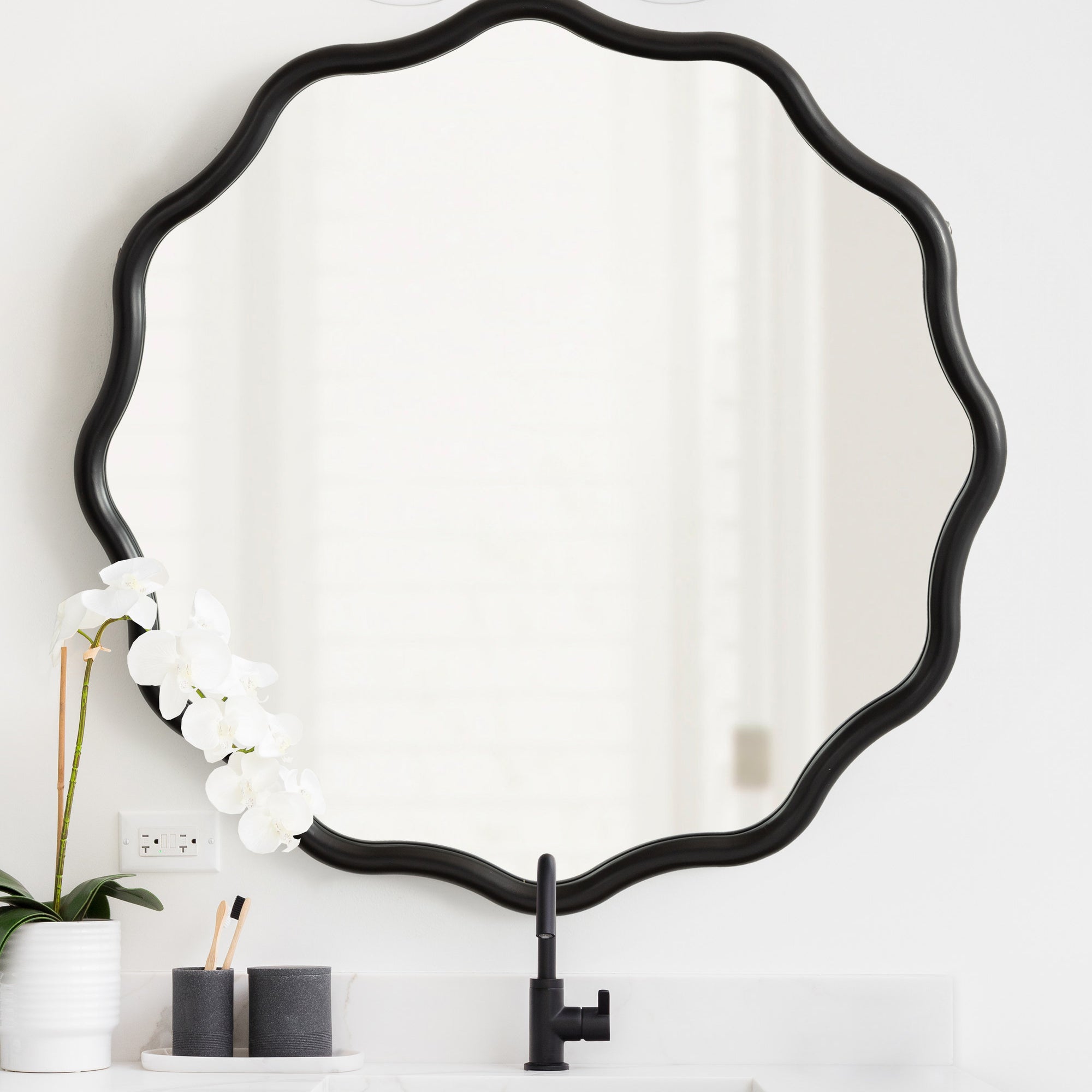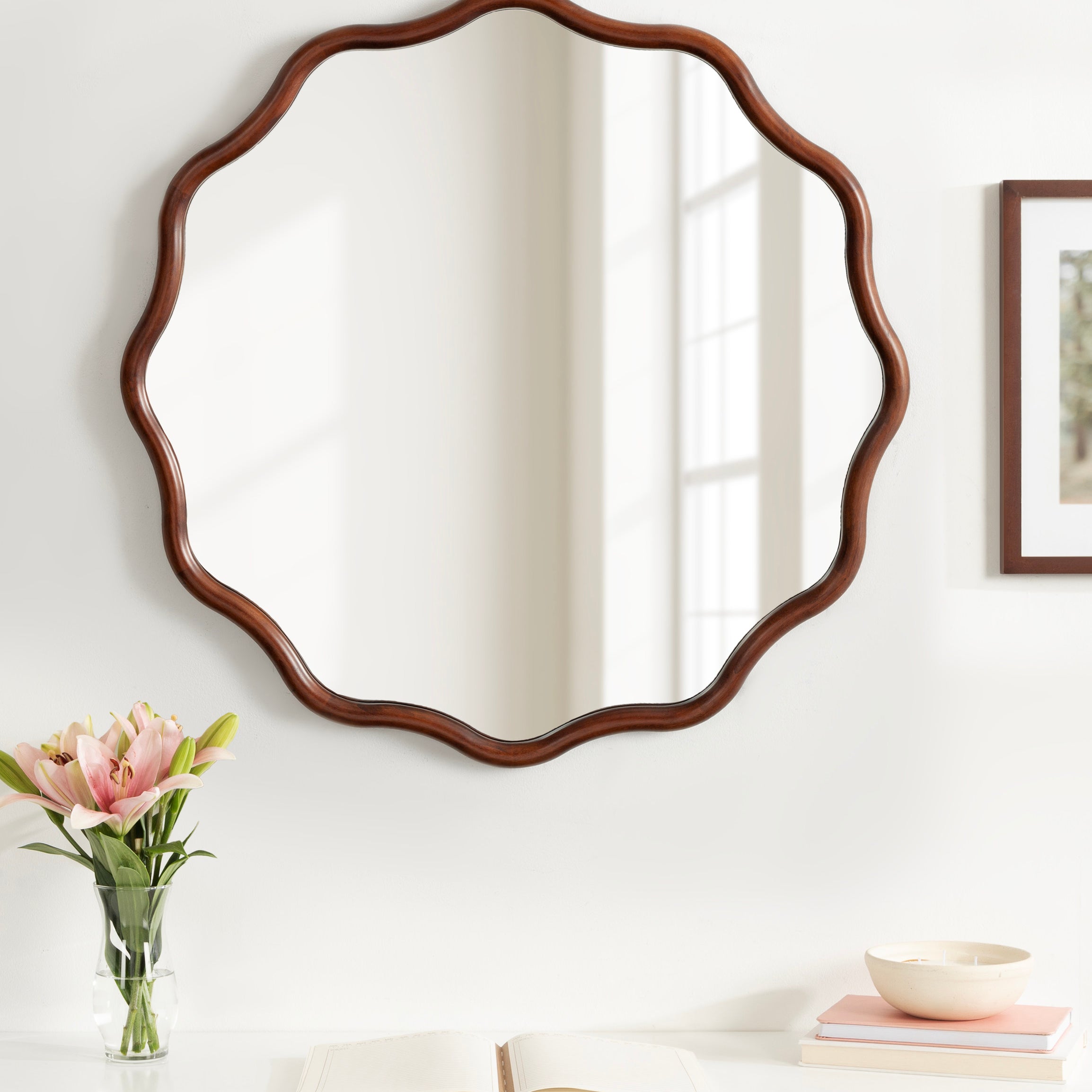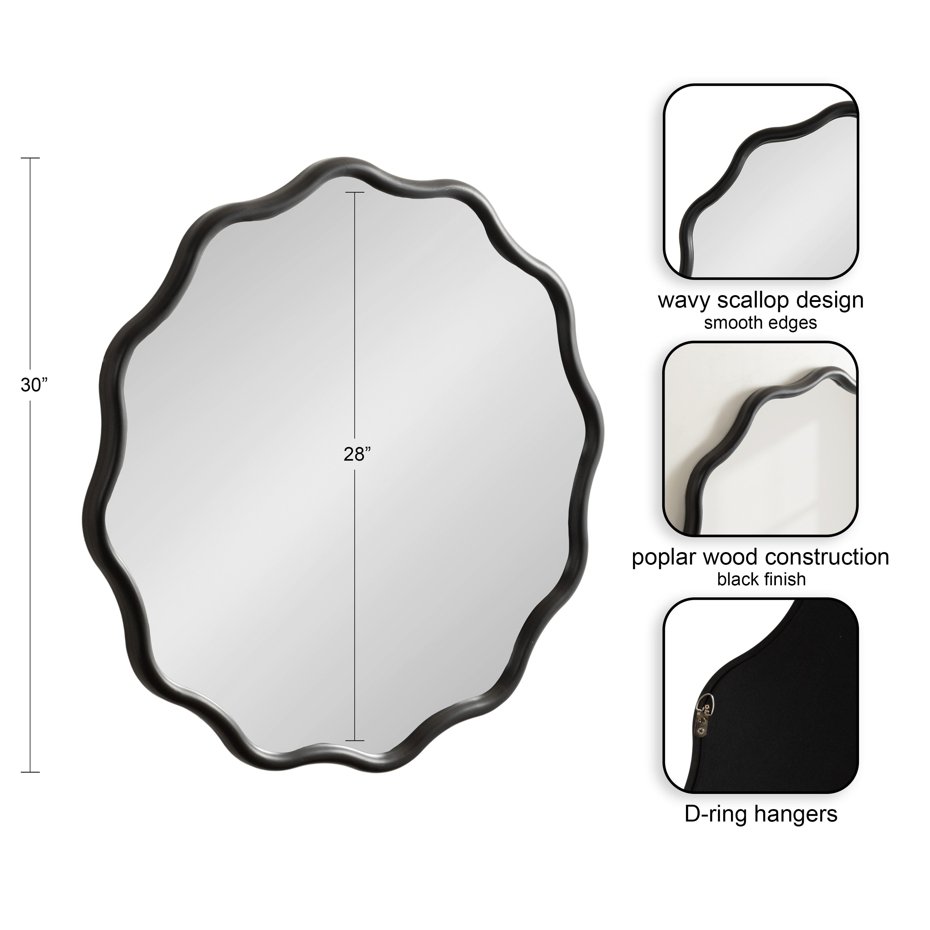 This stunning mirror features a beautiful finish that adds a touch of elegance and sophistication to your space. Crafted with the utmost care, the round mirror boasts a solid poplar wood frame that ensures durability and longevity. Hang it in your living room, bedroom, or entryway to create an illusion of a larger space, and to effortlessly check your appearance before heading out. This scalloped circle wall mirror is designed to make your home feel brighter and more spacious.
