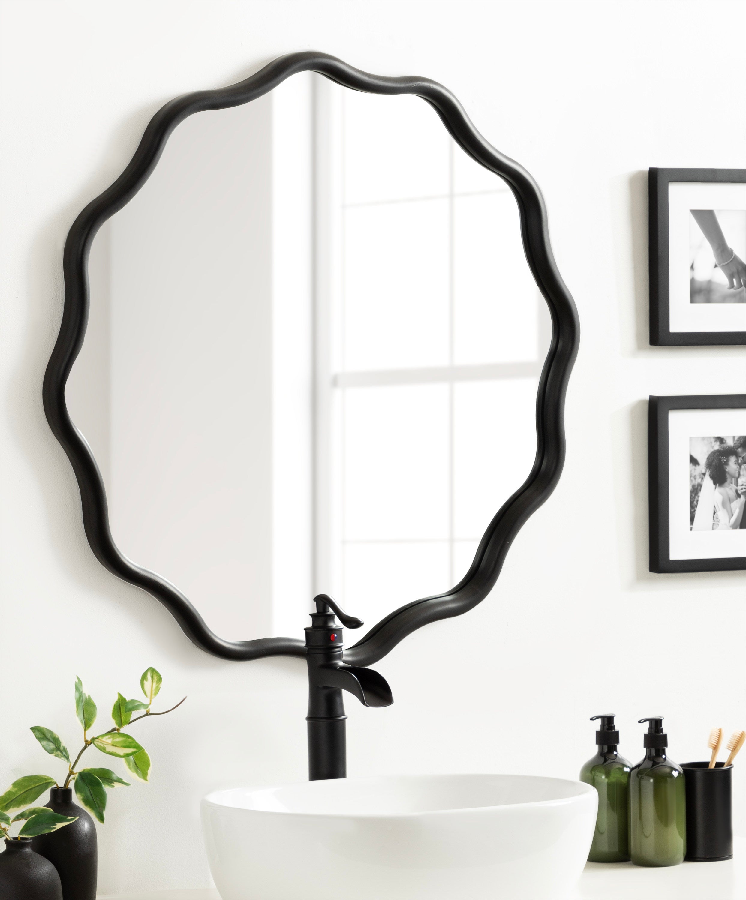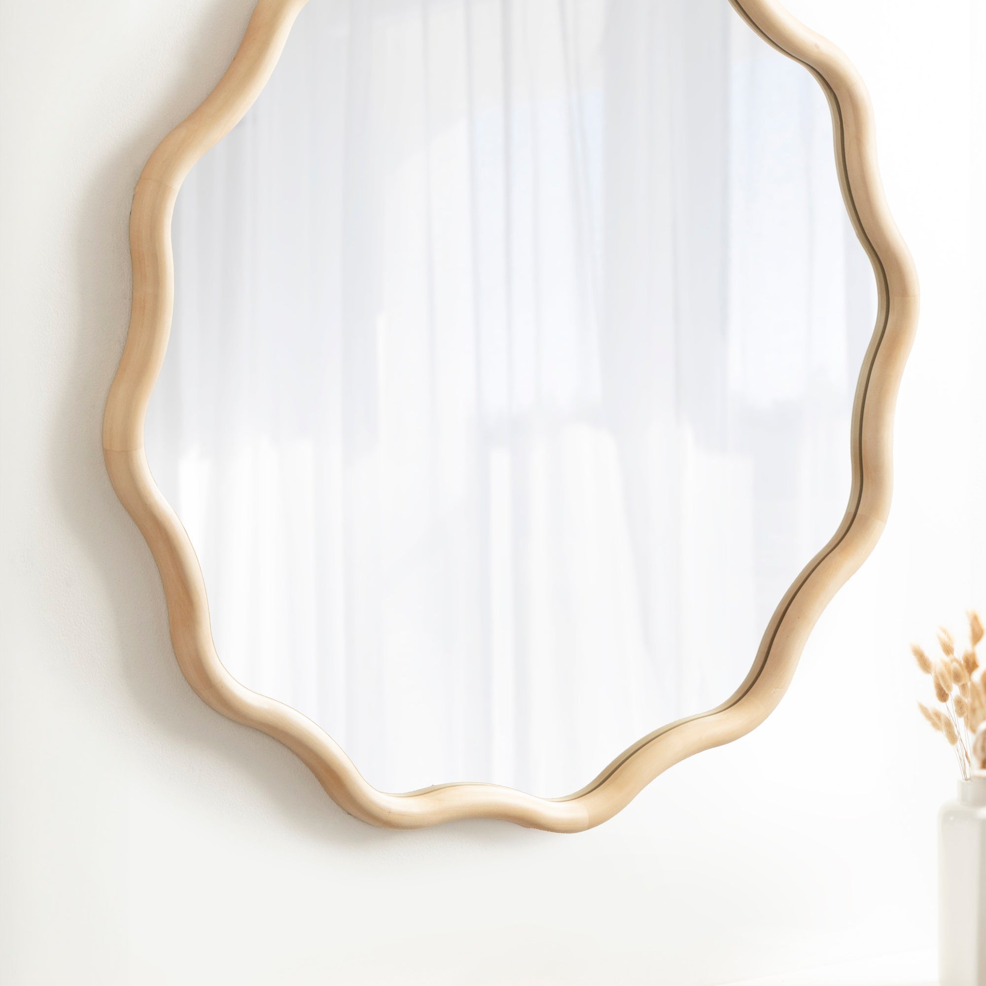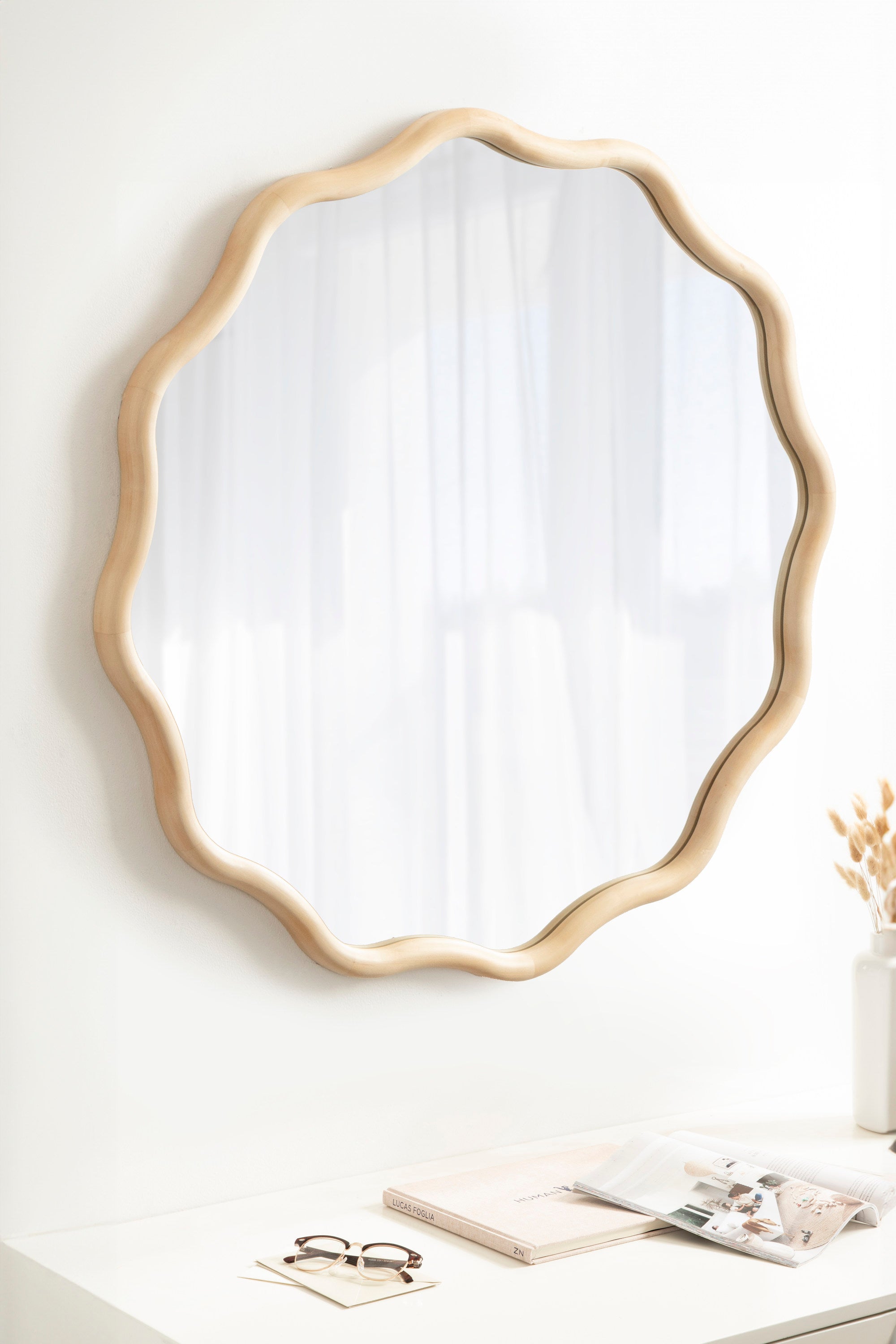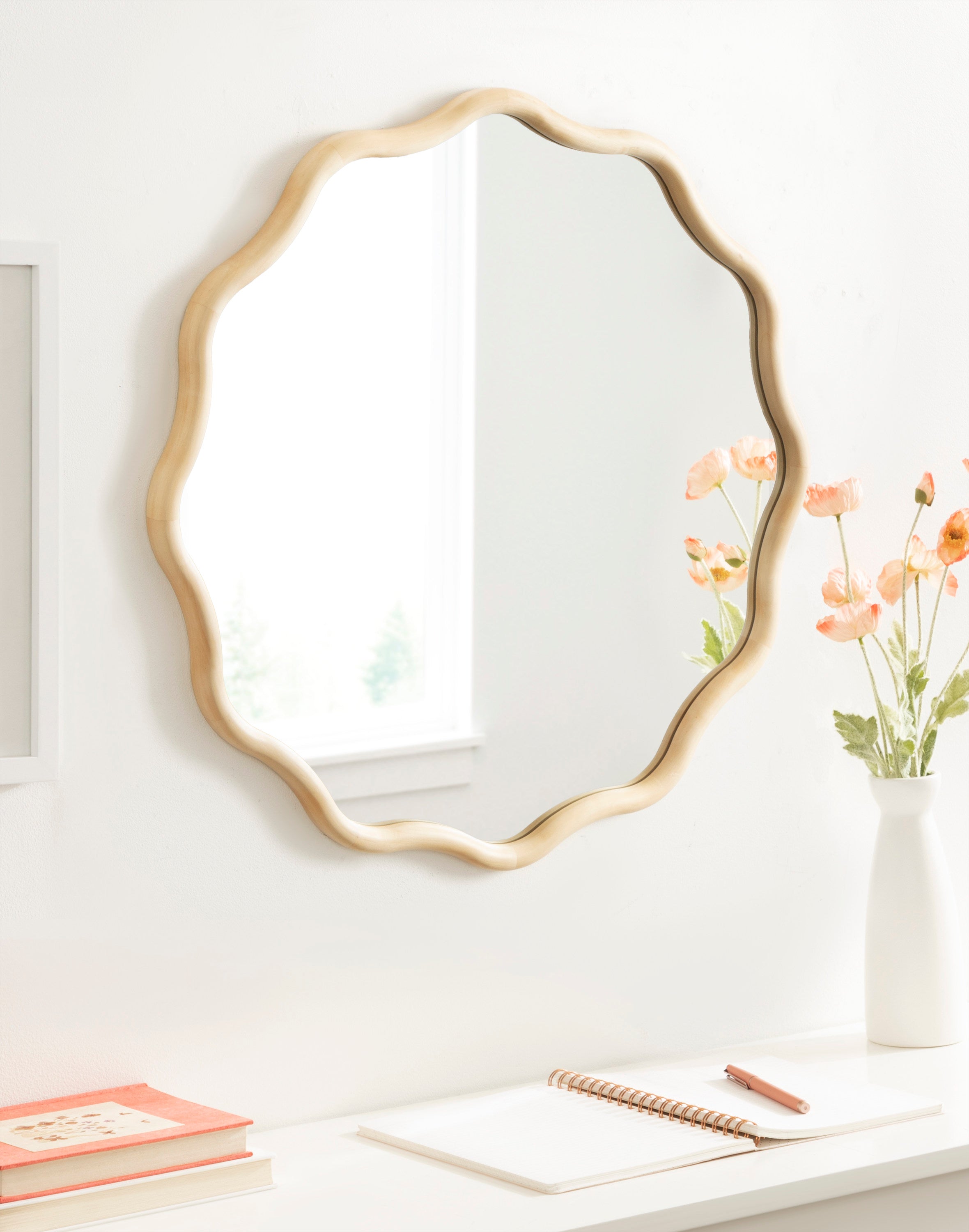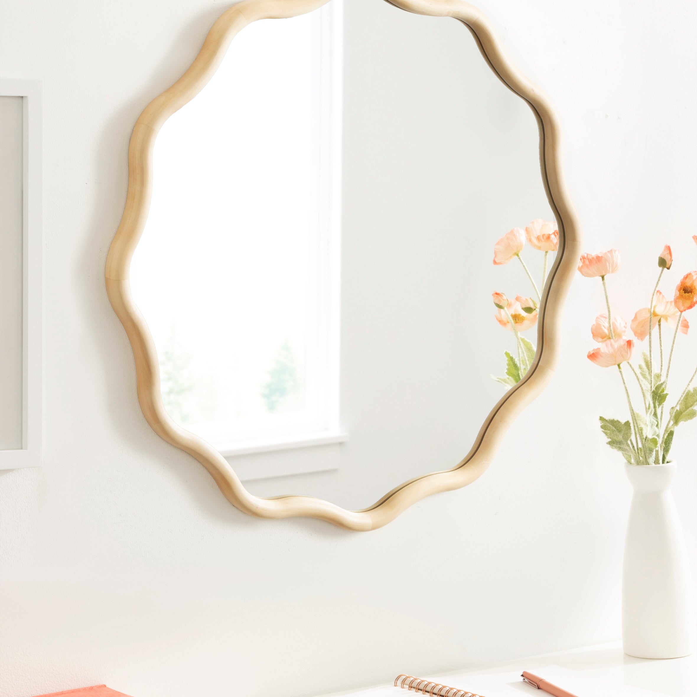 This stunning mirror features a beautiful finish that adds a touch of elegance and sophistication to your space. Crafted with the utmost care, the round mirror boasts a solid poplar wood frame that ensures durability and longevity. Hang it in your living room, bedroom, or entryway to create an illusion of a larger space, and to effortlessly check your appearance before heading out. This scalloped circle wall mirror is designed to make your home feel brighter and more spacious.