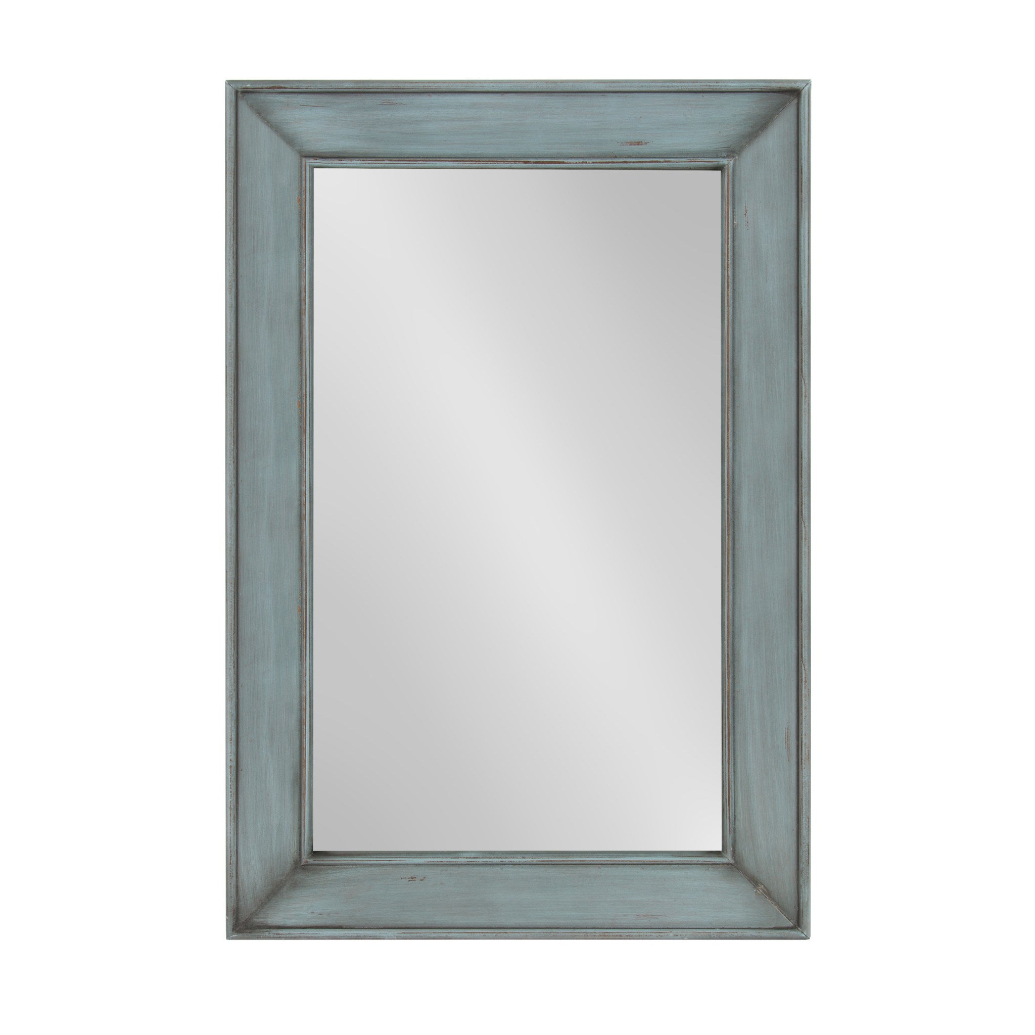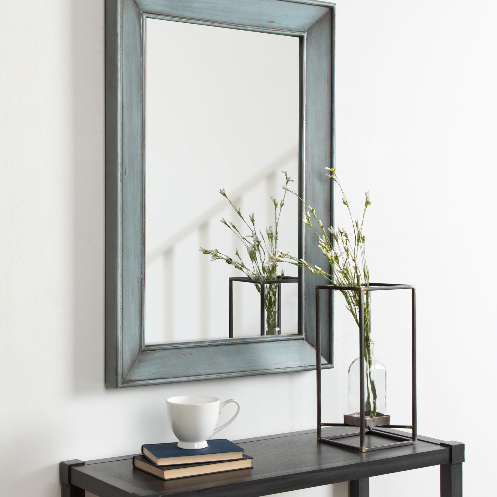 Create a timeless wall display in any living space in your home with the beautiful farmhouse Yuda Mirror. With a sloped wood frame and a rectangular shape, this wall mirror elevates your home decor with a traditional aesthetic. It looks great on its own as a practical powder room or master bathroom mirror. This mirror features a walnut finish to create a cozy vibe in any living space.