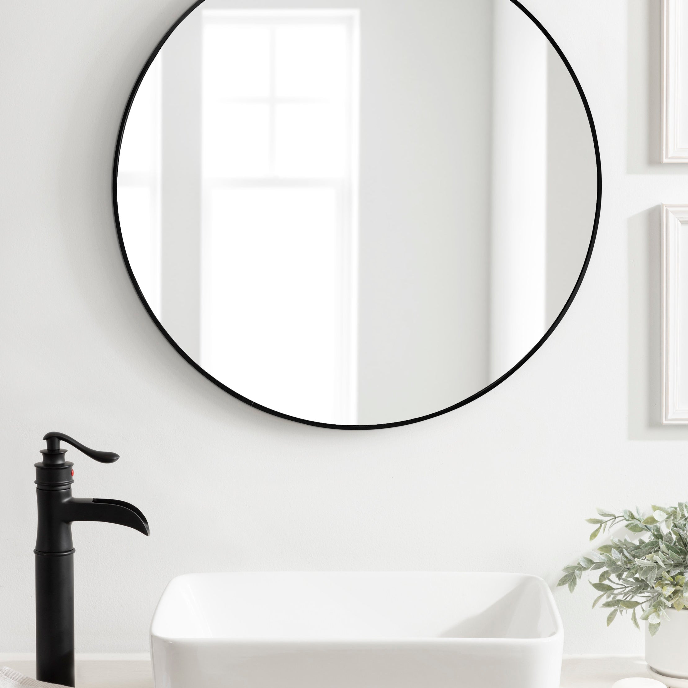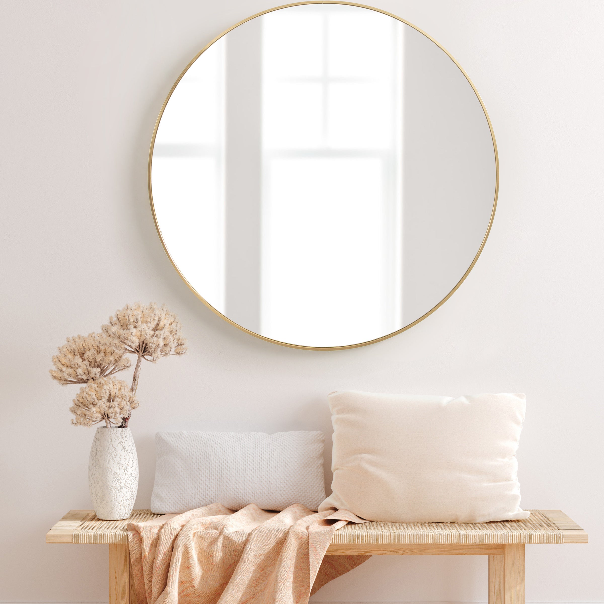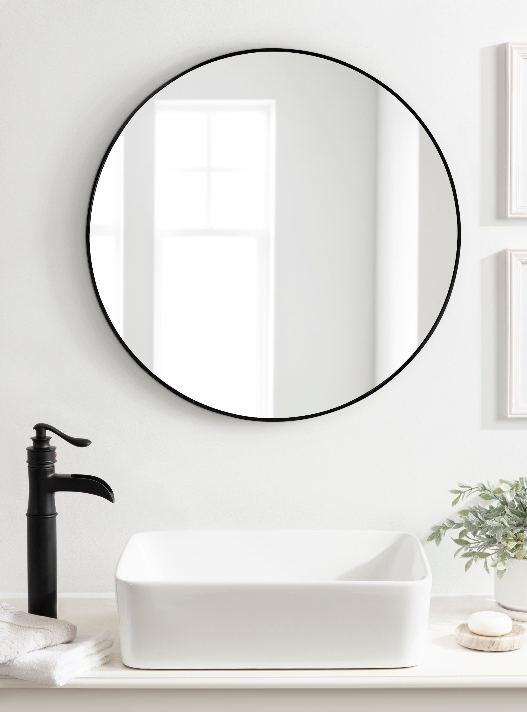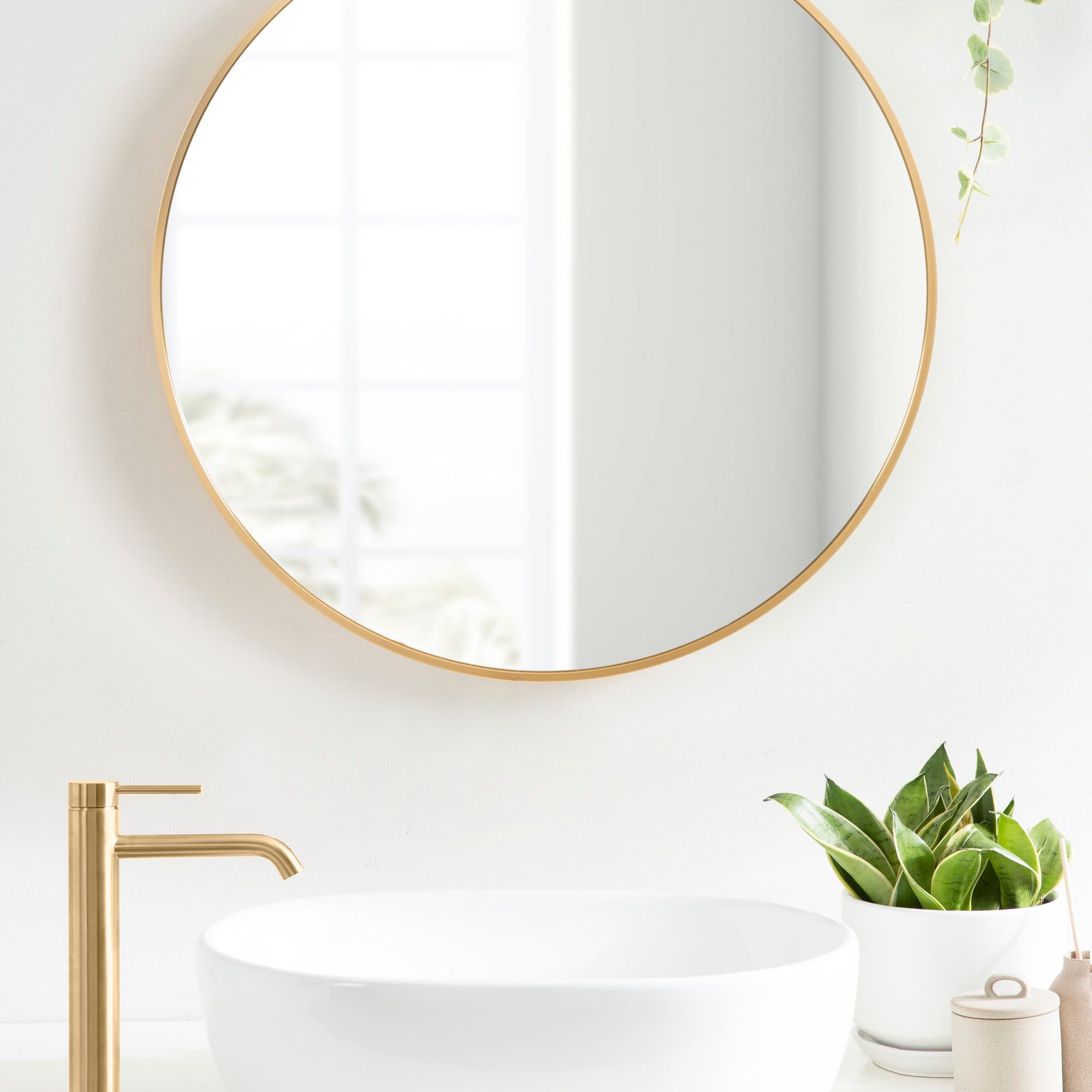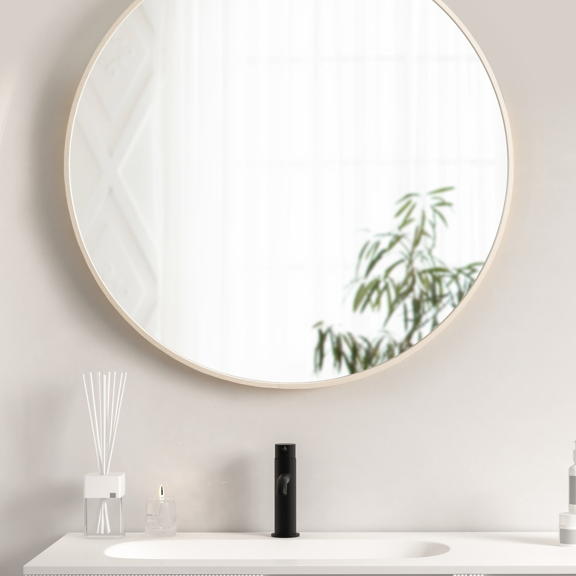 The Zayda round mirror defines stylish simplicity. The combination of smooth curves and a slim frame profile catches attention but blends seamlessly with your decor. This modern option is constructed from resilient aluminum, making it durable and light enough to hang easily.