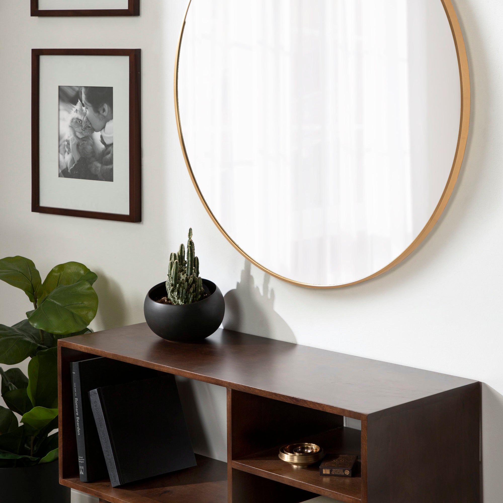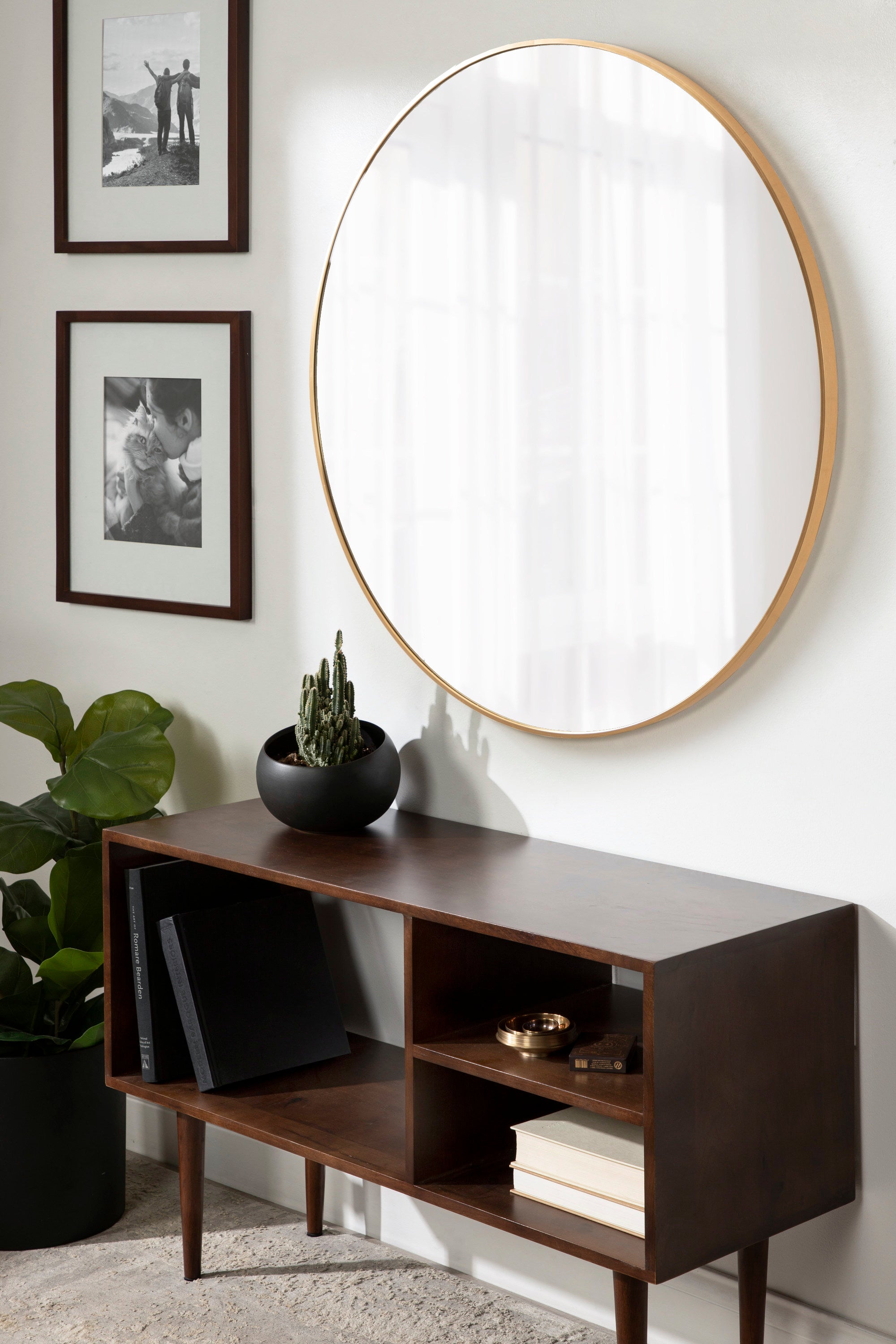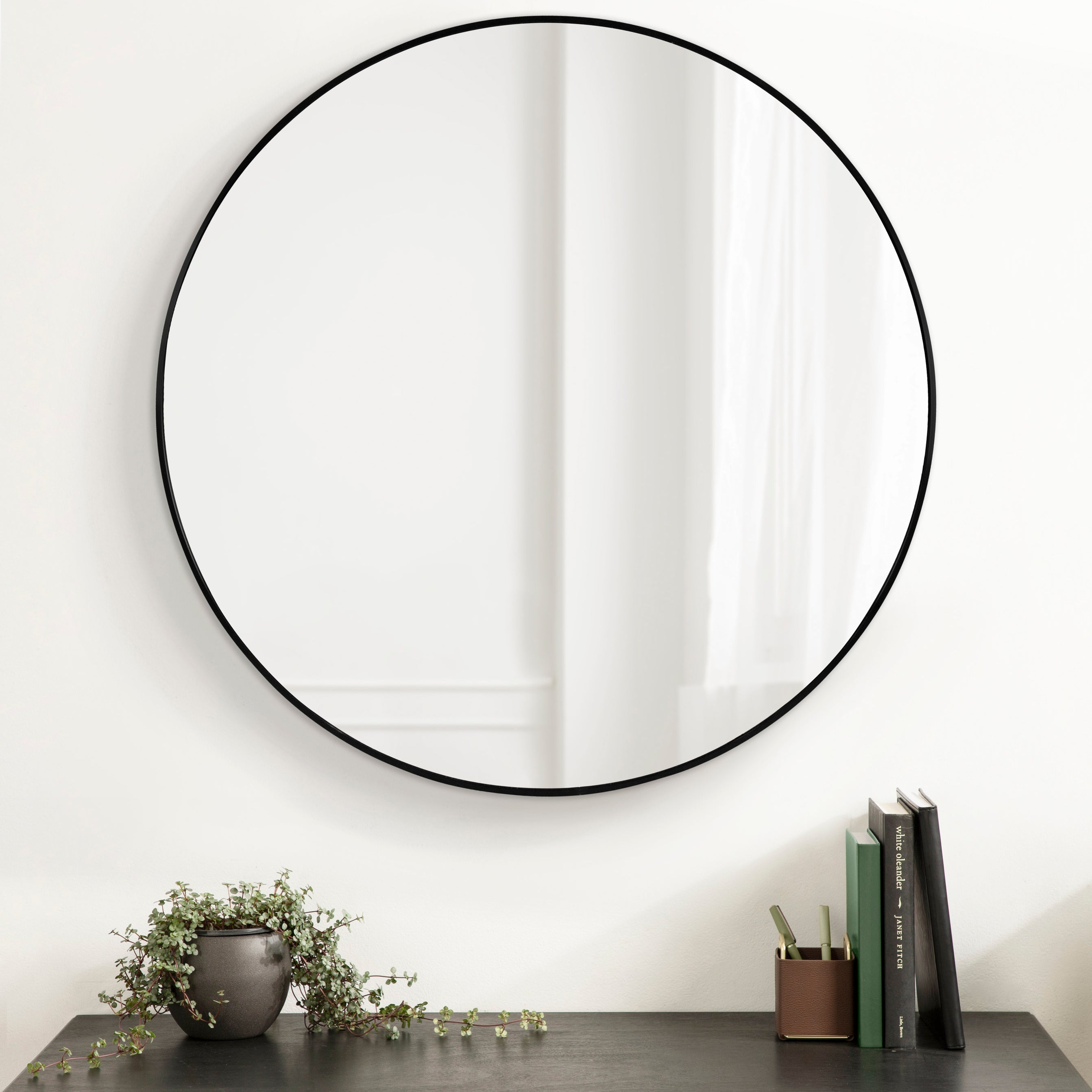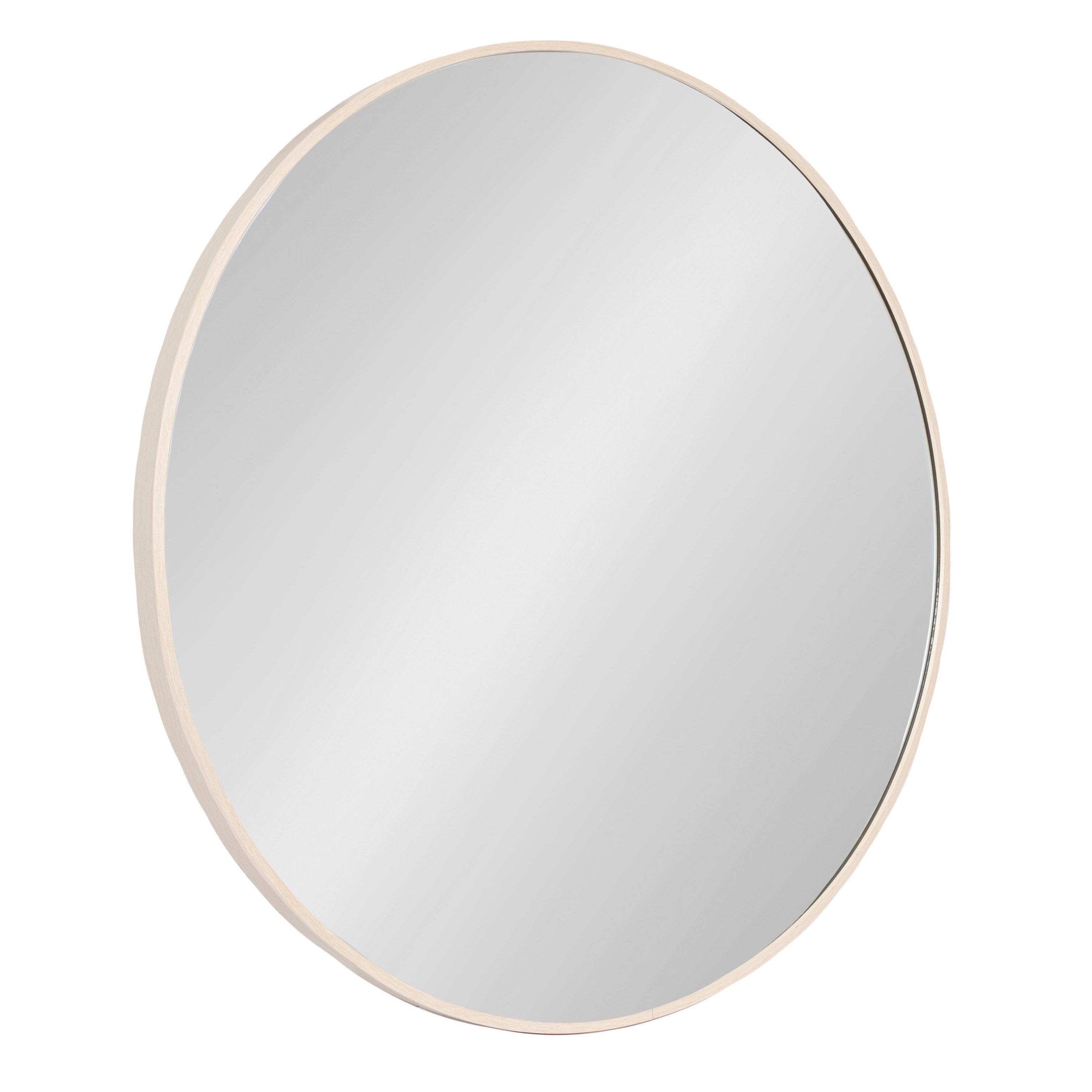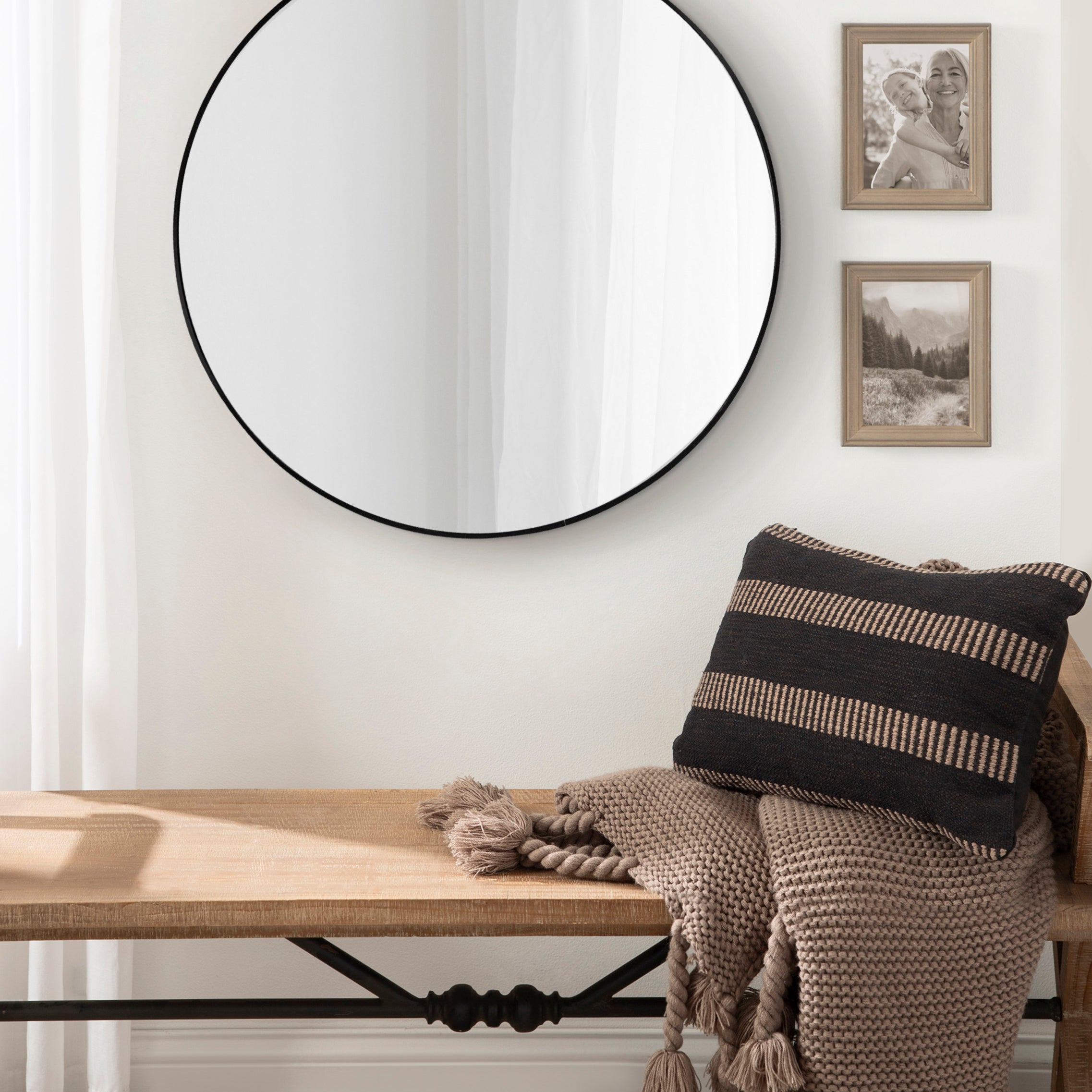 The Zayda round mirror defines stylish simplicity. The combination of smooth curves and a slim frame profile catches attention but blends seamlessly with your decor. This modern option is constructed from resilient aluminum, making it durable and light enough to hang easily.