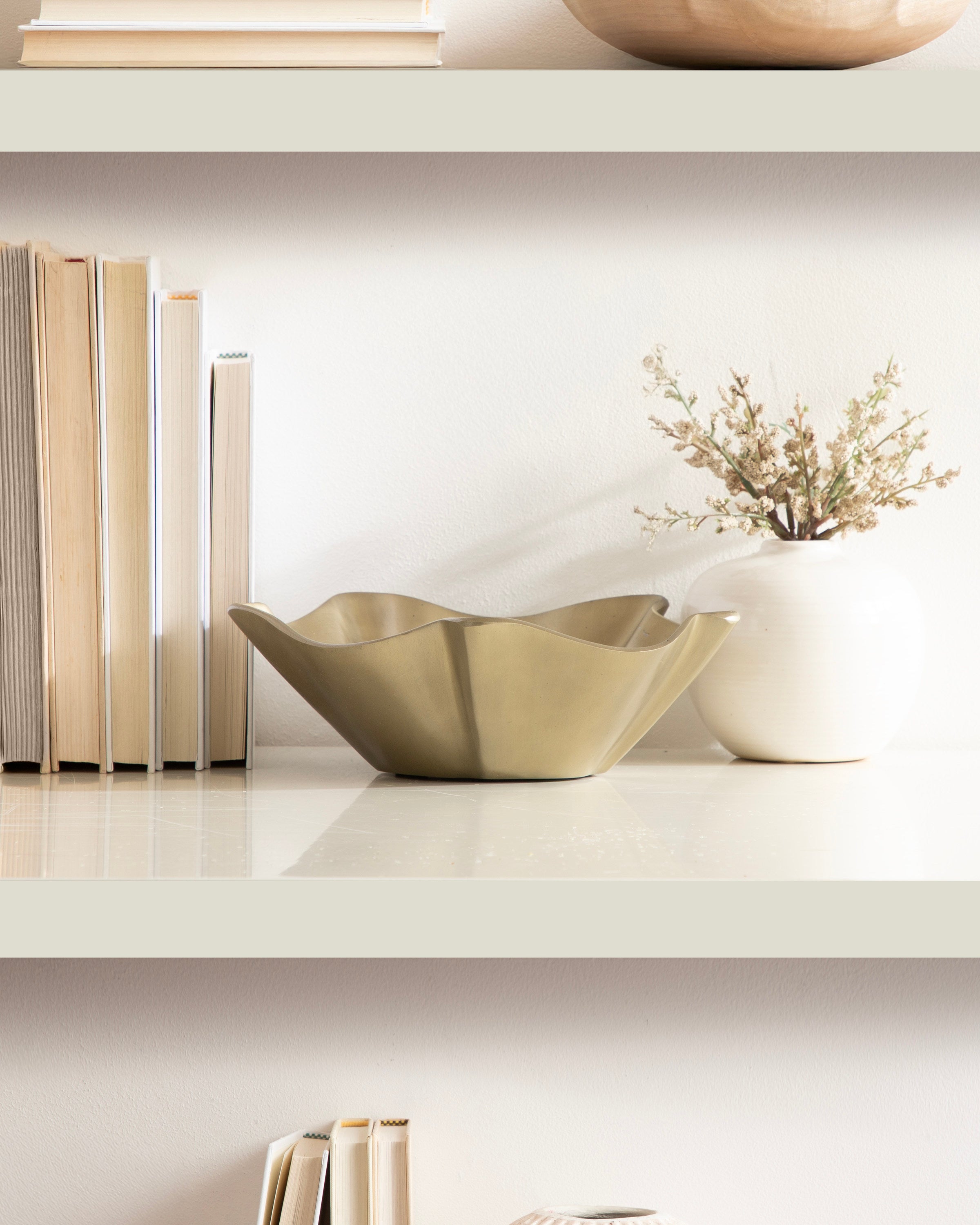 Transform your living space into a sanctuary of contemporary elegance with the Kate and Laurel Flutte decorative bowl. Its free-flowing wavy design adds depth and character, elevating the aesthetic appeal of your home decor. Whether showcased on your kitchen counter as a sophisticated fruit bowl or positioned on an entryway table to stylishly hold keys and essentials, this food-safe bowl's versatility knows no bounds. The "folded" look not only enhances its visual allure but also offers a practical solution for organizing everyday items with ease. Embrace the perfect blend of form and function as you indulge in the timeless sophistication of this kitchen counter bowl. Enhance your living space with this exquisite piece and let its beauty captivate every glance. Upgrade your home ambiance today with this stunning bowl that exudes modern charm and refined elegance.