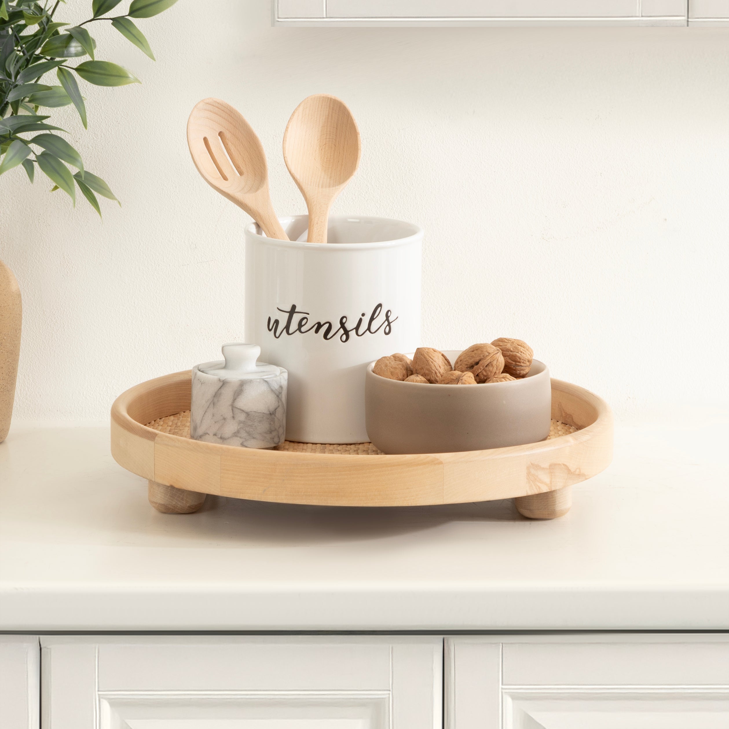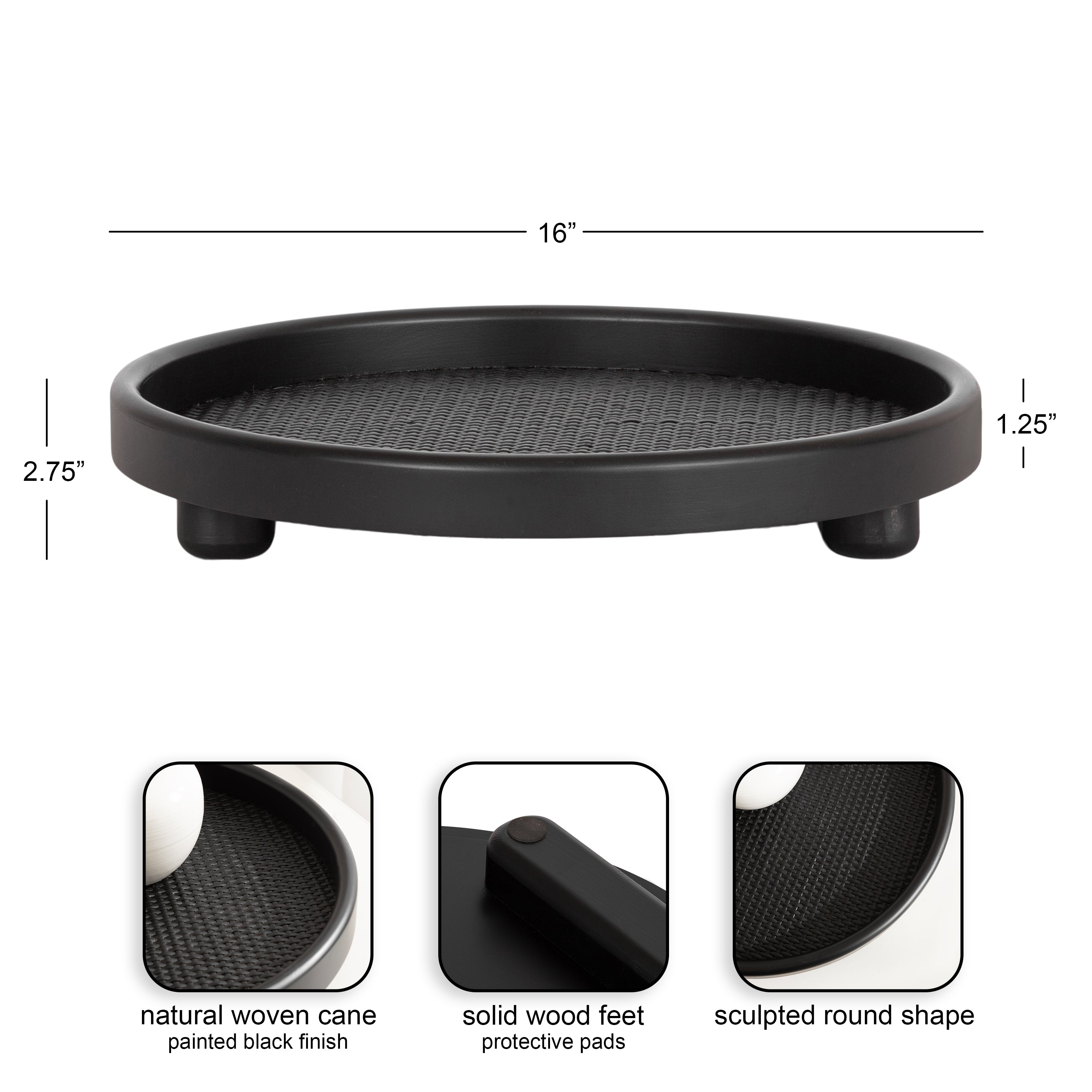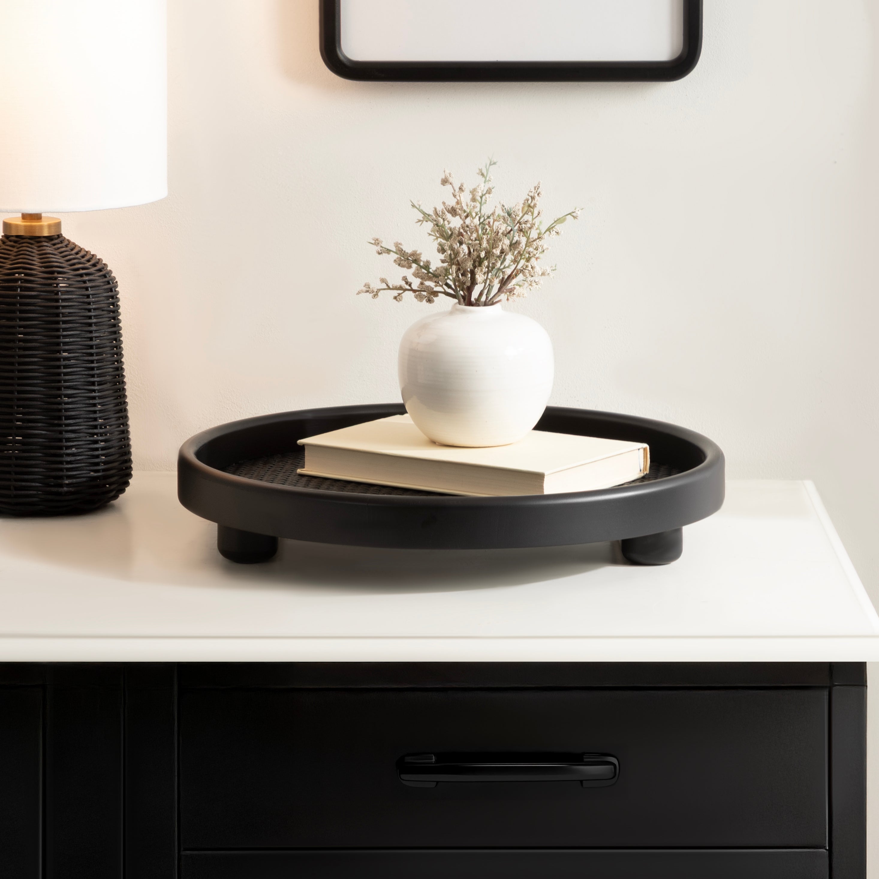 Bring modern transitional style into your home with this charming round accent tray with a raised edge. Place this versatile tray on your entrance console table as a trinket tray to hold your keys and change as you come and go. This circular tray can also be used as a decorative accent on an ottoman to hold your beverages or on your vanity for makeup organization. Constructed of solid birch wood and woven rattan, this tray is dependable to carry your cocktails from room to room! An update to the classic accent tray, the base has a raised edge to keep your items more secure when transporting them. The tray has padded feet on the bottom to protect your surfaces. From a dining room table to a living room ottoman, this circle tray brings tremendous versatility anywhere throughout your home. Its versatile size makes it great for serving snacks on little plates or as a decorative display option.