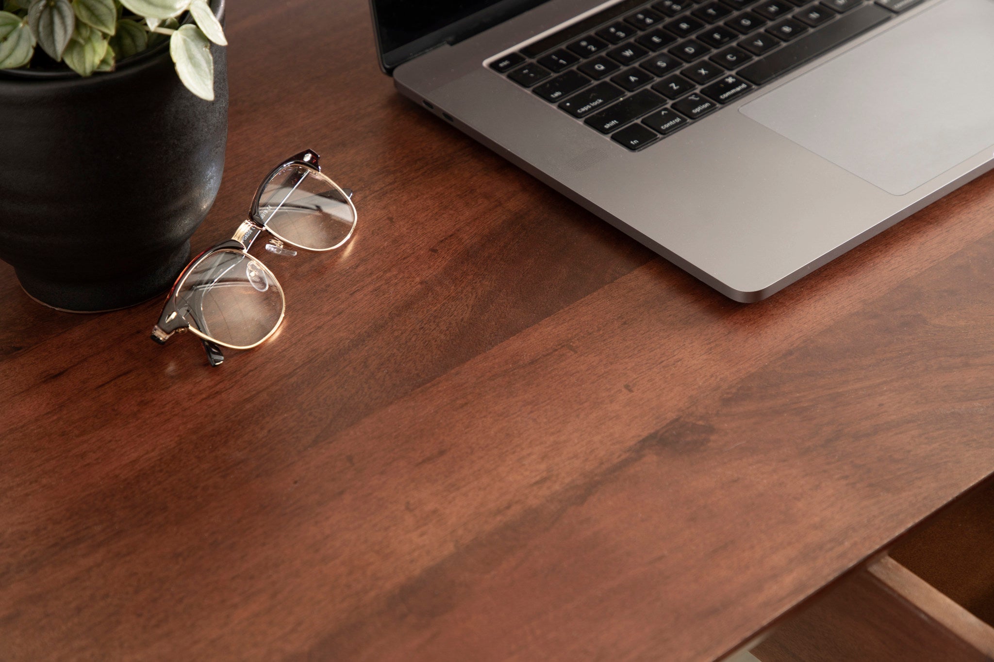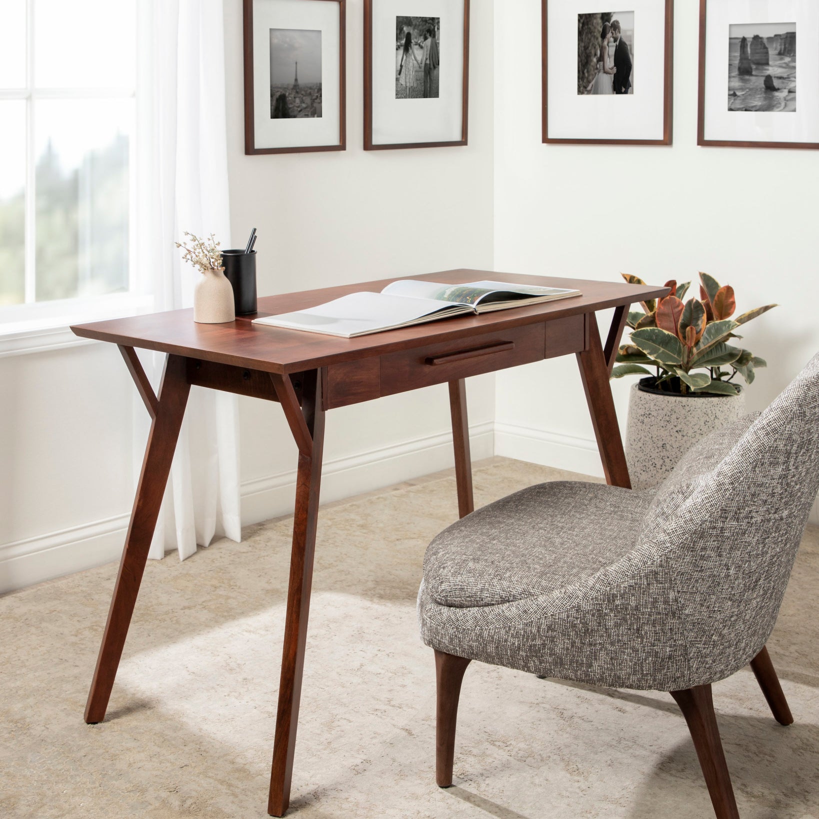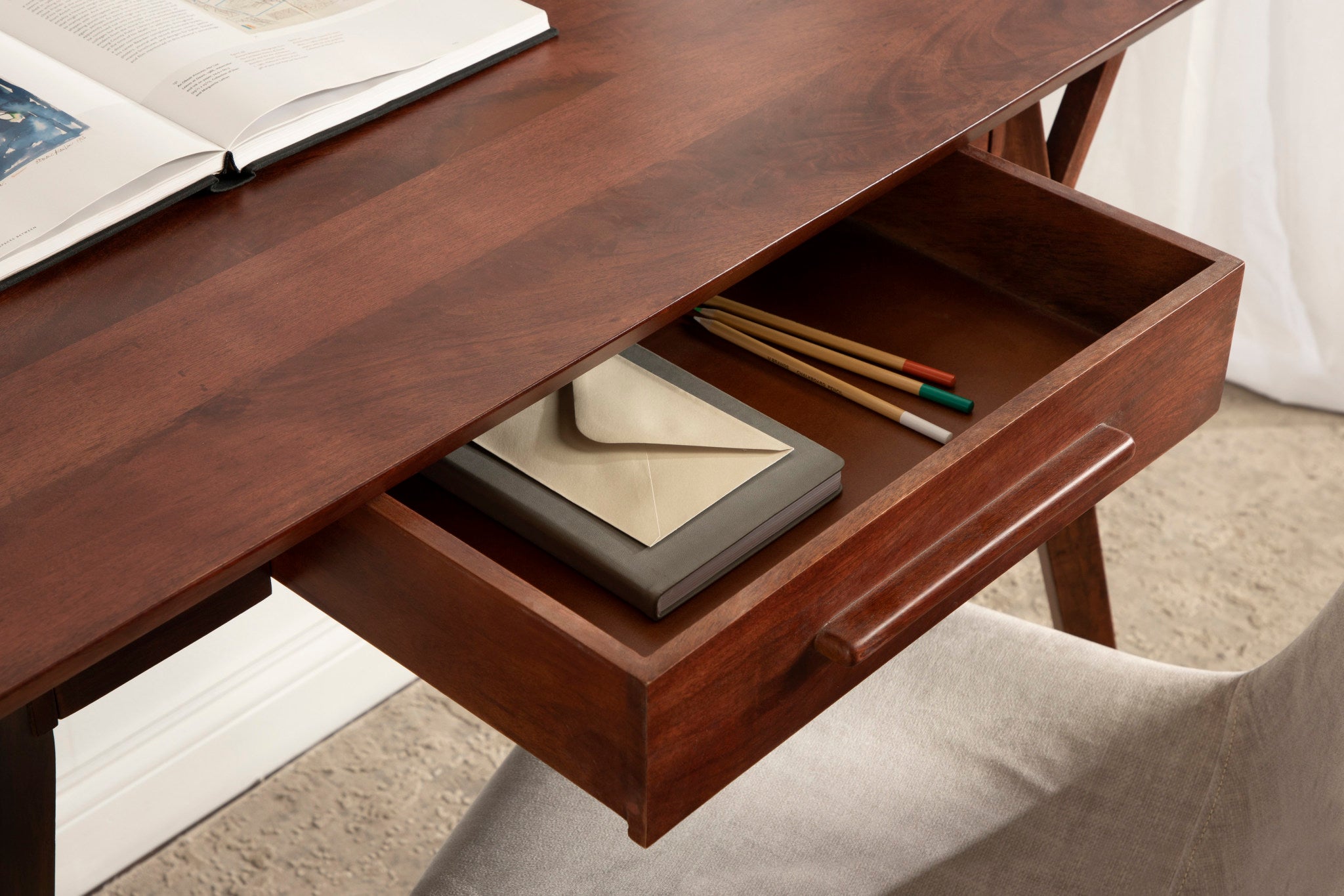 Create a sophisticated and midcentury modern home office with the lovely McCutcheon desk. Crafted in India, each McCutcheon has a distinct brown finish and premium woodgrain that varies from piece to piece. Its large size and functional, minimal look, is fantastic for adding to your office, living room, or bedroom. This desk is great for holding your monitor, notebooks, and keyboard; in addition, it also has a pull-out drawer for your office supplies. This desk is a fantastic element to introduce into your work-from-home space.