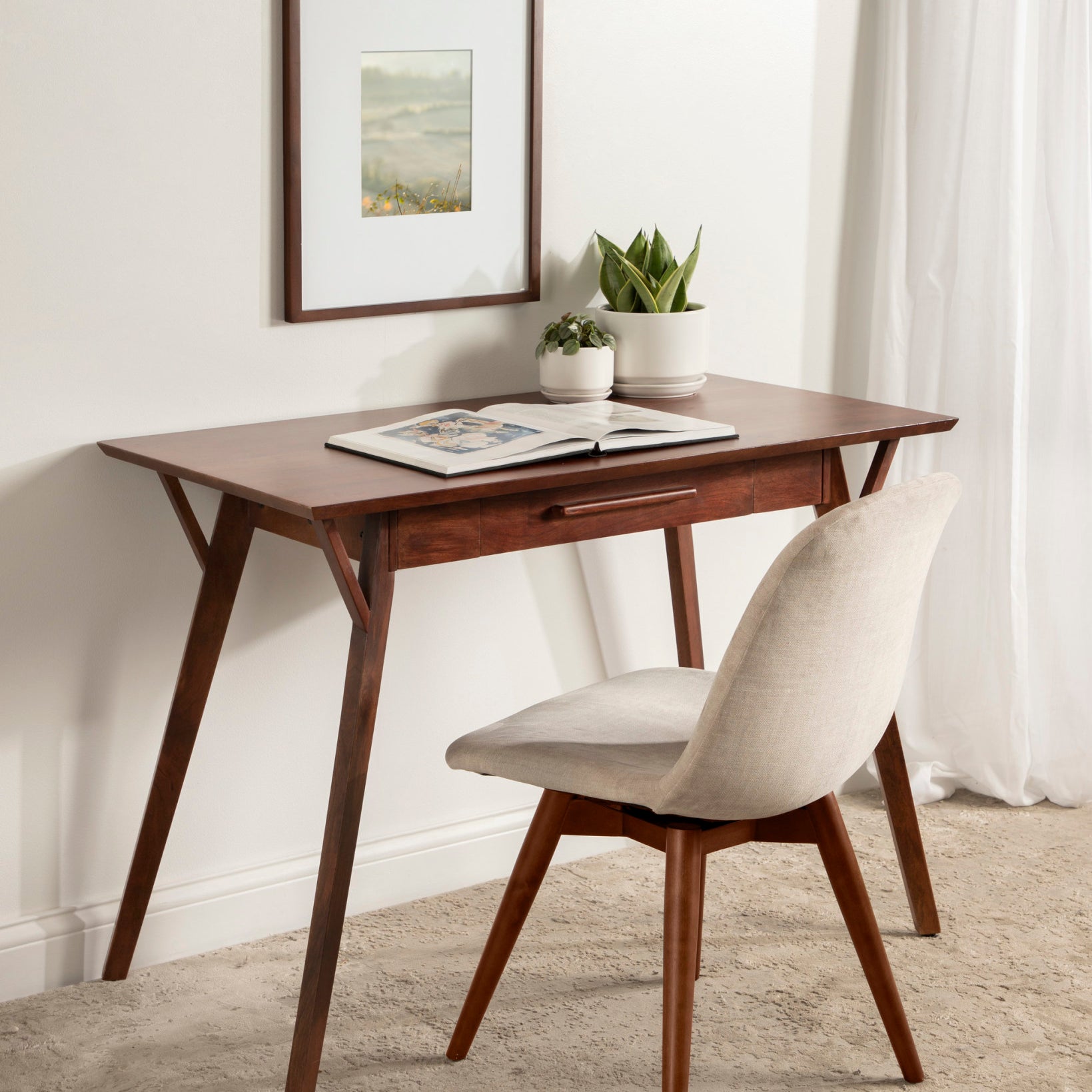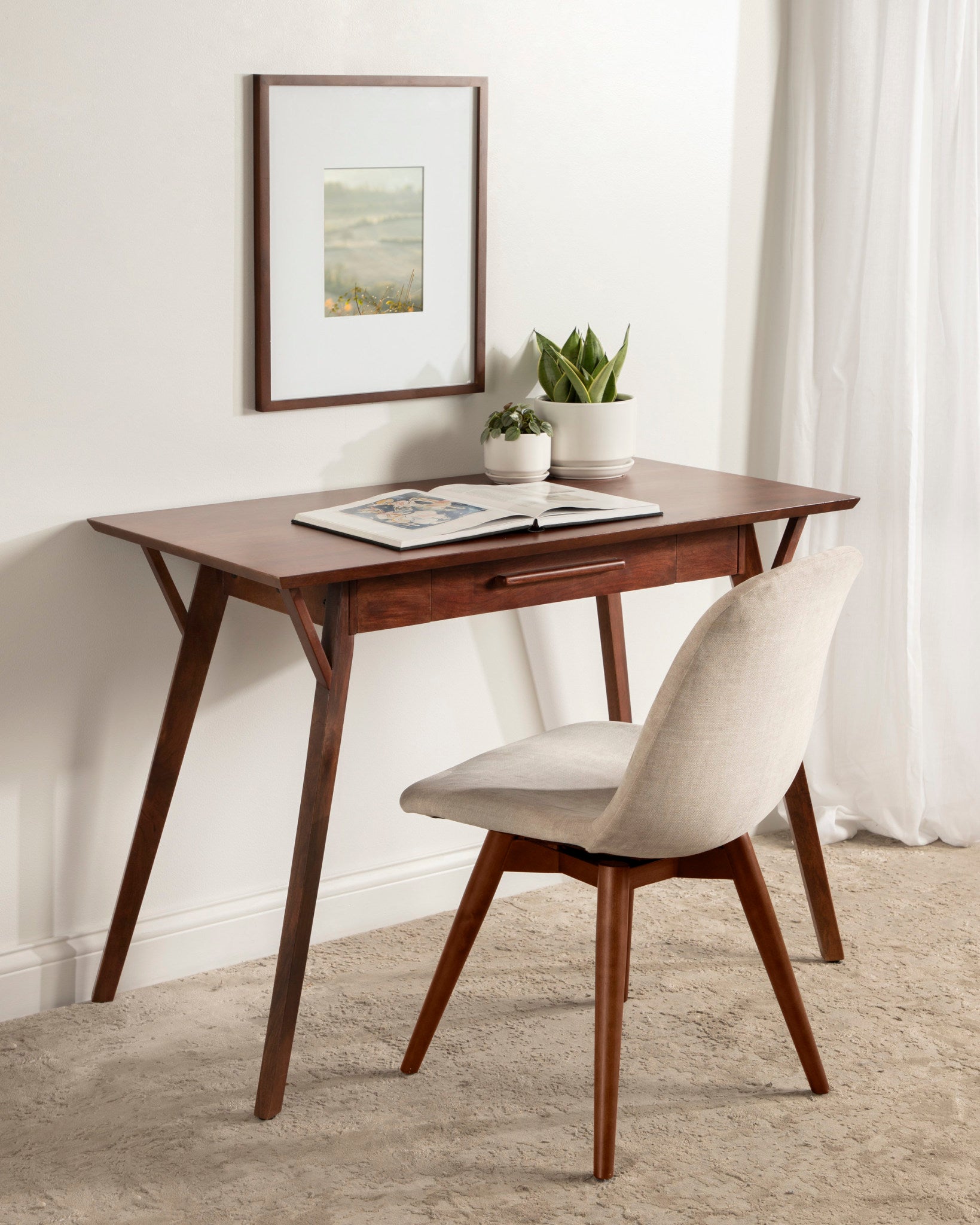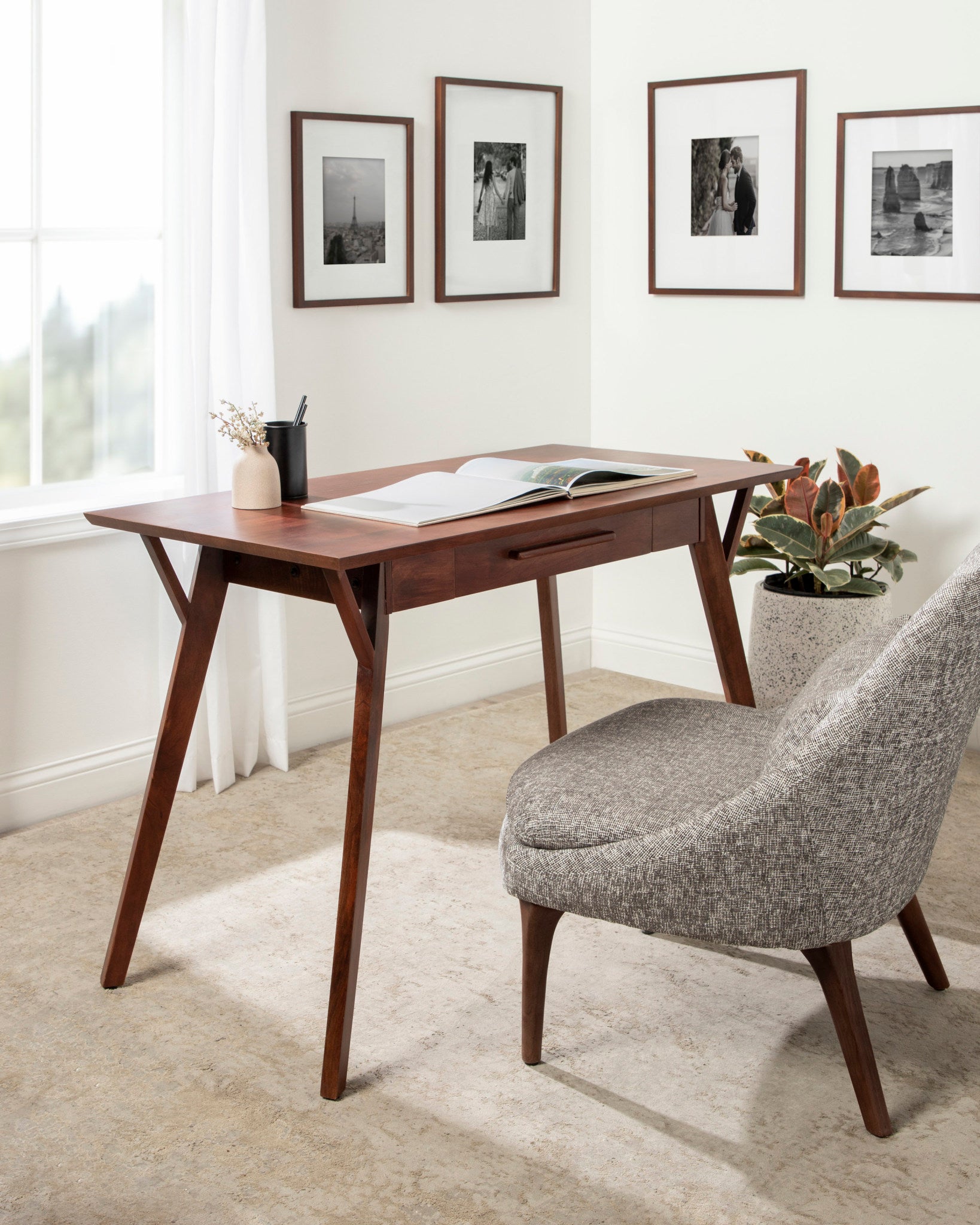 Create a sophisticated and midcentury modern home office with the lovely McCutcheon desk. Crafted in India, each McCutcheon has a distinct brown finish and premium woodgrain that varies from piece to piece. Its large size and functional, minimal look, is fantastic for adding to your office, living room, or bedroom. This desk is great for holding your monitor, notebooks, and keyboard; in addition, it also has a pull-out drawer for your office supplies. This desk is a fantastic element to introduce into your work-from-home space.