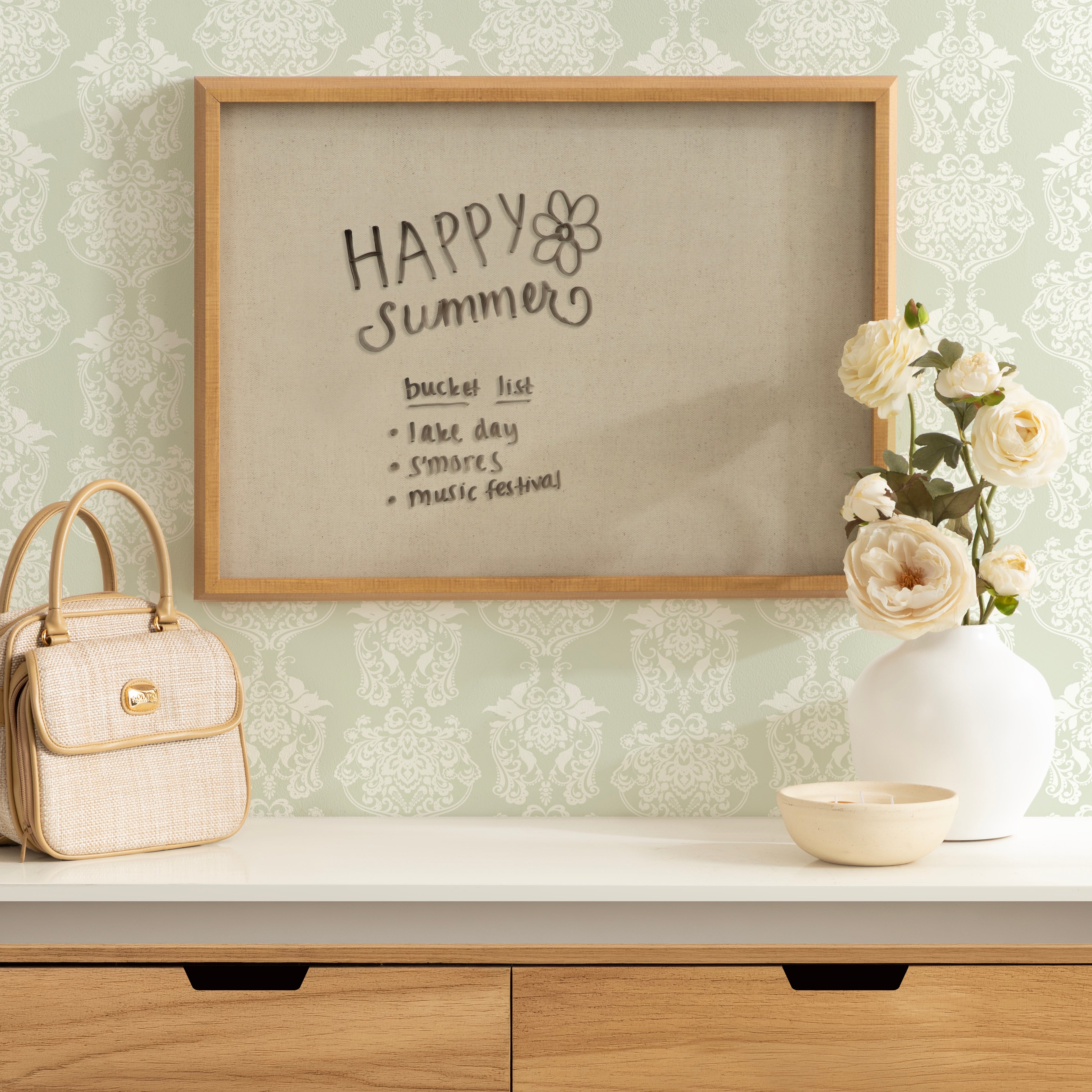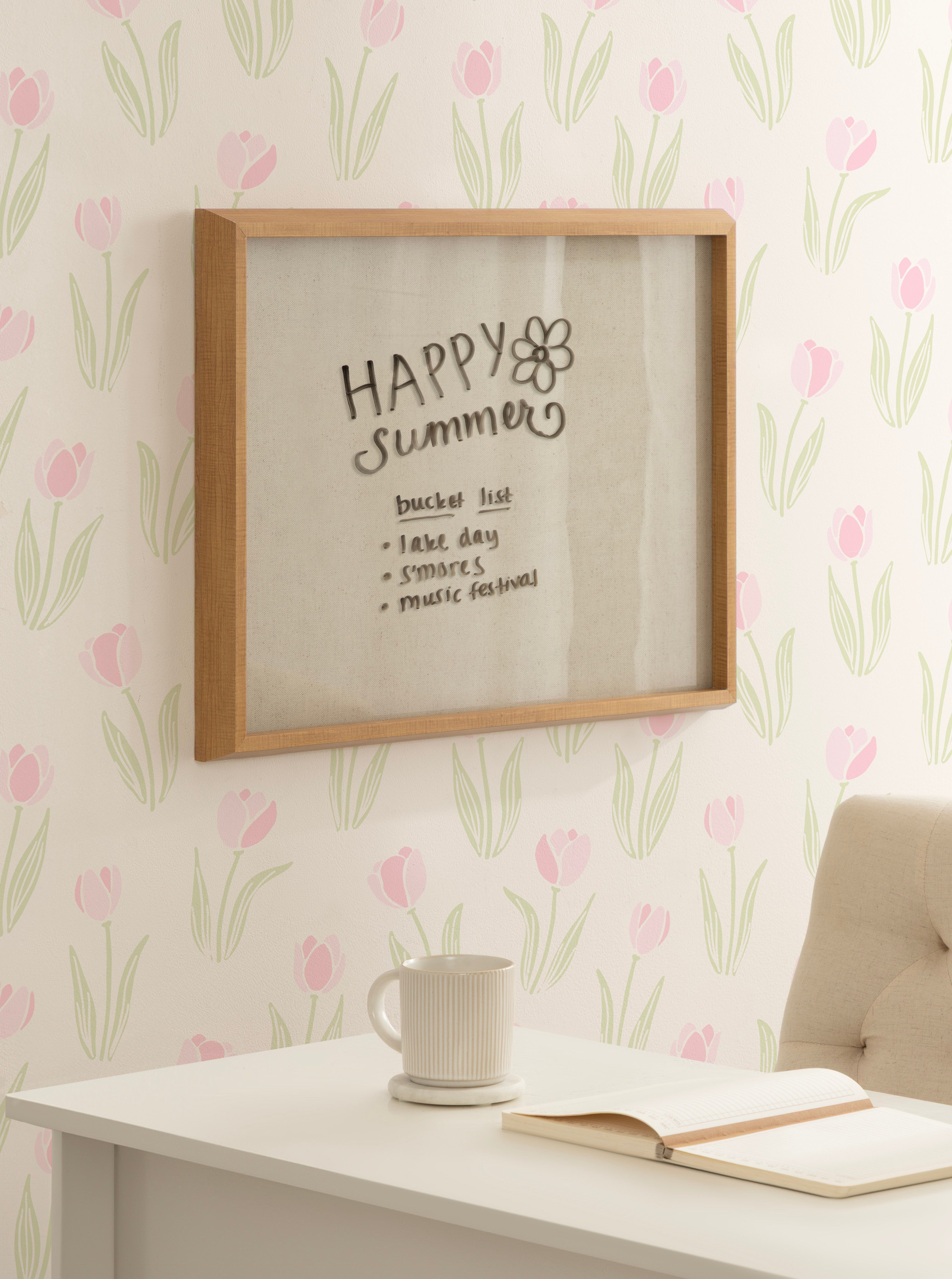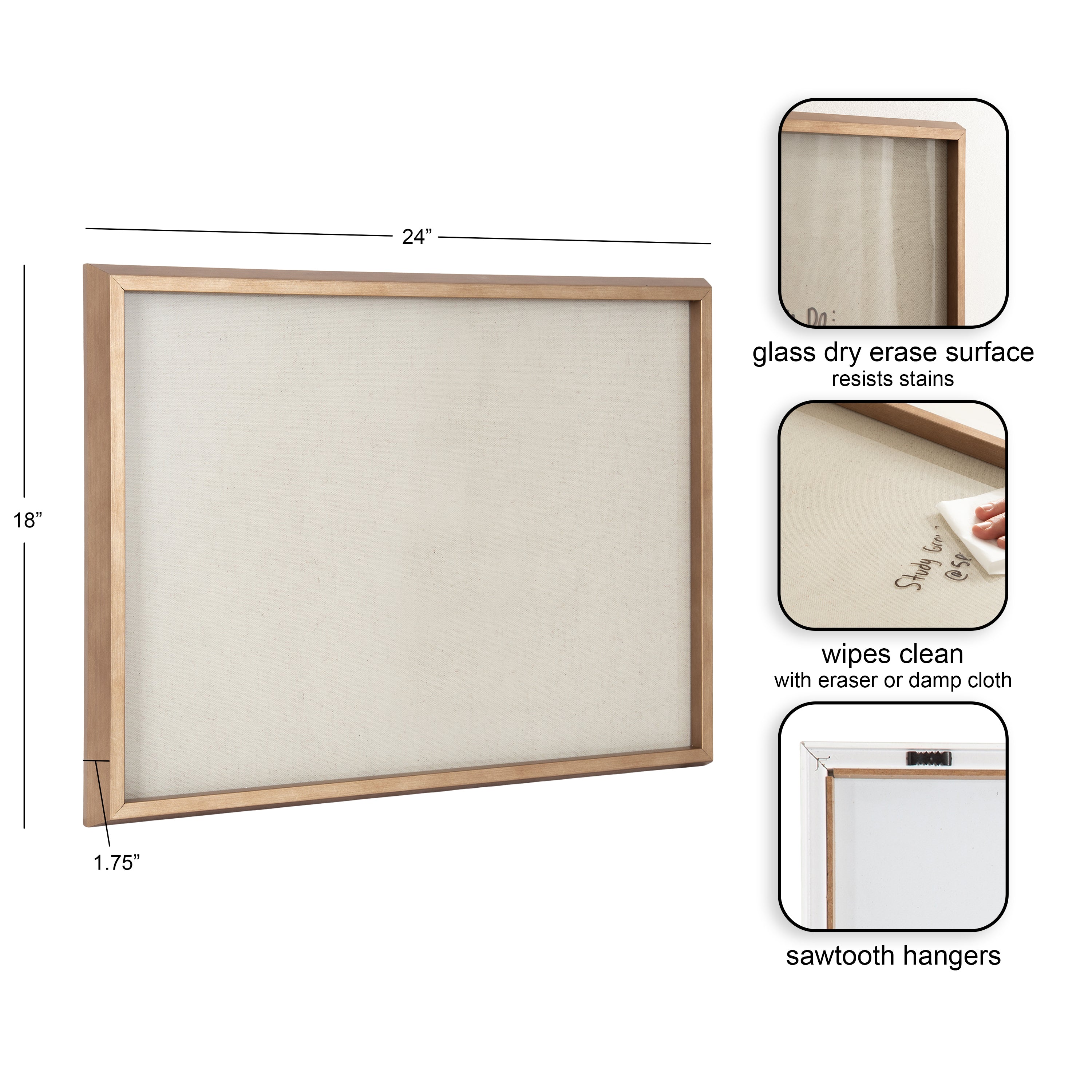 Write down important memos, notes, or fun messages with this decorative dry-erase art board. Framed in a sleek modern frame, this fun, contemporary design adds both style and function to your home decor collection. Printed and framed in the USA in Madison, Wisconsin, this framed floating glass art is designed to be enjoyed every day in your living room, bedroom, nursery, or any room in the home. It even doubles as a beautiful dry-erase board. Traditional dry-erase boards can stain over time and show wear after repeated use, while a glass dry-erase board can be used again and again without wearing out. Simply wipe clean with an eraser or a damp cloth. This art, Natural Linen Light Dry Erase by The Creative Bunch Studio, also makes an excellent gift for a birthday, holiday, or house-warming. Printed on glass and framed with a lightweight polystyrene frame, this colorful art includes two attached hangers for easy wall display. The outer dimensions are 18 inches high by 24 inches wide.