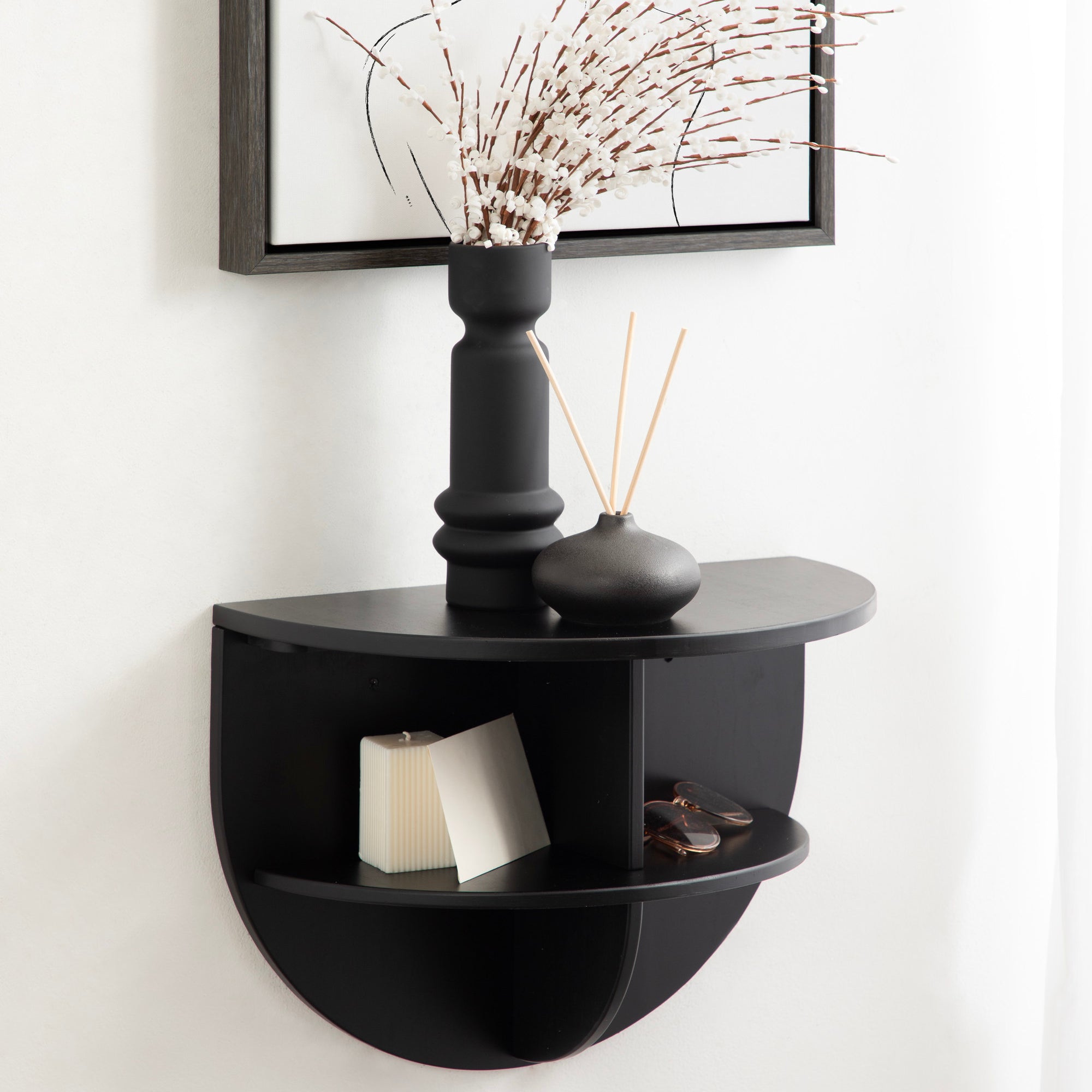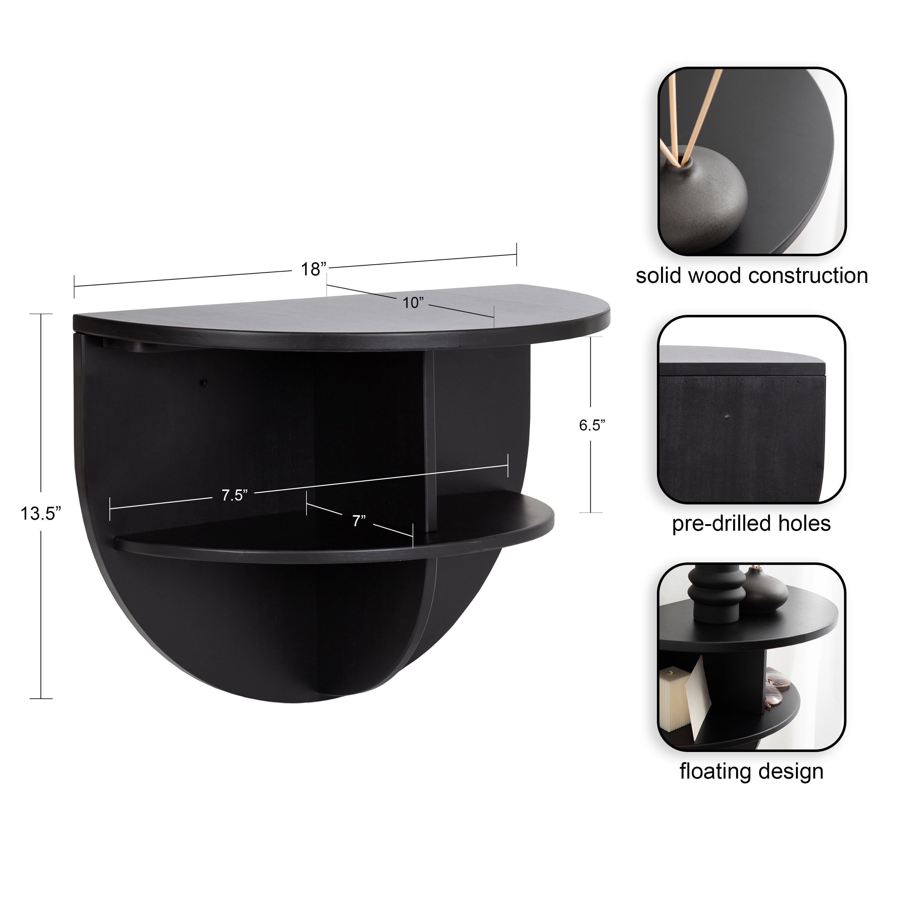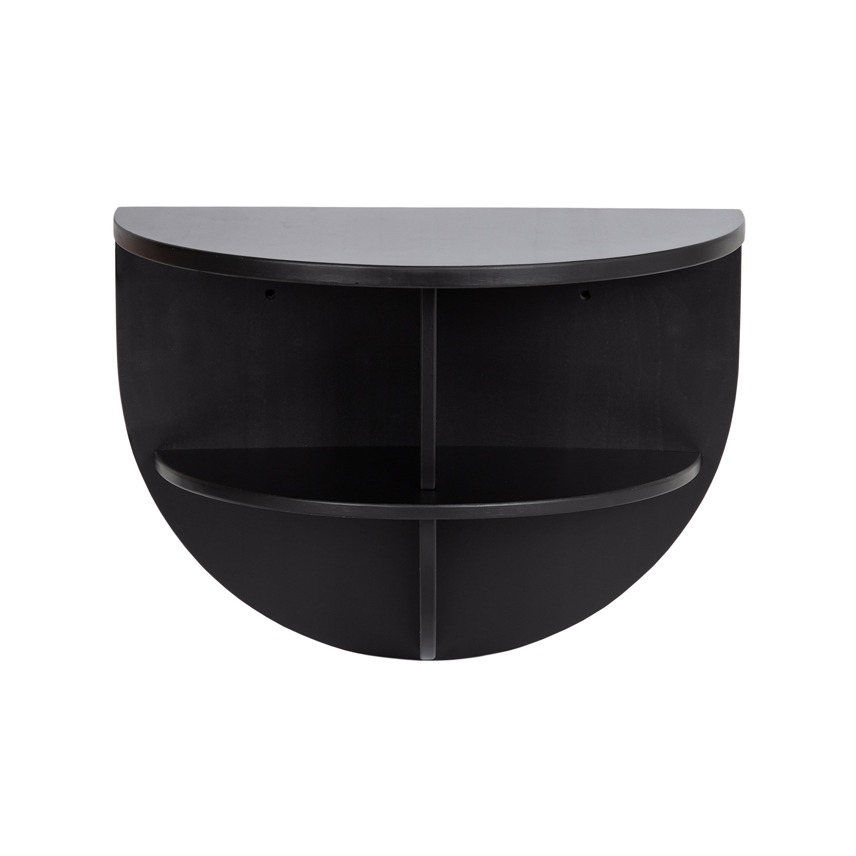 Introducing the Jalla wooden floating side table, a stylish and functional addition to your home decor. This modern wood floating shelf is designed with underlying shelving and unique curvature, adding a touch of sophistication to any room. Crafted from solid wood, it's built to last and withstand everyday use. One of the standout features of this floating side table is the convenient shelf space for extra storage. It's perfect for storing remote controls, chargers, pens, or any other small items you want to keep within easy reach. Or, use it as more of a decorative display with room for candles, books, plants, or picture frames.