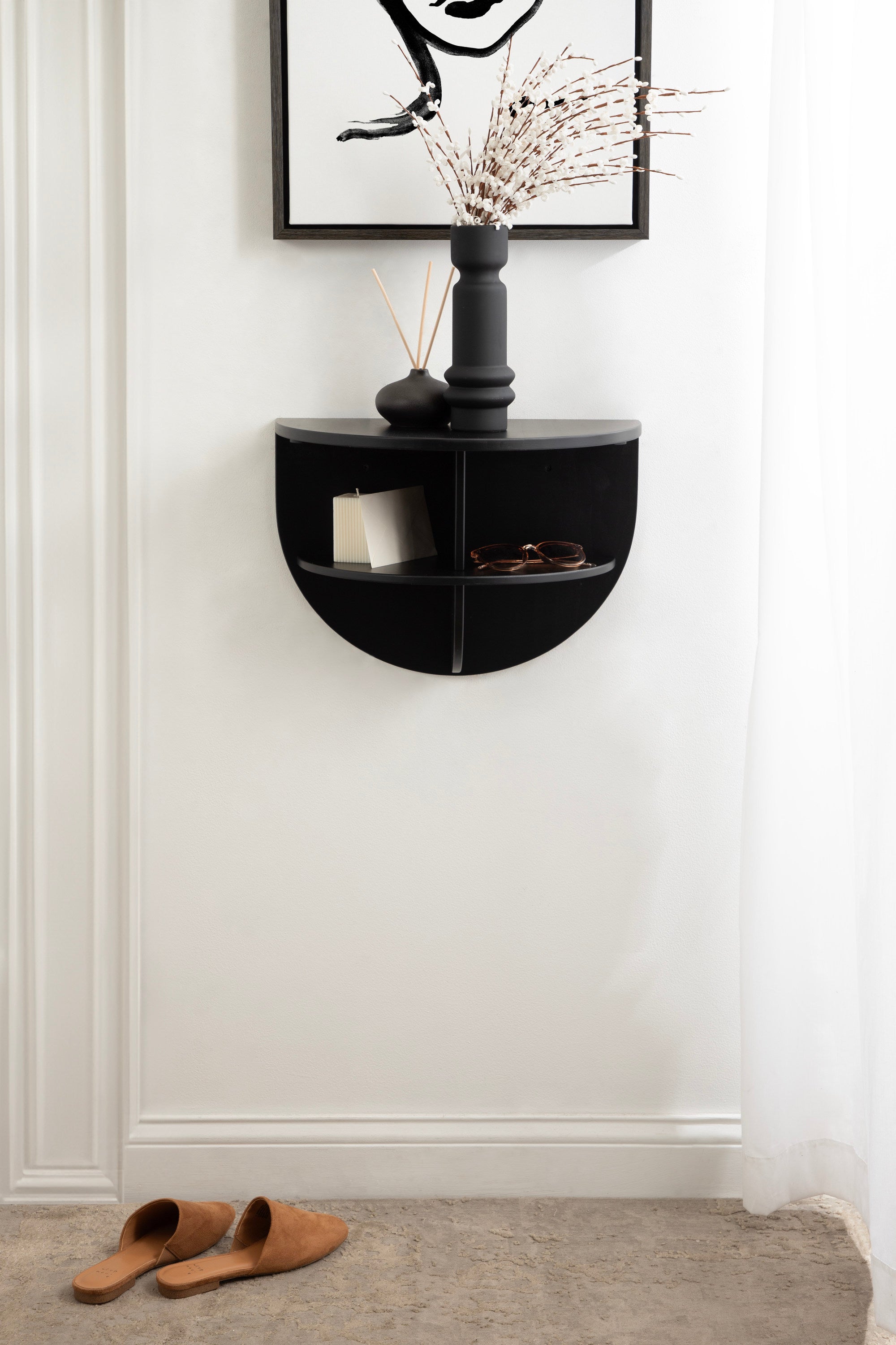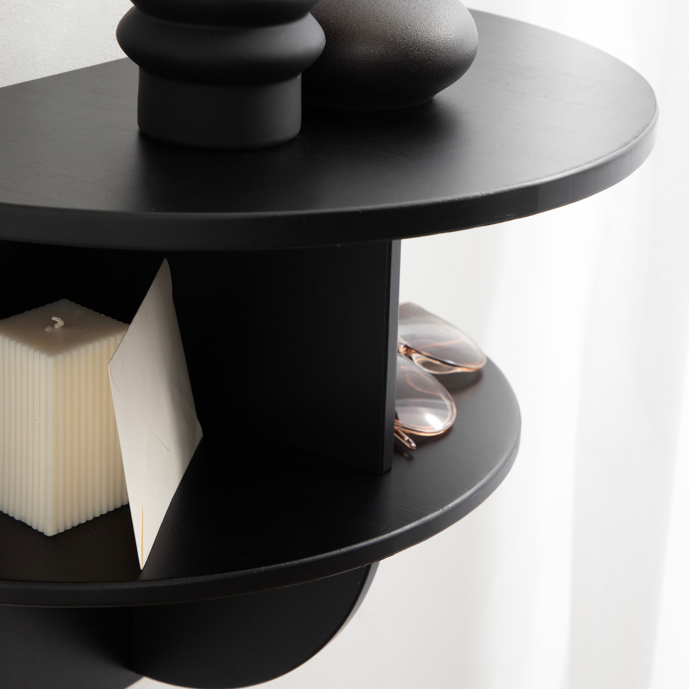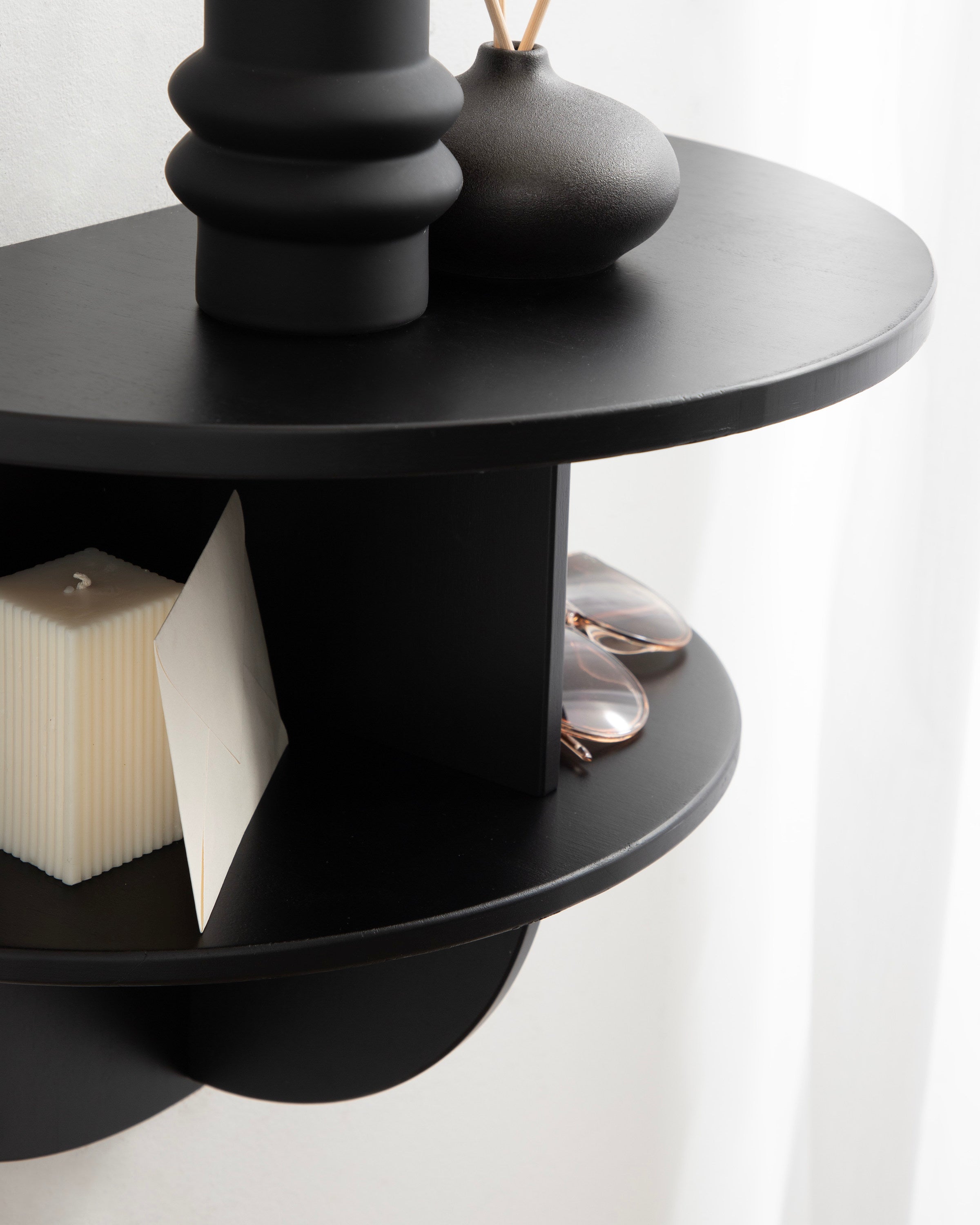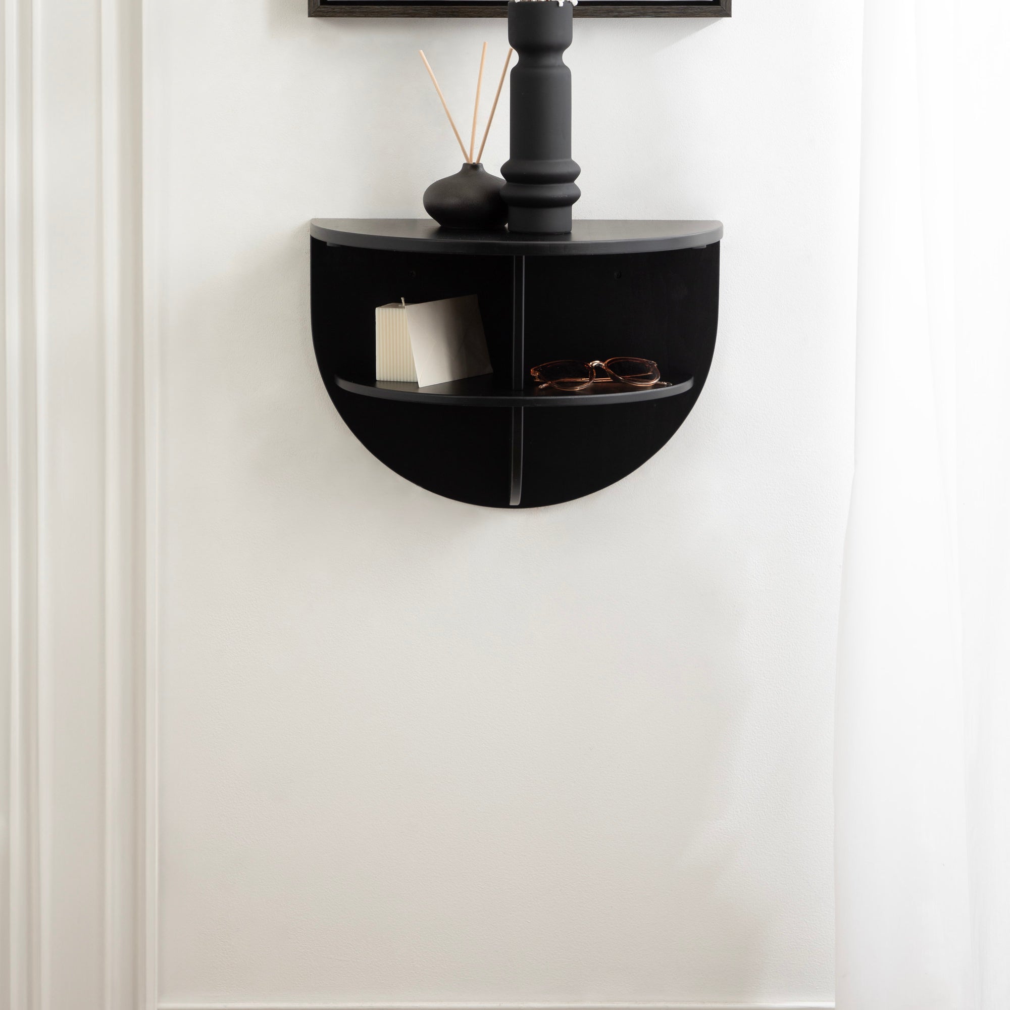Introducing the Jalla wooden floating side table, a stylish and functional addition to your home decor. This modern wood floating shelf is designed with underlying shelving and unique curvature, adding a touch of sophistication to any room. Crafted from solid wood, it's built to last and withstand everyday use. One of the standout features of this floating side table is the convenient shelf space for extra storage. It's perfect for storing remote controls, chargers, pens, or any other small items you want to keep within easy reach. Or, use it as more of a decorative display with room for candles, books, plants, or picture frames.