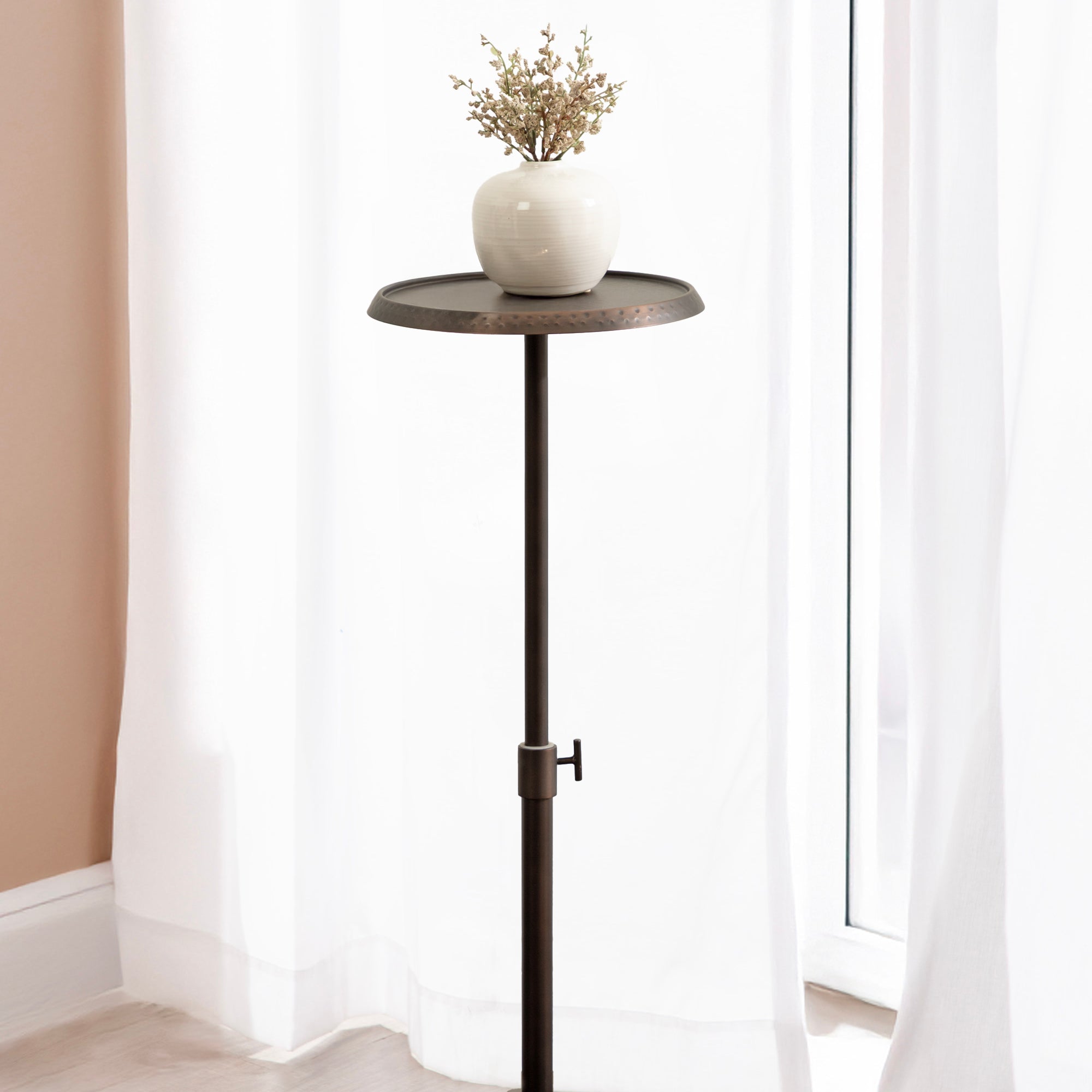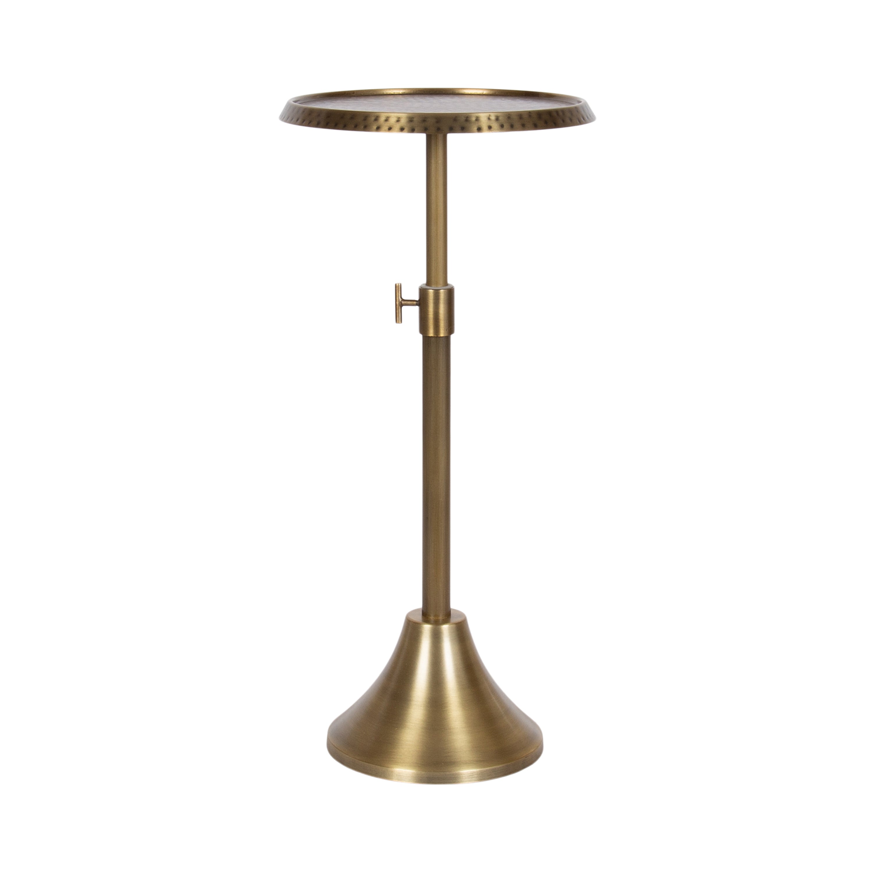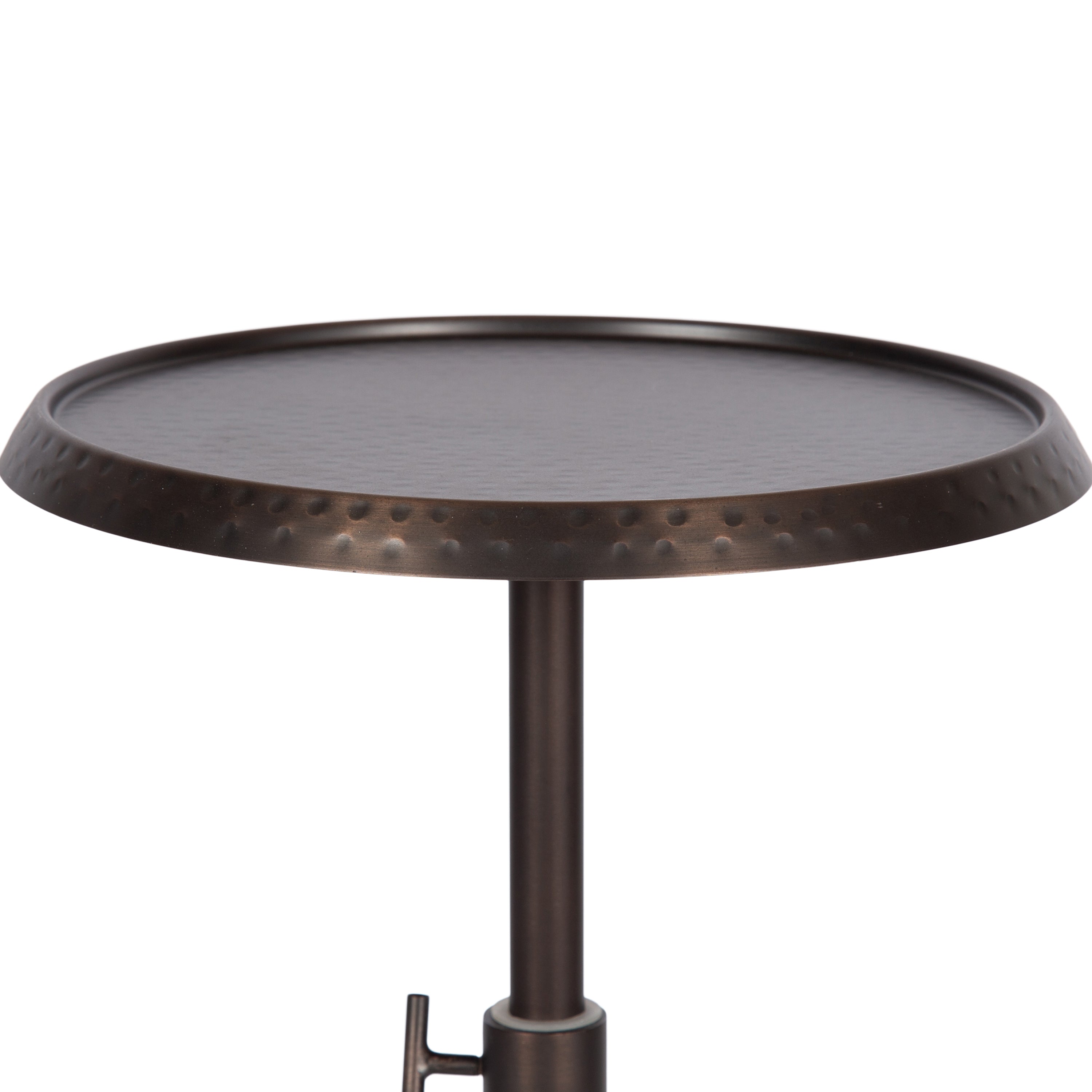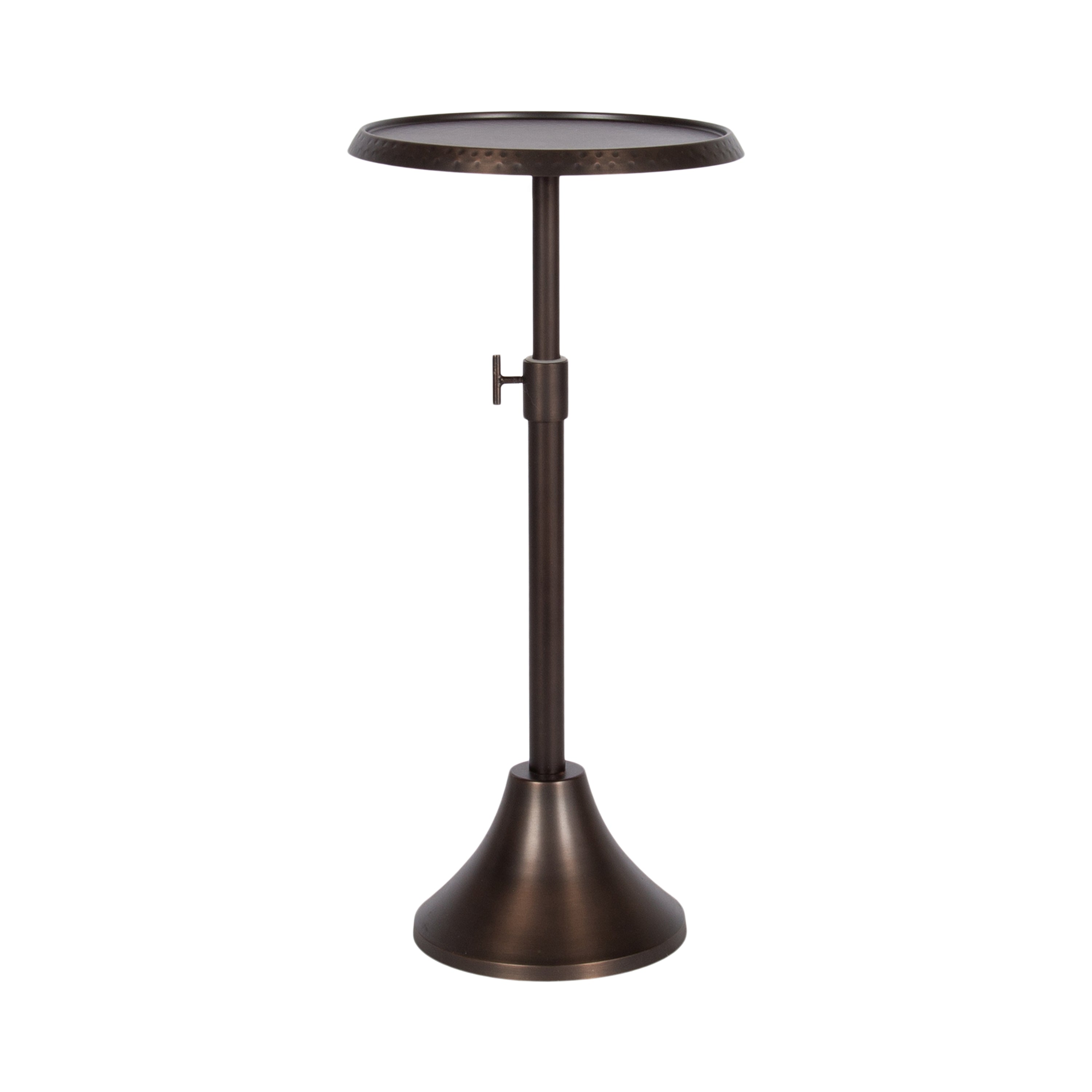This charming one-of-a-kind accent table makes a bold impression with its handcrafted traditional style. The Sanzo drink table has a sophisticated design, with a round tabletop featuring a hammered tabletop design crafted by artisans in India. This round drink table features a unique telescope design, which allows you to adjust the height anywhere from 22.25 inches to 29.75 inches tall. This means that you can make it fit whatever height works best for your space. The Sanzo pedestal table looks great serving drinks on coasters, acting as a catch-all for small household items, or displaying a sprawling house plant as a plant stand. The small size makes it fantastic for small spaces or corners as well. Assemble this beautiful drink table in a matter of minutes with an easy-to-follow, no-tools assembly process.