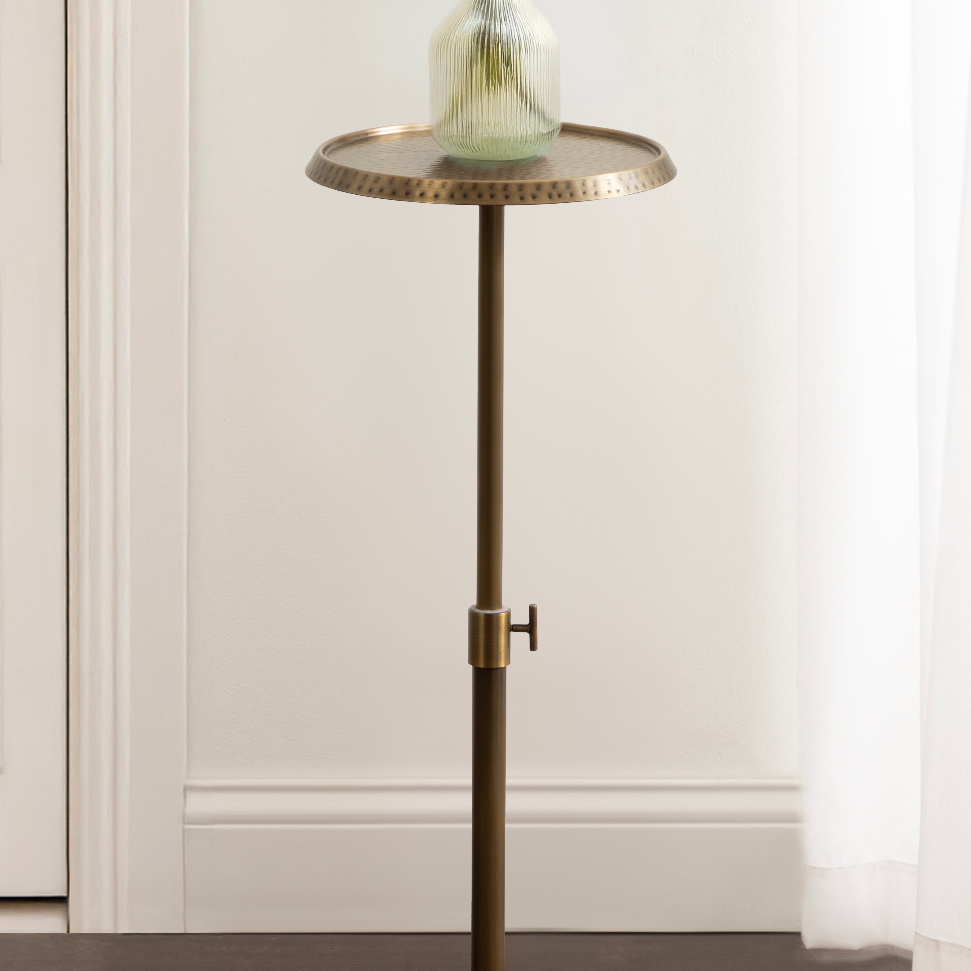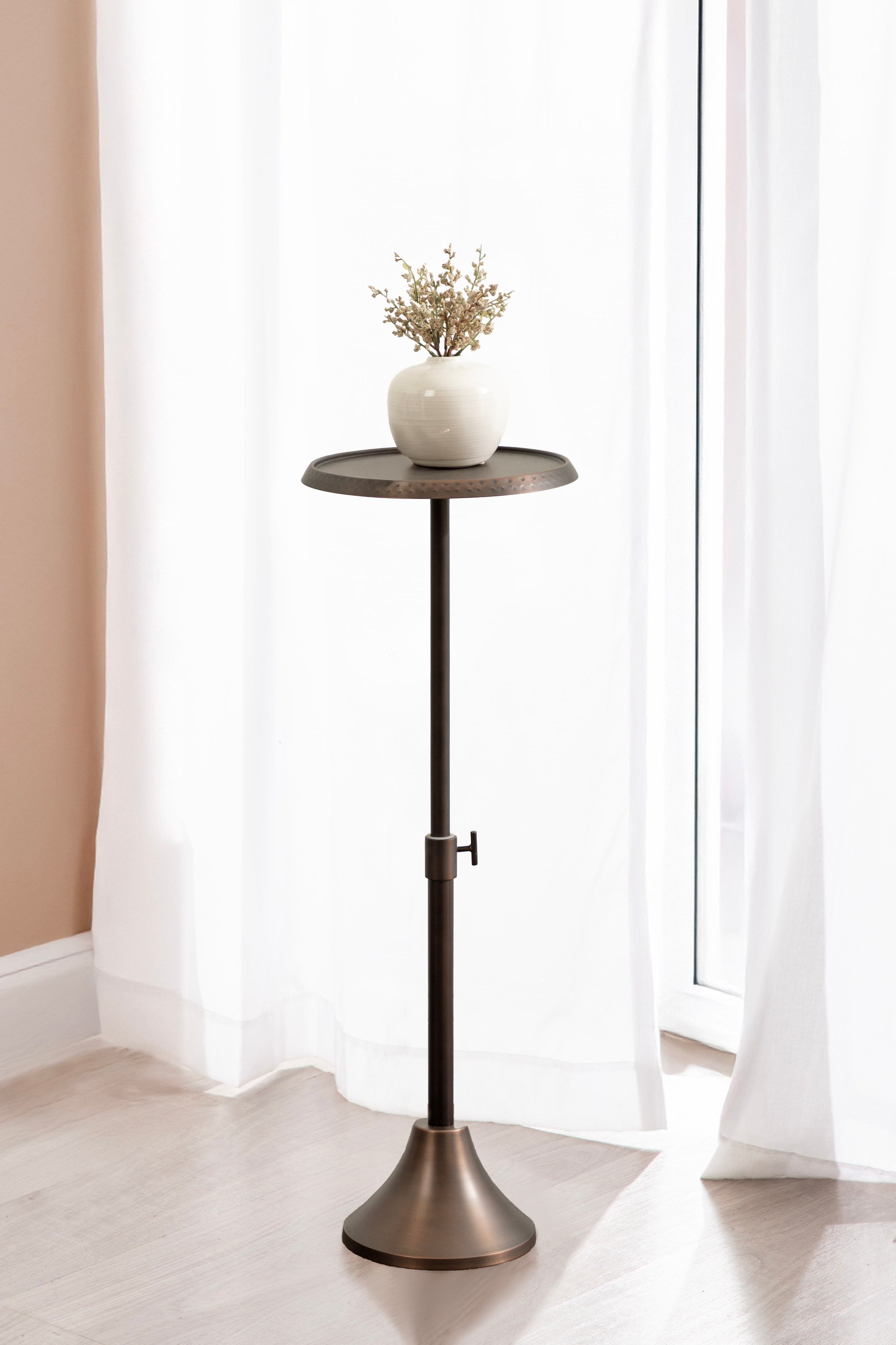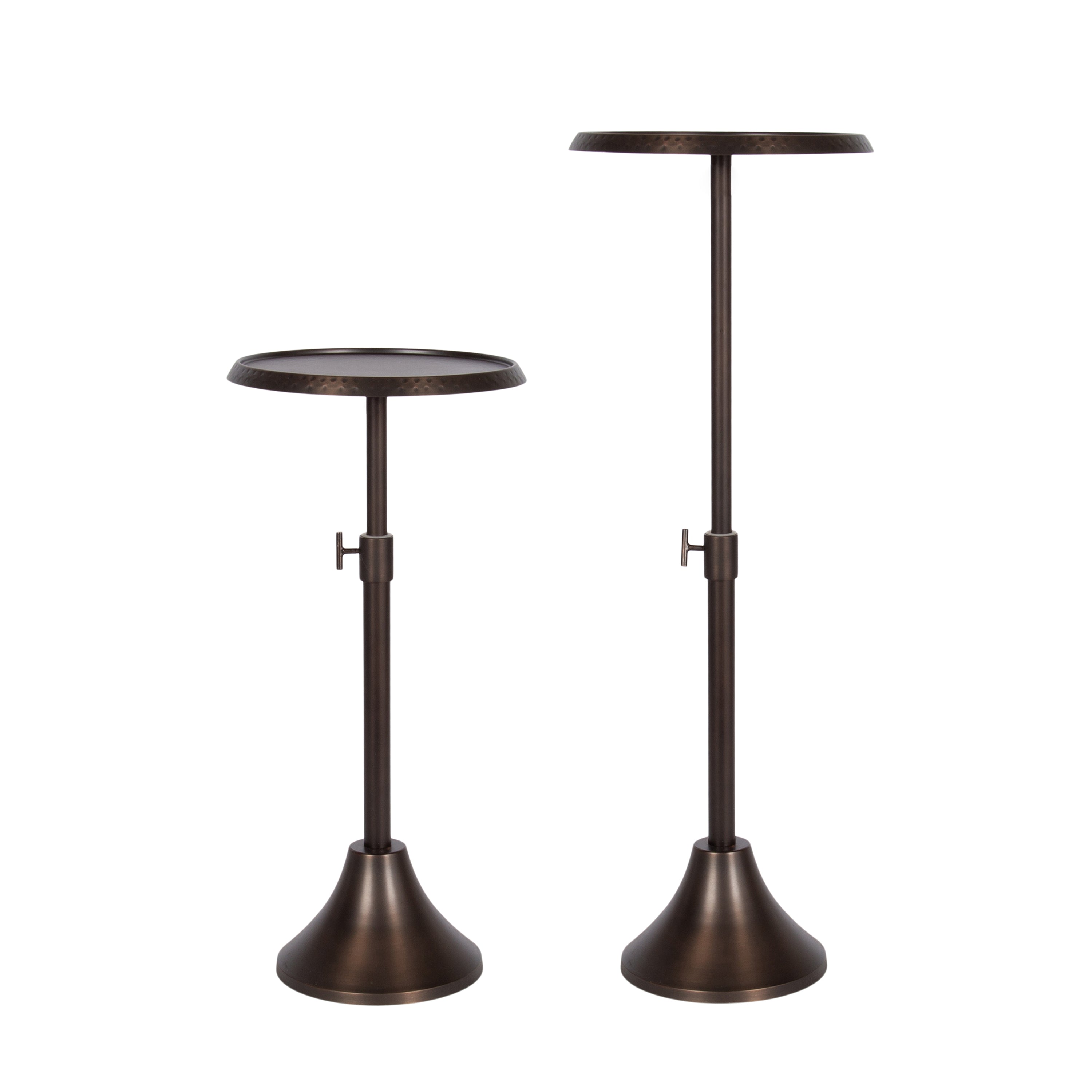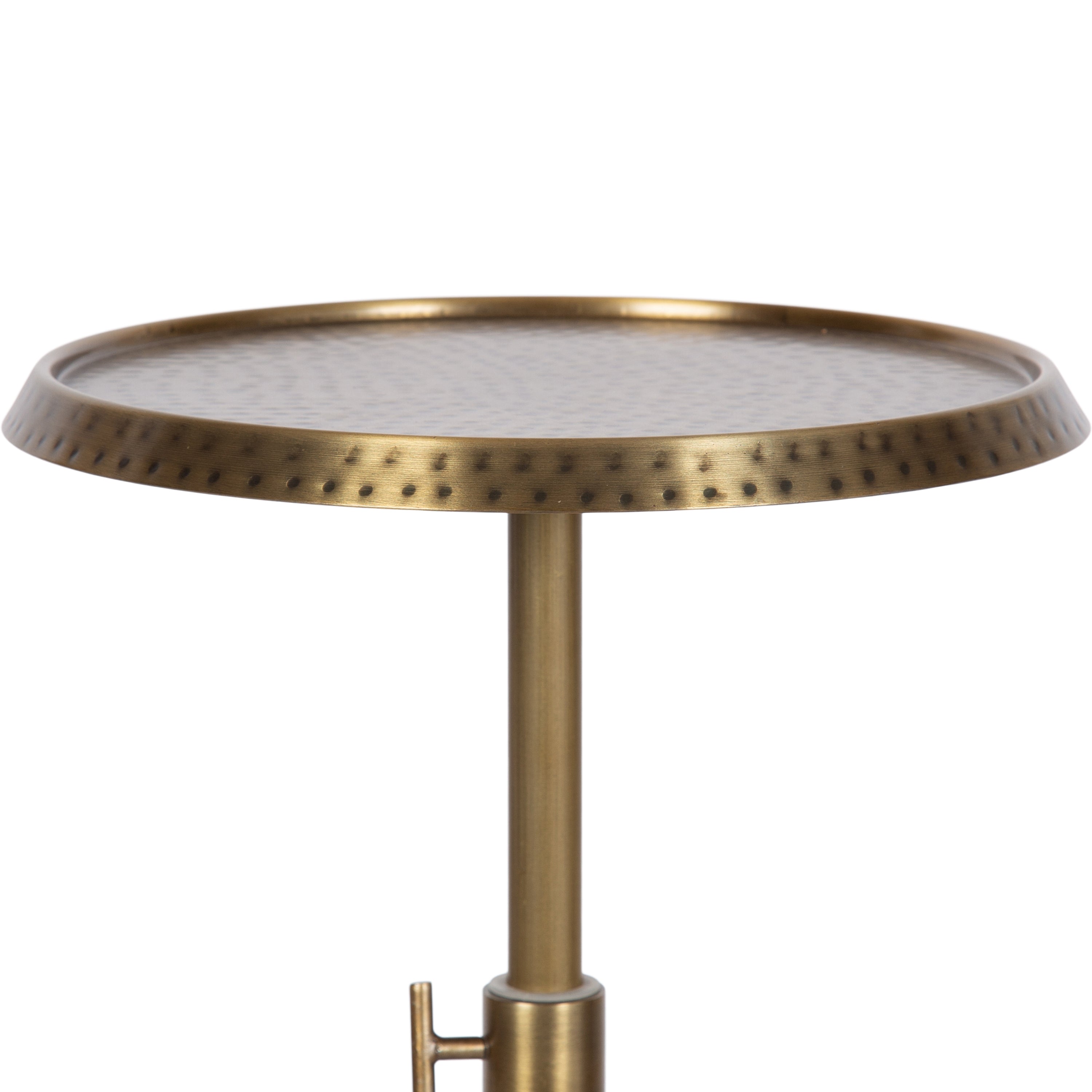 This charming one-of-a-kind accent table makes a bold impression with its handcrafted traditional style. The Sanzo drink table has a sophisticated design, with a round tabletop featuring a hammered tabletop design crafted by artisans in India. This round drink table features a unique telescope design, which allows you to adjust the height anywhere from 22.25 inches to 29.75 inches tall. This means that you can make it fit whatever height works best for your space. The Sanzo pedestal table looks great serving drinks on coasters, acting as a catch-all for small household items, or displaying a sprawling house plant as a plant stand. The small size makes it fantastic for small spaces or corners as well. Assemble this beautiful drink table in a matter of minutes with an easy-to-follow, no-tools assembly process.
