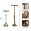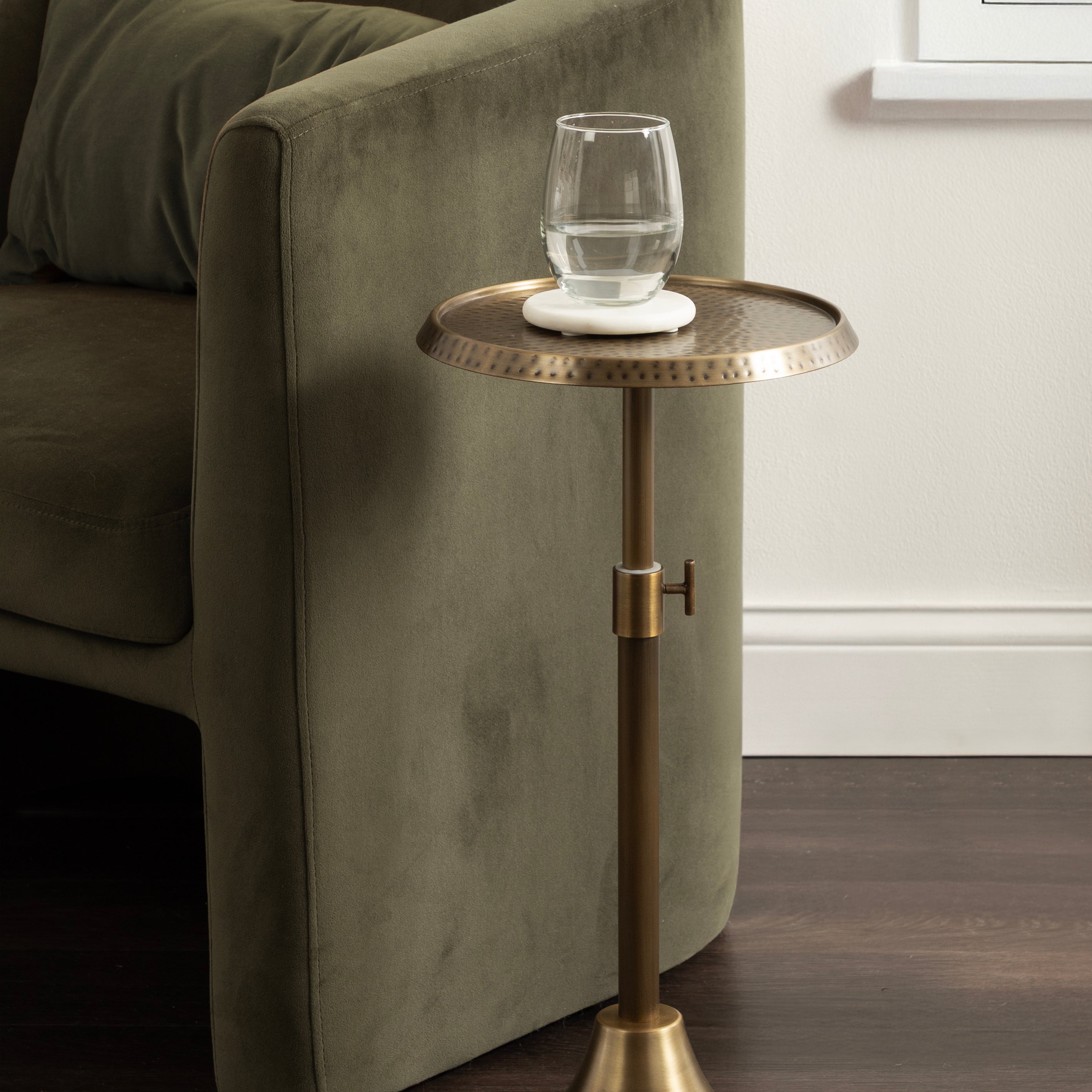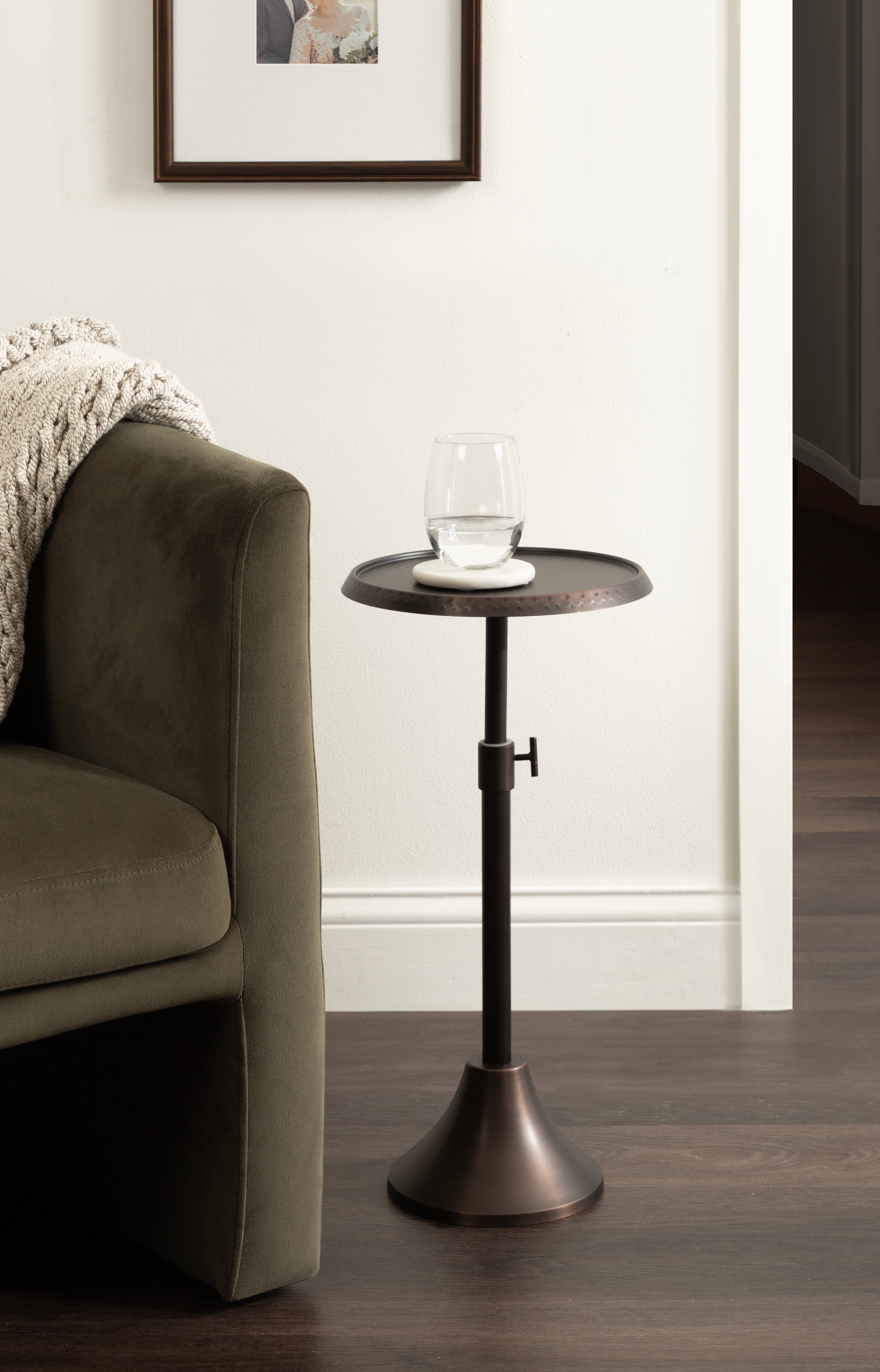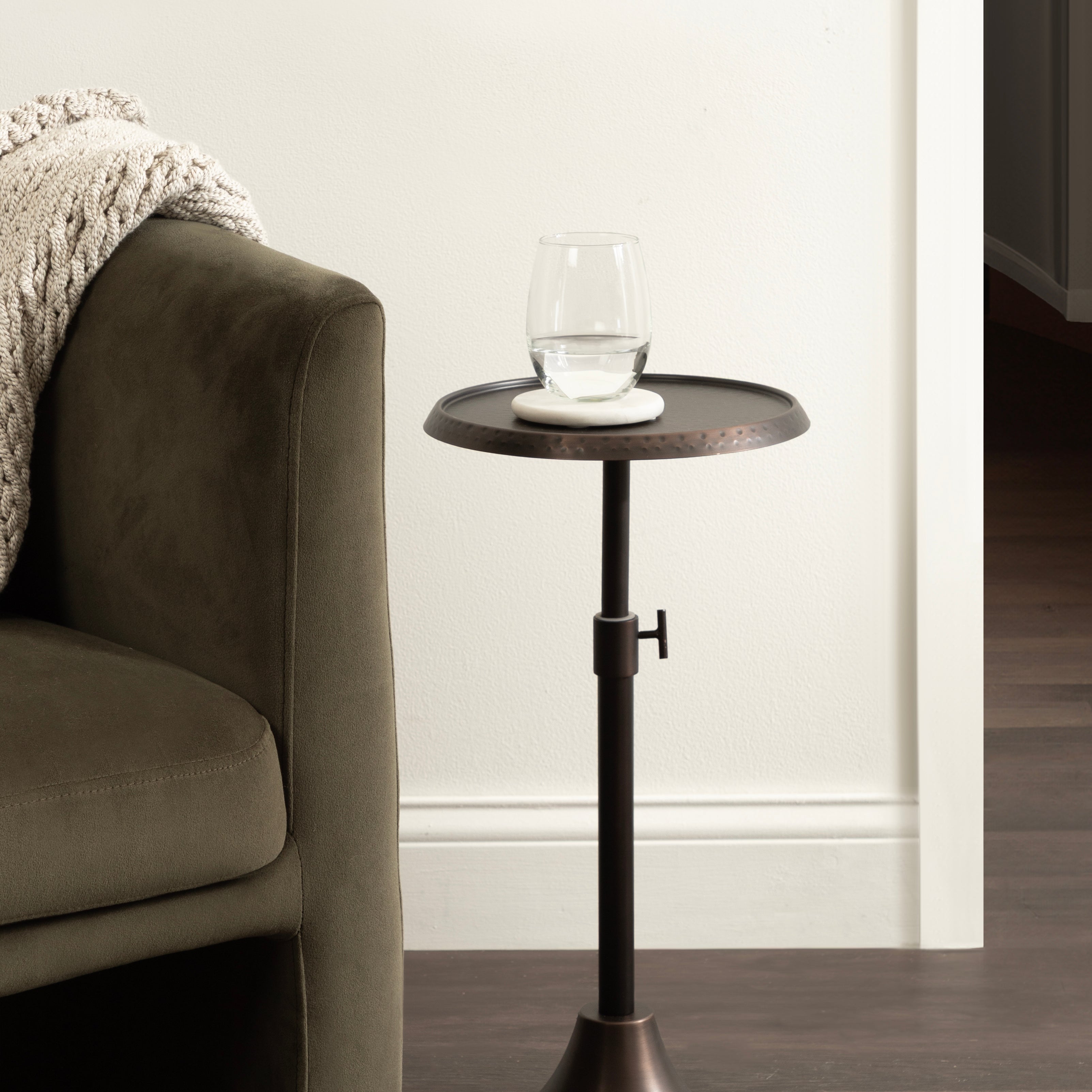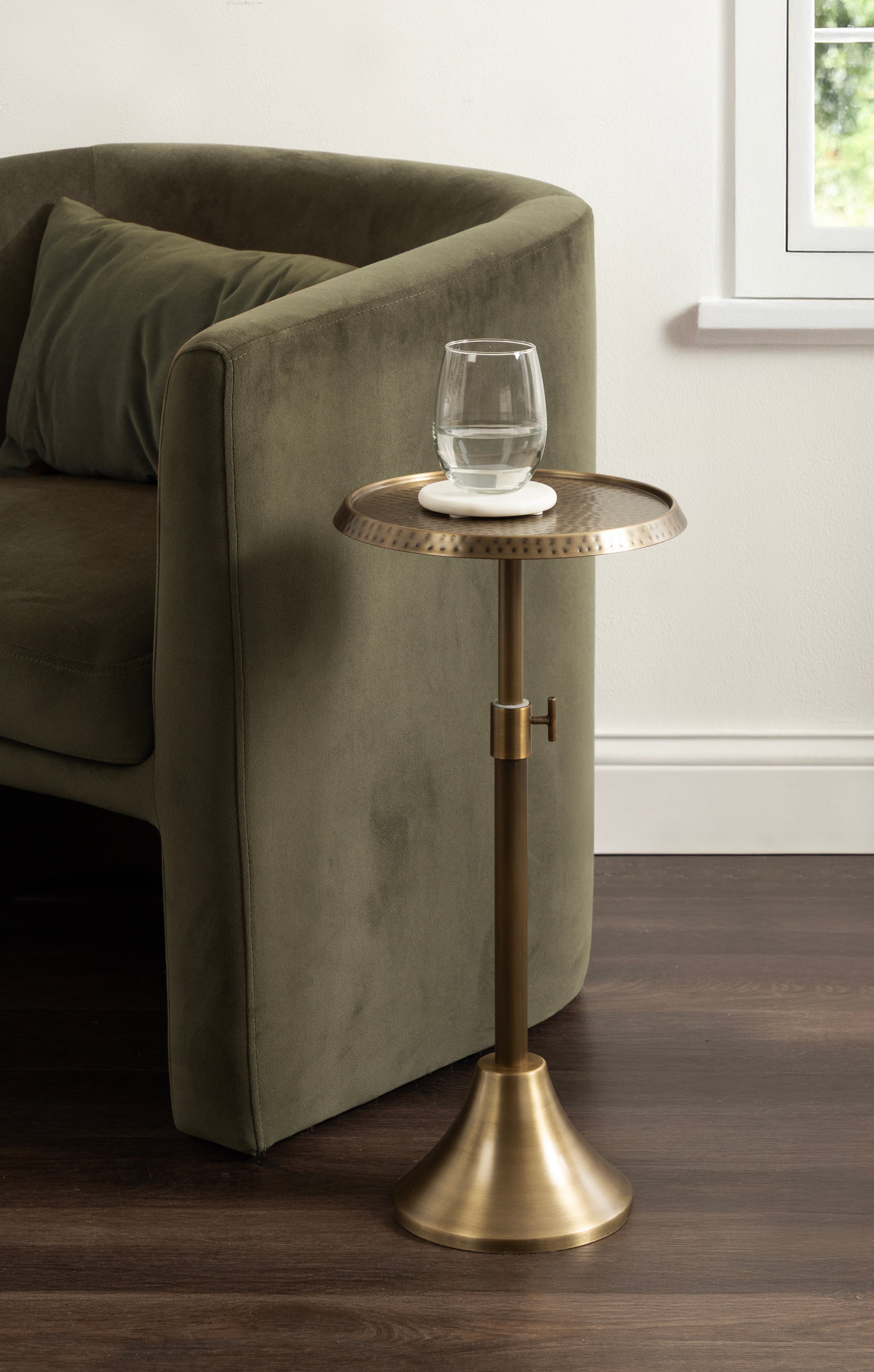 This charming one-of-a-kind accent table makes a bold impression with its handcrafted traditional style. The Sanzo drink table has a sophisticated design, with a round tabletop featuring a hammered tabletop design crafted by artisans in India. This round drink table features a unique telescope design, which allows you to adjust the height anywhere from 22.25 inches to 29.75 inches tall. This means that you can make it fit whatever height works best for your space. The Sanzo pedestal table looks great serving drinks on coasters, acting as a catch-all for small household items, or displaying a sprawling house plant as a plant stand. The small size makes it fantastic for small spaces or corners as well. Assemble this beautiful drink table in a matter of minutes with an easy-to-follow, no-tools assembly process.