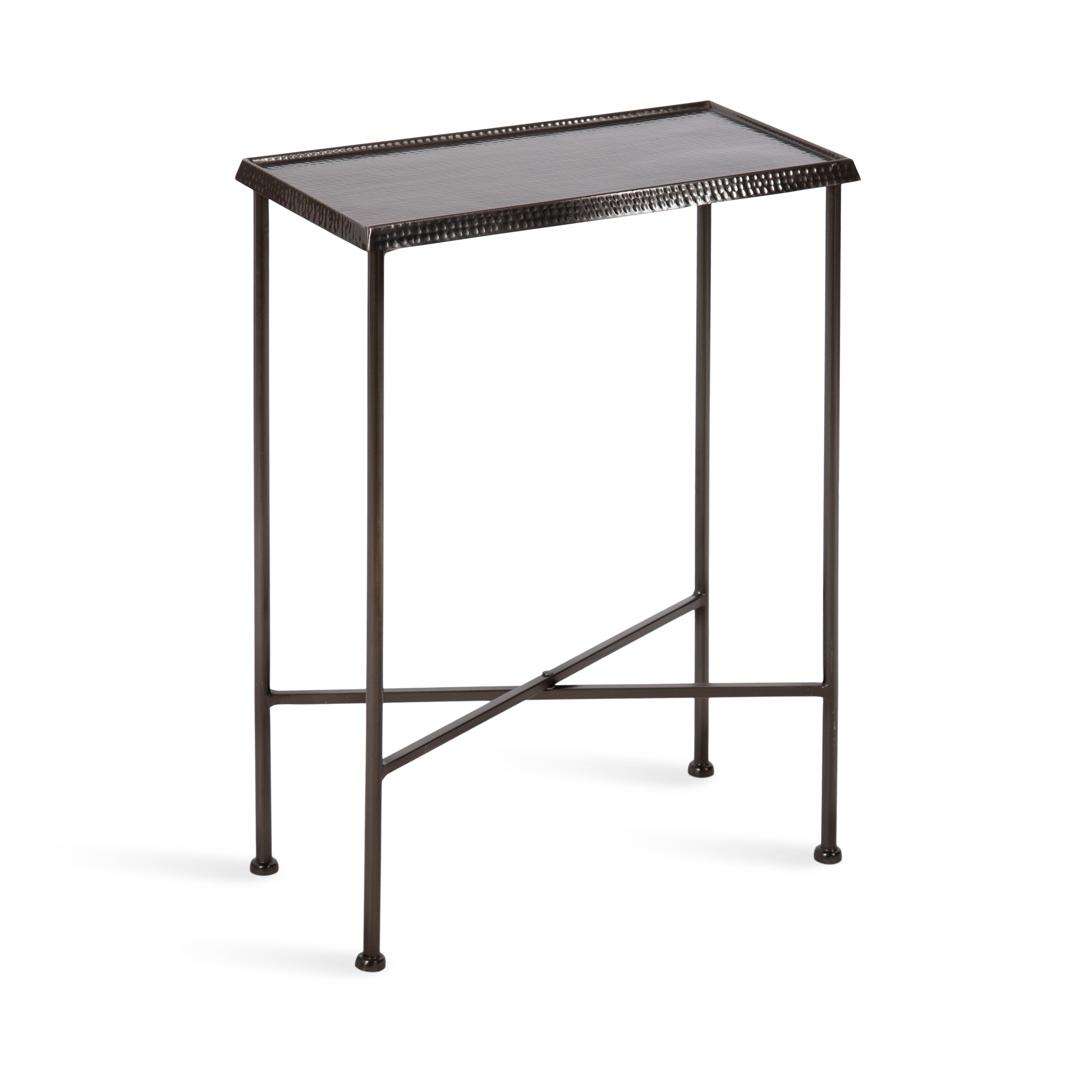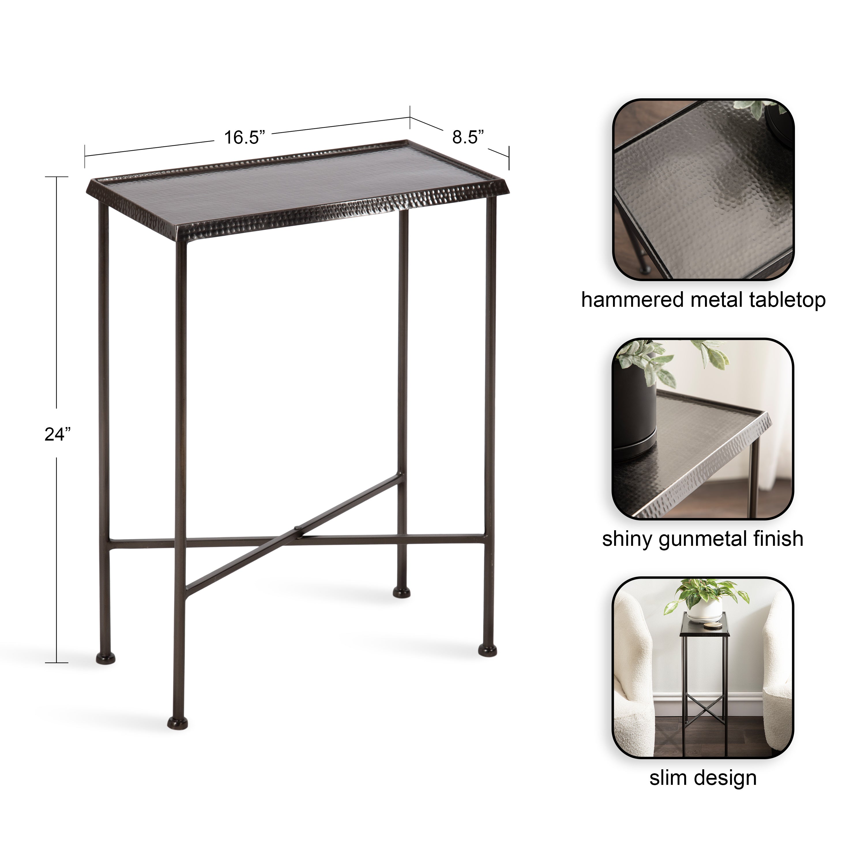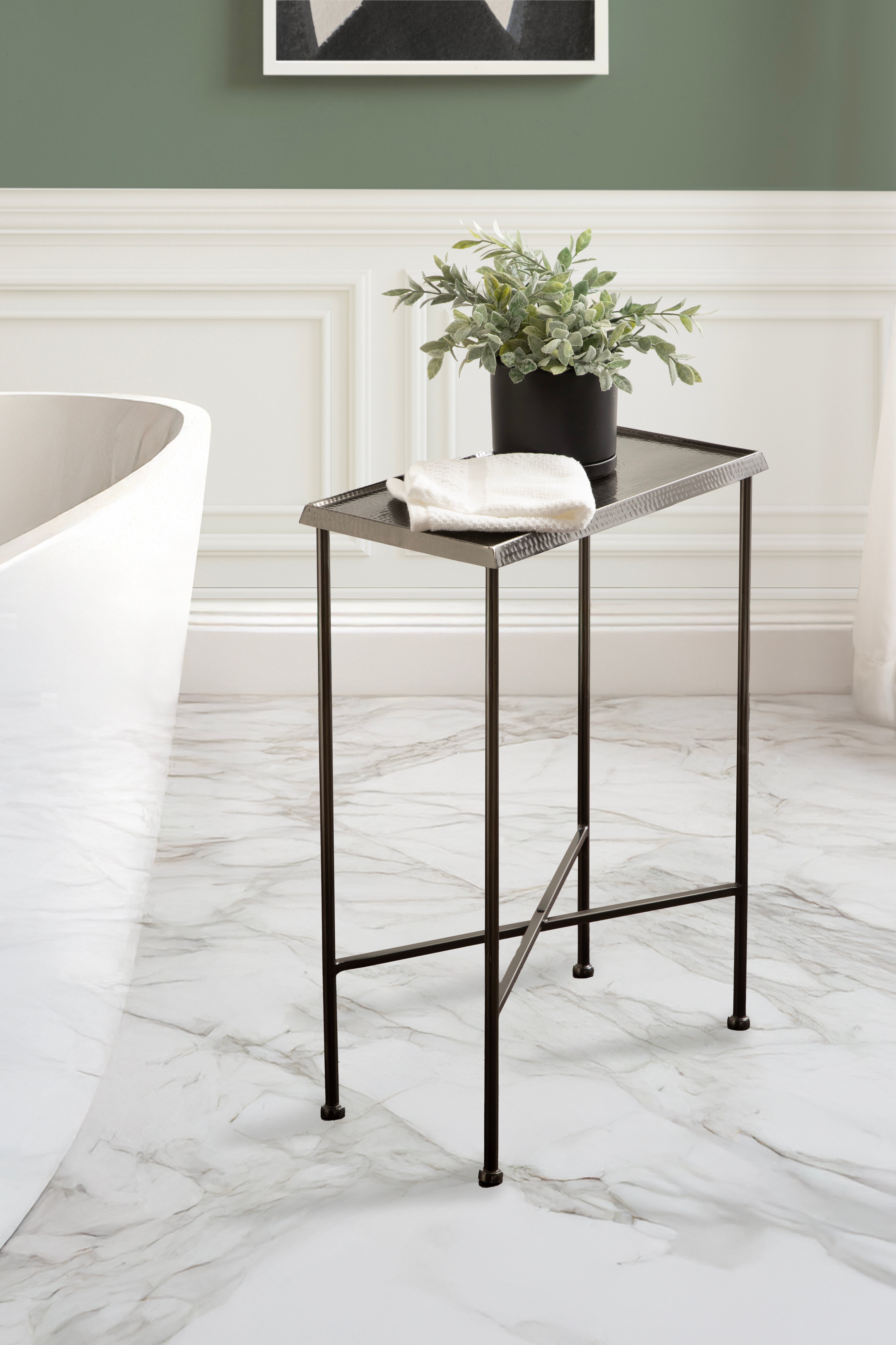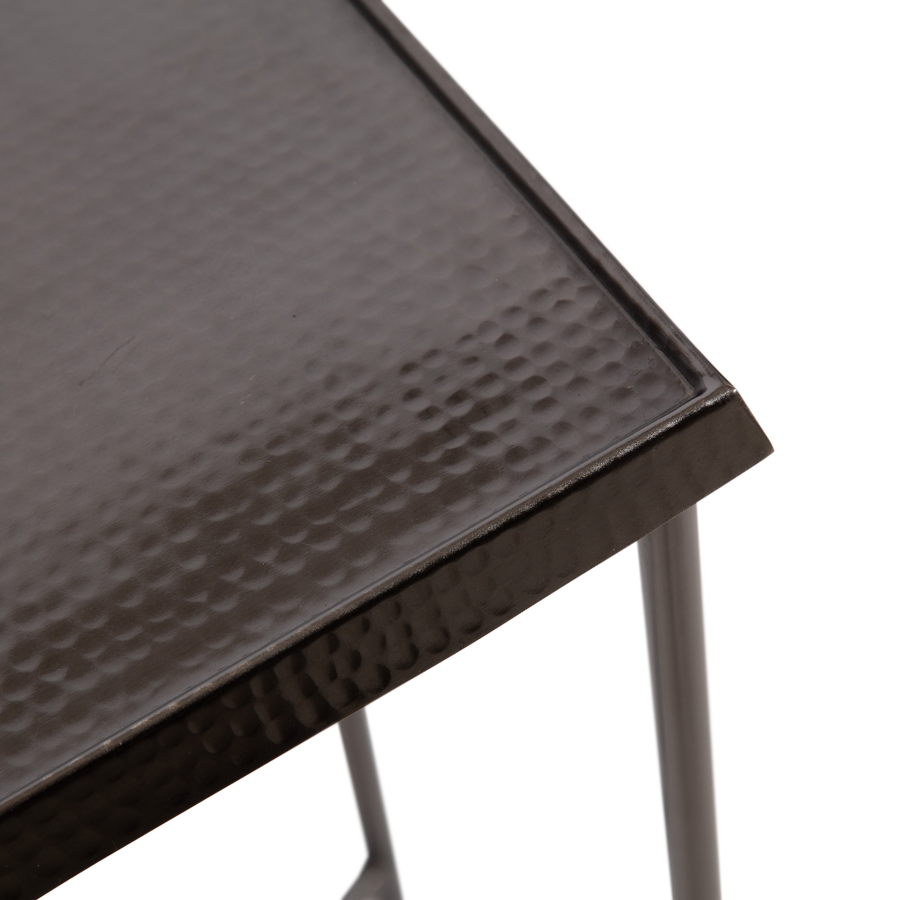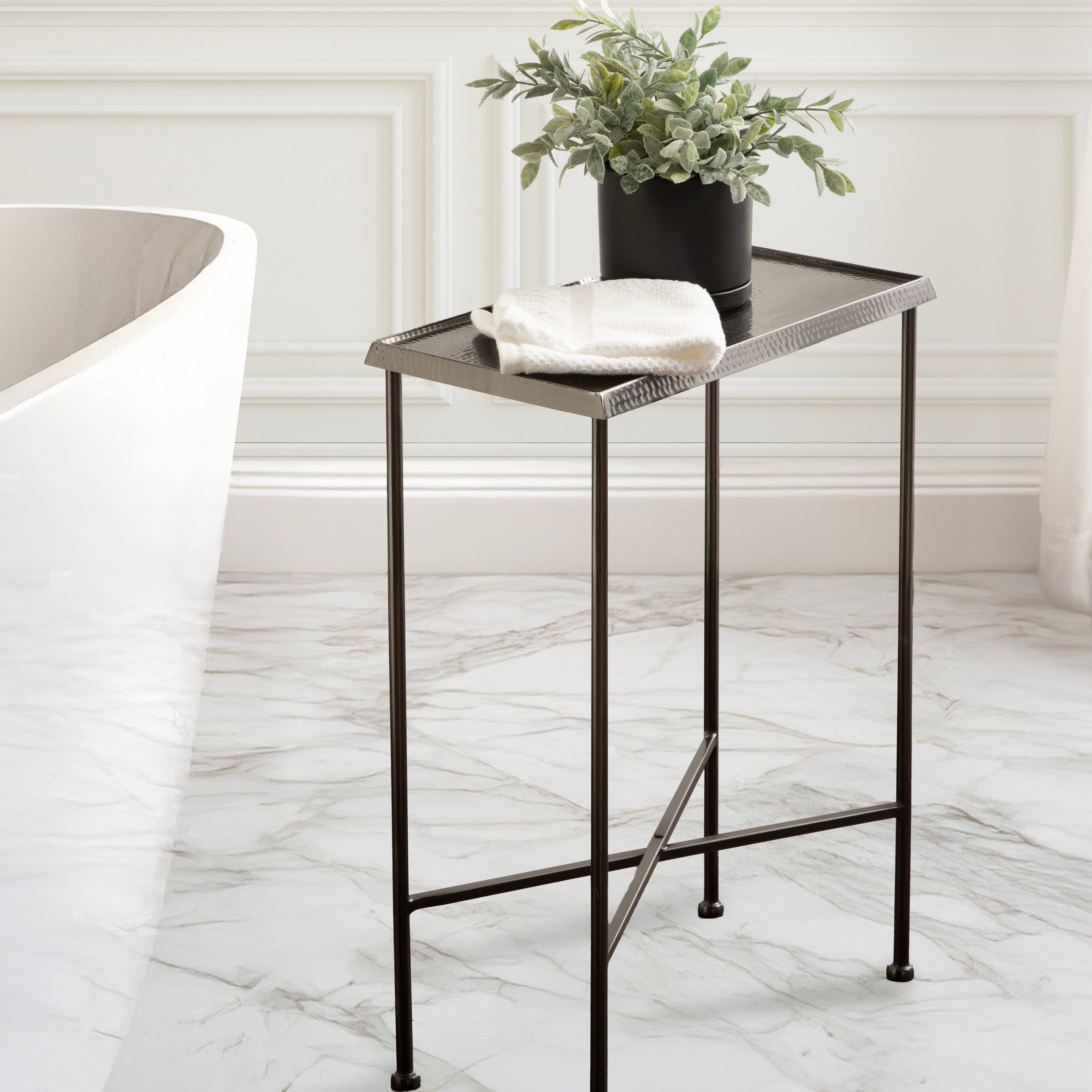 For the interior decorator with a passion for modern design comes our Sanzo narrow side table. The Sanzo collection features a solid iron construction with a hand-applied hammered texture crafted by artisans in India. The tabletop's surface area is a perfect display or storage area for lamps, morning coffee, plants, alarm clocks, or other small items. Use it as a living room table, a slim nightstand in the bedroom, or an accent table near your bathtub. Regardless of where you put it, the Sanzo end table makes for a unique statement piece in any area of your modern home. Everything down to the beautiful finish echoes glamorous, timeless design and style. You won't have to work hard to set up this charming table, either; the Sanzo side table has a simple, three-step assembly process.