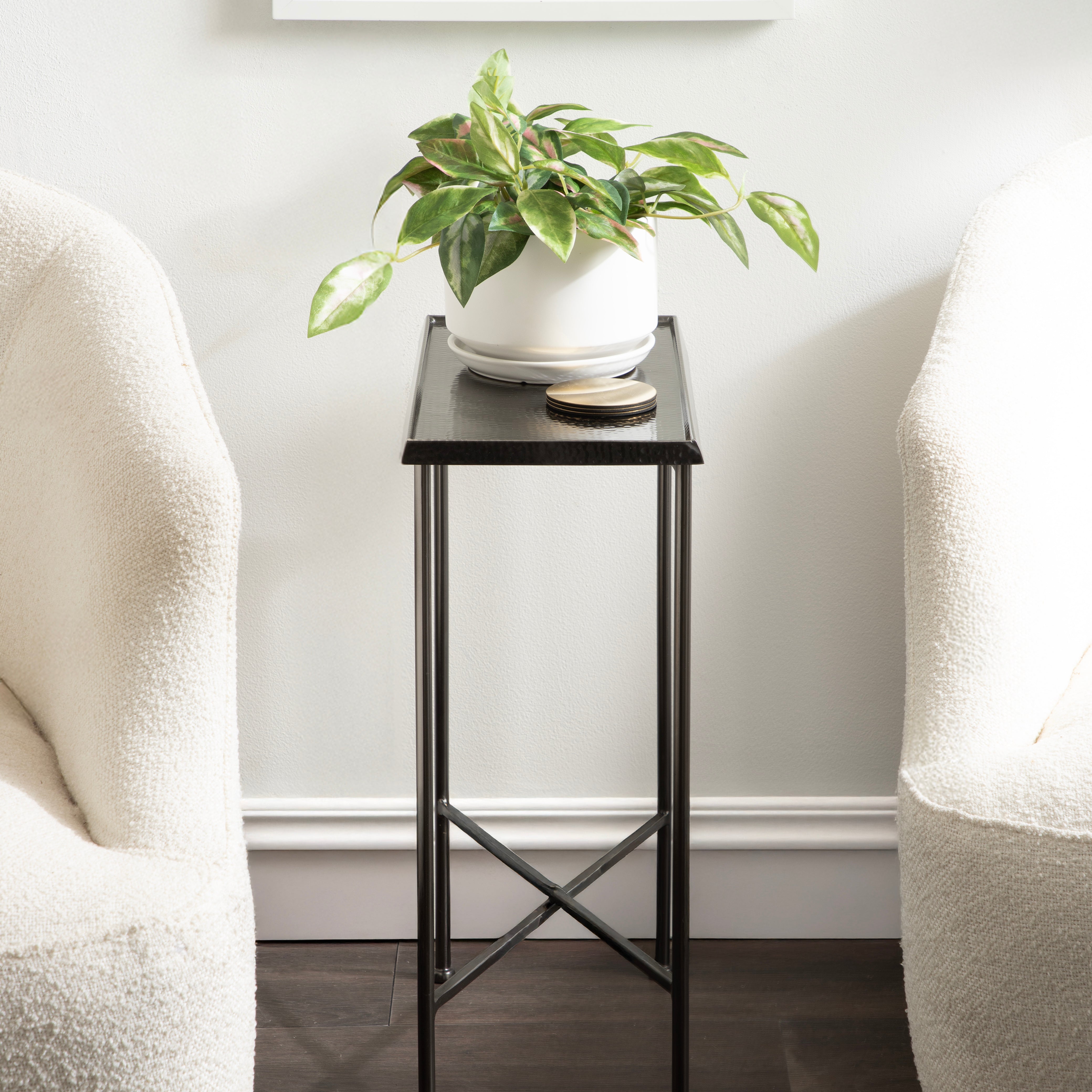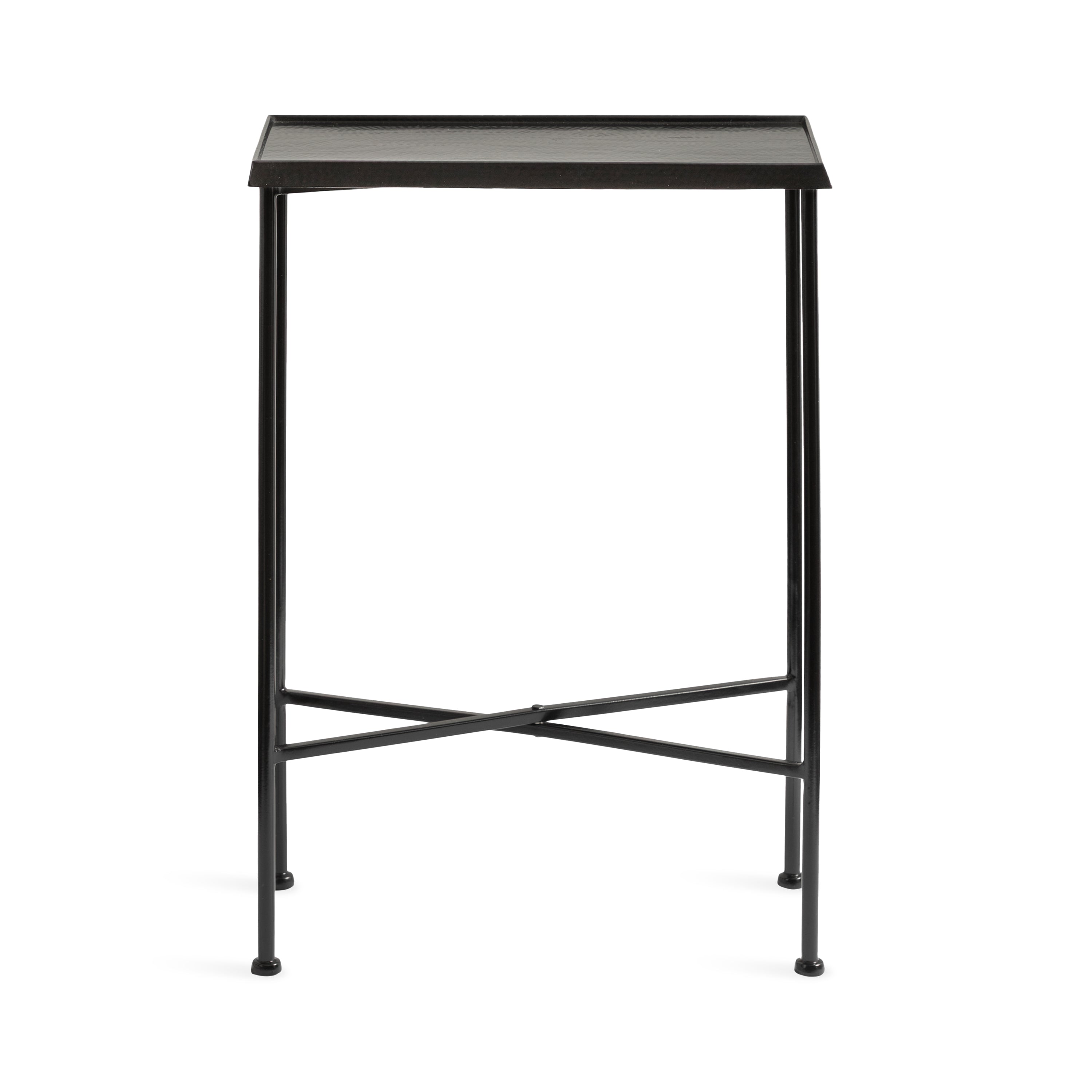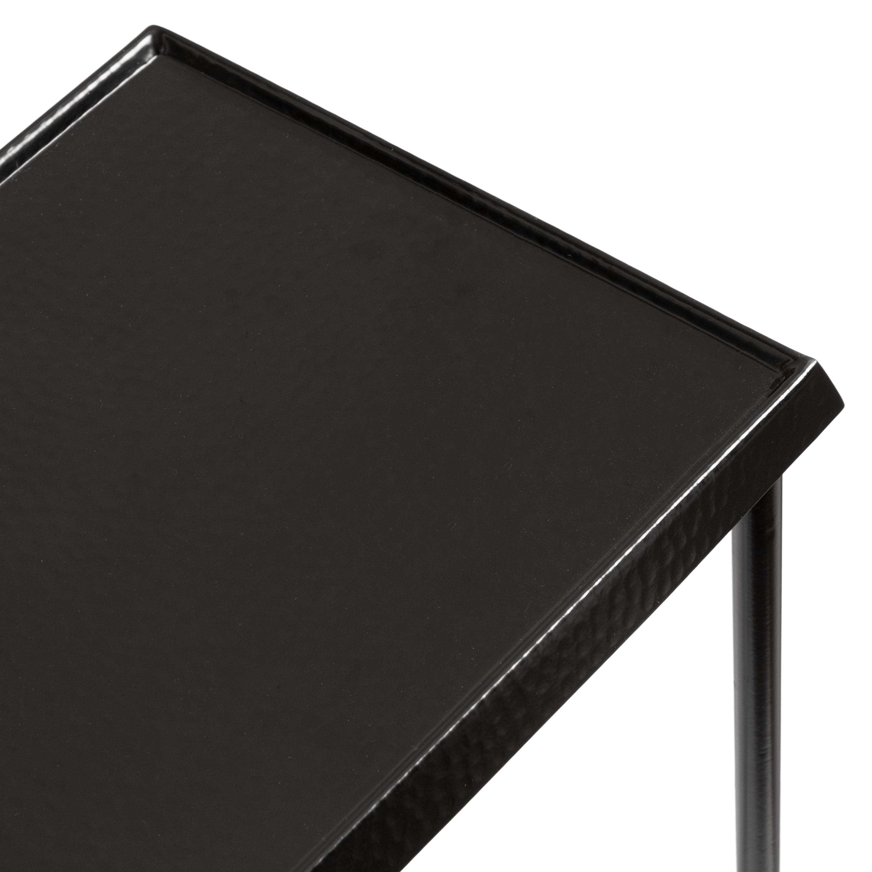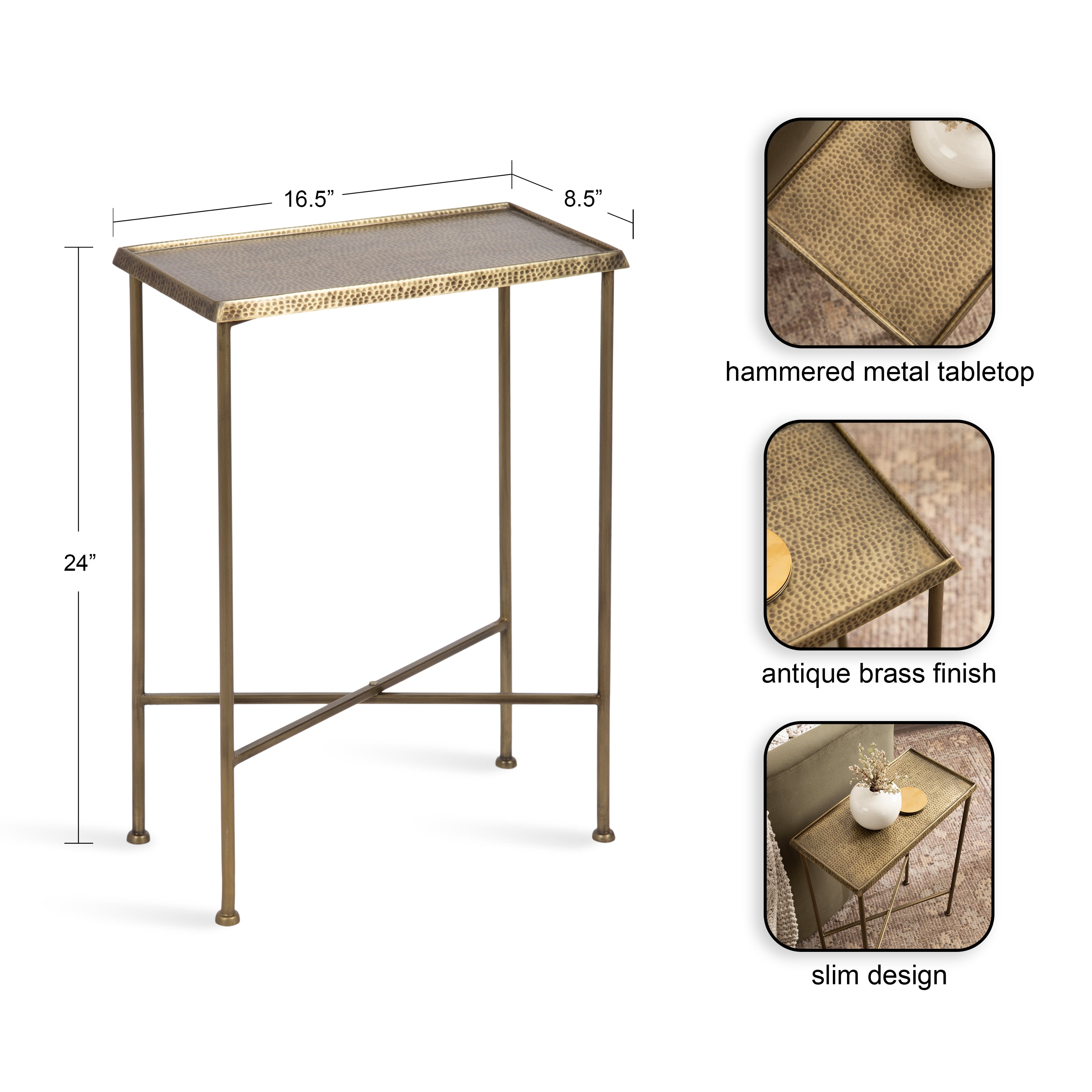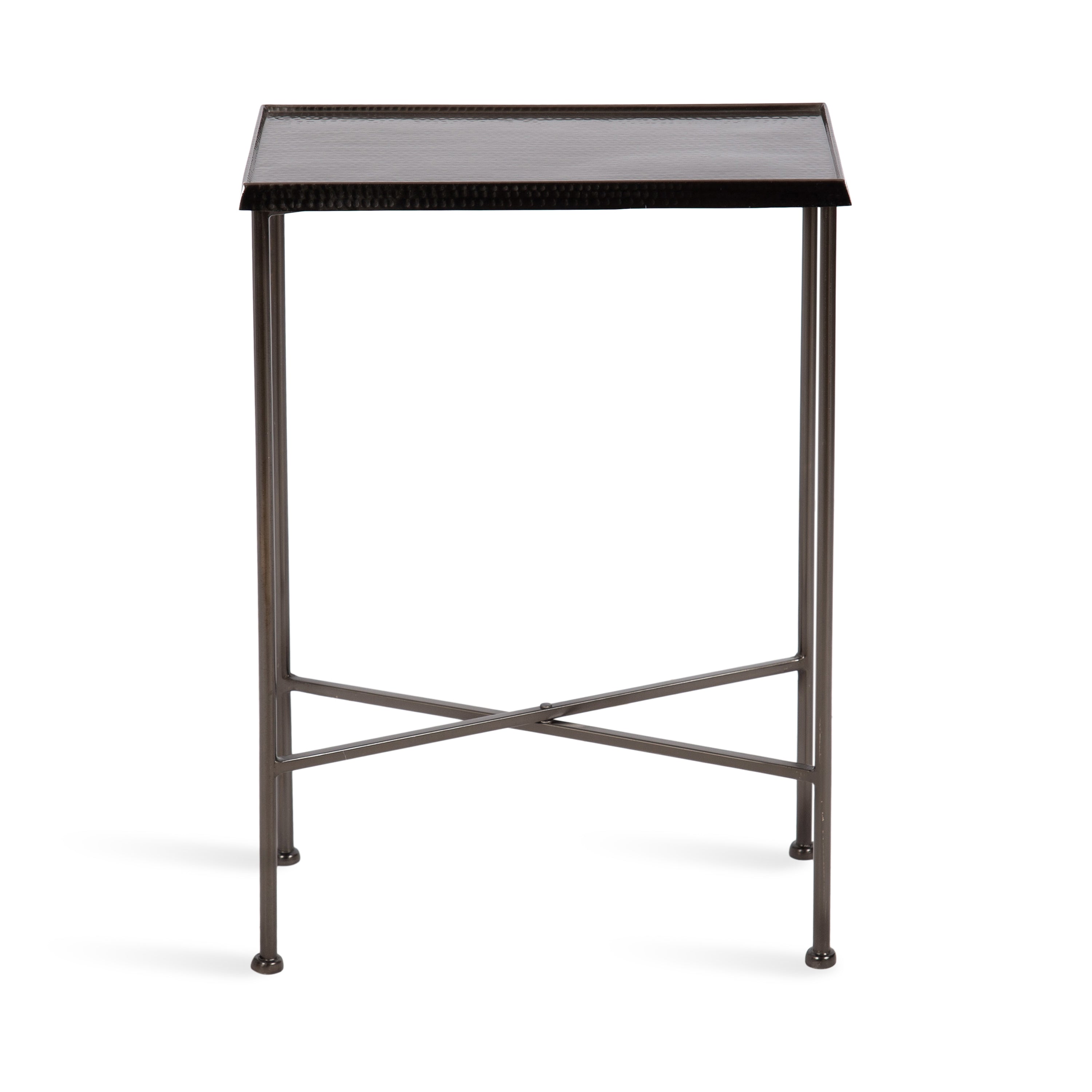 For the interior decorator with a passion for modern design comes our Sanzo narrow side table. The Sanzo collection features a solid iron construction with a hand-applied hammered texture crafted by artisans in India. The tabletop's surface area is a perfect display or storage area for lamps, morning coffee, plants, alarm clocks, or other small items. Use it as a living room table, a slim nightstand in the bedroom, or an accent table near your bathtub. Regardless of where you put it, the Sanzo end table makes for a unique statement piece in any area of your modern home. Everything down to the beautiful finish echoes glamorous, timeless design and style. You won't have to work hard to set up this charming table, either; the Sanzo side table has a simple, three-step assembly process.