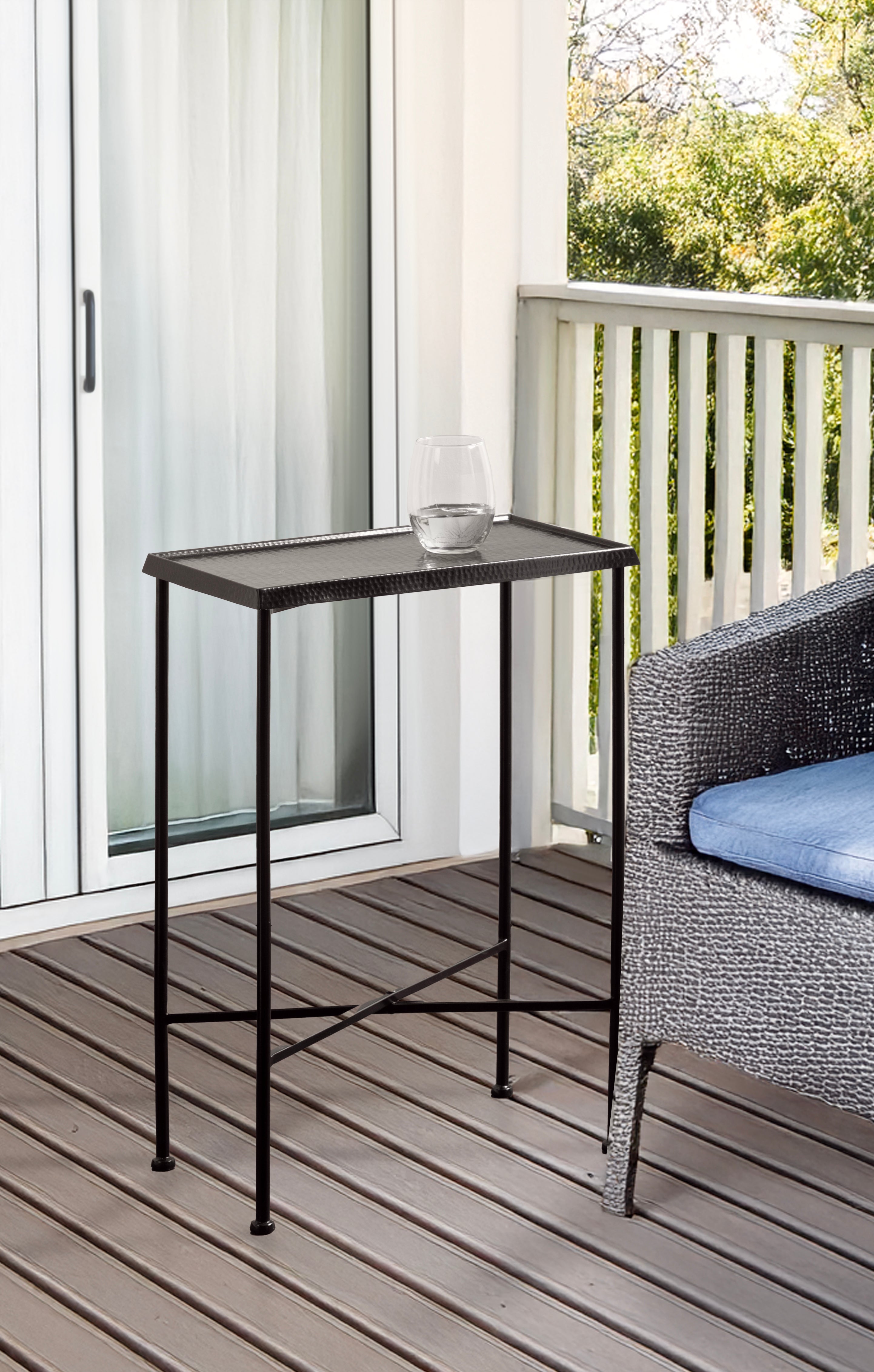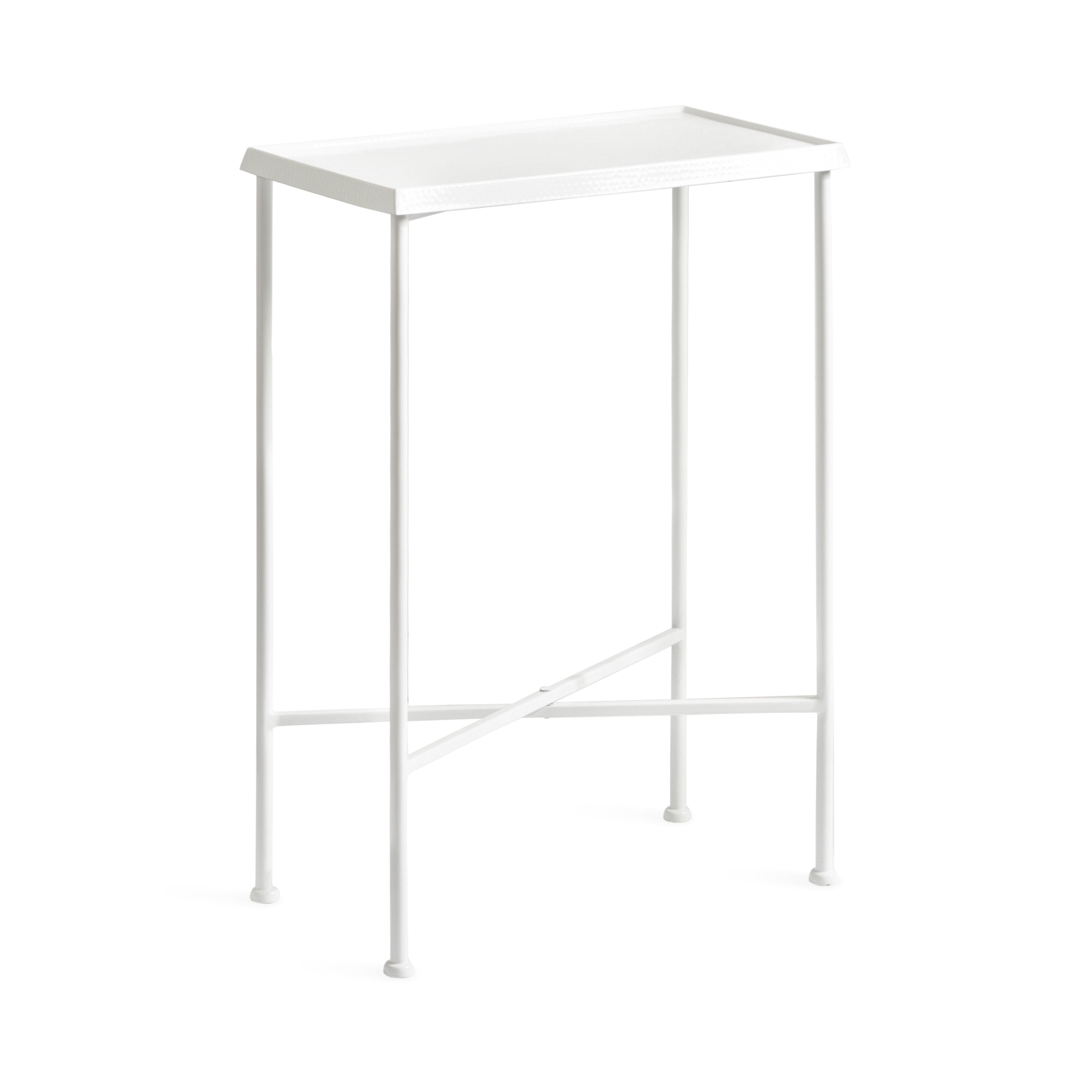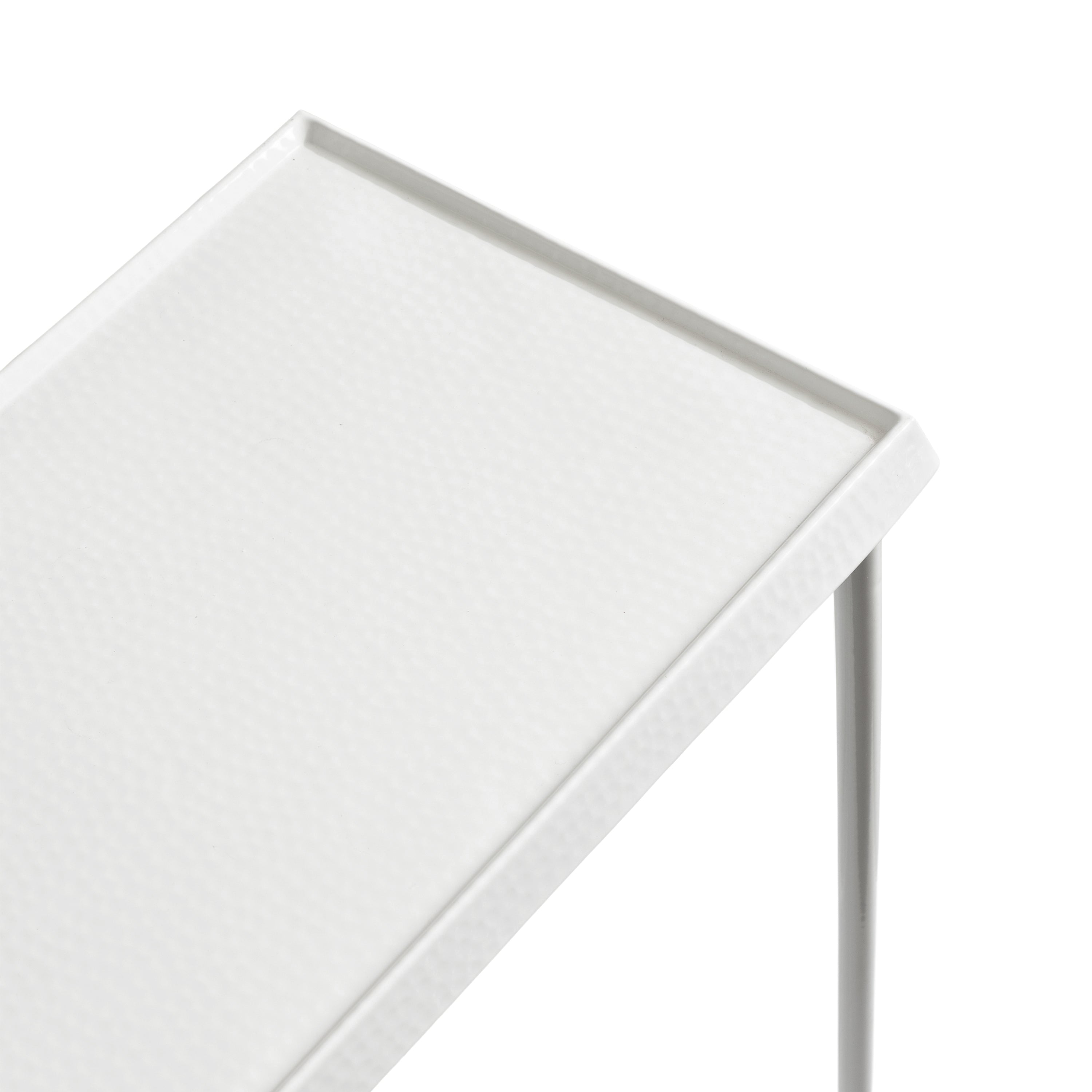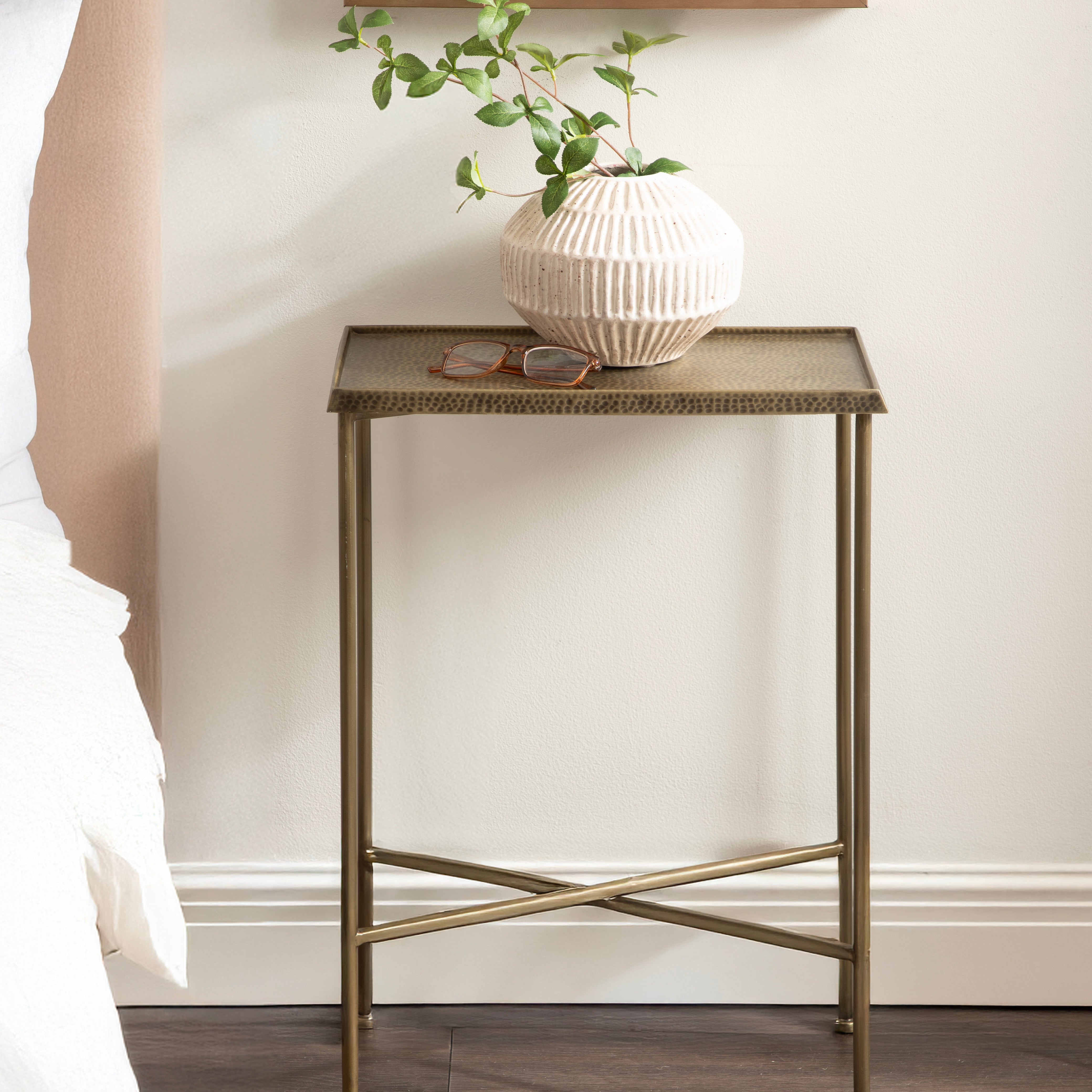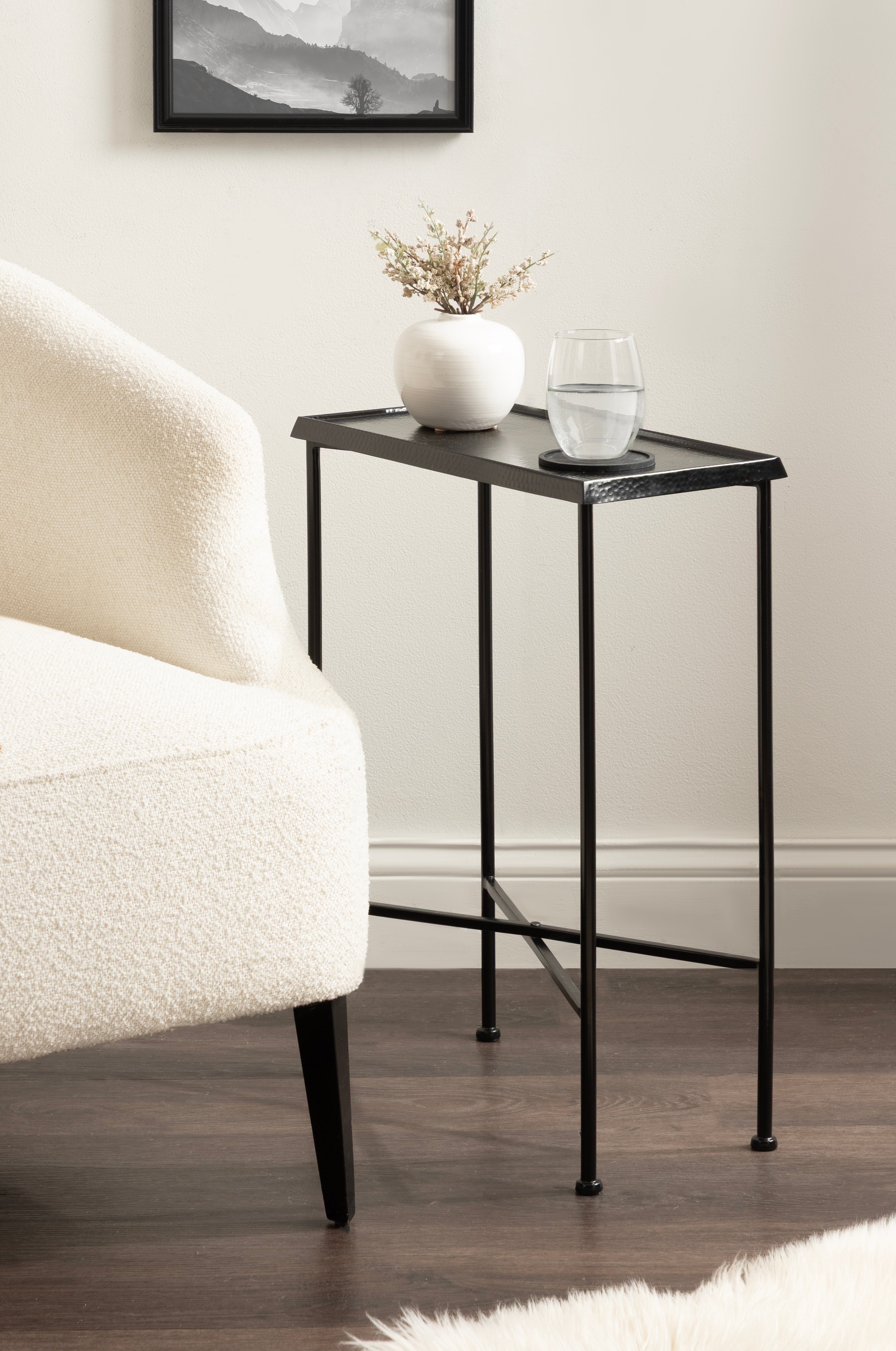 For the interior decorator with a passion for modern design comes our Sanzo narrow side table. The Sanzo collection features a solid iron construction with a hand-applied hammered texture crafted by artisans in India. The tabletop's surface area is a perfect display or storage area for lamps, morning coffee, plants, alarm clocks, or other small items. Use it as a living room table, a slim nightstand in the bedroom, or an accent table near your bathtub. Regardless of where you put it, the Sanzo end table makes for a unique statement piece in any area of your modern home. Everything down to the beautiful finish echoes glamorous, timeless design and style. You won't have to work hard to set up this charming table, either; the Sanzo side table has a simple, three-step assembly process.
