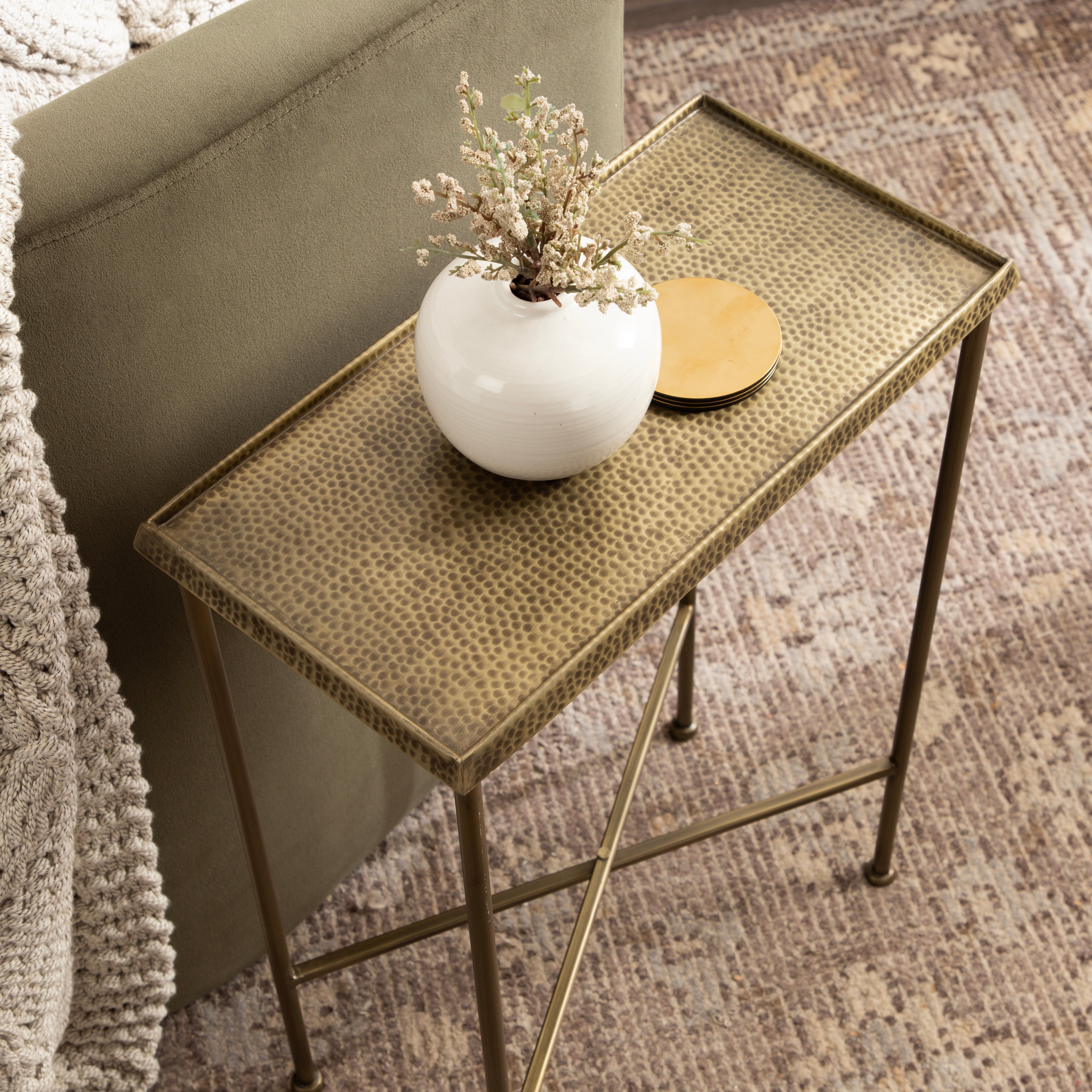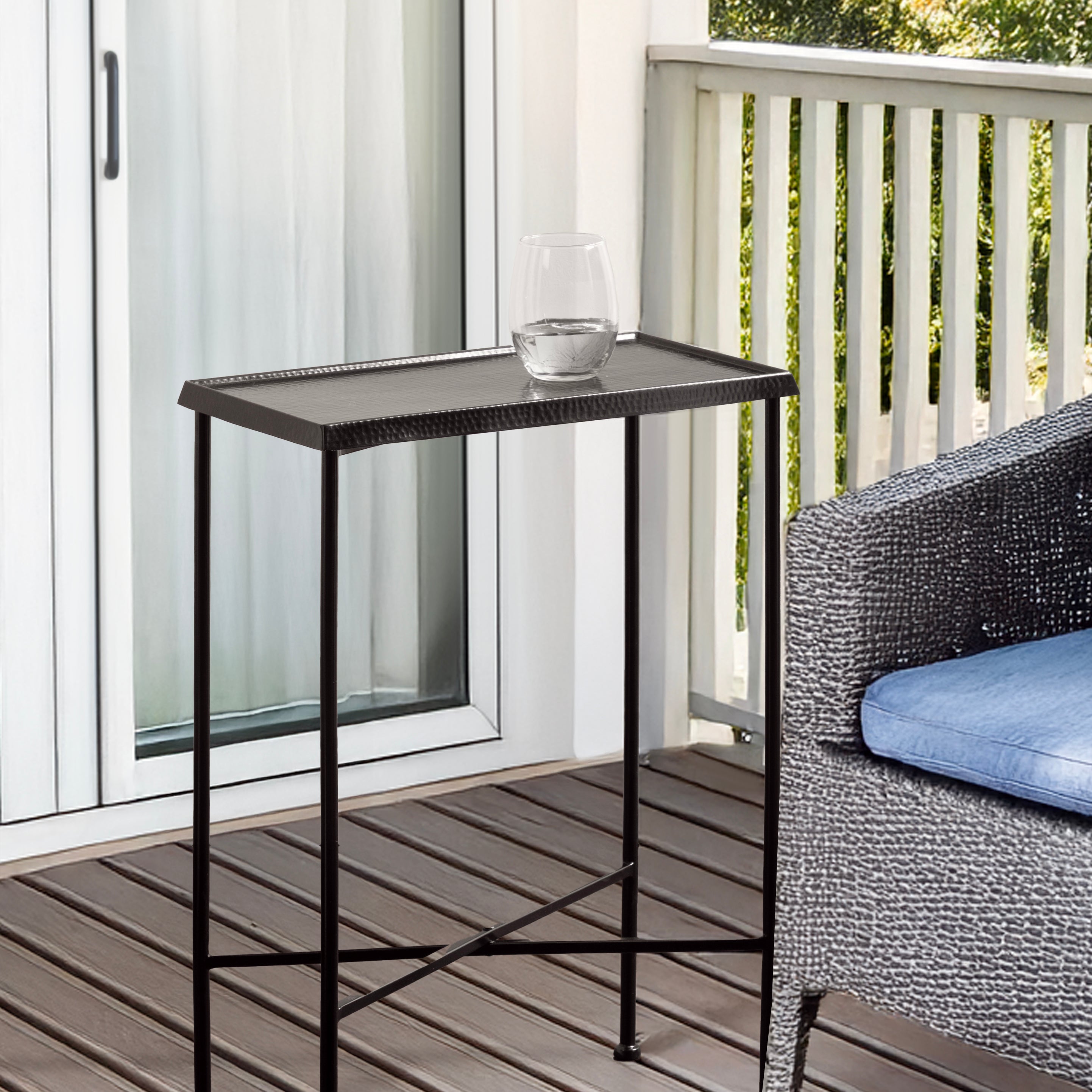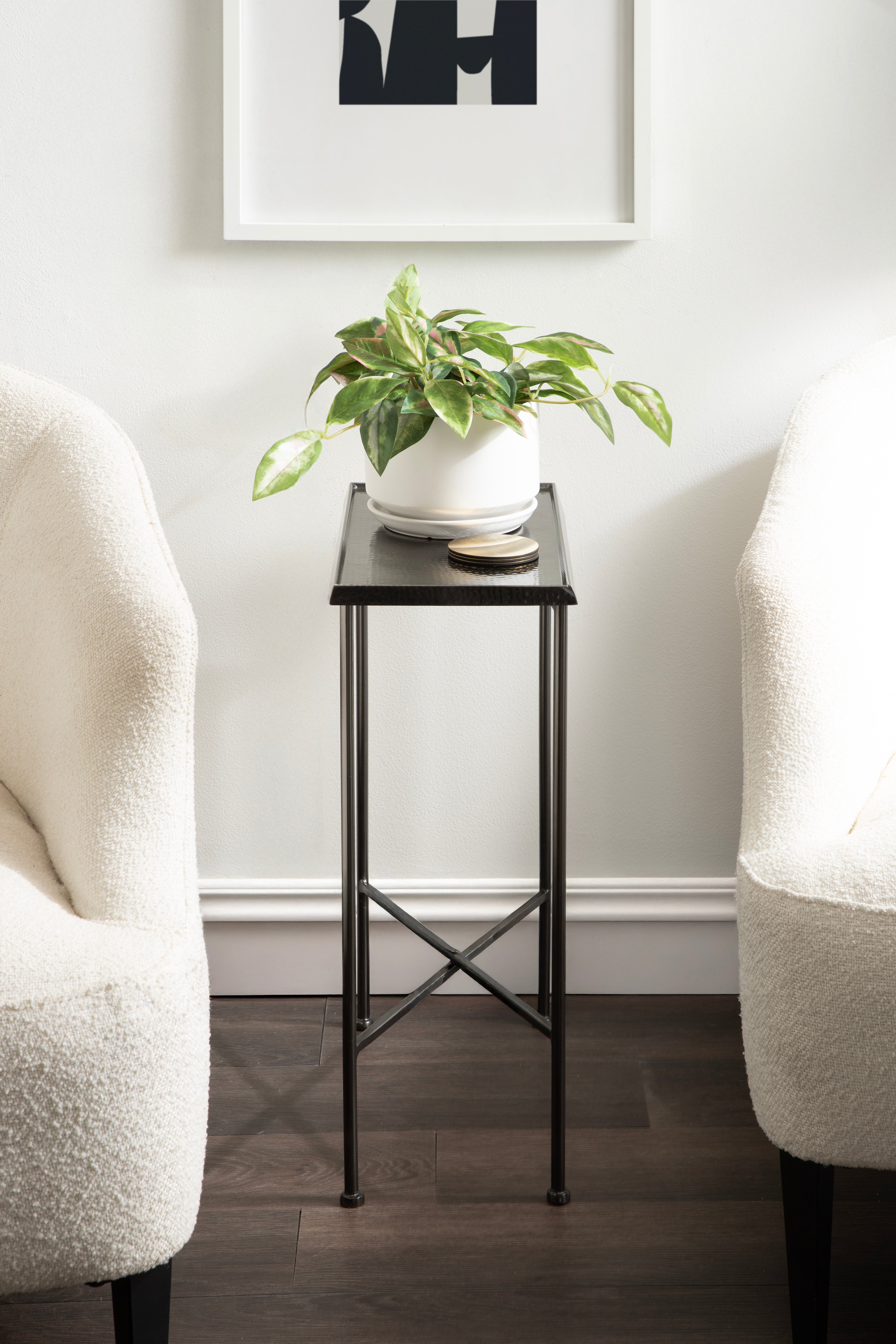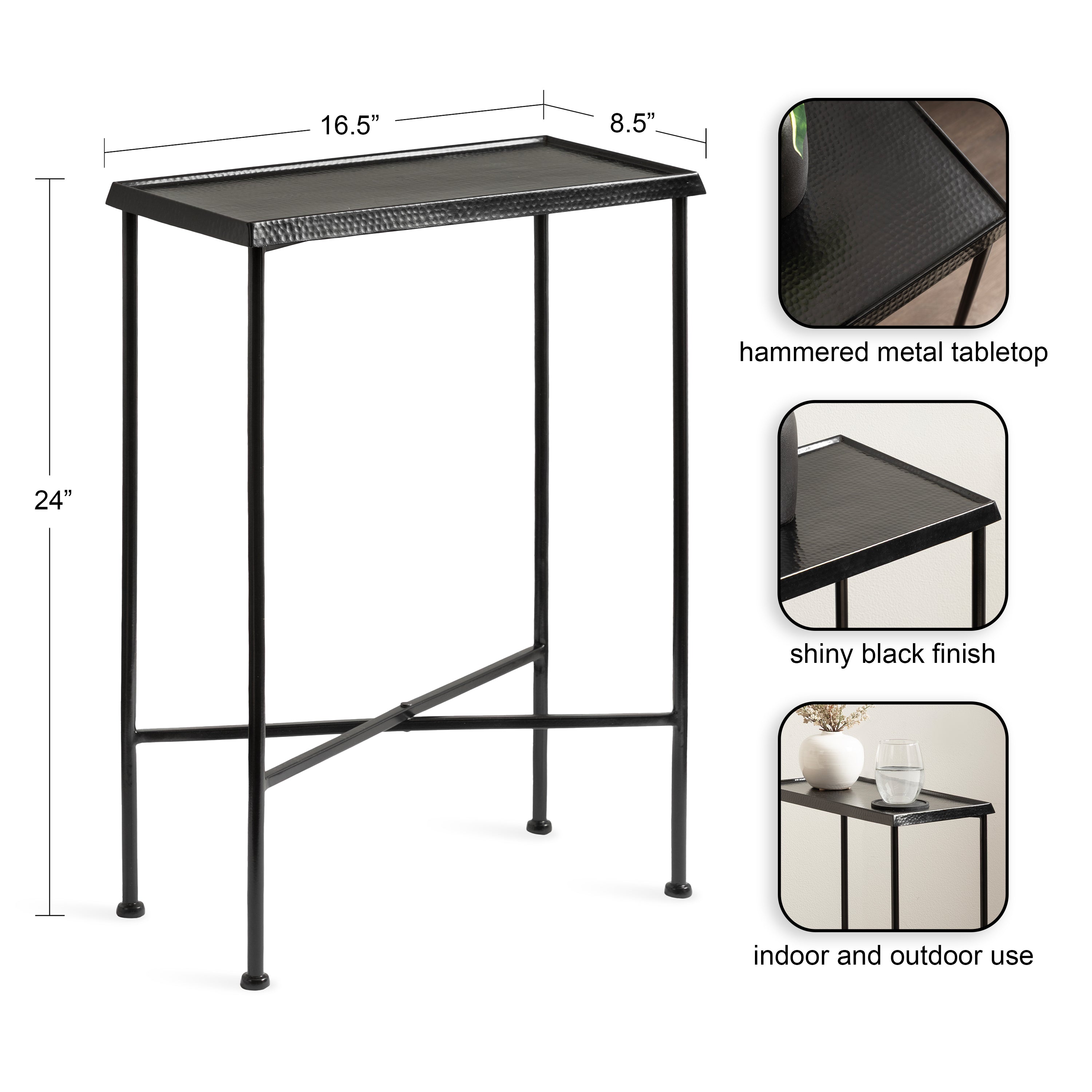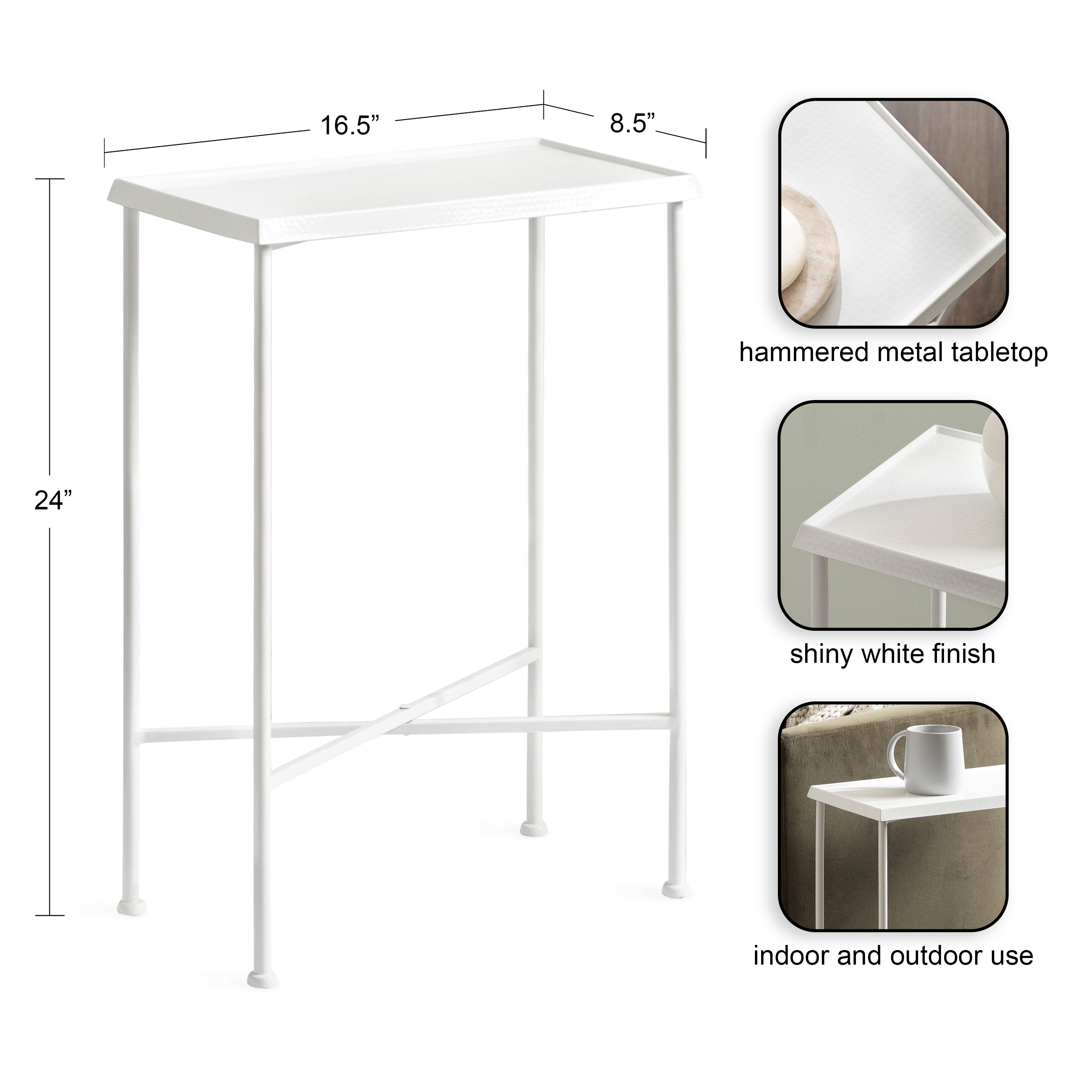 For the interior decorator with a passion for modern design comes our Sanzo narrow side table. The Sanzo collection features a solid iron construction with a hand-applied hammered texture crafted by artisans in India. The tabletop's surface area is a perfect display or storage area for lamps, morning coffee, plants, alarm clocks, or other small items. Use it as a living room table, a slim nightstand in the bedroom, or an accent table near your bathtub. Regardless of where you put it, the Sanzo end table makes for a unique statement piece in any area of your modern home. Everything down to the beautiful finish echoes glamorous, timeless design and style. You won't have to work hard to set up this charming table, either; the Sanzo side table has a simple, three-step assembly process.