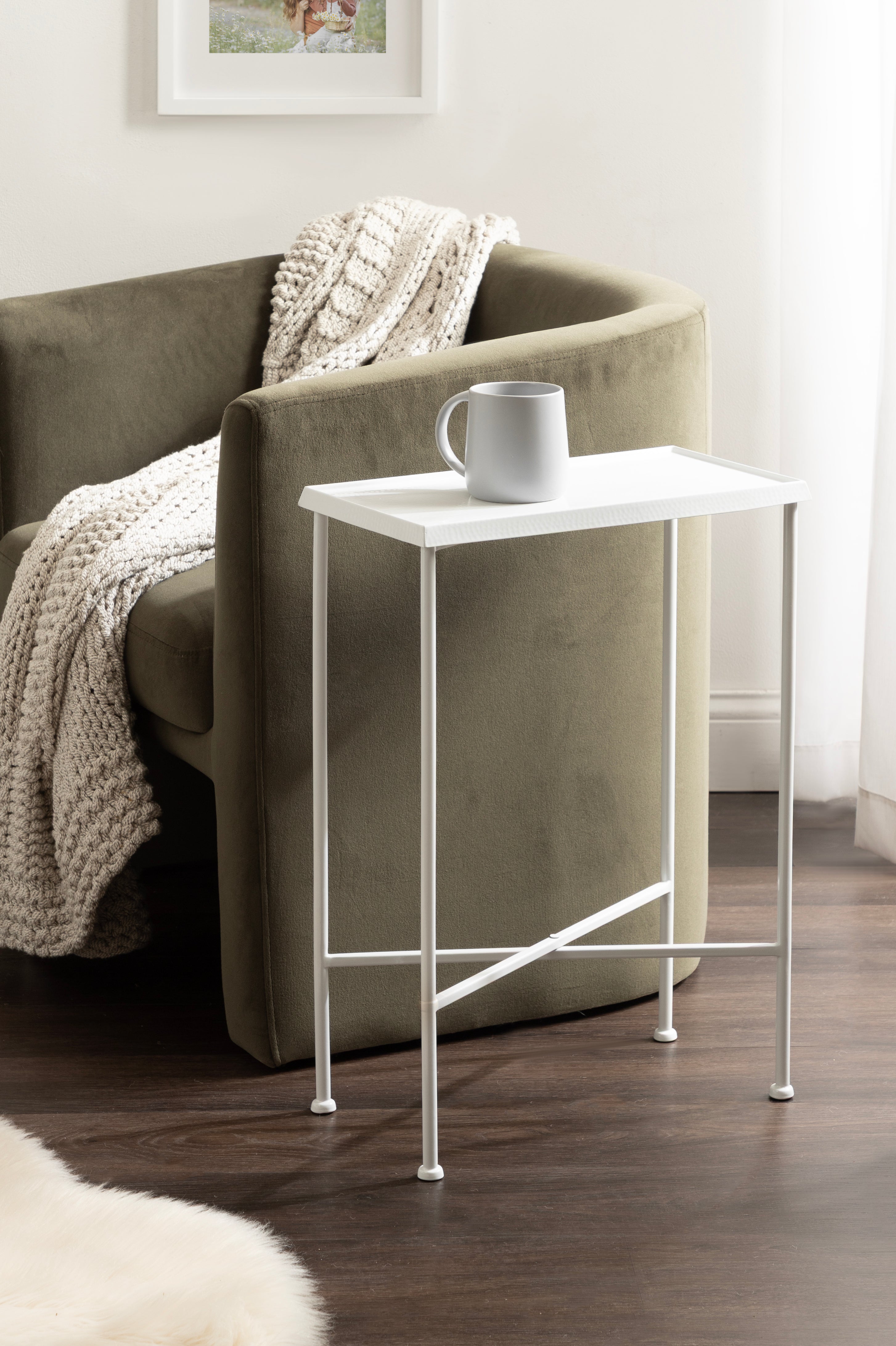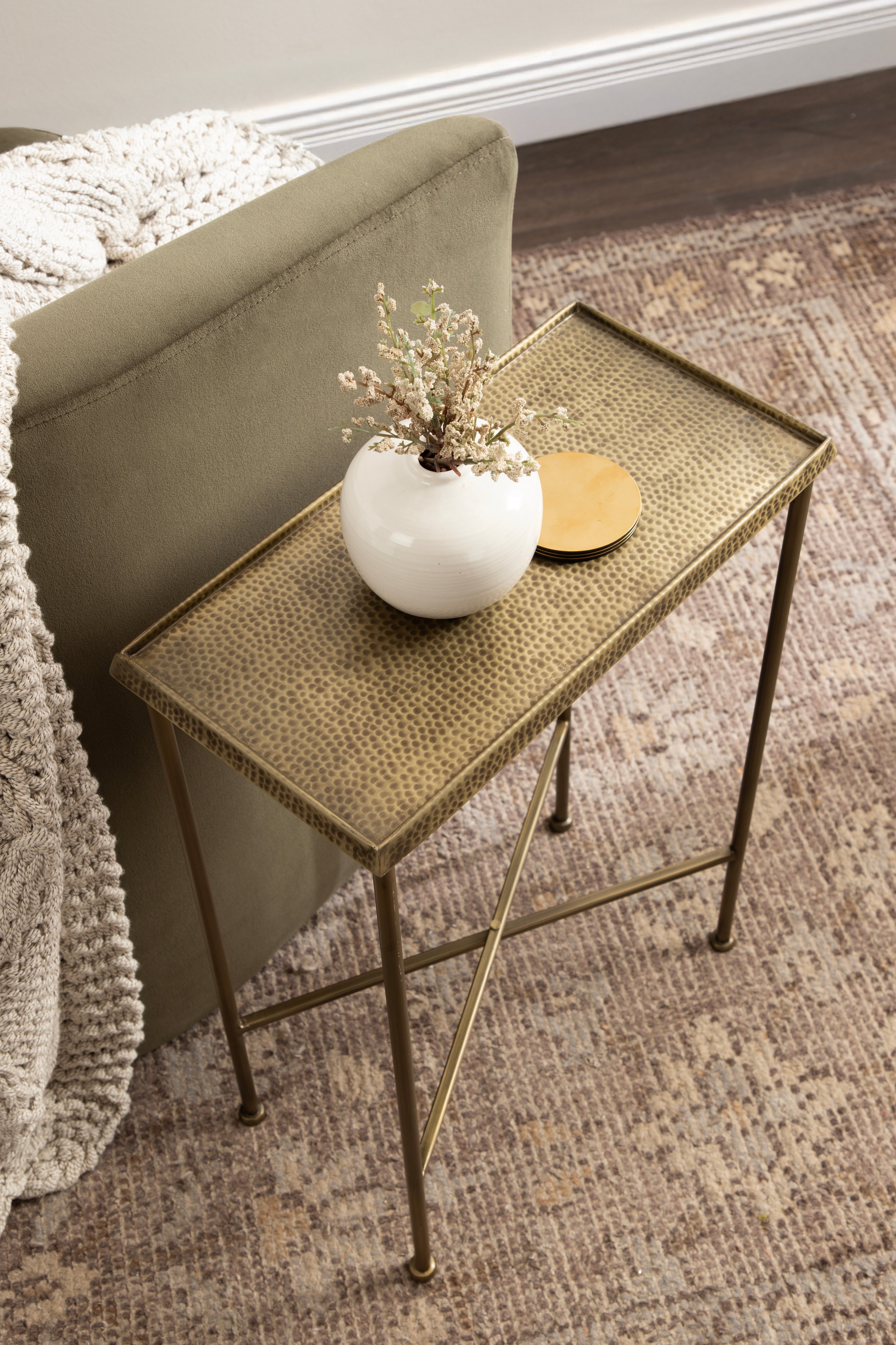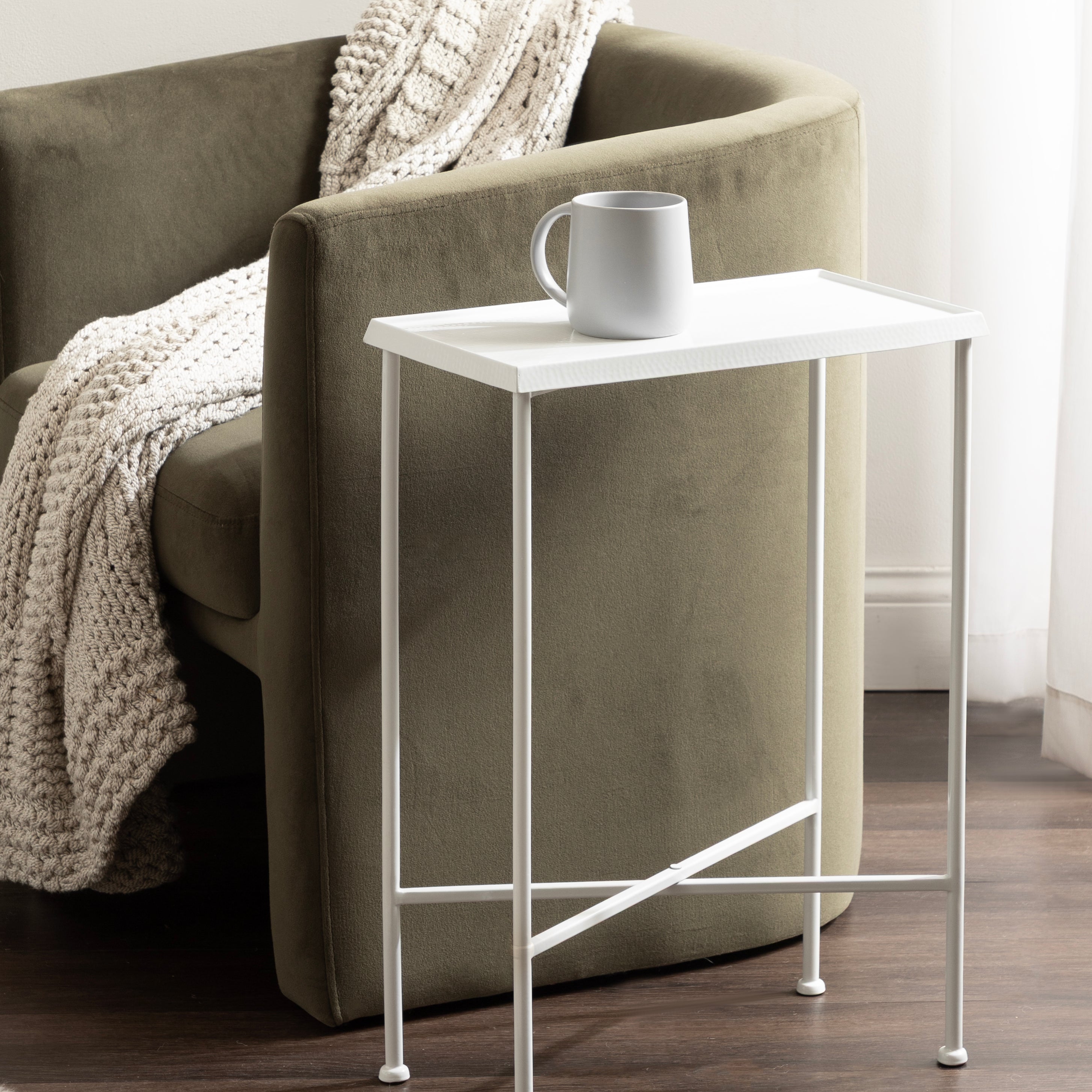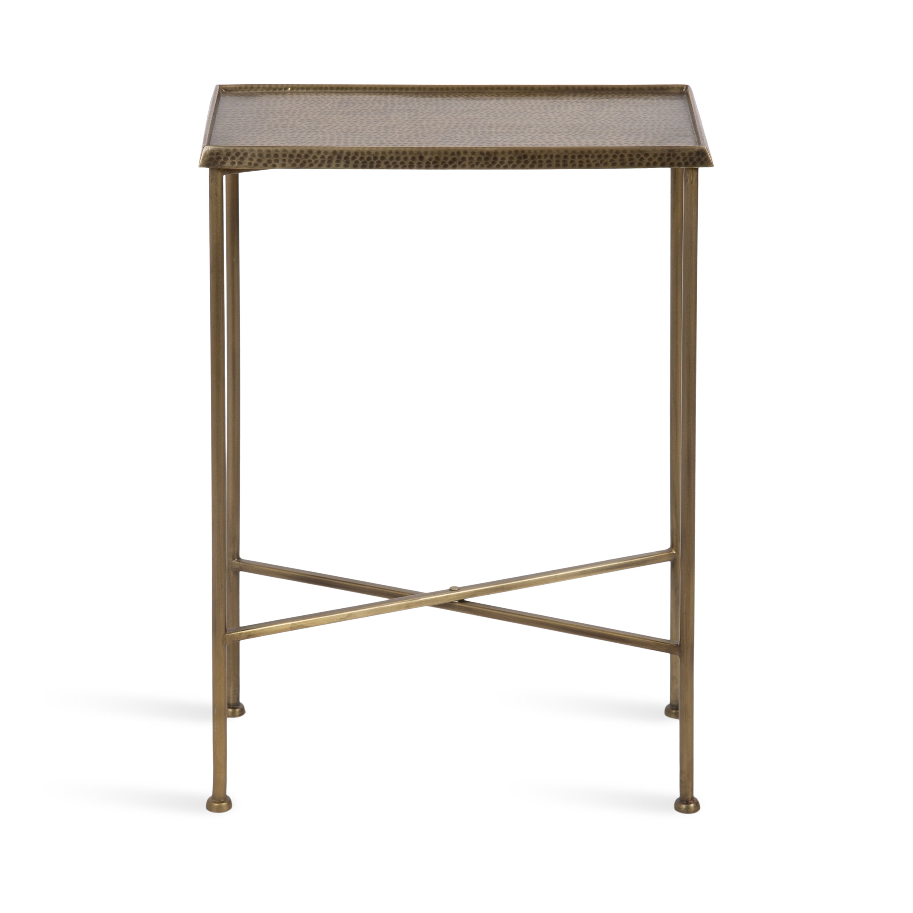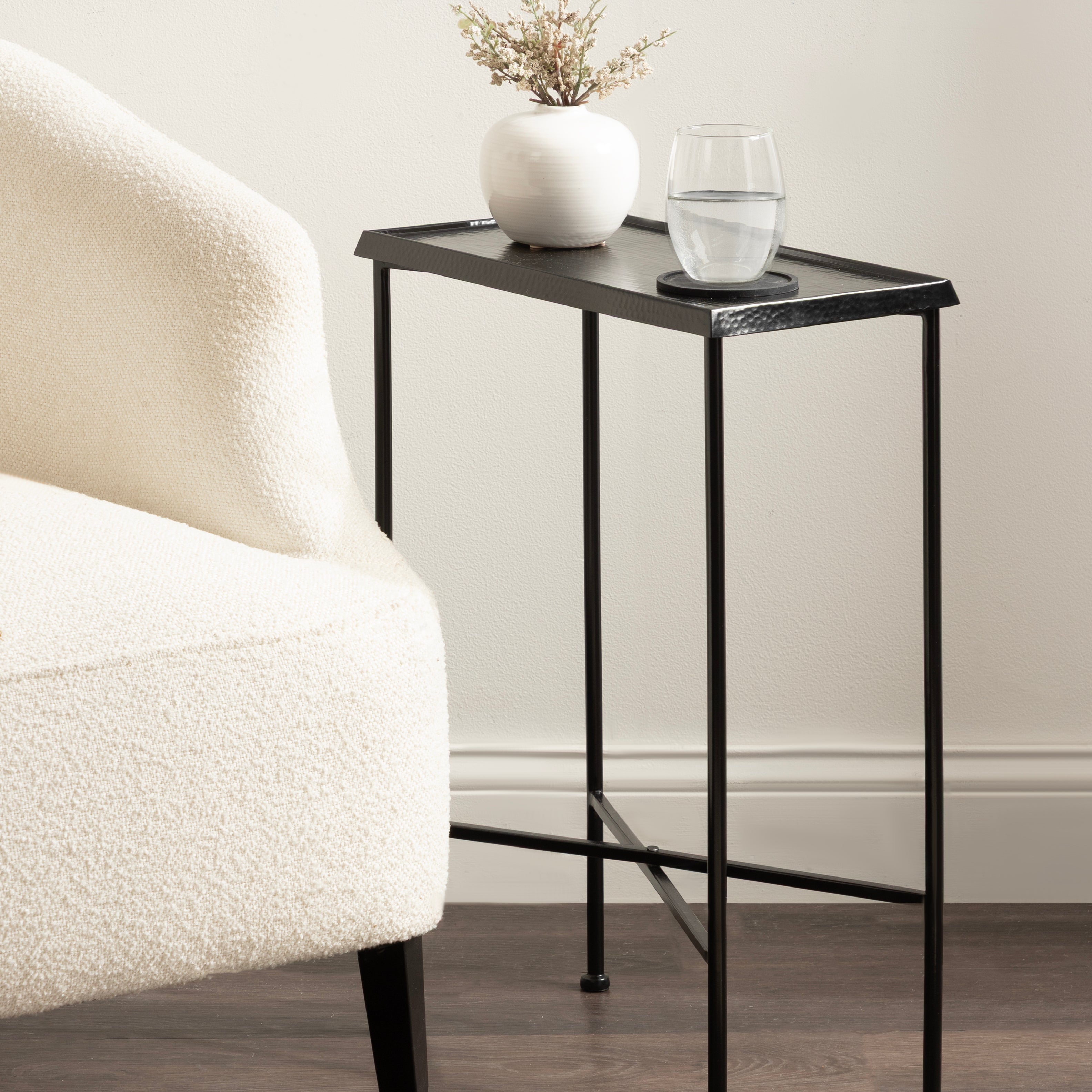 For the interior decorator with a passion for modern design comes our Sanzo narrow side table. The Sanzo collection features a solid iron construction with a hand-applied hammered texture crafted by artisans in India. The tabletop's surface area is a perfect display or storage area for lamps, morning coffee, plants, alarm clocks, or other small items. Use it as a living room table, a slim nightstand in the bedroom, or an accent table near your bathtub. Regardless of where you put it, the Sanzo end table makes for a unique statement piece in any area of your modern home. Everything down to the beautiful finish echoes glamorous, timeless design and style. You won't have to work hard to set up this charming table, either; the Sanzo side table has a simple, three-step assembly process.