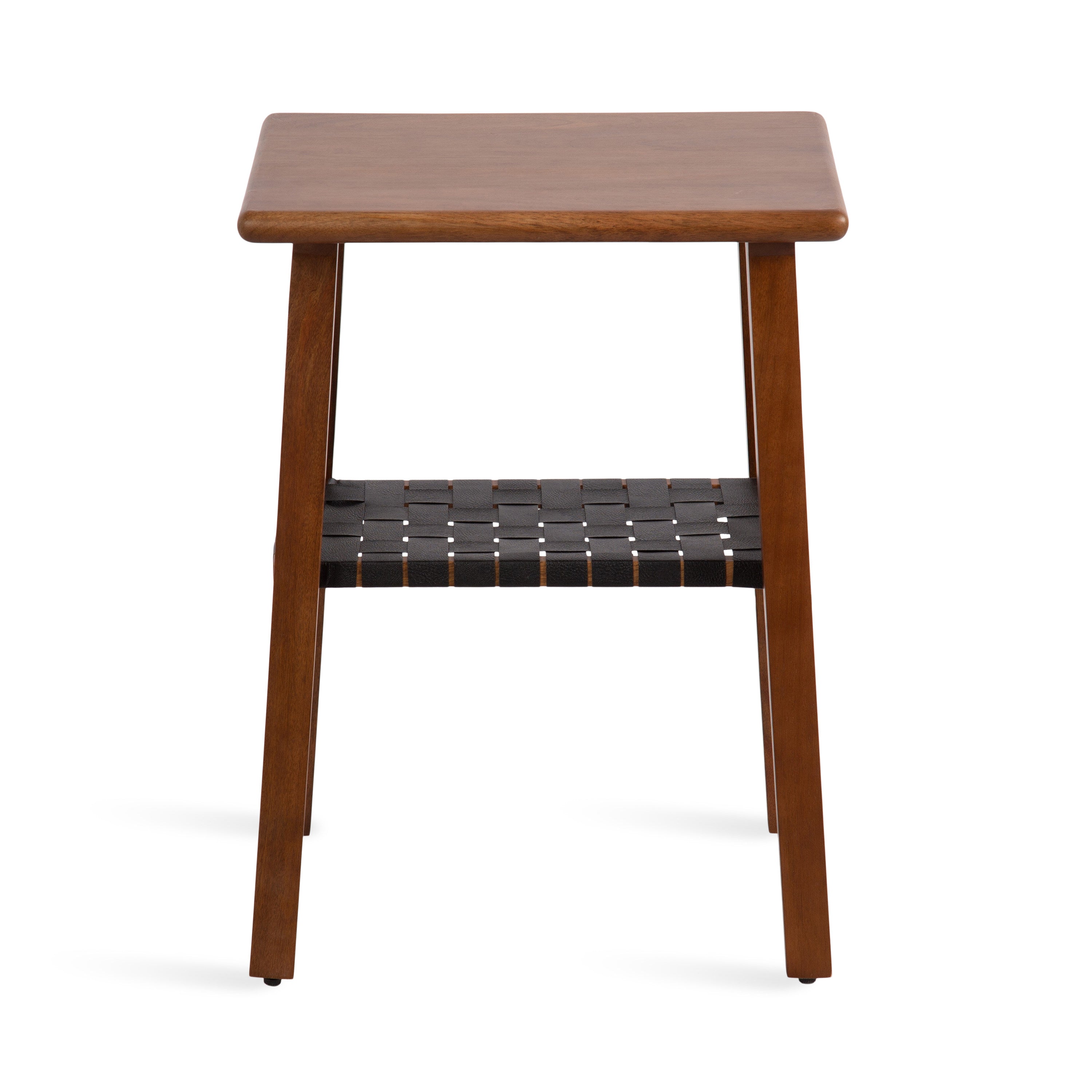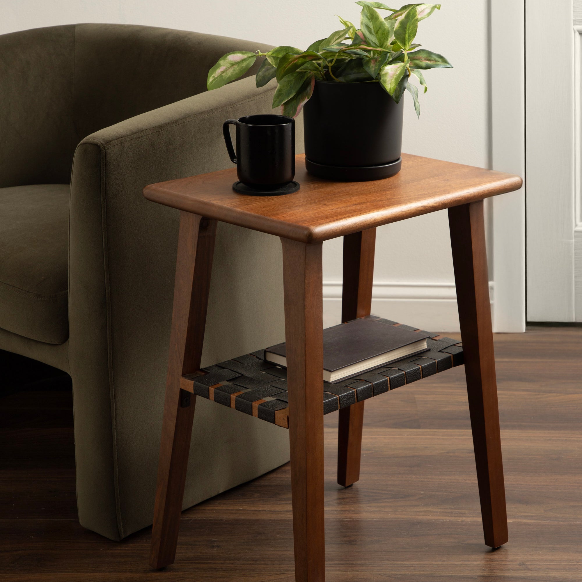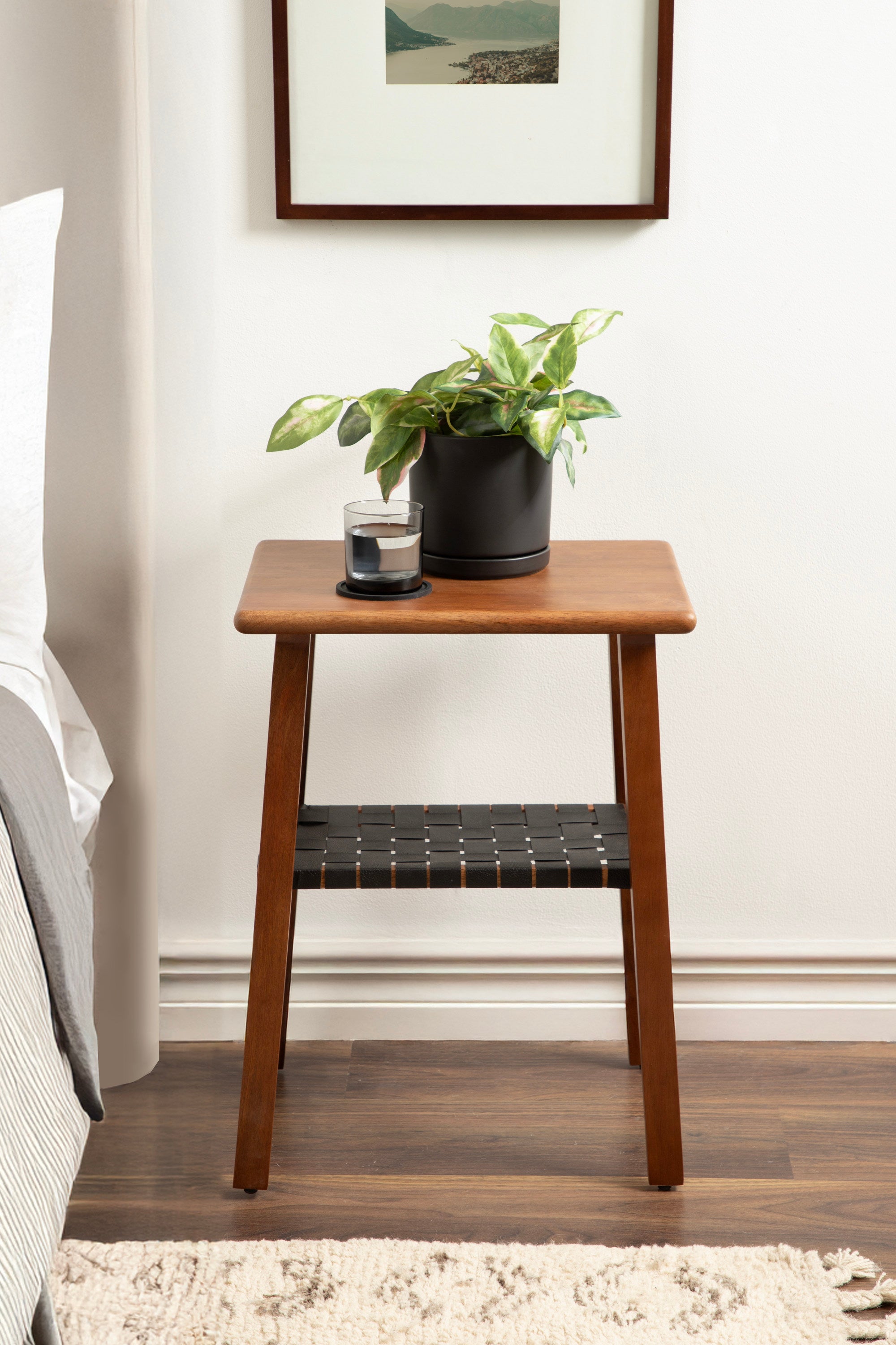 Blend your love of modern style with a dash of transitional functionality with the Woebeck side table. This table embraces a simplistic, uncomplicated design in its rectangular shape. Skilled artisans craft the Woebeck by hand, and due to this careful, delicate crafting, each piece is one-of-a-kind in finish and woodgrain. It is made of solid mango wood and resilient vegan leather for a table that looks and feels rich and high-quality. It is a perfect pairing next to a sofa, by your bed, or flanking your entryway. In addition, the two tiers are ideal for storing and displaying household necessities and your most cherished decorative accent pieces. Assembly for this minimal table takes a matter of minutes with a simple 2-step process will have your new end table ready in no time.