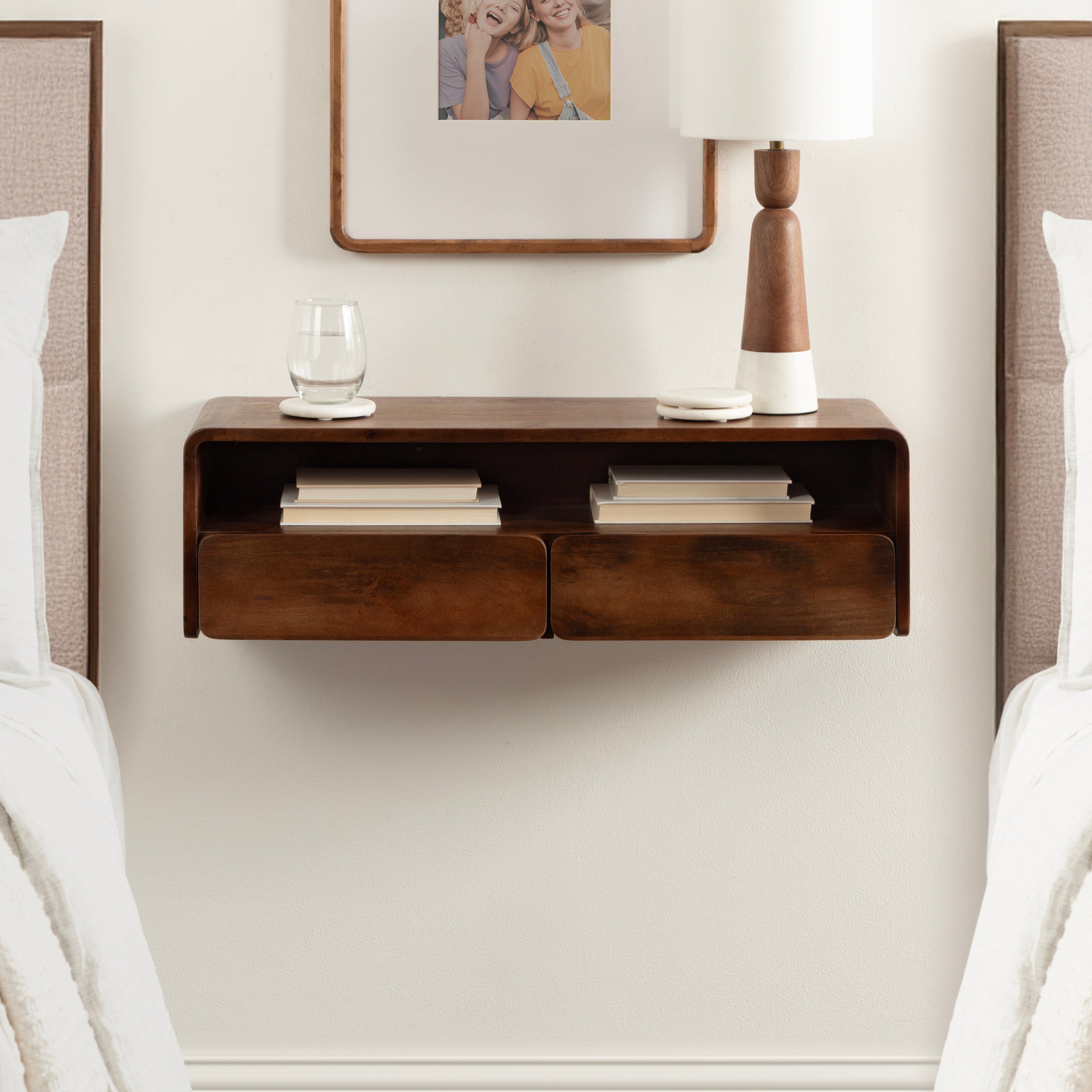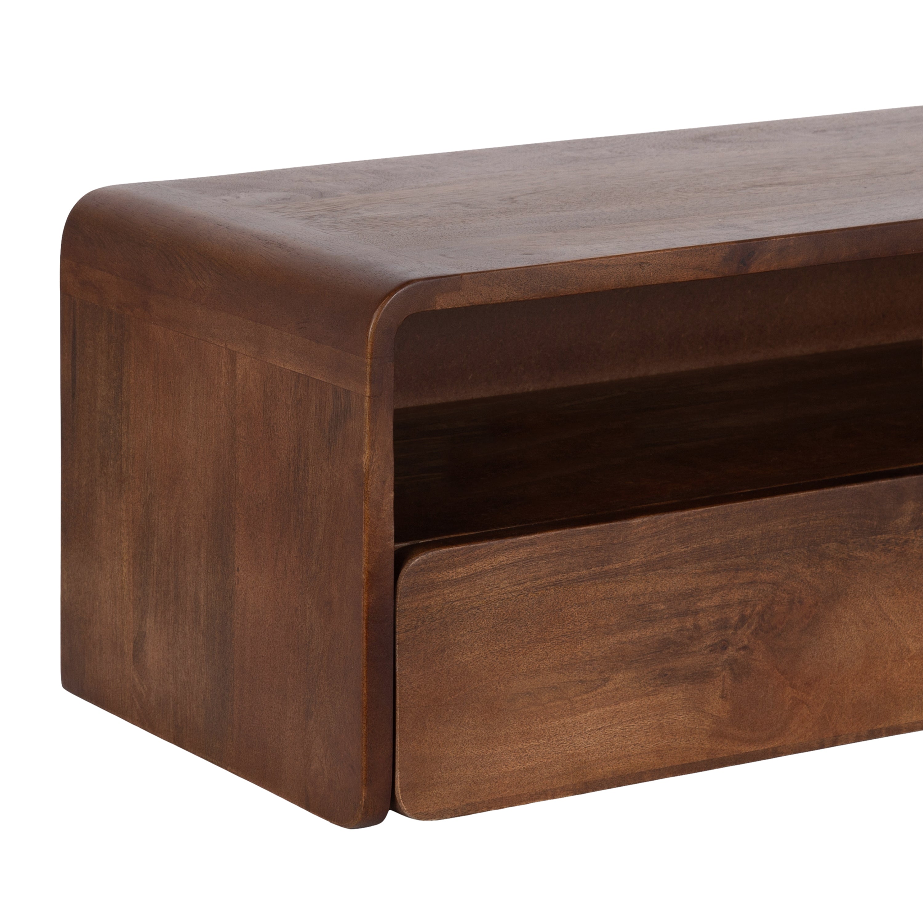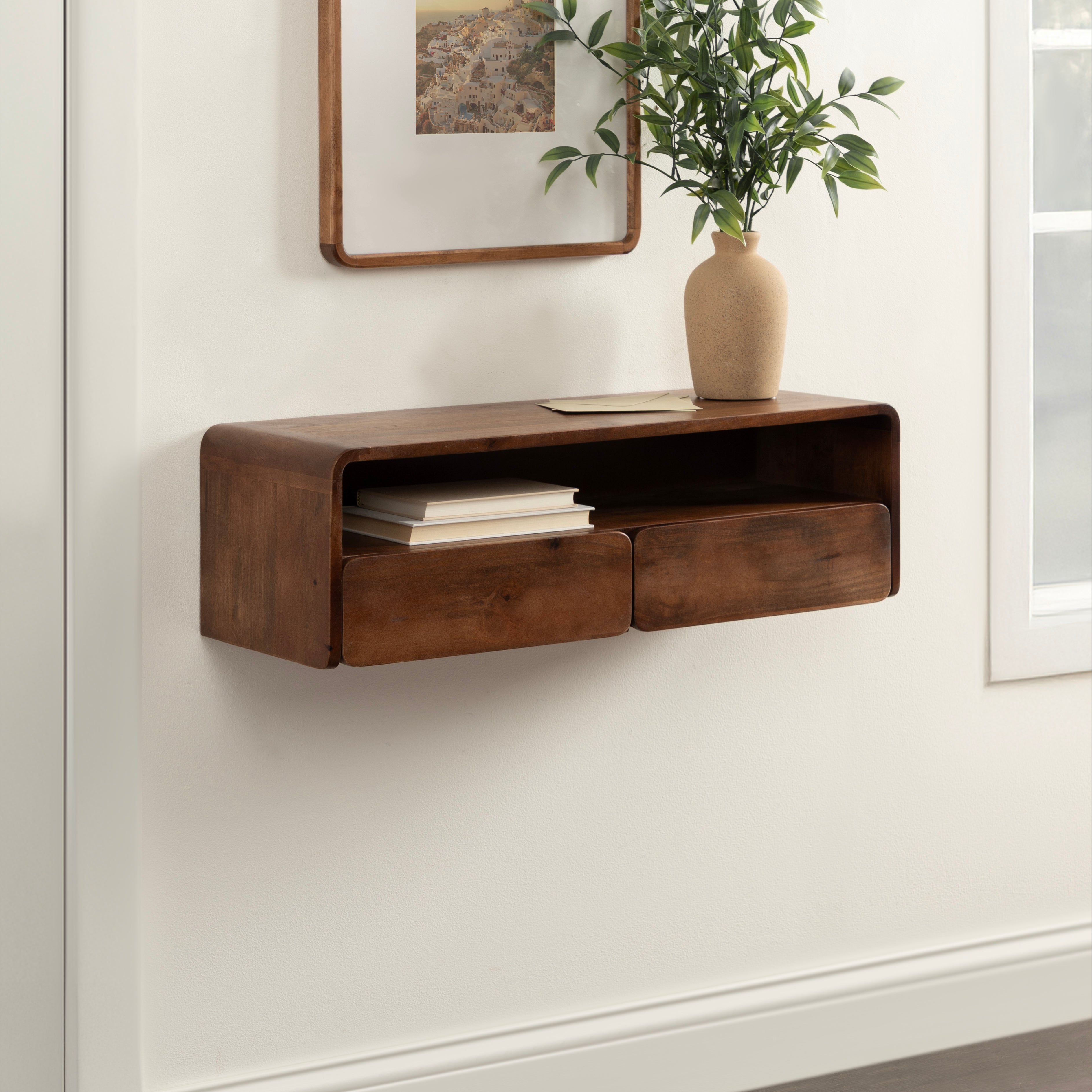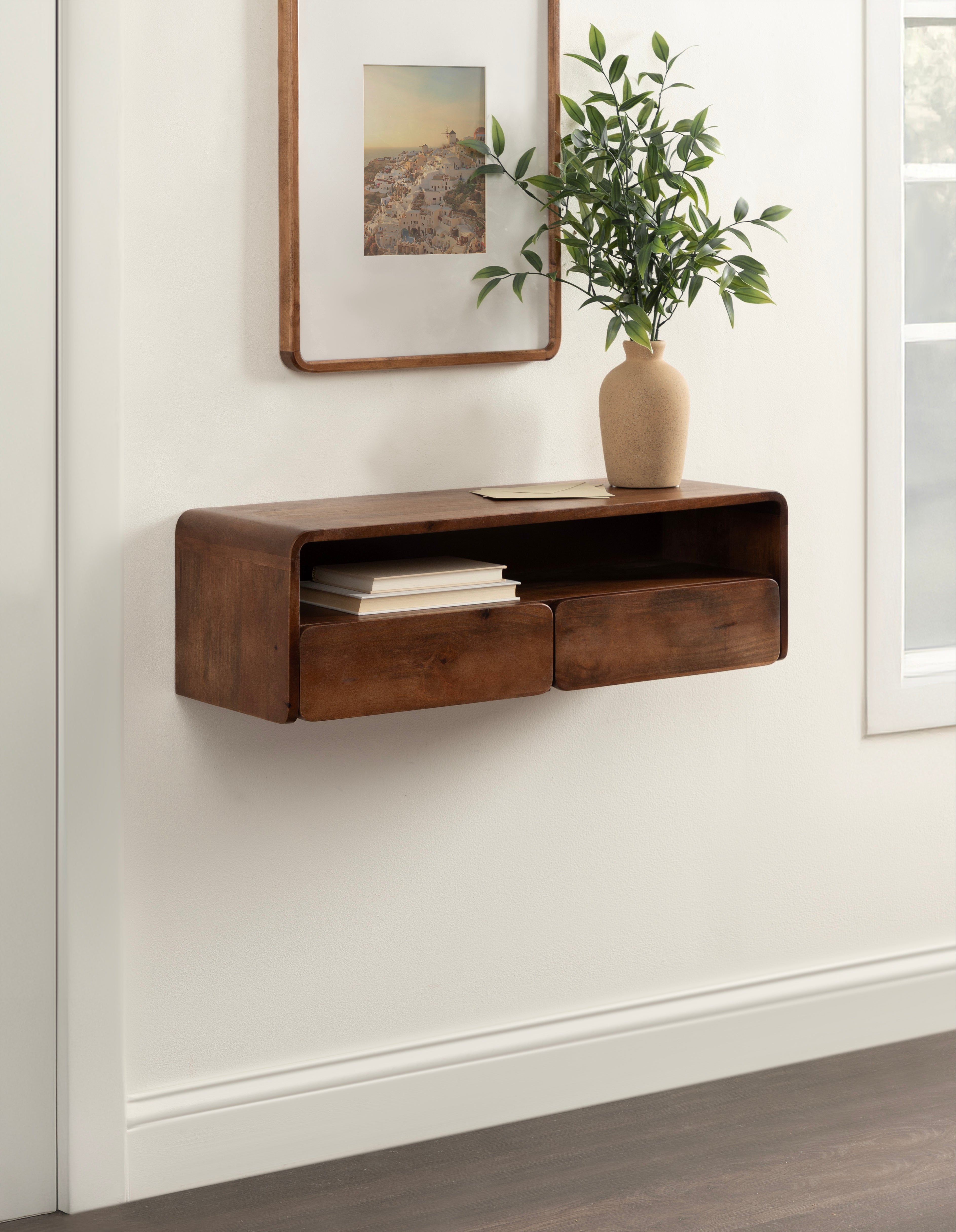 The Kato floating wood console table brings a modern design with a functional twist to any room. This space-saving wall-mounted entryway table is handcrafted from rich mango wood in India, giving each piece a distinct finish and woodgrain. The floating design is perfect for saving floor space, while the size makes it fit perfectly as an entryway console or media storage, or even as a large bedroom nightstand. It's perfect for a small lamp, some books, a decorative collection of photos, or your favorite houseplants. The Kato also features convenient storage drawers, allowing you to stow away seasonal decor and household necessities while keeping them within arm's reach. Use the sturdy wood cleat hanger to hang this entry table easily and securely.