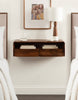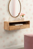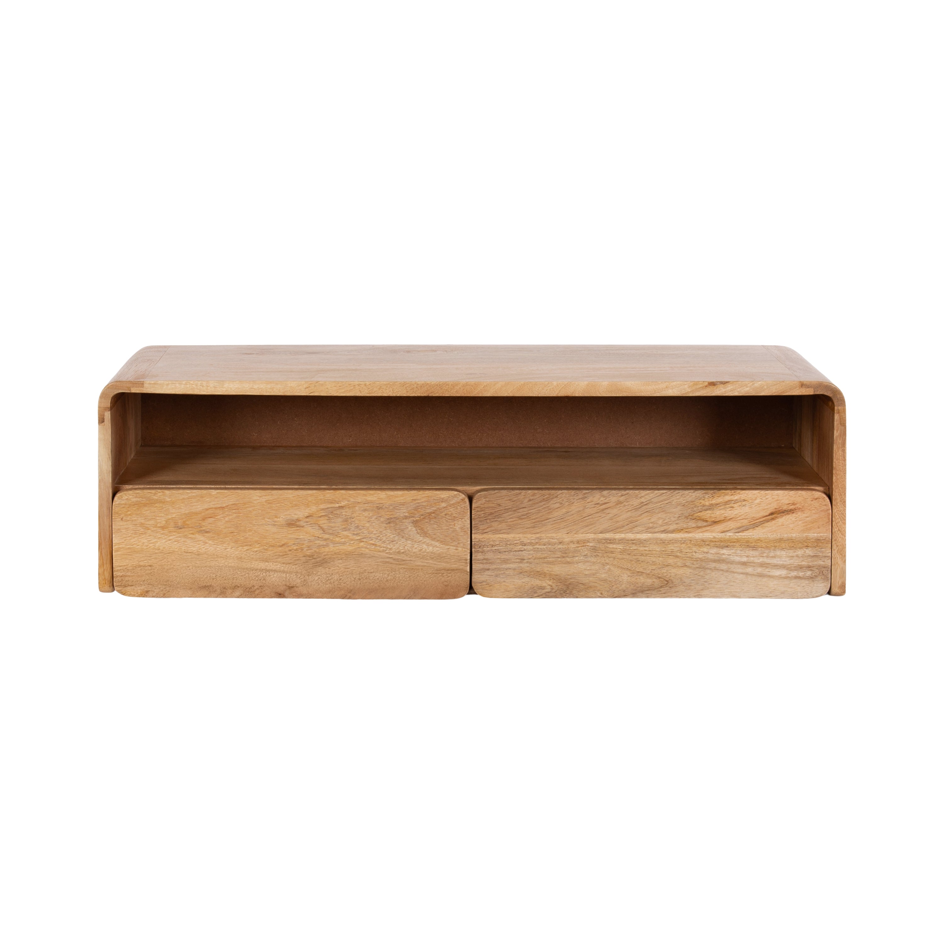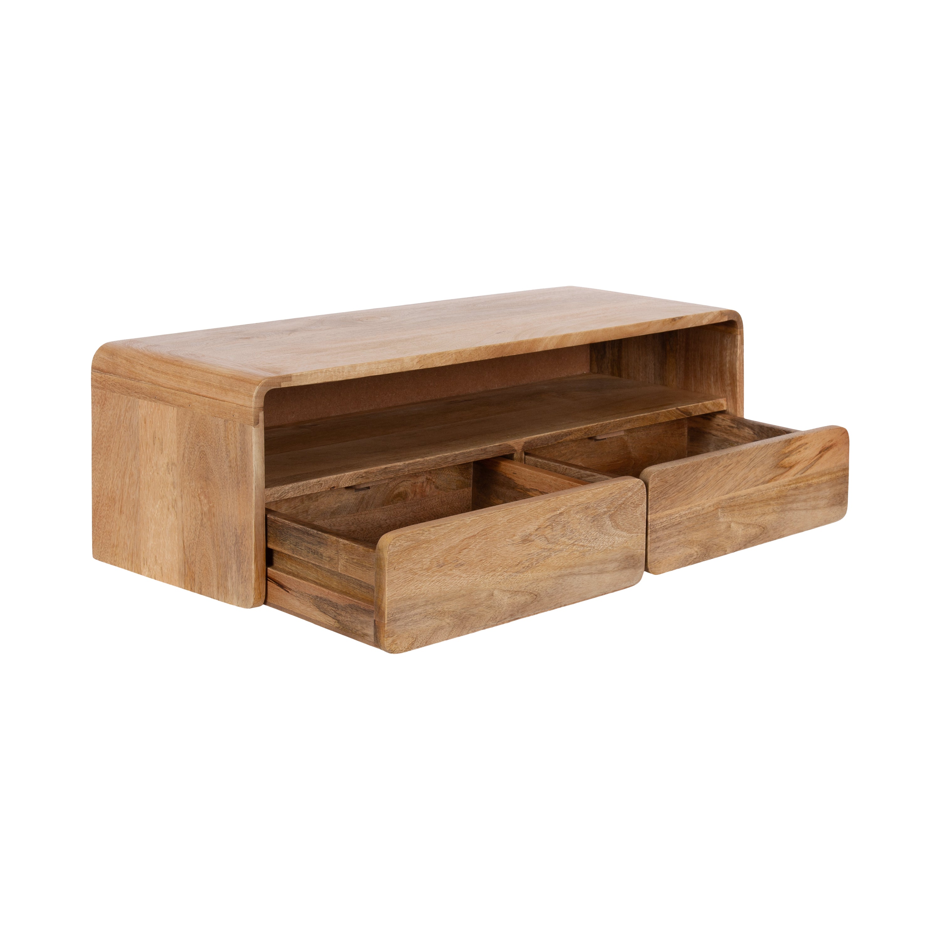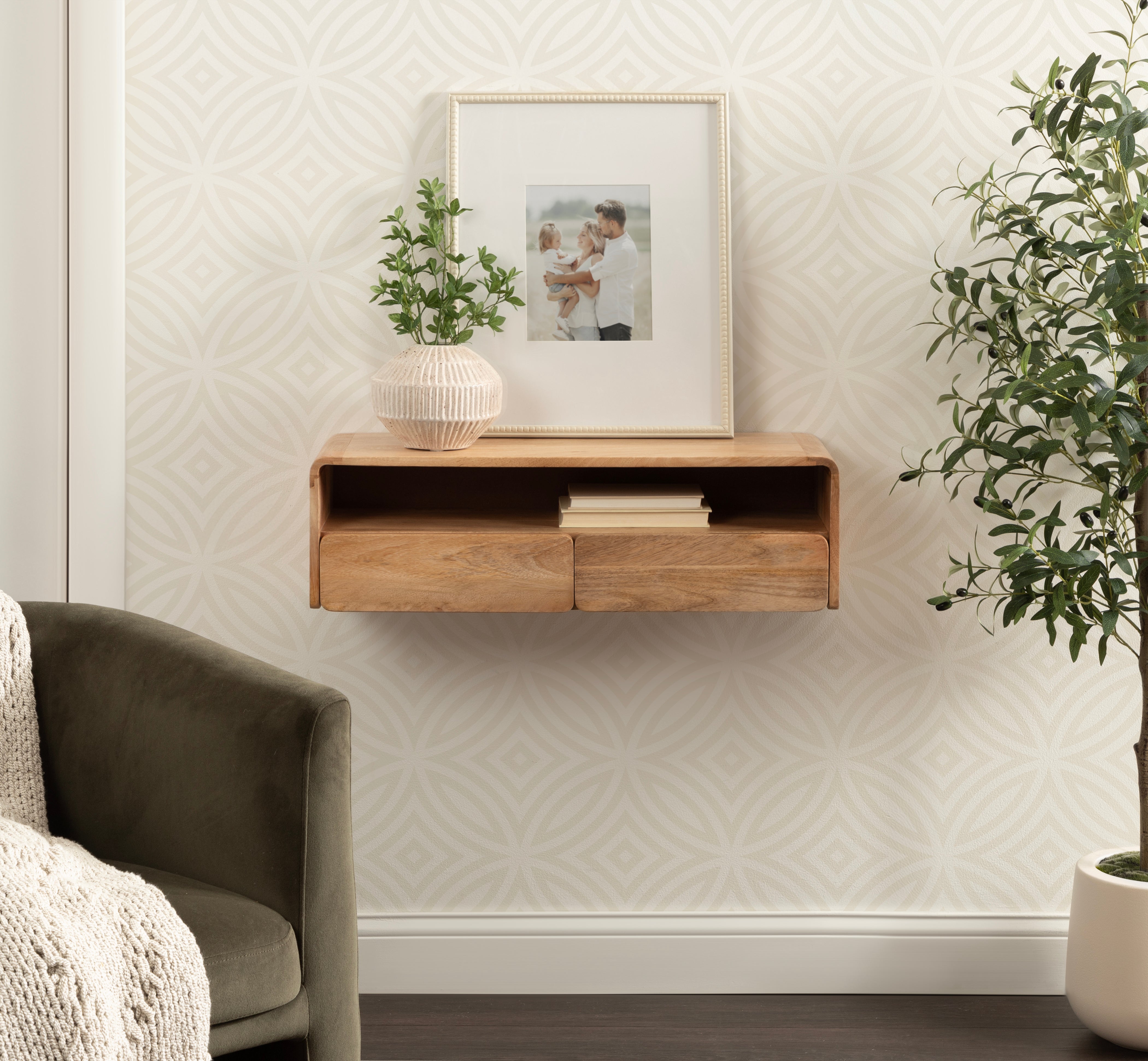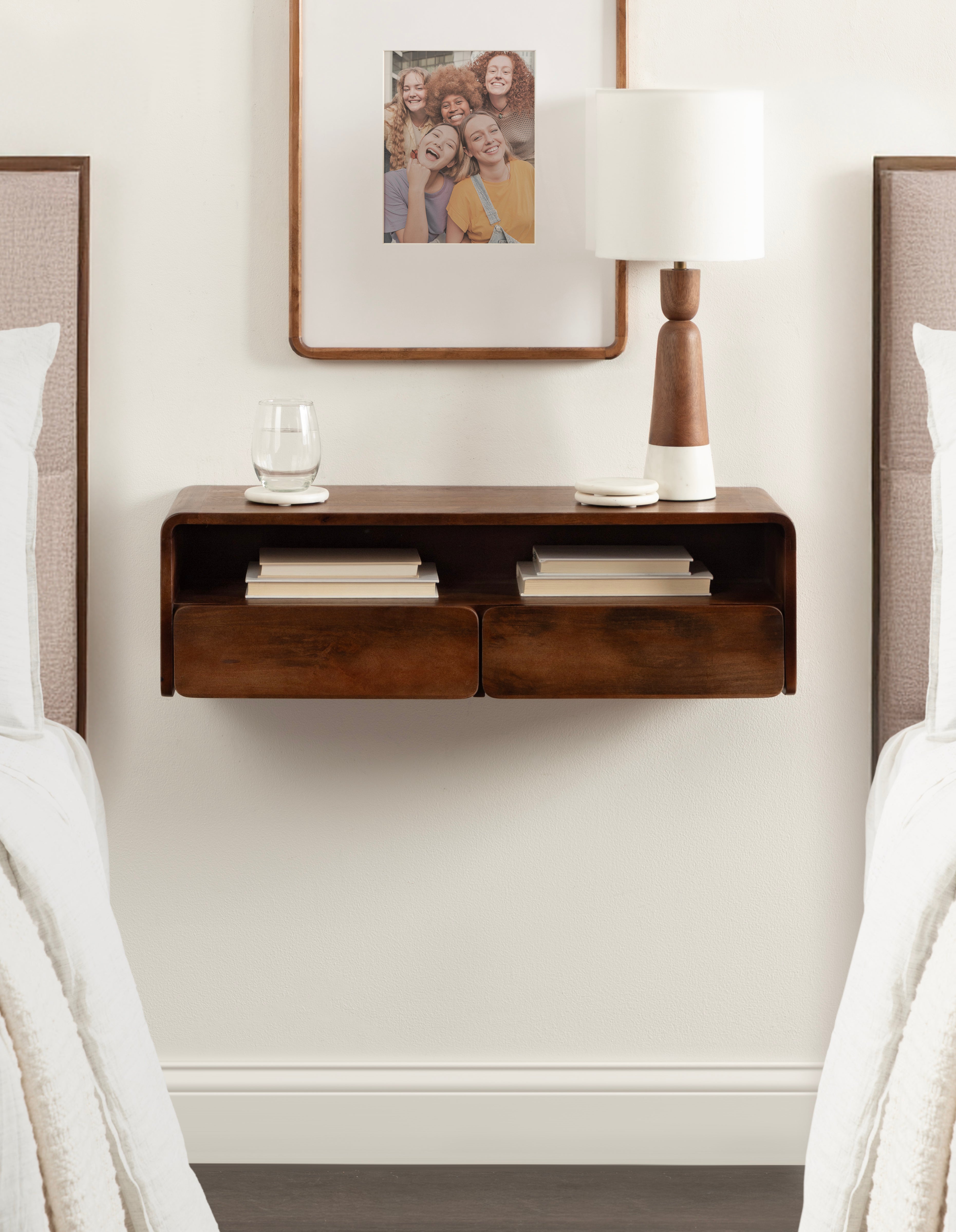 The Kato floating wood console table brings a modern design with a functional twist to any room. This space-saving wall-mounted entryway table is handcrafted from rich mango wood in India, giving each piece a distinct finish and woodgrain. The floating design is perfect for saving floor space, while the size makes it fit perfectly as an entryway console or media storage, or even as a large bedroom nightstand. It's perfect for a small lamp, some books, a decorative collection of photos, or your favorite houseplants. The Kato also features convenient storage drawers, allowing you to stow away seasonal decor and household necessities while keeping them within arm's reach. Use the sturdy wood cleat hanger to hang this entry table easily and securely.