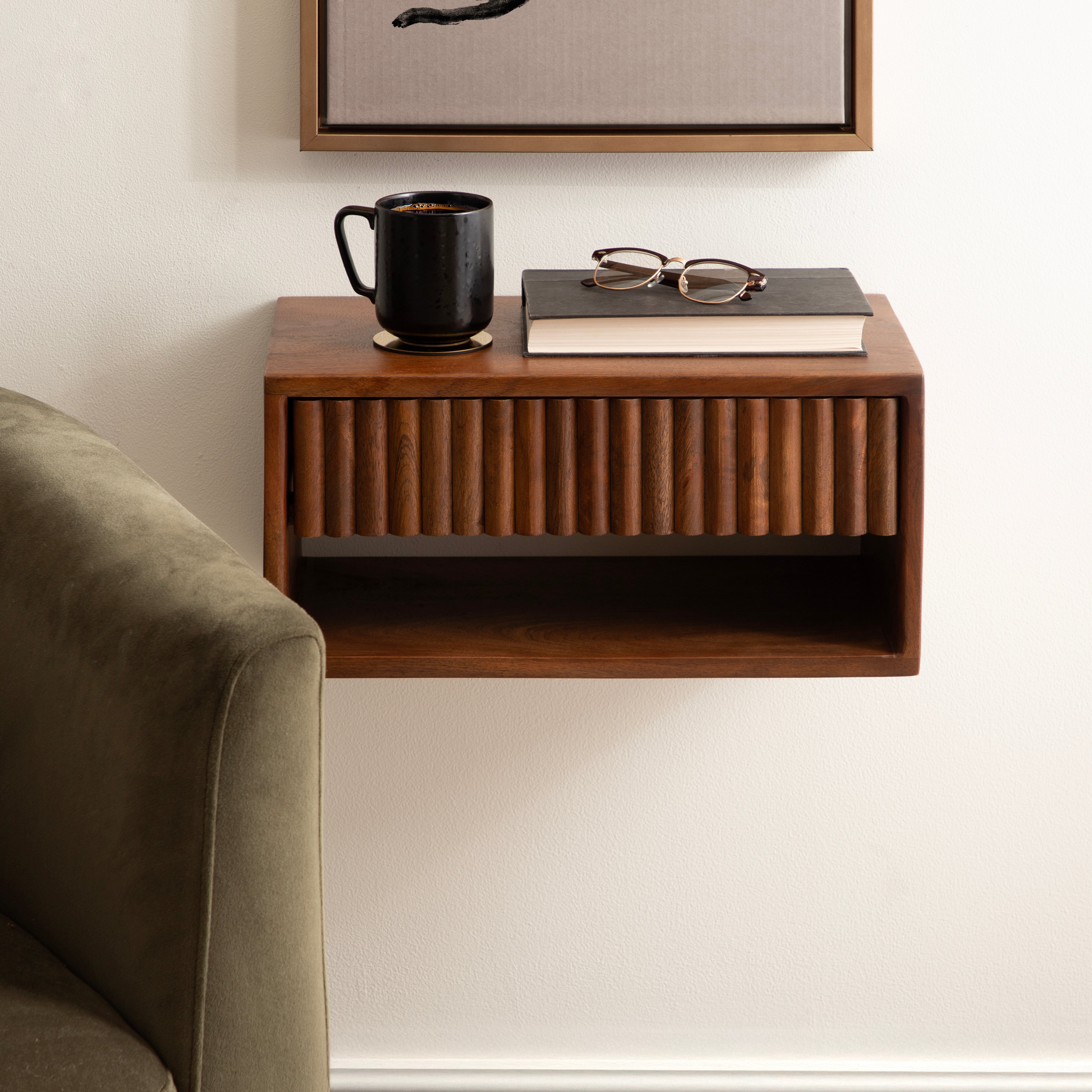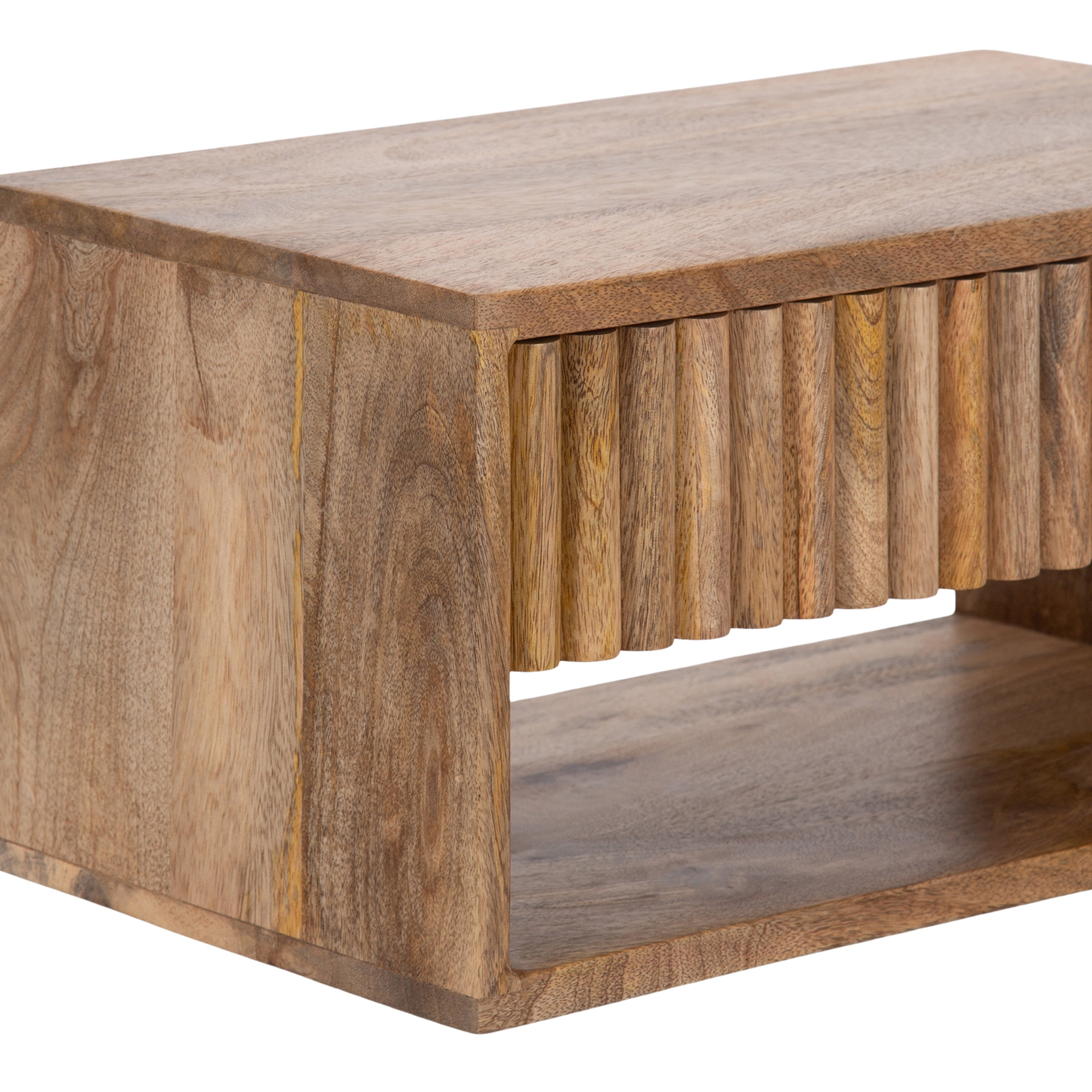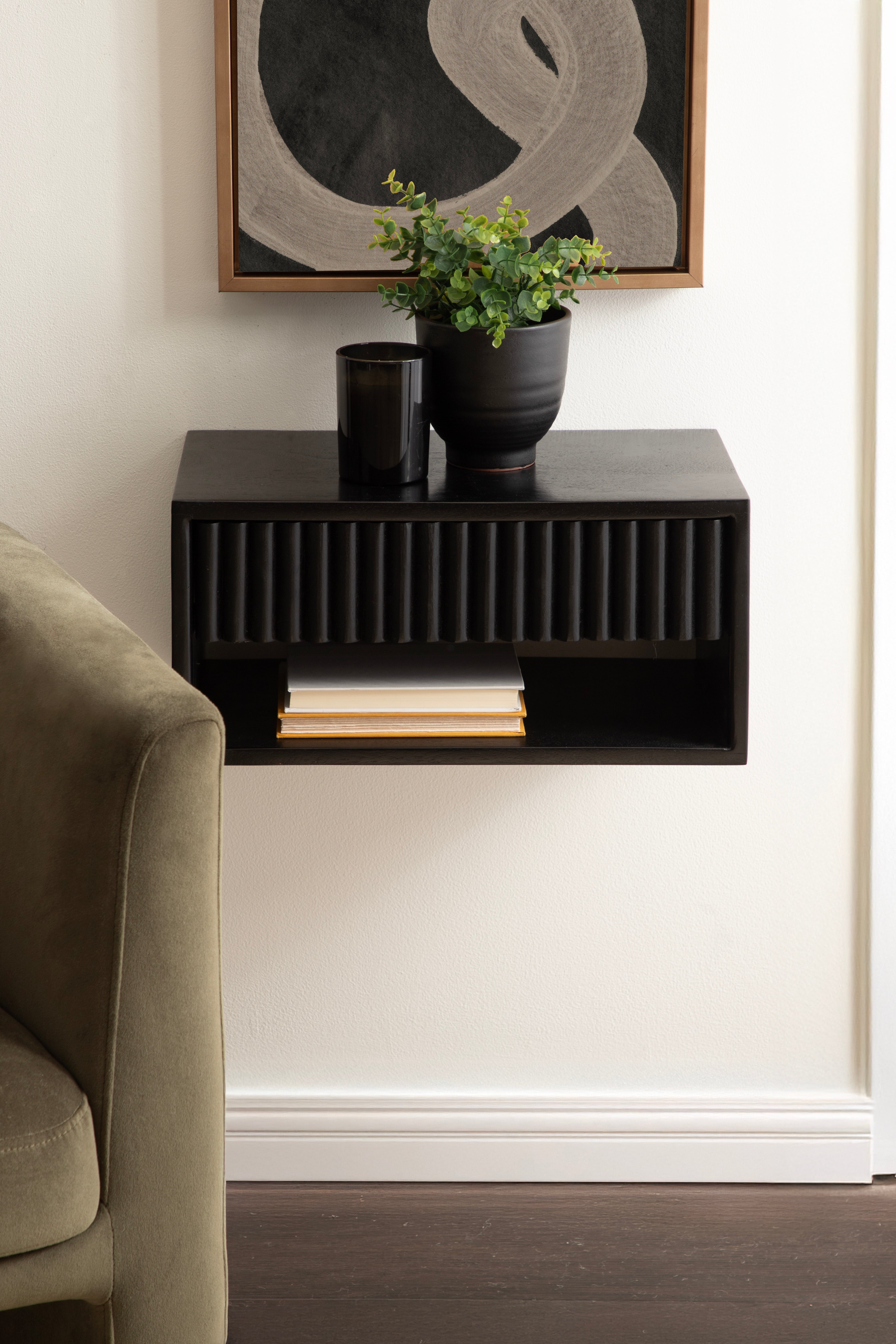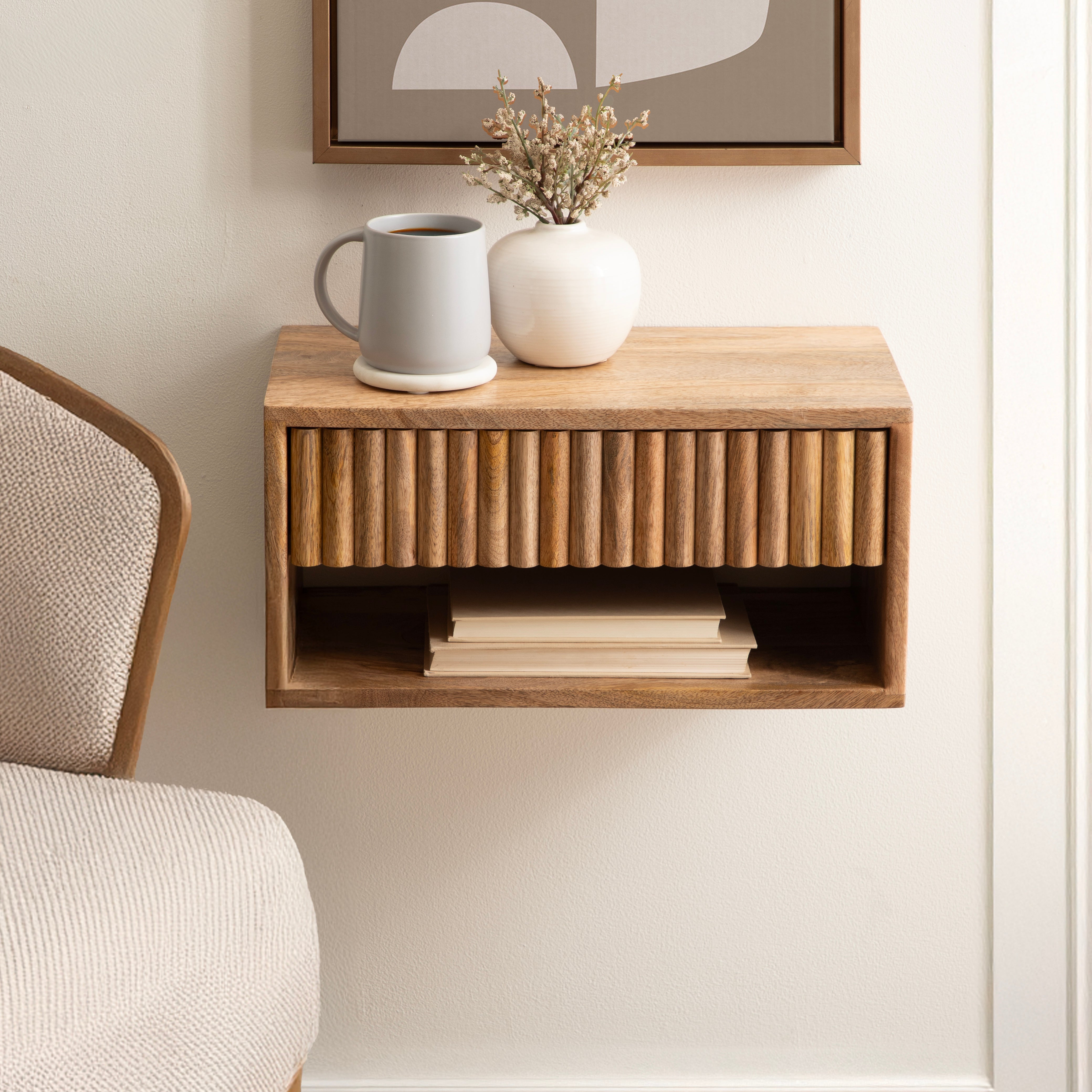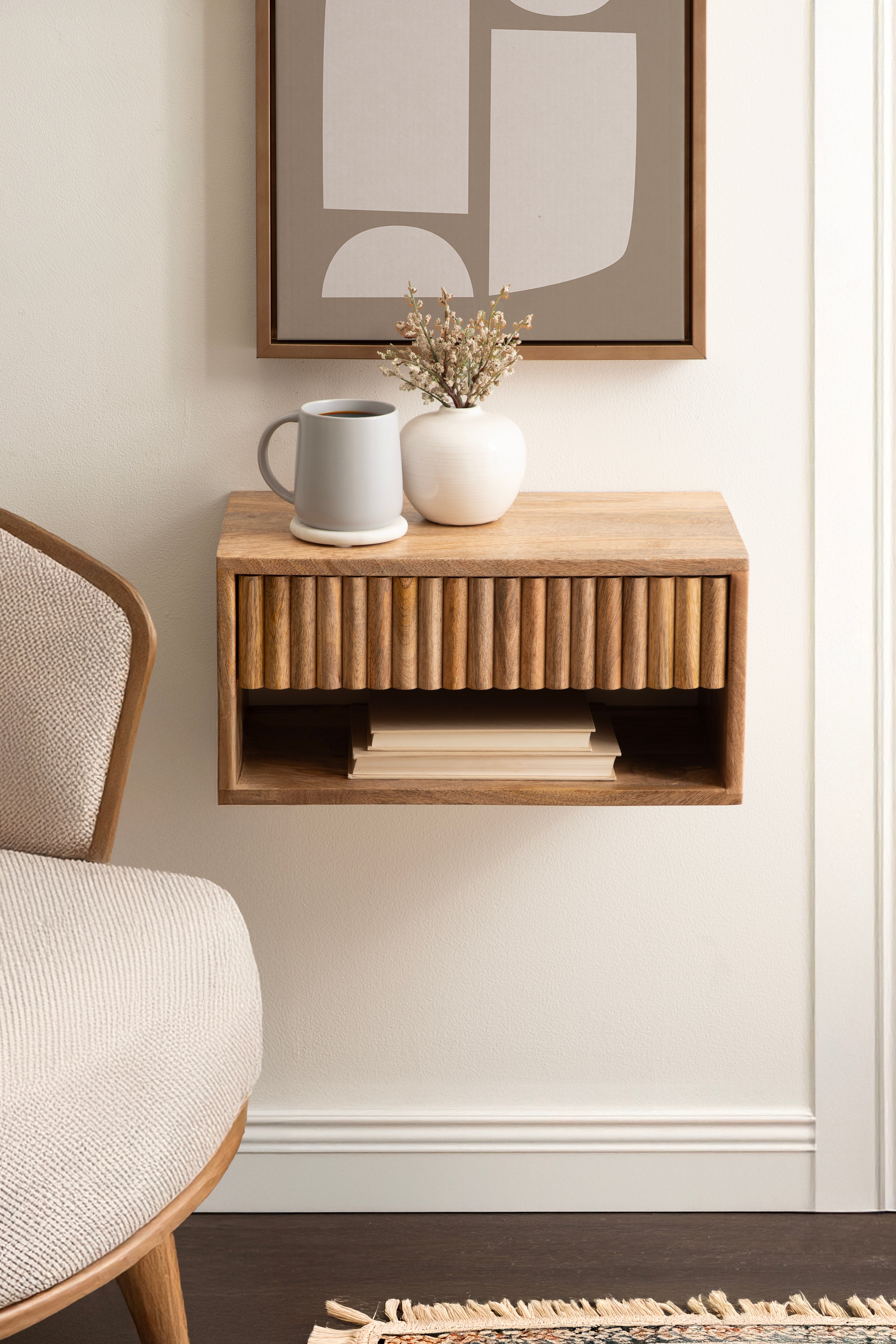 Introducing the Reid ribbed floating side table, a stylish and functional addition to your home decor. This modern wood floating shelf is designed with a ribbed texture, adding a touch of sophistication to any room. This variation of the side table includes a bonus shelf below, giving you a substantial option for a nightstand. The ribbed wooden construction adds a unique and eye-catching element, making it a focal point in any room. One of the standout features of this floating side table is the convenient drawer for extra storage. The drawer offers hidden storage space for keeping small items organized and out of sight, helping you maintain a clutter-free living space. It's perfect for storing remote controls, chargers, pens, or any other small items you want to keep within easy reach but neatly tucked away. The Reid side table is not only functional but also adds a touch of elegance to your home. Whether you use it in your living room, bedroom, or entryway, this floating side table is sure to enhance your home decor and provide extra storage and functionality. With its tiered design, ribbed wooden texture, and a convenient drawer for extra storage, this modern wood floating shelf is a practical and stylish addition to any room.