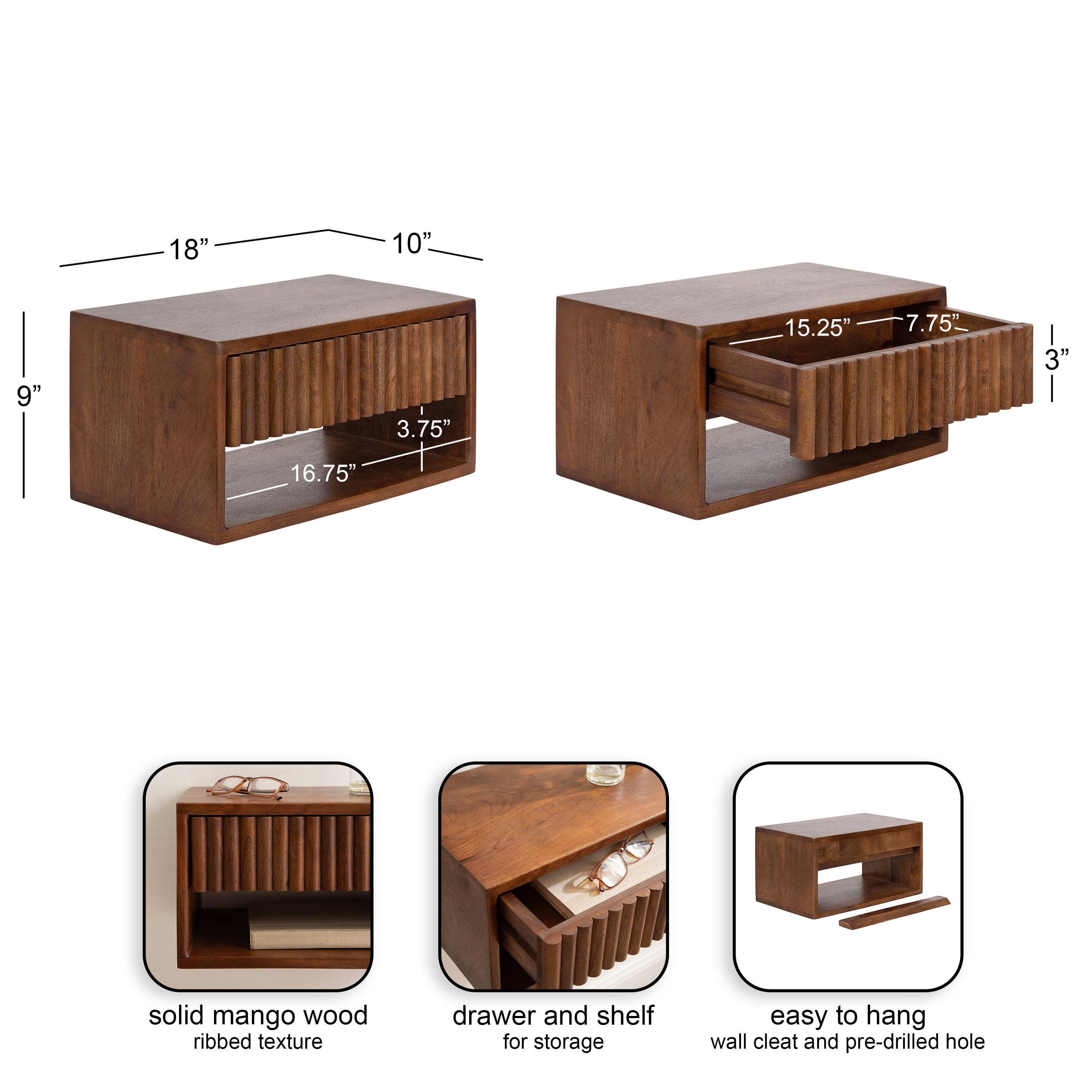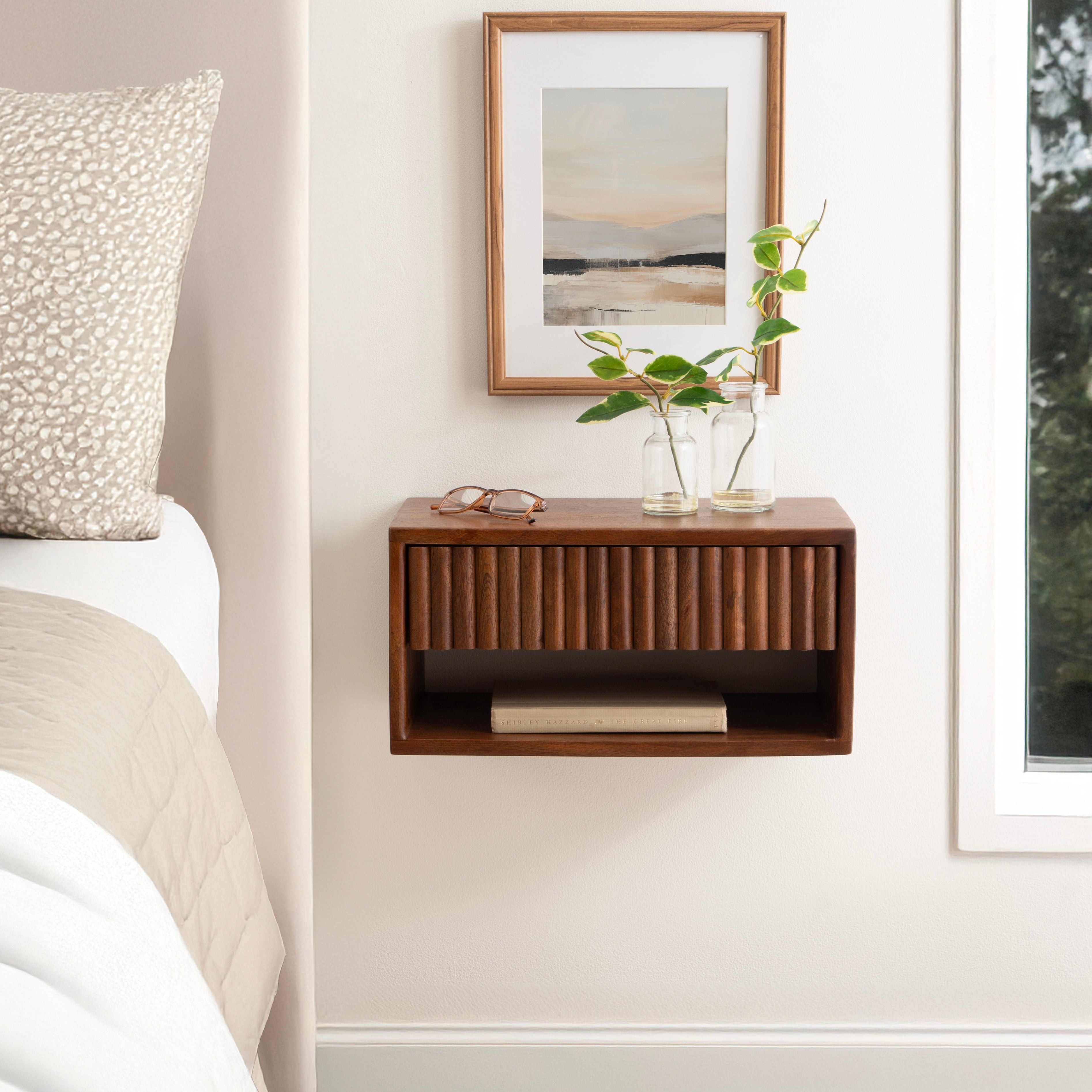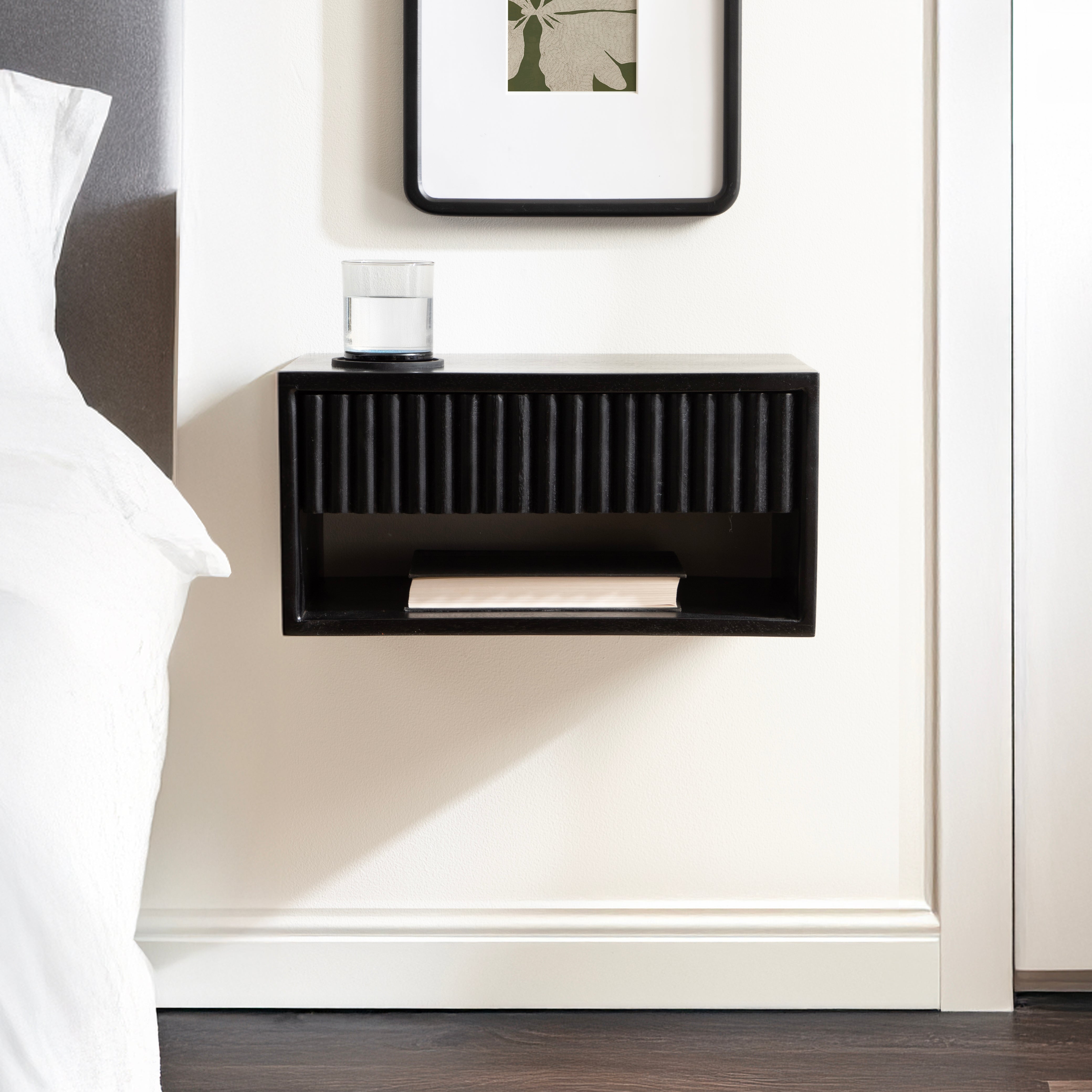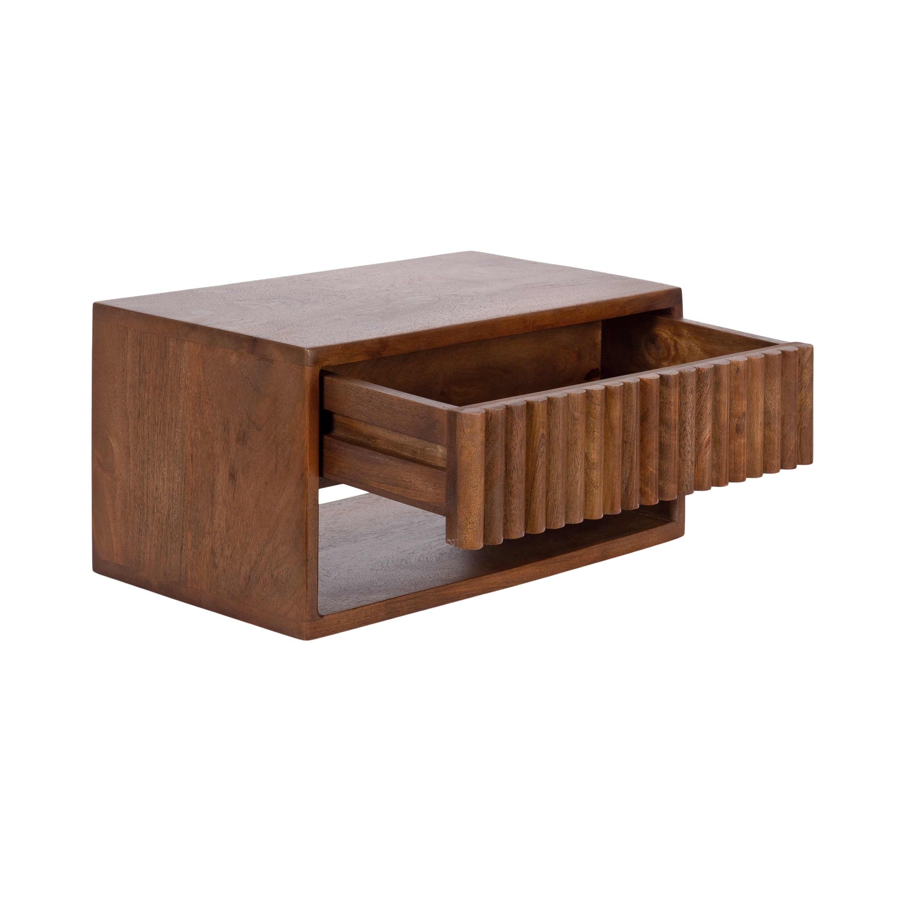 Introducing the Reid ribbed floating side table, a stylish and functional addition to your home decor. This modern wood floating shelf is designed with a ribbed texture, adding a touch of sophistication to any room. This variation of the side table includes a bonus shelf below, giving you a substantial option for a nightstand. The ribbed wooden construction adds a unique and eye-catching element, making it a focal point in any room. One of the standout features of this floating side table is the convenient drawer for extra storage. The drawer offers hidden storage space for keeping small items organized and out of sight, helping you maintain a clutter-free living space. It's perfect for storing remote controls, chargers, pens, or any other small items you want to keep within easy reach but neatly tucked away. The Reid side table is not only functional but also adds a touch of elegance to your home. Whether you use it in your living room, bedroom, or entryway, this floating side table is sure to enhance your home decor and provide extra storage and functionality. With its tiered design, ribbed wooden texture, and a convenient drawer for extra storage, this modern wood floating shelf is a practical and stylish addition to any room.