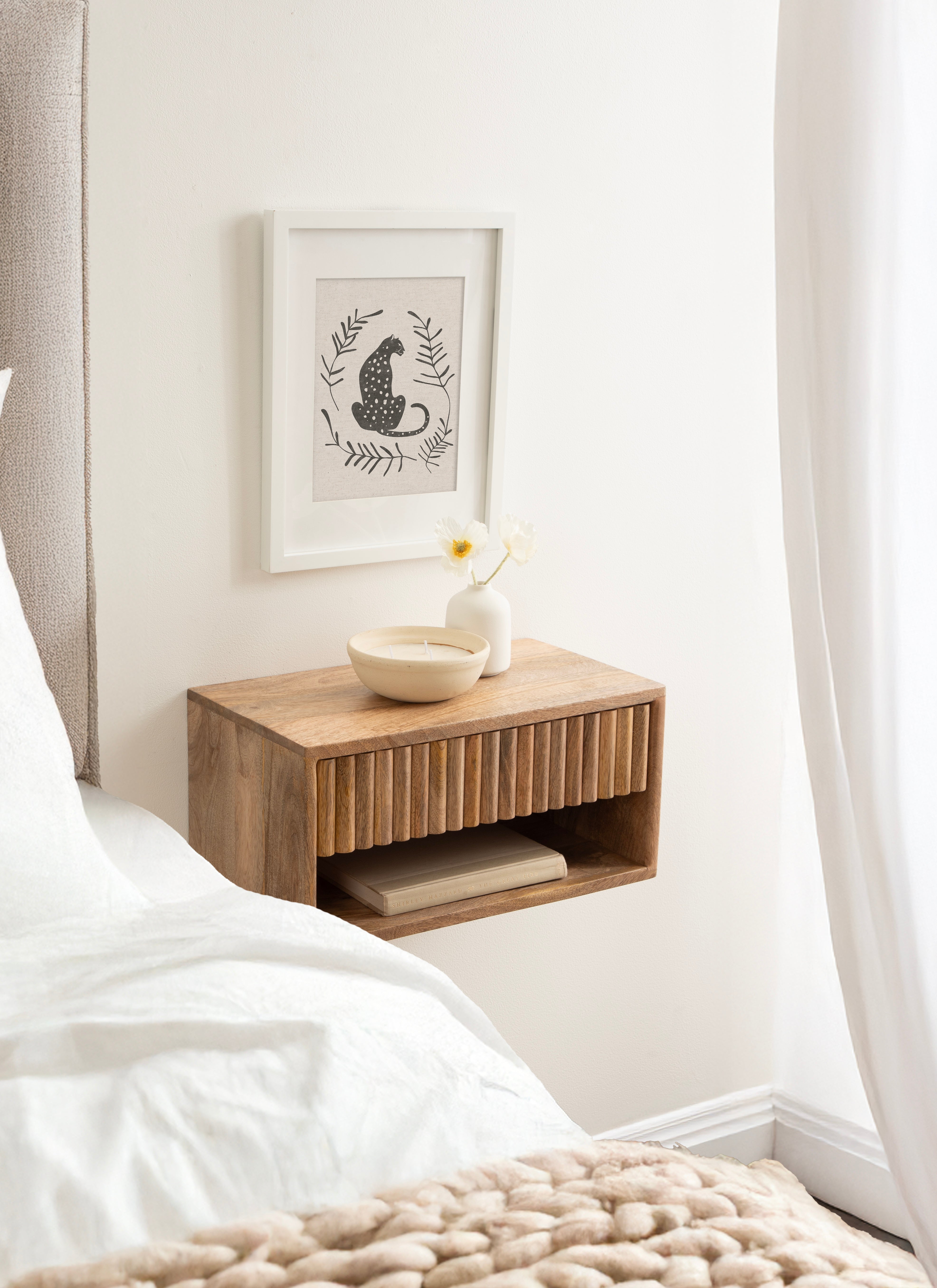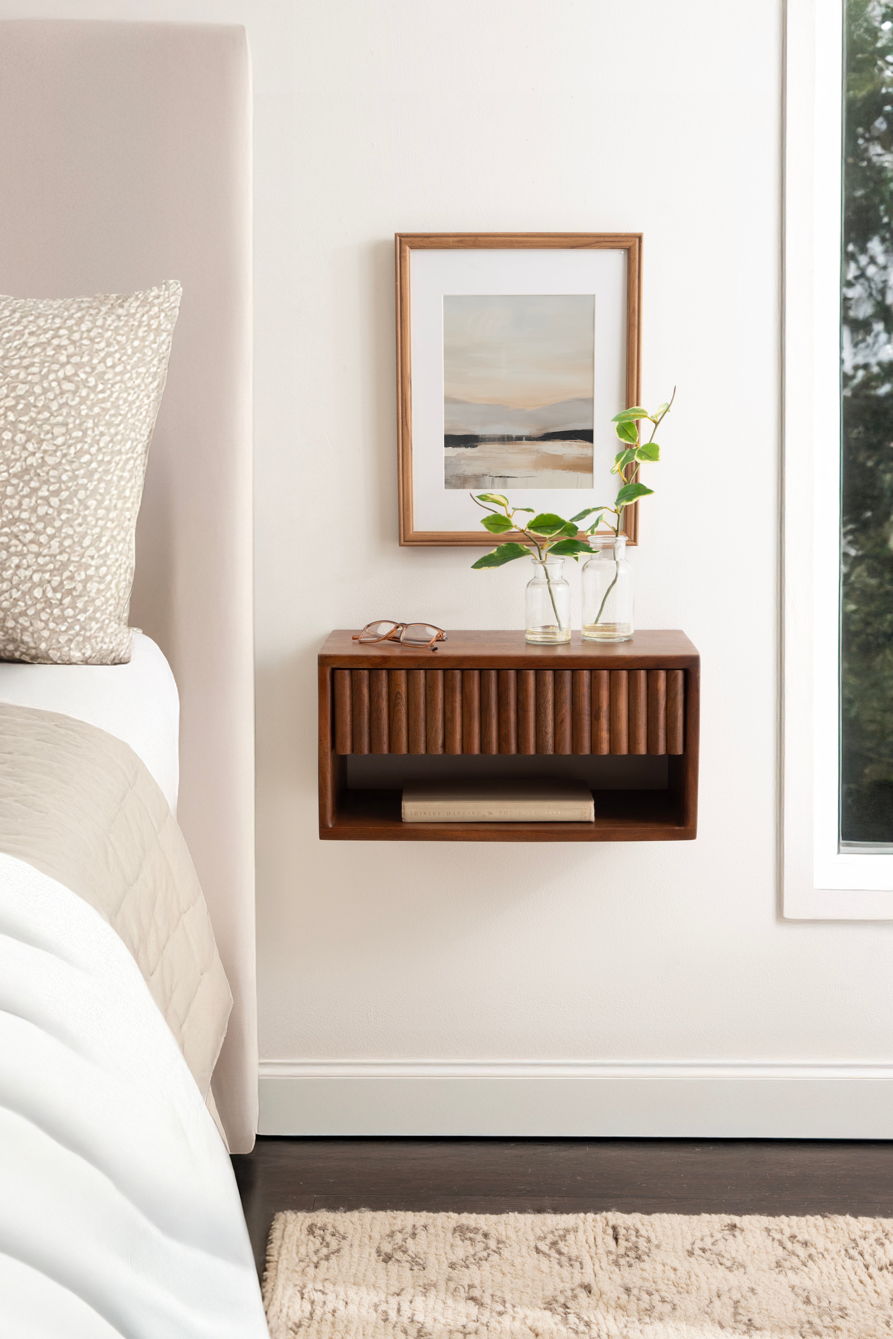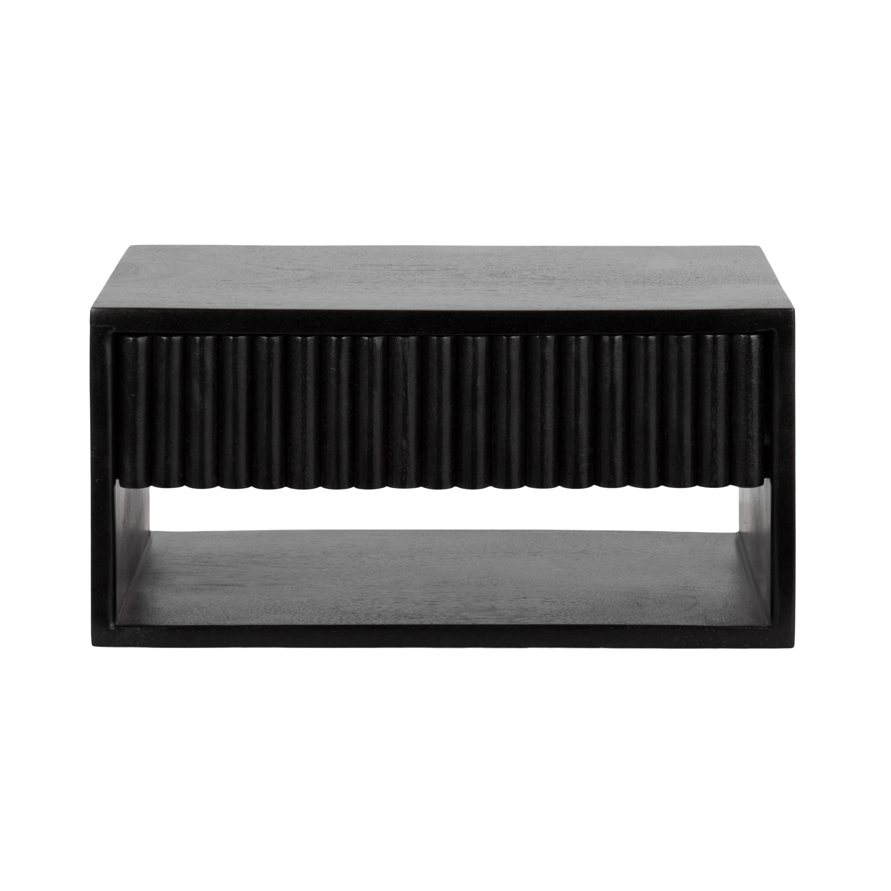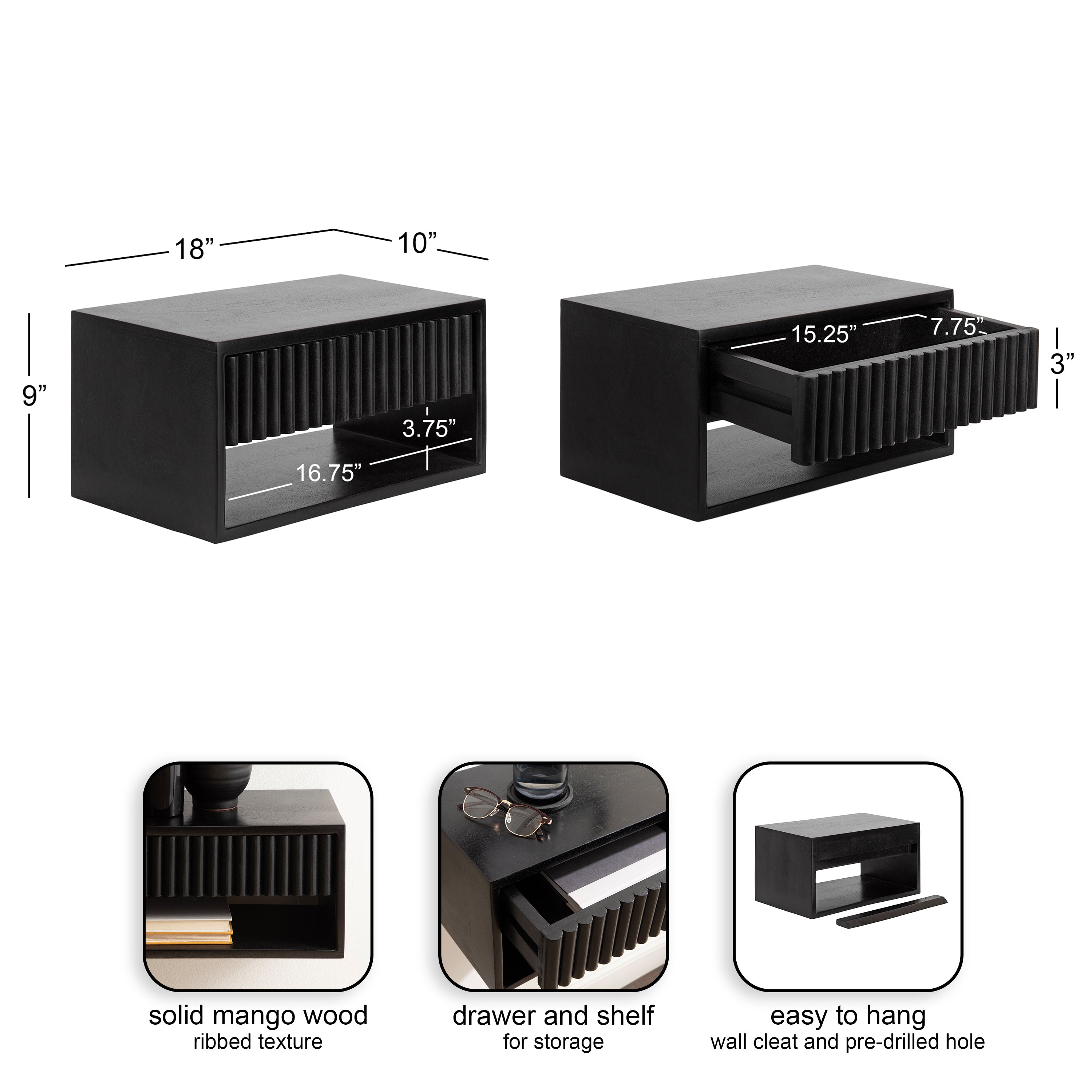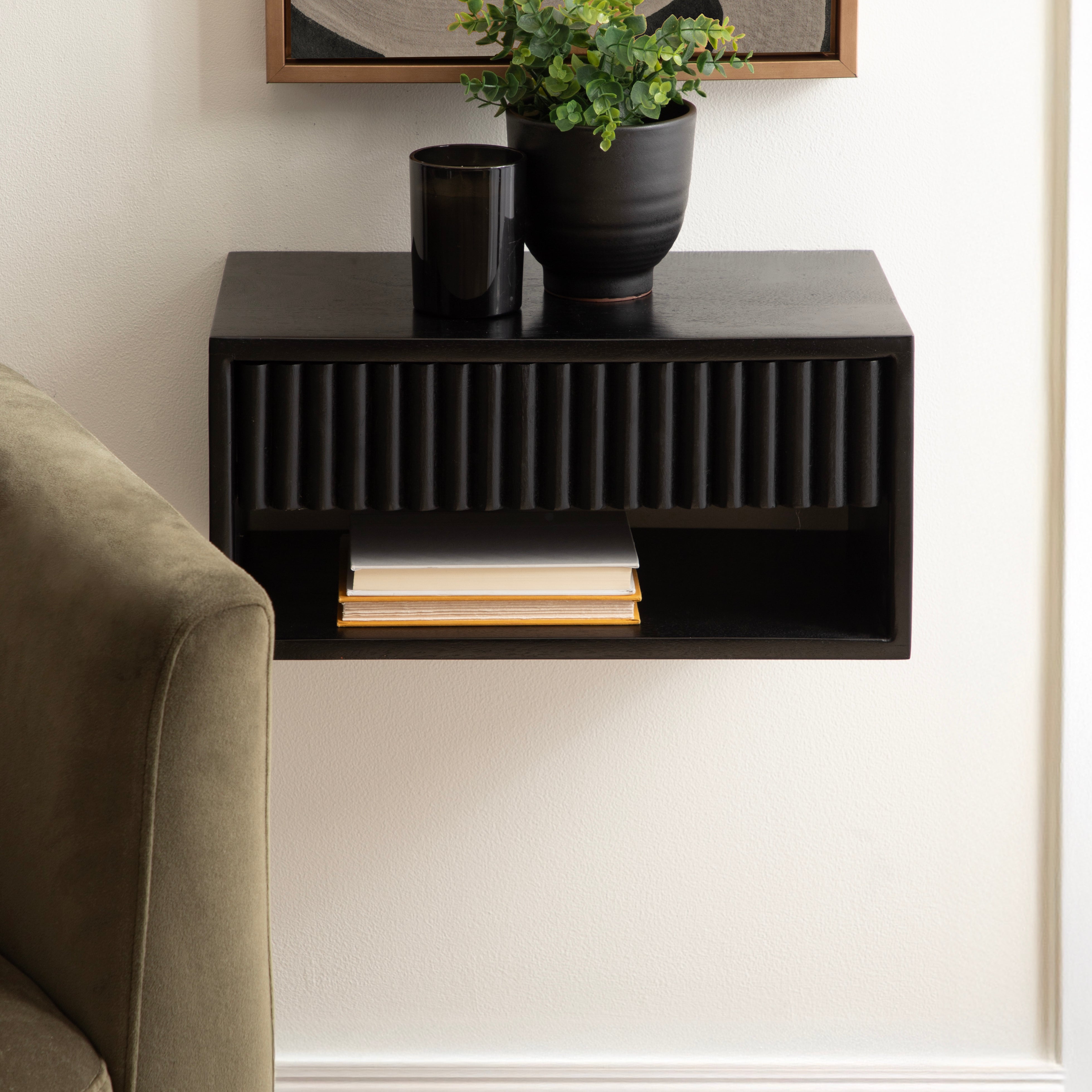 Introducing the Reid ribbed floating side table, a stylish and functional addition to your home decor. This modern wood floating shelf is designed with a ribbed texture, adding a touch of sophistication to any room. This variation of the side table includes a bonus shelf below, giving you a substantial option for a nightstand. The ribbed wooden construction adds a unique and eye-catching element, making it a focal point in any room. One of the standout features of this floating side table is the convenient drawer for extra storage. The drawer offers hidden storage space for keeping small items organized and out of sight, helping you maintain a clutter-free living space. It's perfect for storing remote controls, chargers, pens, or any other small items you want to keep within easy reach but neatly tucked away. The Reid side table is not only functional but also adds a touch of elegance to your home. Whether you use it in your living room, bedroom, or entryway, this floating side table is sure to enhance your home decor and provide extra storage and functionality. With its tiered design, ribbed wooden texture, and a convenient drawer for extra storage, this modern wood floating shelf is a practical and stylish addition to any room.