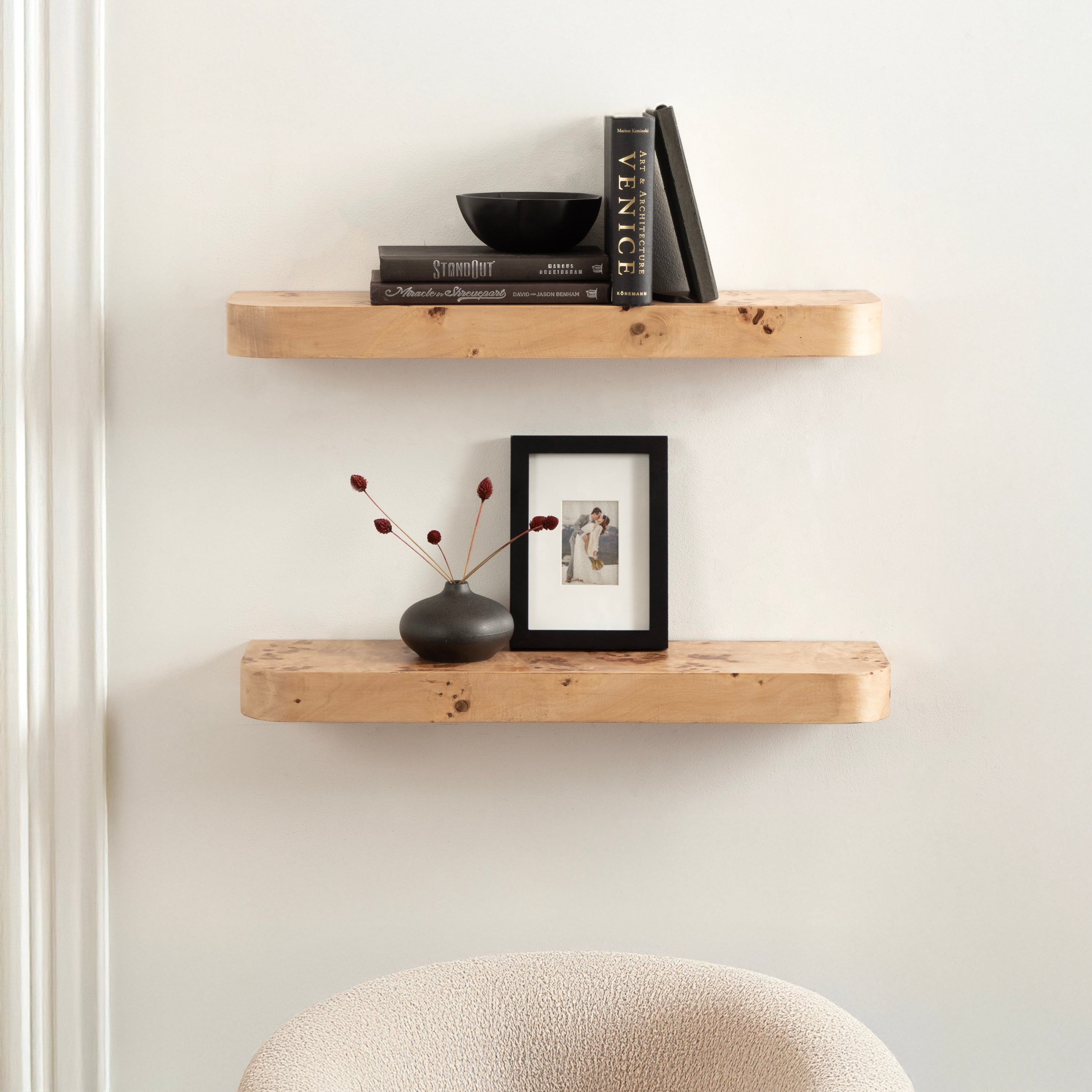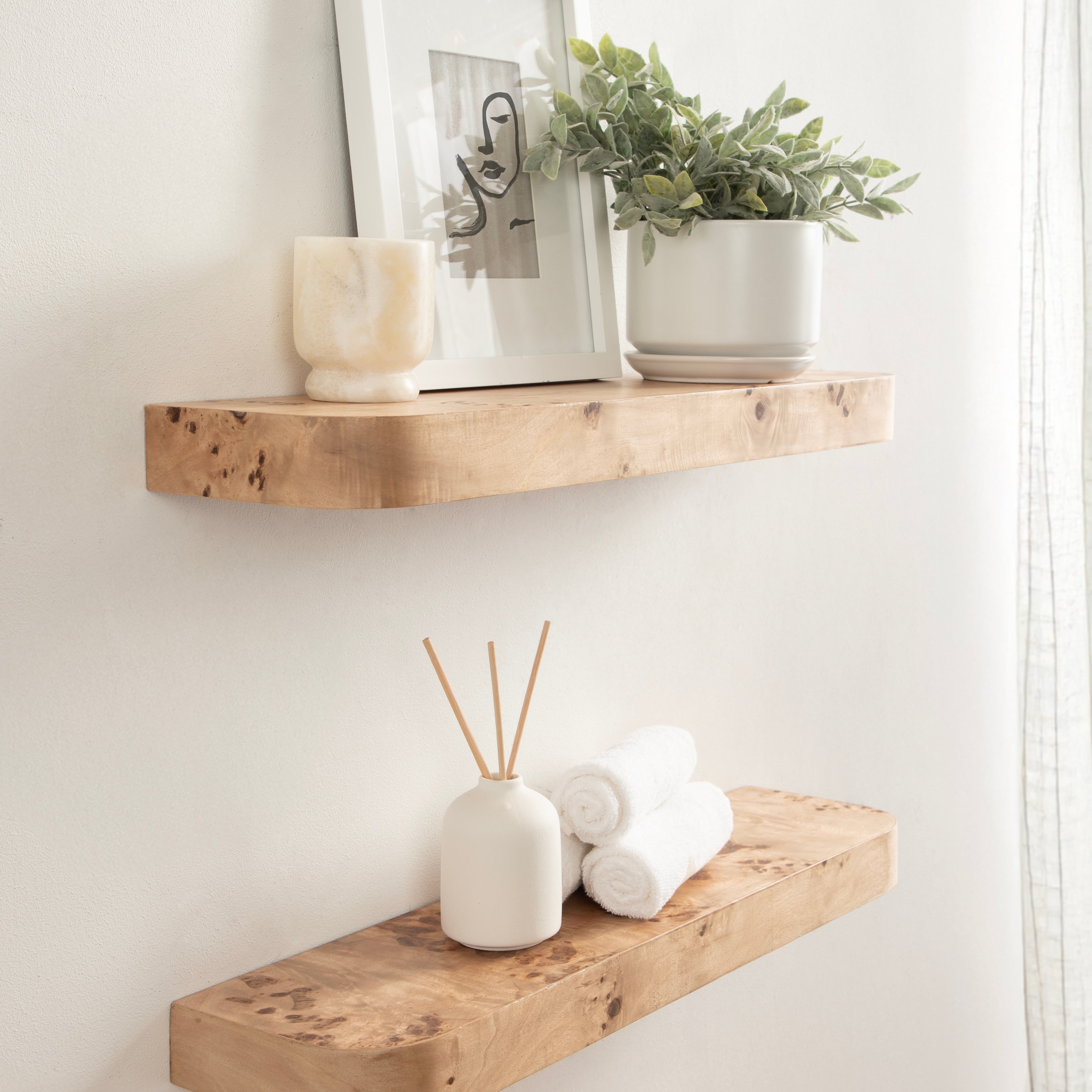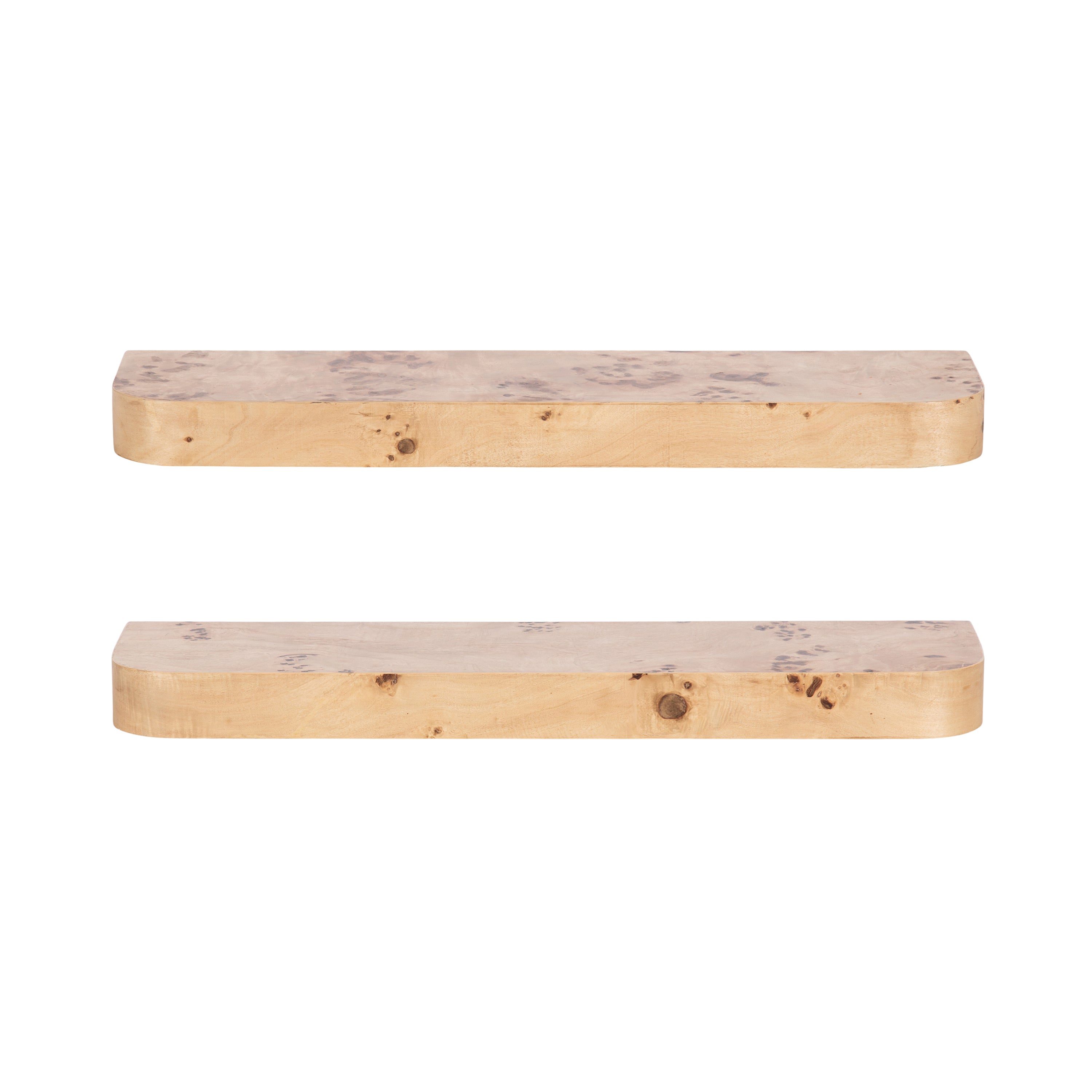 Inspire your inner interior decorator with these functional and beautiful floating shelves. Inspired by clean lines and convenient design, the Burlock shelves combine modern aesthetics with practical function. These shelves were made from a resilient wooden material with a stunning burlock veneer, giving them an elevated quality and appearance. The distinct burlwood knotting provides a look that lends itself to clean design, allowing the Burlock to blend into a variety of decorative aesthetics. The two Burlock shelves hang in just a matter of minutes with the convenient hanging brackets that attach directly to the wall for a quick and simple process.