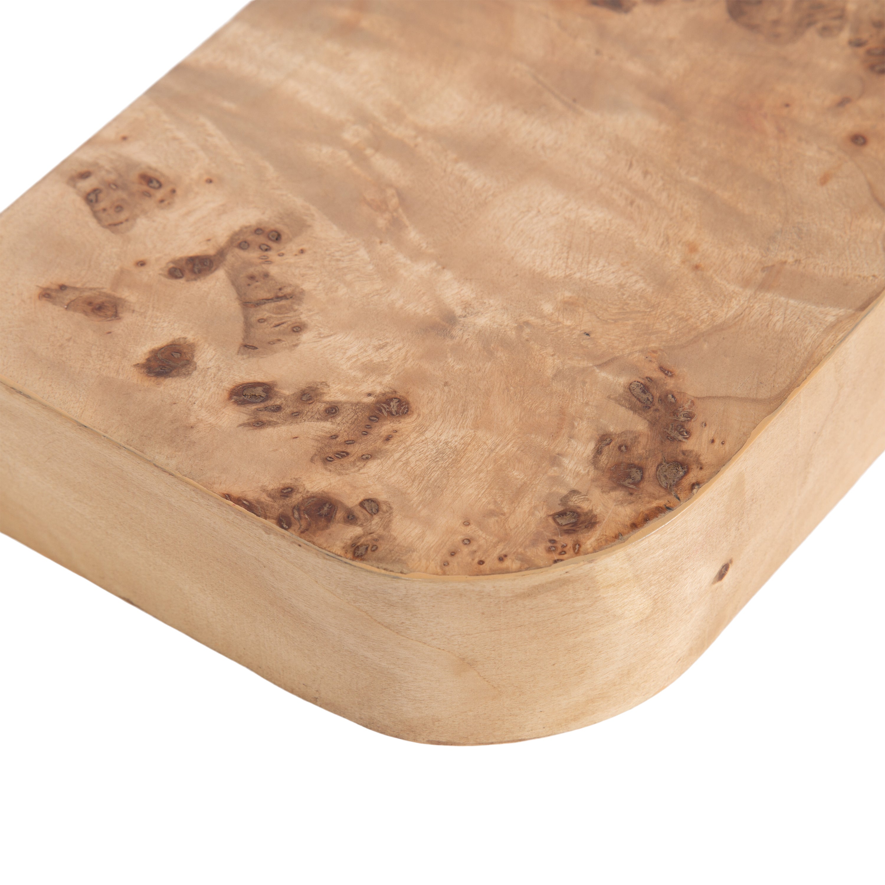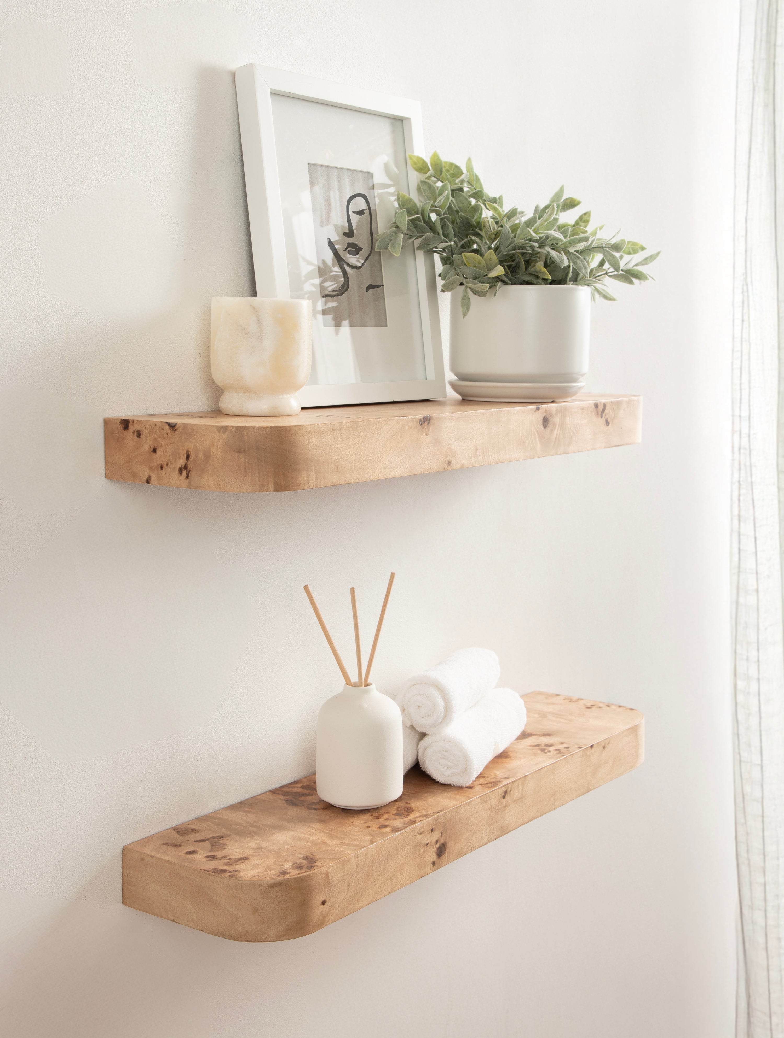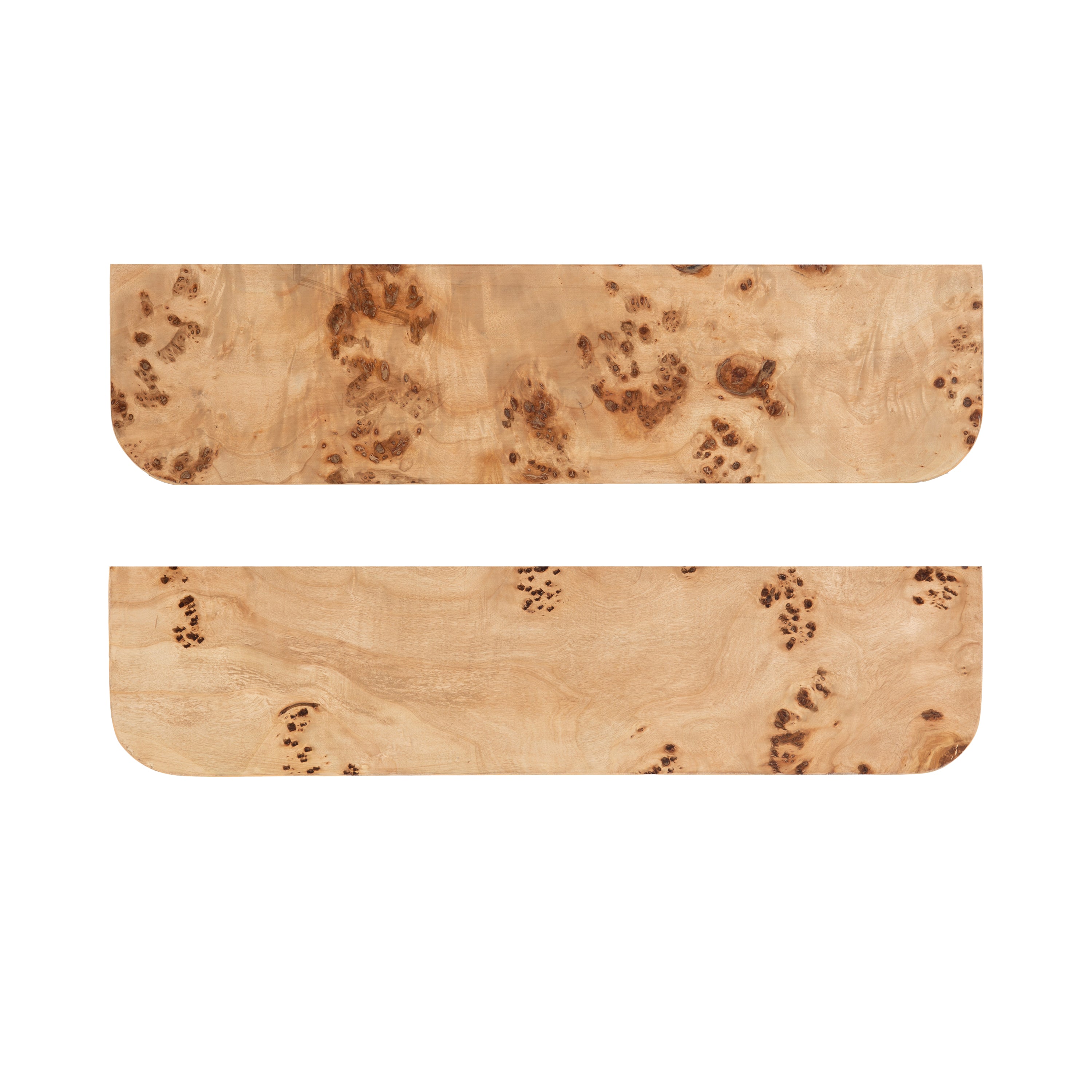 Inspire your inner interior decorator with these functional and beautiful floating shelves. Inspired by clean lines and convenient design, the Burlock shelves combine modern aesthetics with practical function. These shelves were made from a resilient wooden material with a stunning burlock veneer, giving them an elevated quality and appearance. The distinct burlwood knotting provides a look that lends itself to clean design, allowing the Burlock to blend into a variety of decorative aesthetics. The two Burlock shelves hang in just a matter of minutes with the convenient hanging brackets that attach directly to the wall for a quick and simple process.
