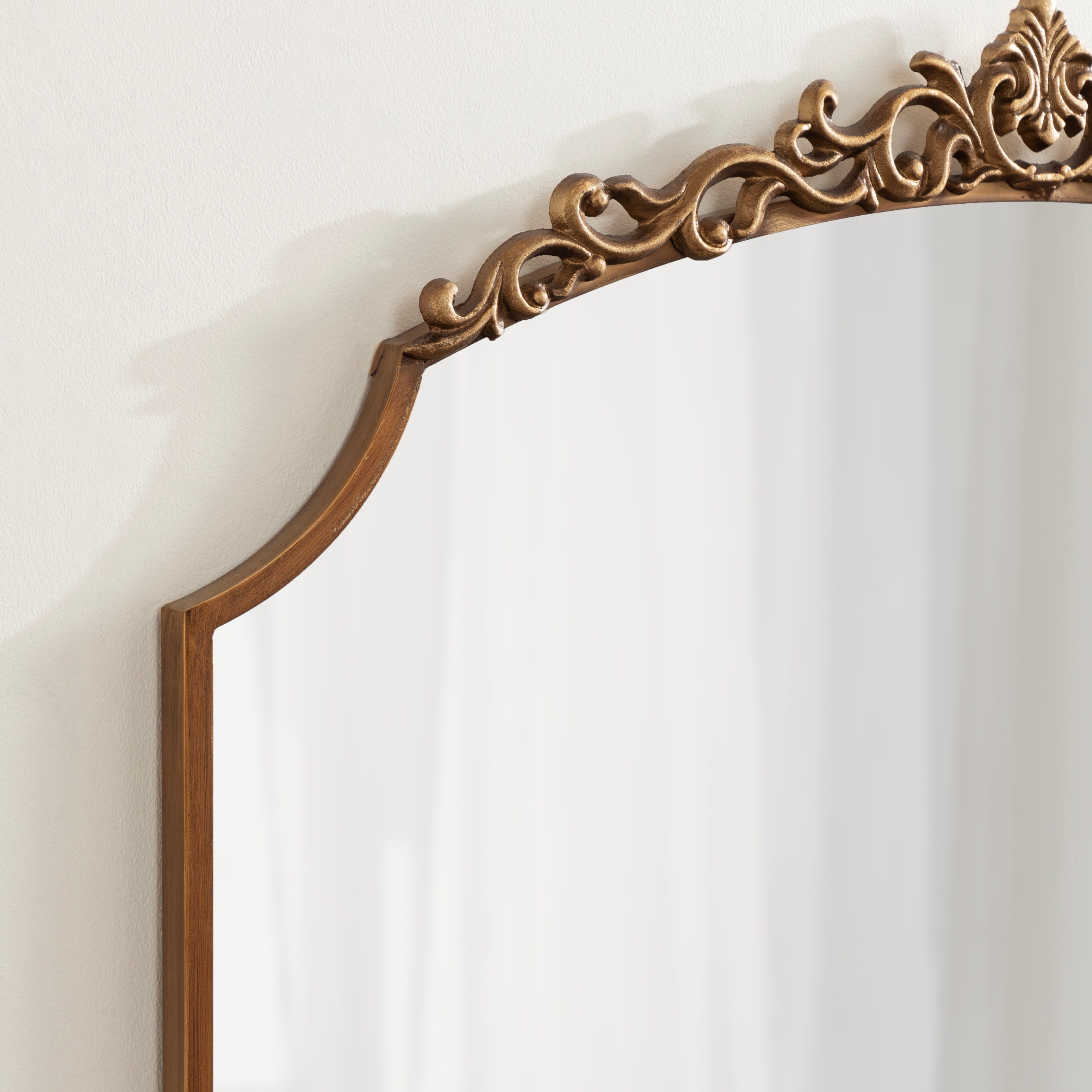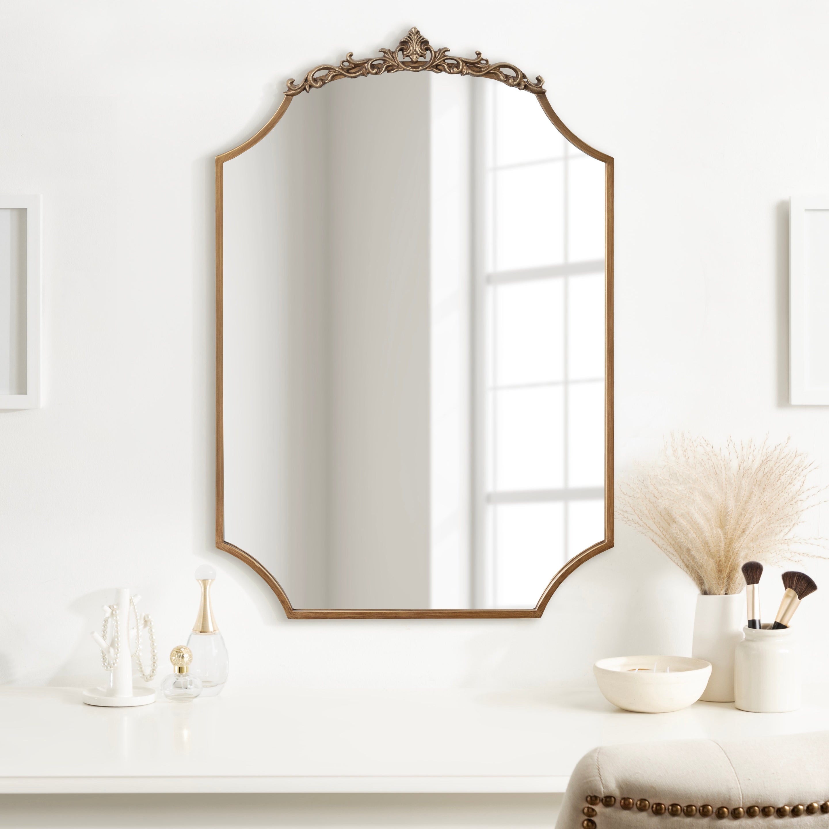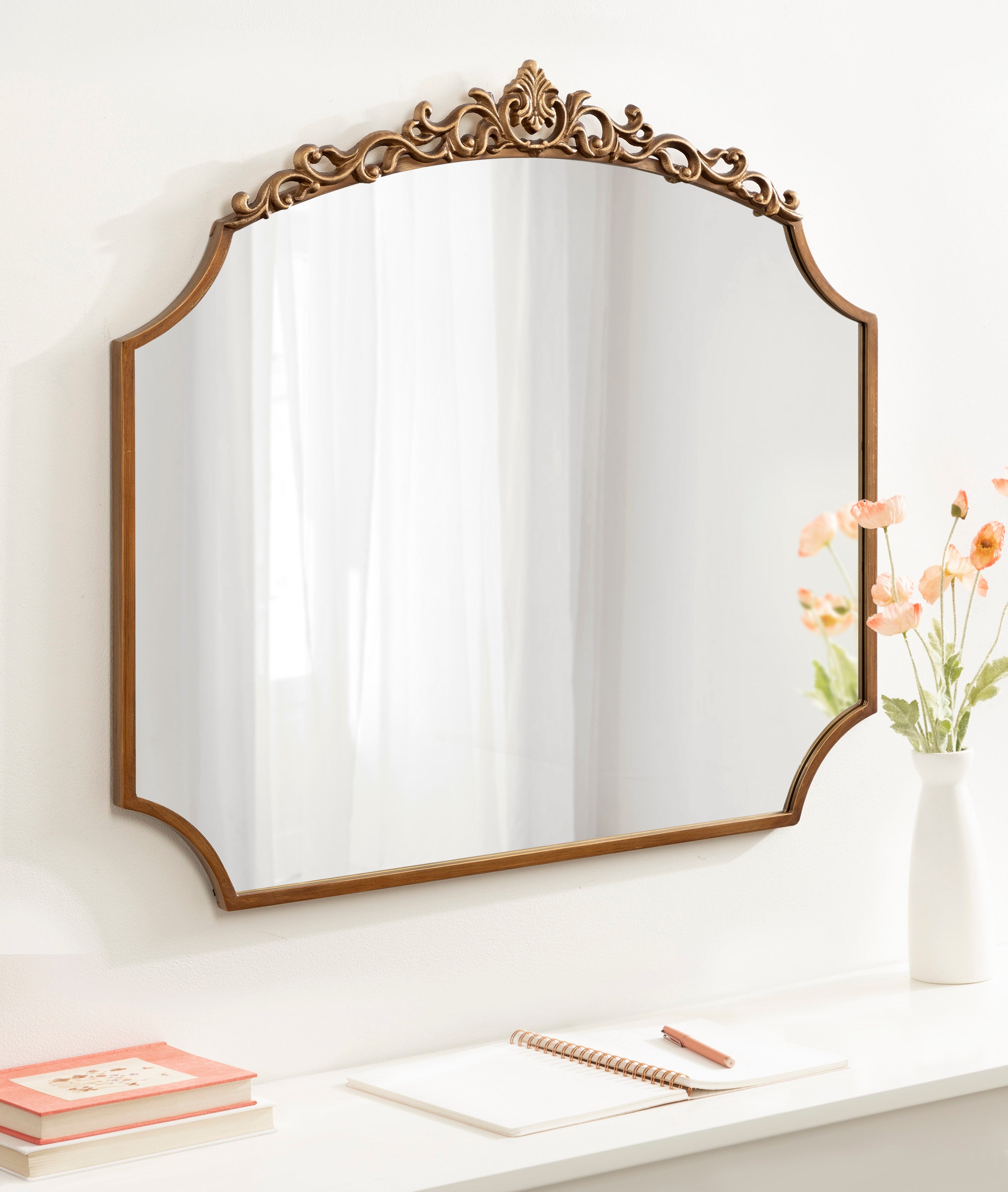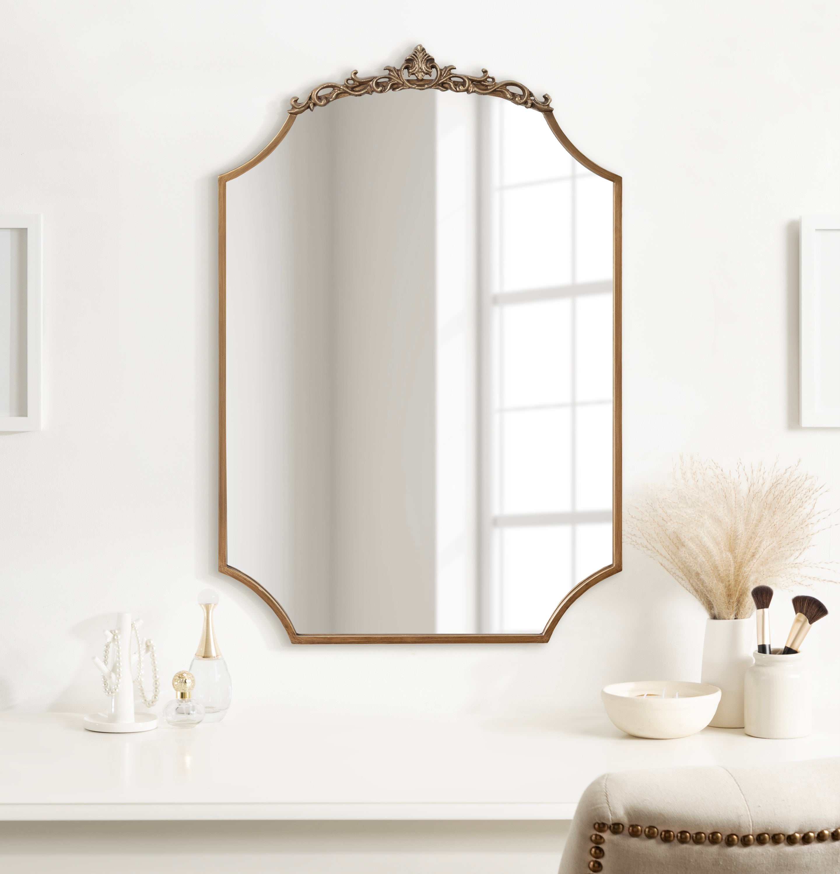 The Arendahl wall mirror is here to bring a brilliant and decadent accent to your traditional home decor. This wall mirror features a baroque-inspired design, with an ornate crown cascading down its beautiful frame. Due to its hand-finished craftsmanship, each piece may vary in appearance. Display the Arendahl mirror as a bathroom vanity mirror or a decorative focal point amongst your living room, entryway, or bedroom decor. Use this decadent wall mirror to bring dimension to your smaller spaces, opening up the area and illuminating the darker corners.
