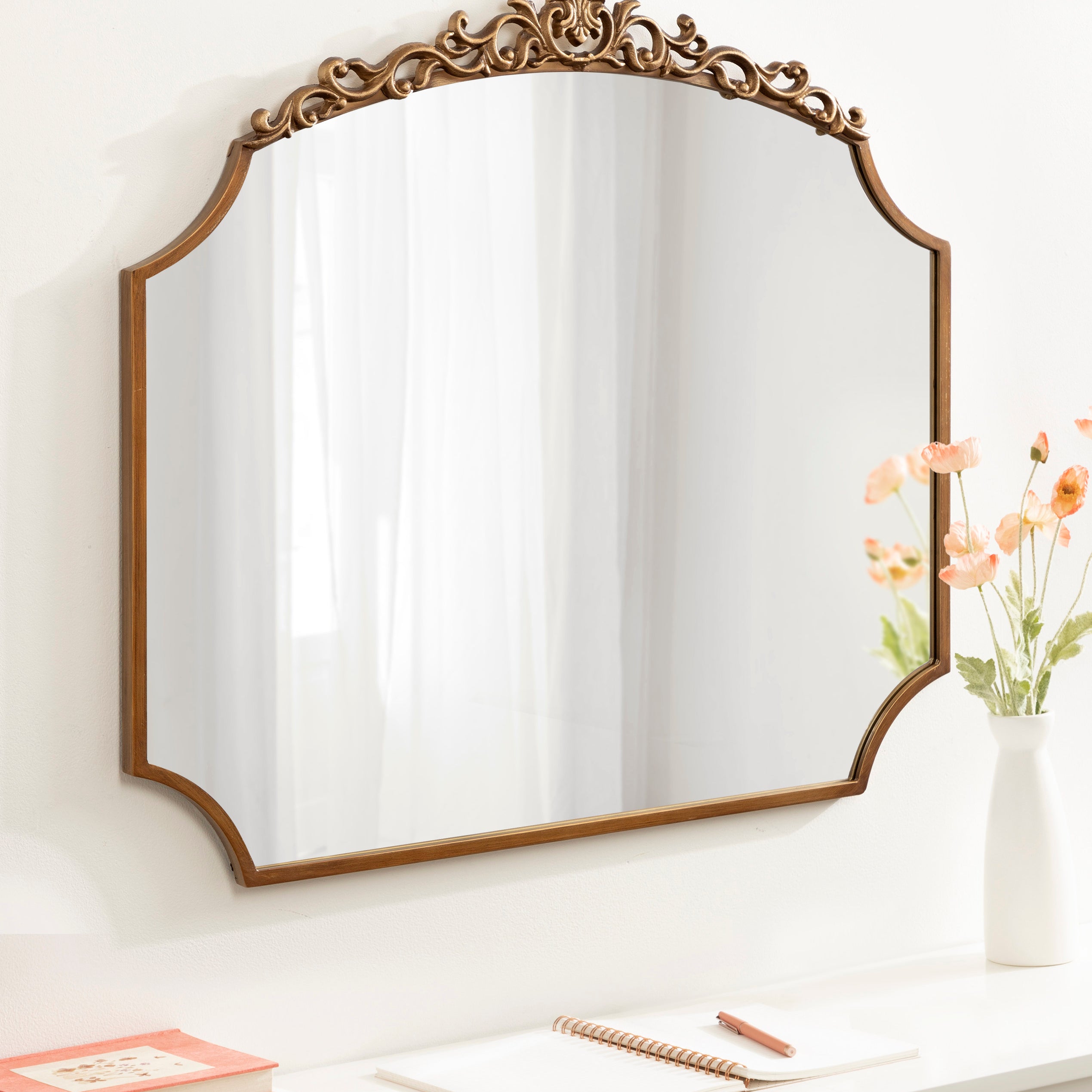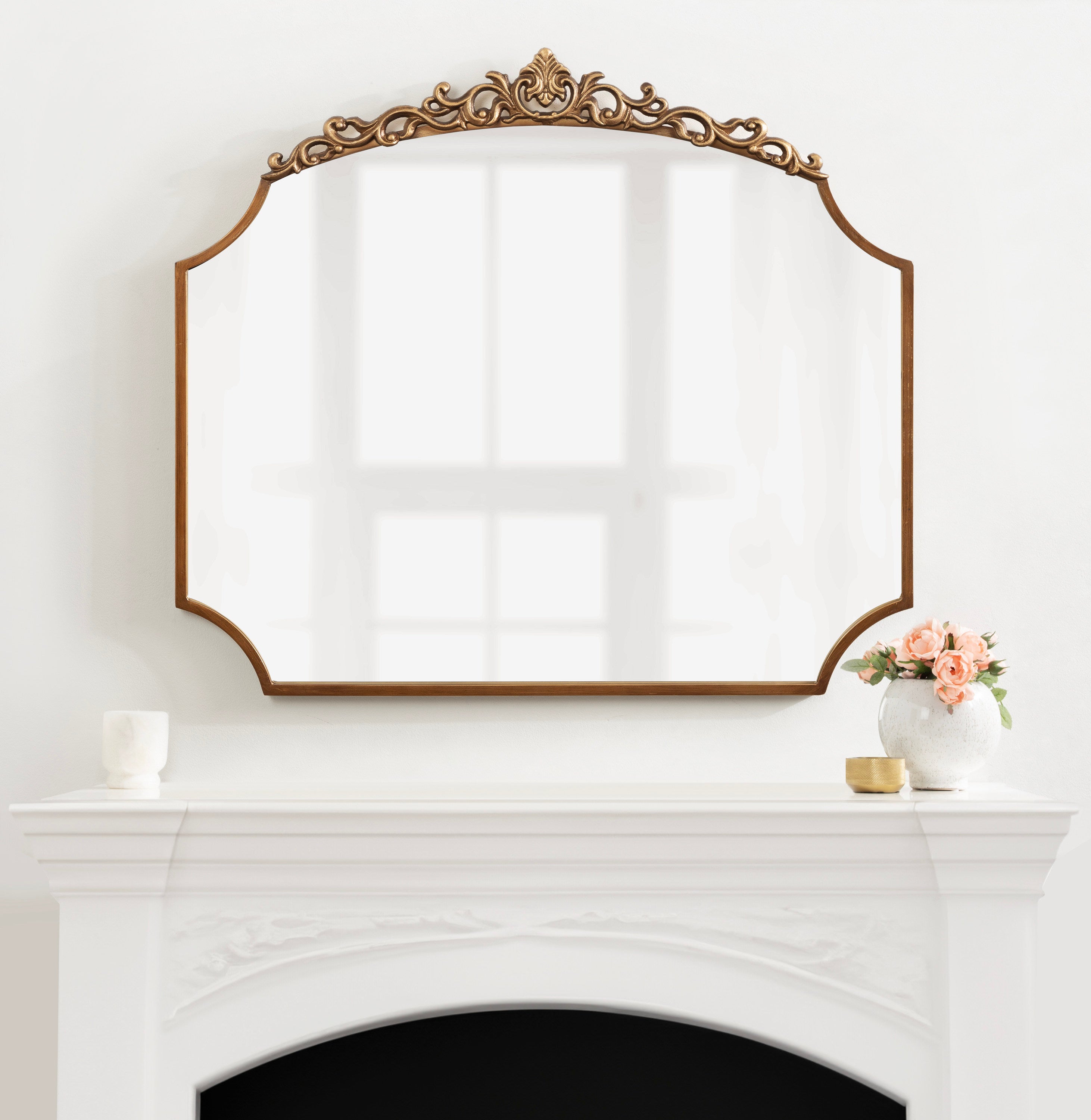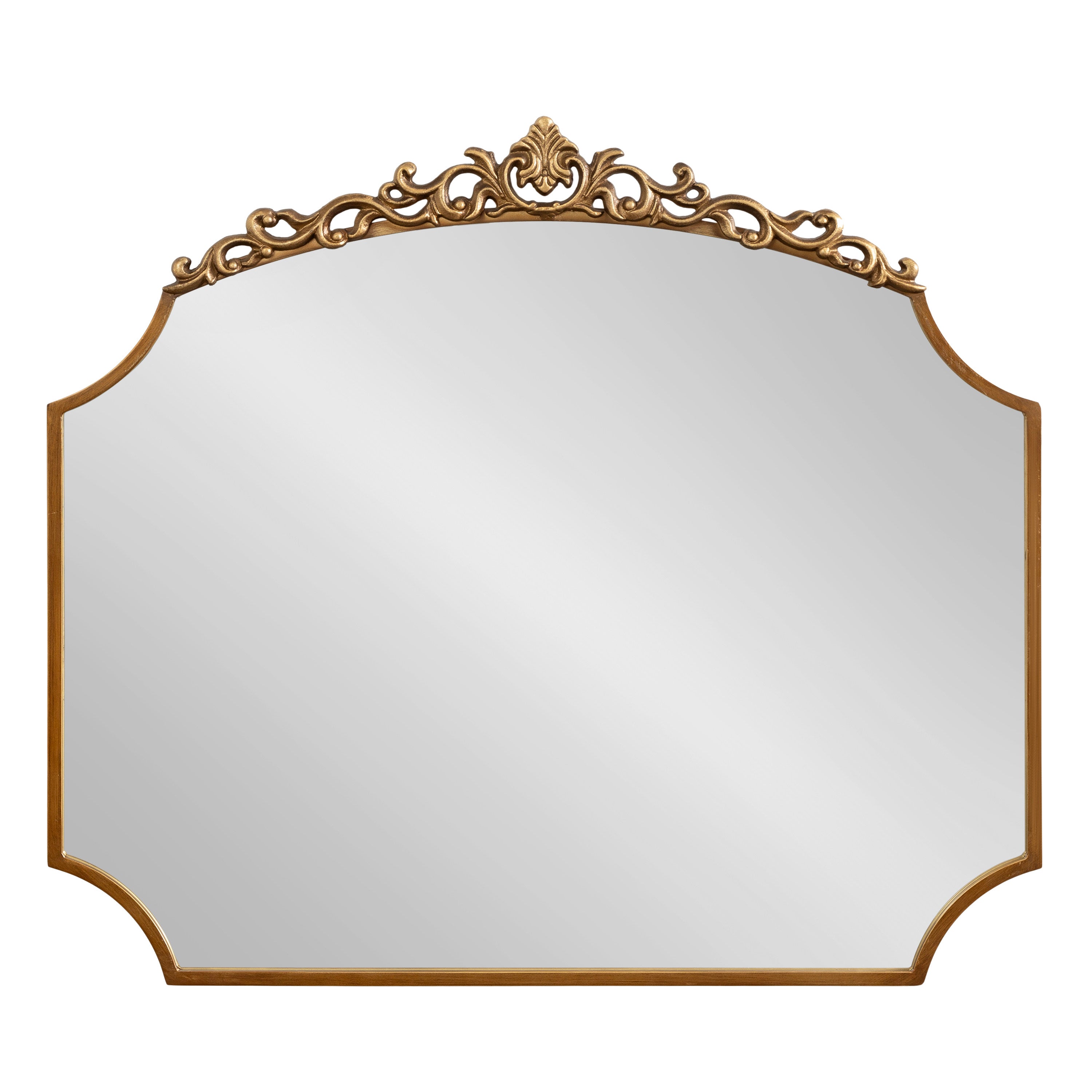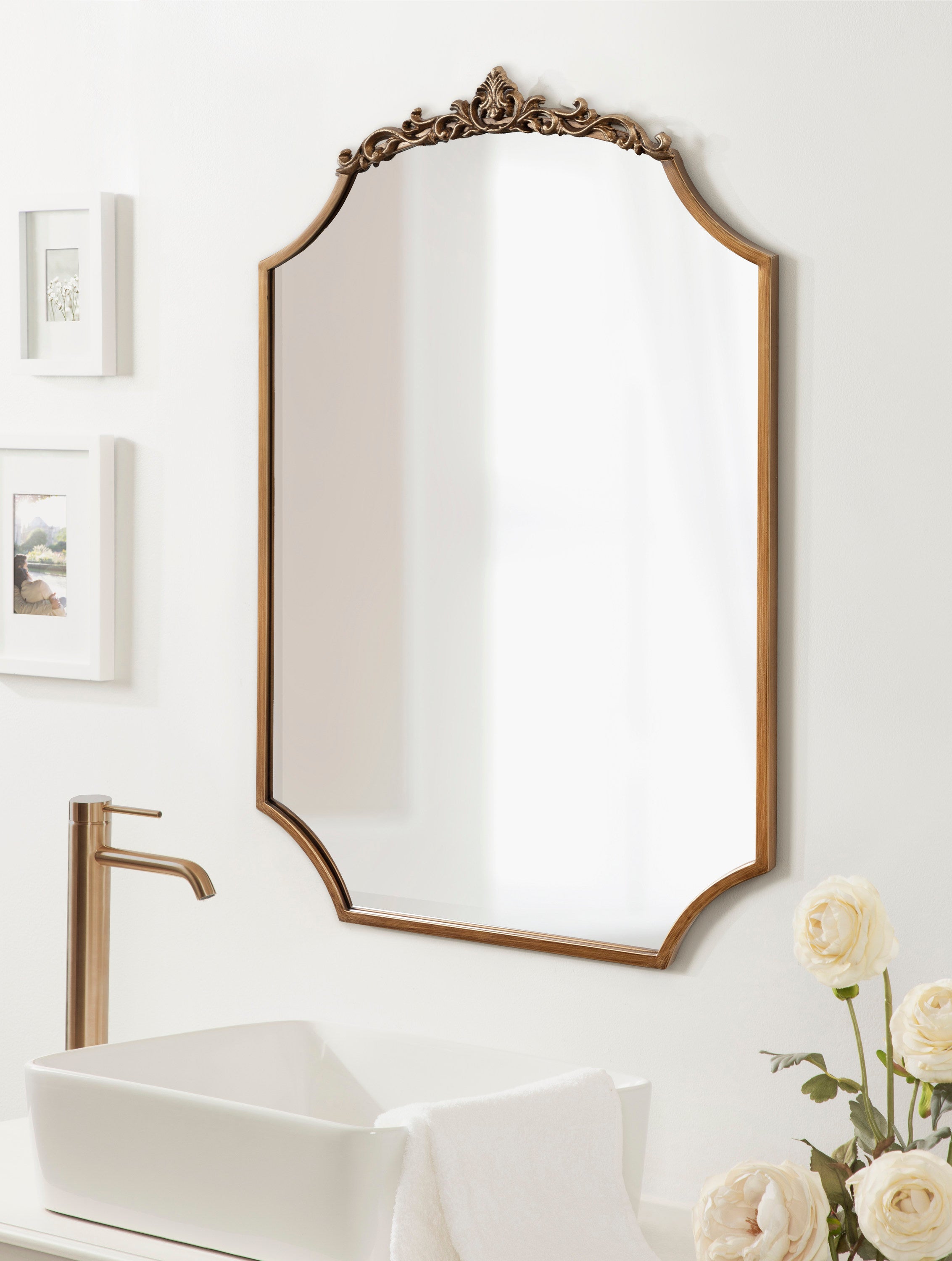 The Arendahl wall mirror is here to bring a brilliant and decadent accent to your traditional home decor. This wall mirror features a baroque-inspired design, with an ornate crown cascading down its beautiful frame. Due to its hand-finished craftsmanship, each piece may vary in appearance. Display the Arendahl mirror as a bathroom vanity mirror or a decorative focal point amongst your living room, entryway, or bedroom decor. Use this decadent wall mirror to bring dimension to your smaller spaces, opening up the area and illuminating the darker corners.