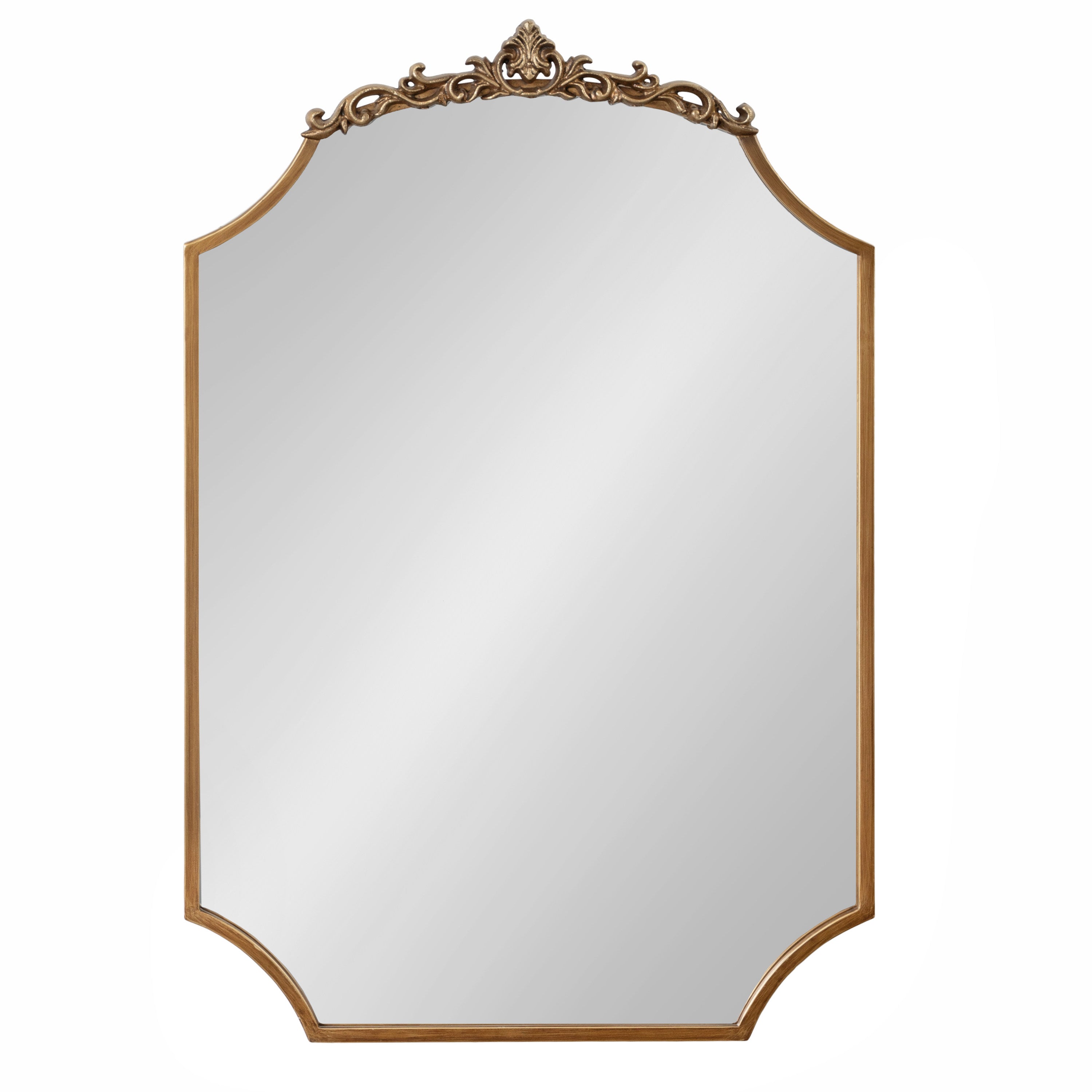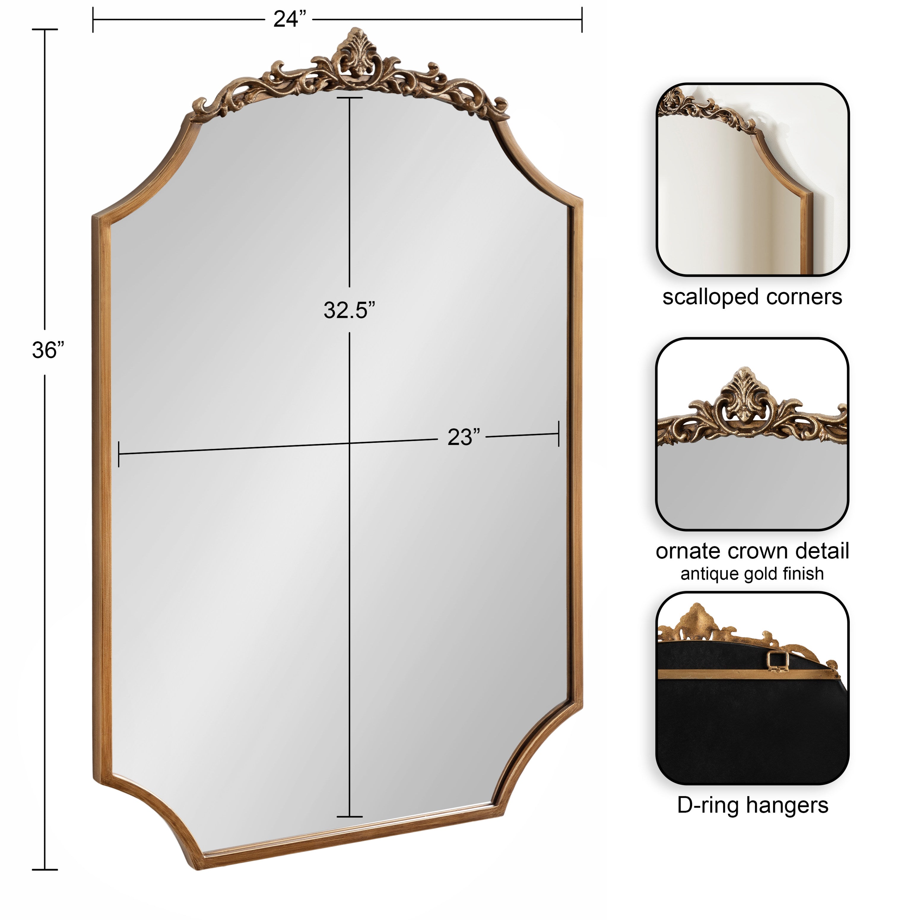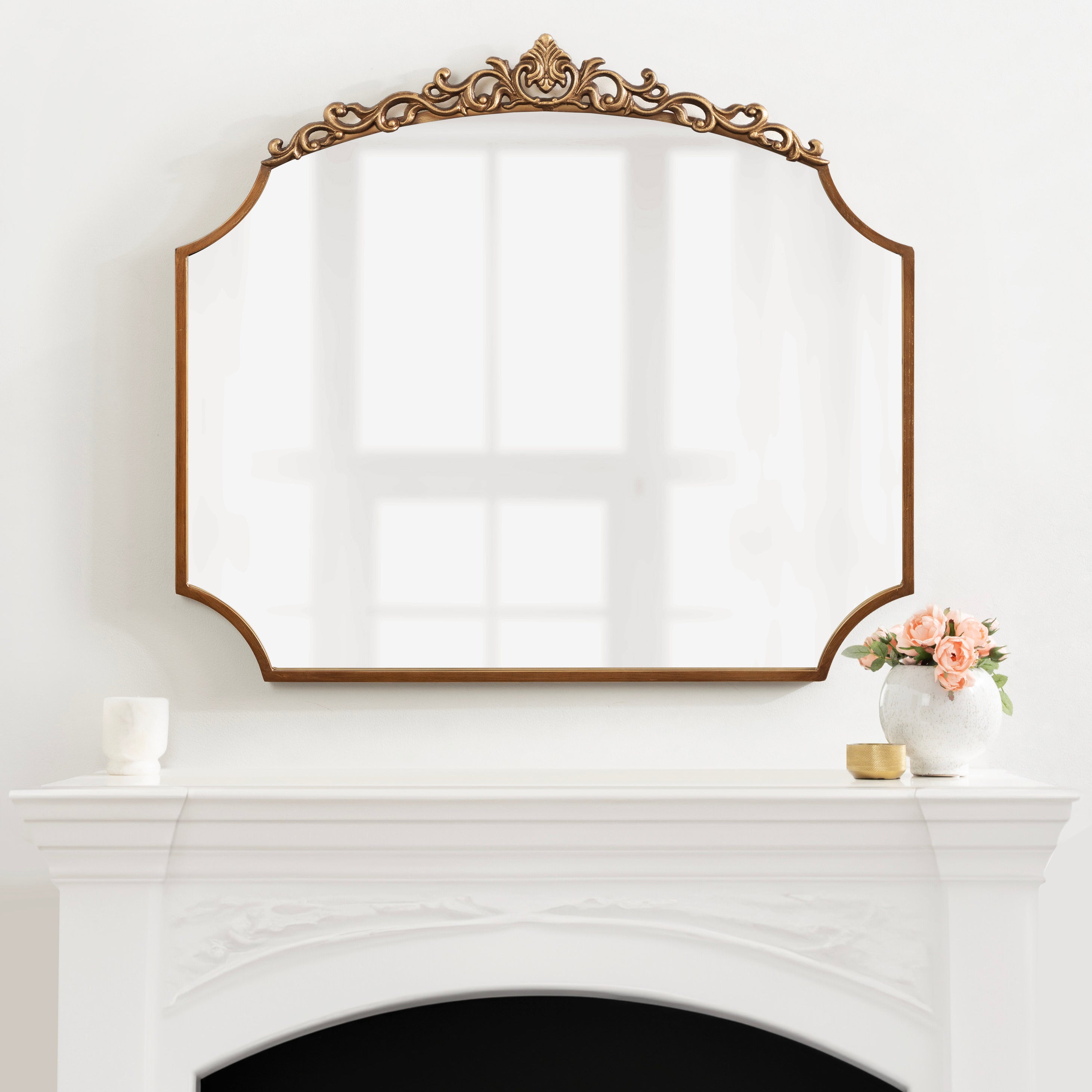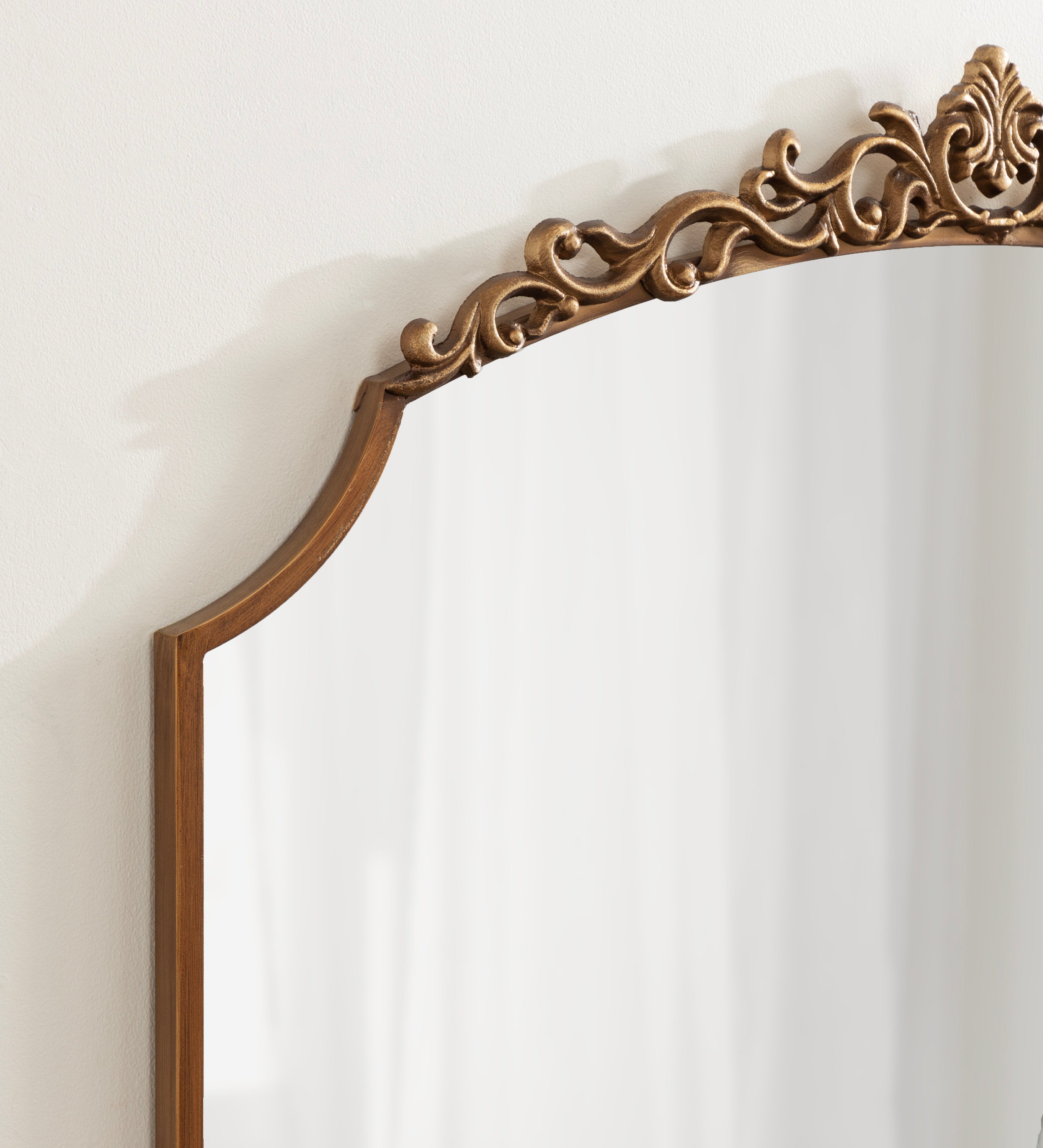 The Arendahl wall mirror is here to bring a brilliant and decadent accent to your traditional home decor. This wall mirror features a baroque-inspired design, with an ornate crown cascading down its beautiful frame. Due to its hand-finished craftsmanship, each piece may vary in appearance. Display the Arendahl mirror as a bathroom vanity mirror or a decorative focal point amongst your living room, entryway, or bedroom decor. Use this decadent wall mirror to bring dimension to your smaller spaces, opening up the area and illuminating the darker corners.