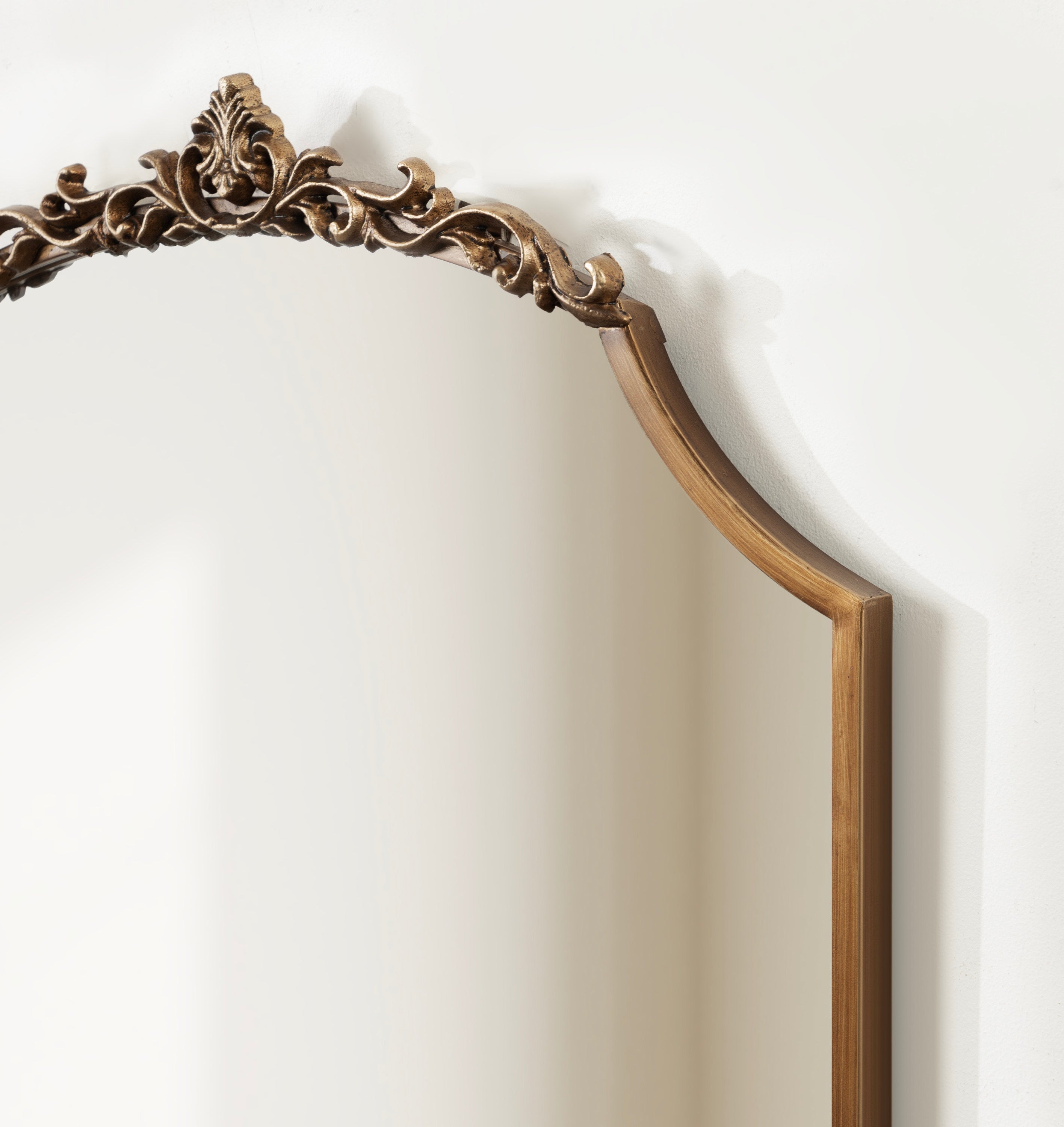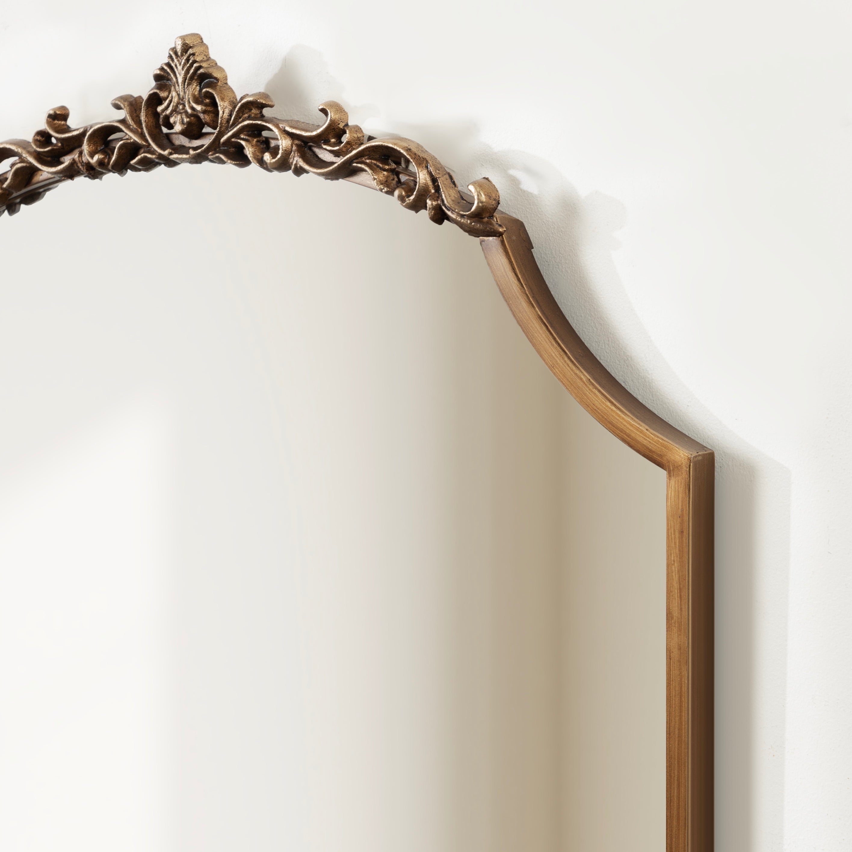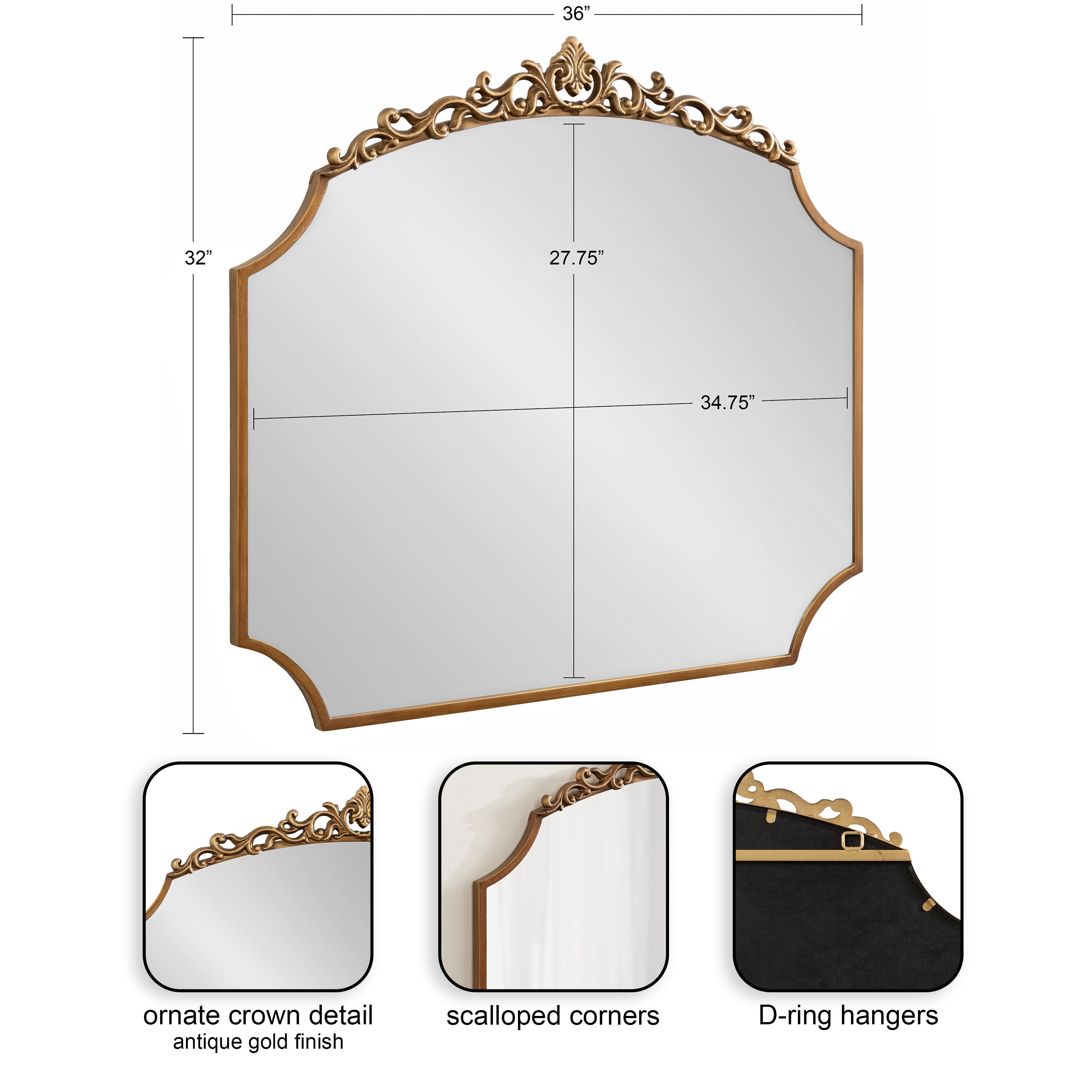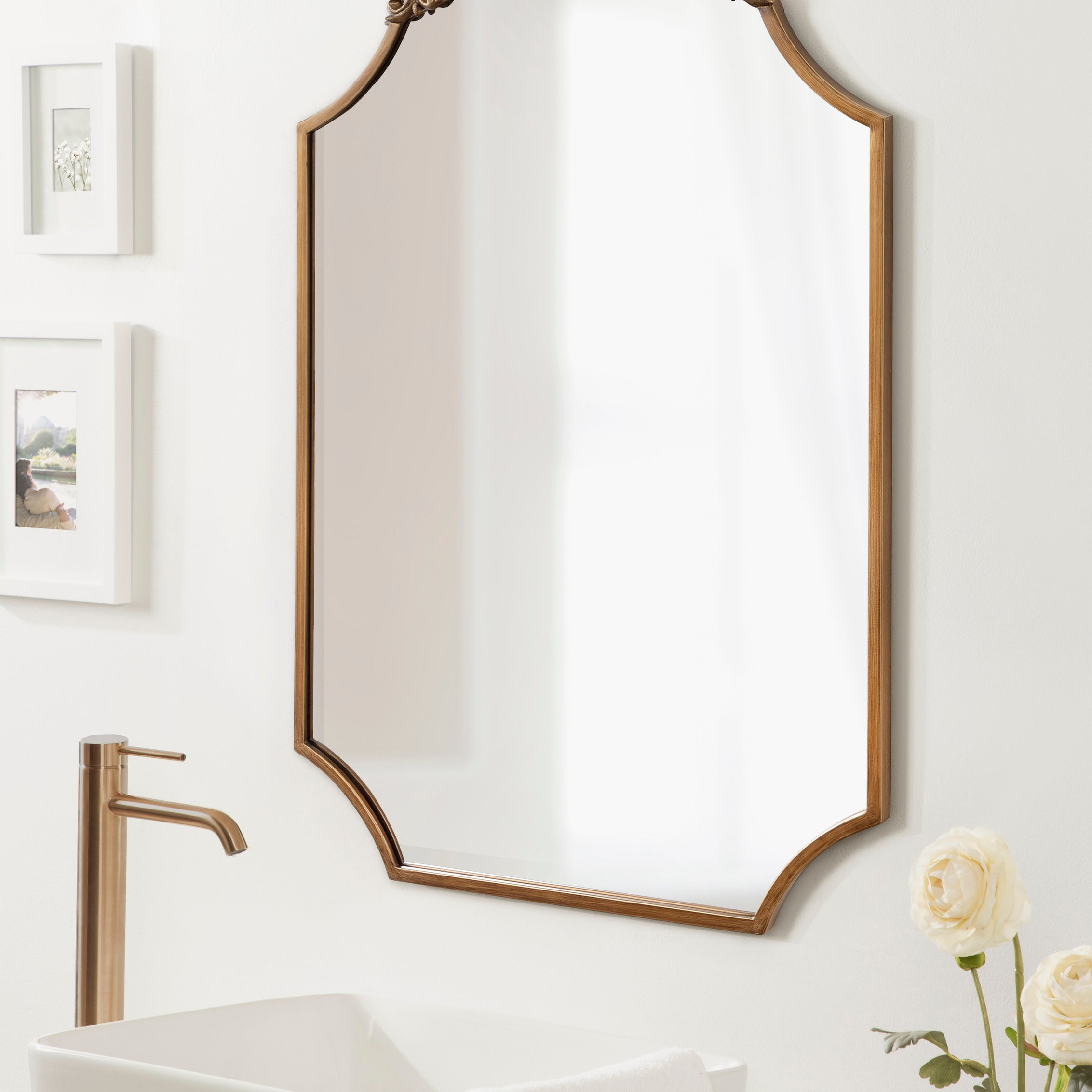 The Arendahl wall mirror is here to bring a brilliant and decadent accent to your traditional home decor. This wall mirror features a baroque-inspired design, with an ornate crown cascading down its beautiful frame. Due to its hand-finished craftsmanship, each piece may vary in appearance. Display the Arendahl mirror as a bathroom vanity mirror or a decorative focal point amongst your living room, entryway, or bedroom decor. Use this decadent wall mirror to bring dimension to your smaller spaces, opening up the area and illuminating the darker corners.