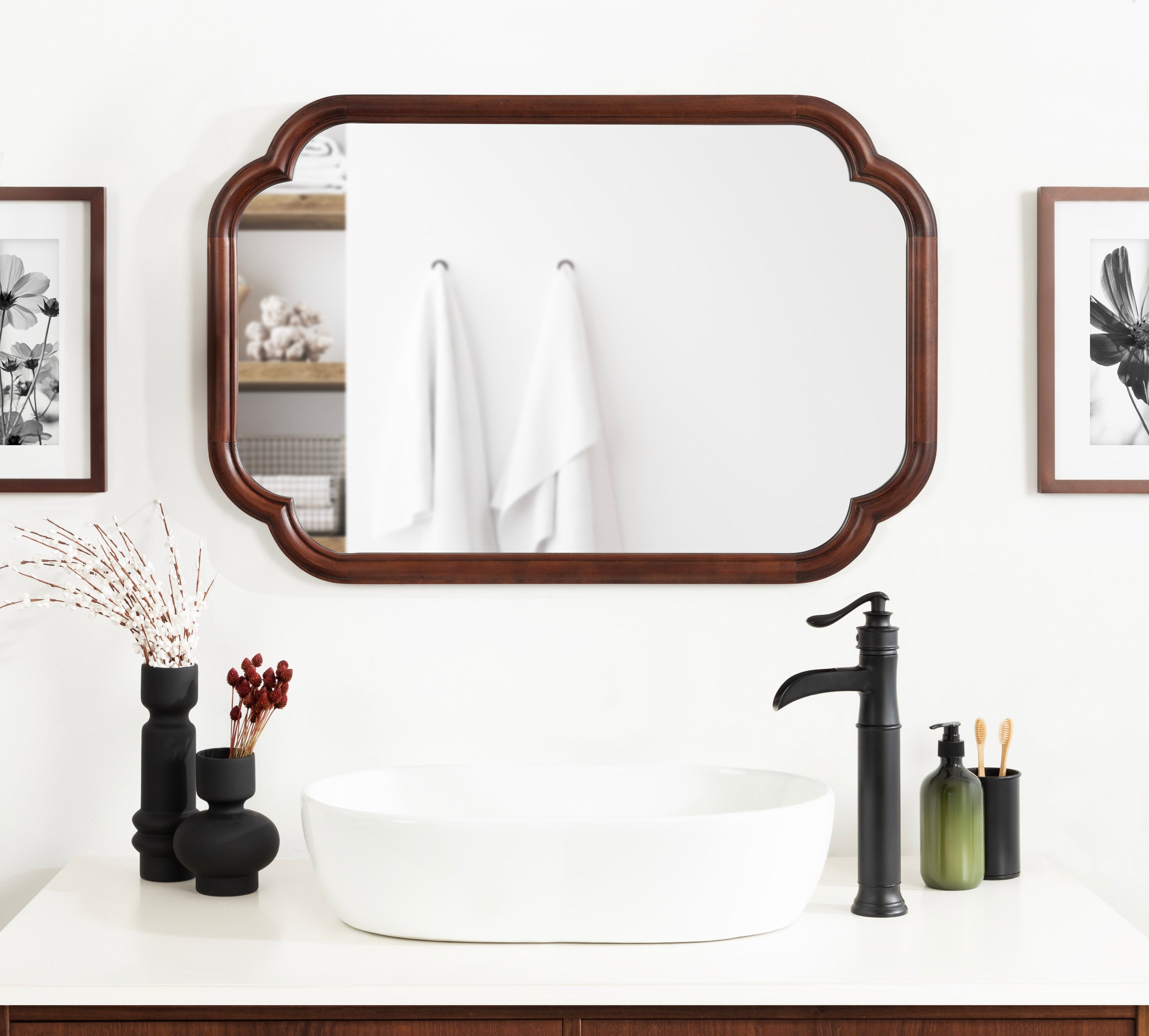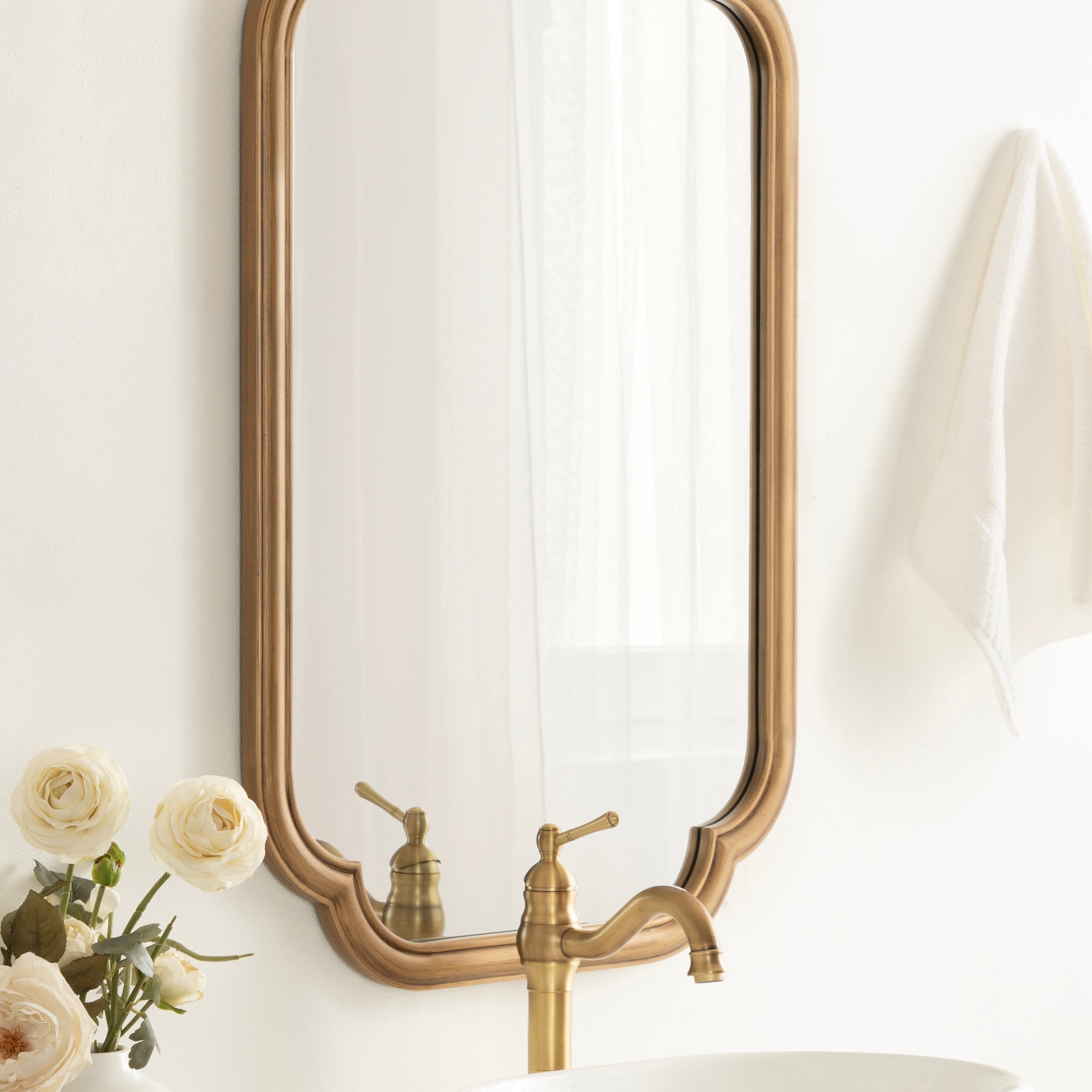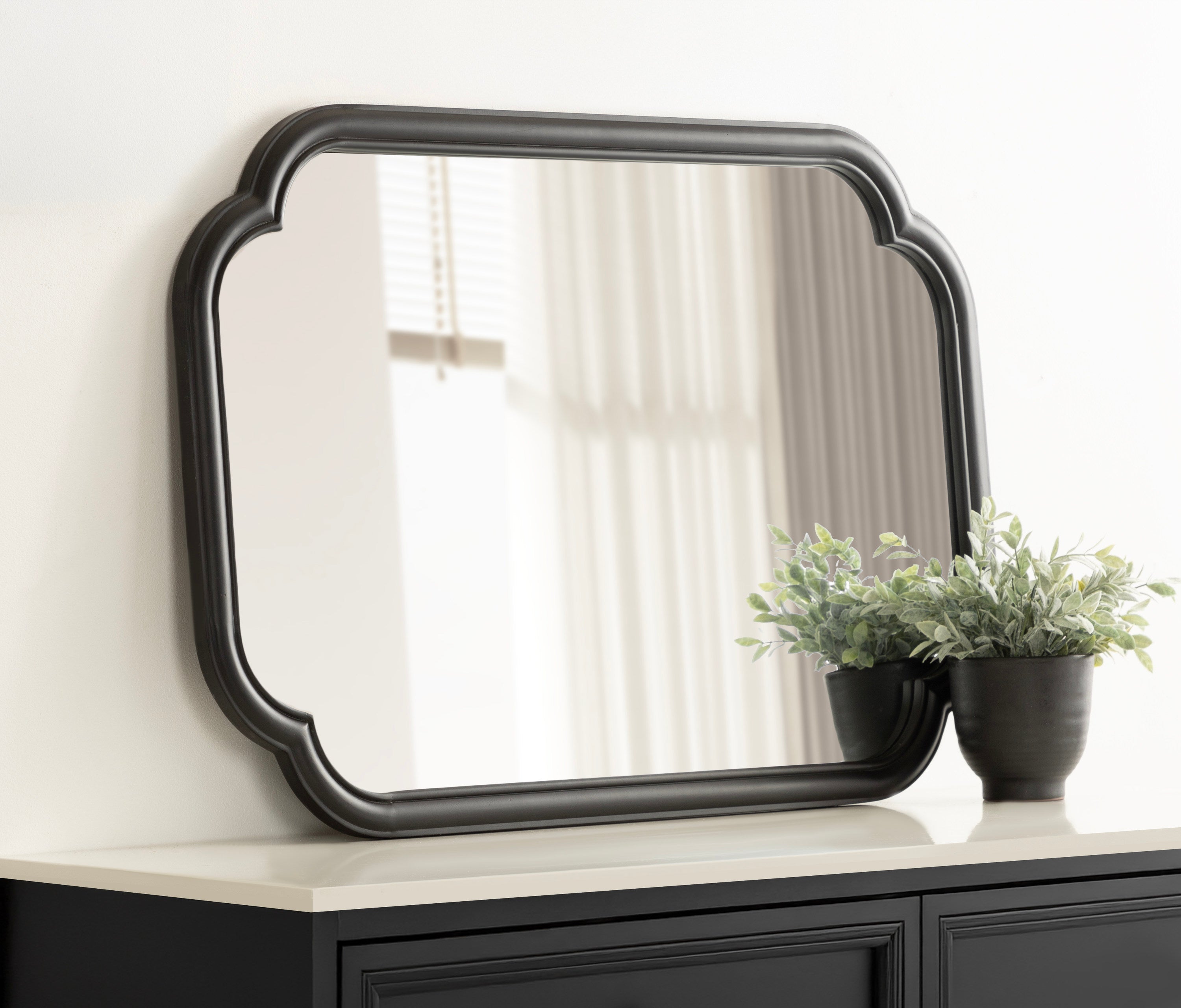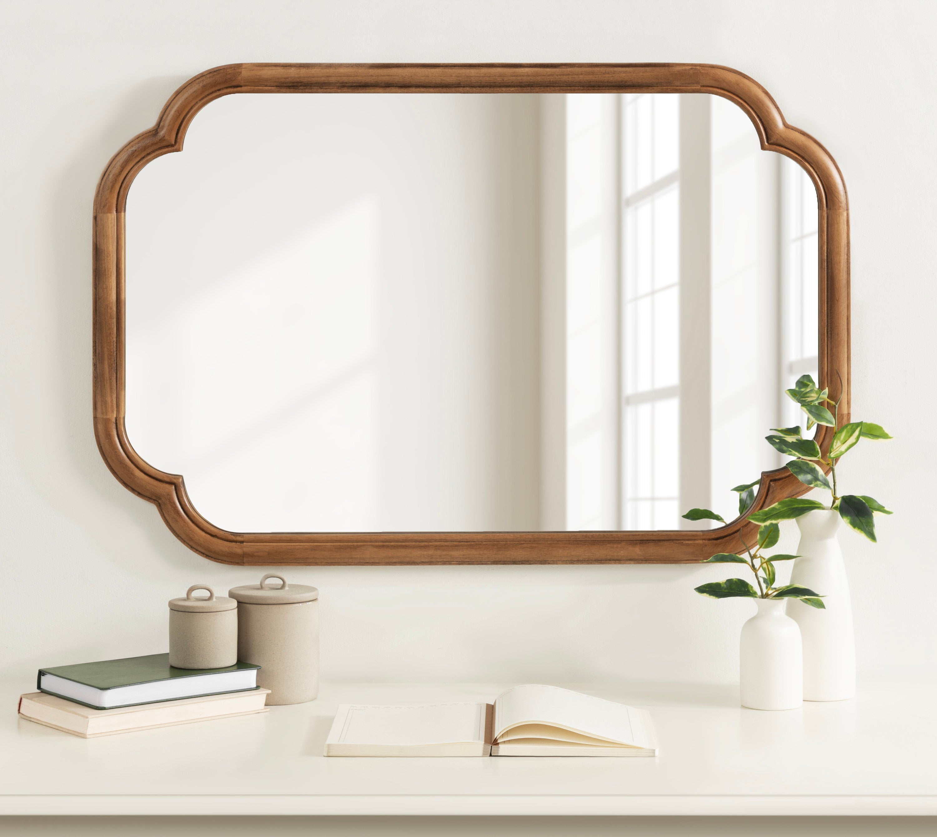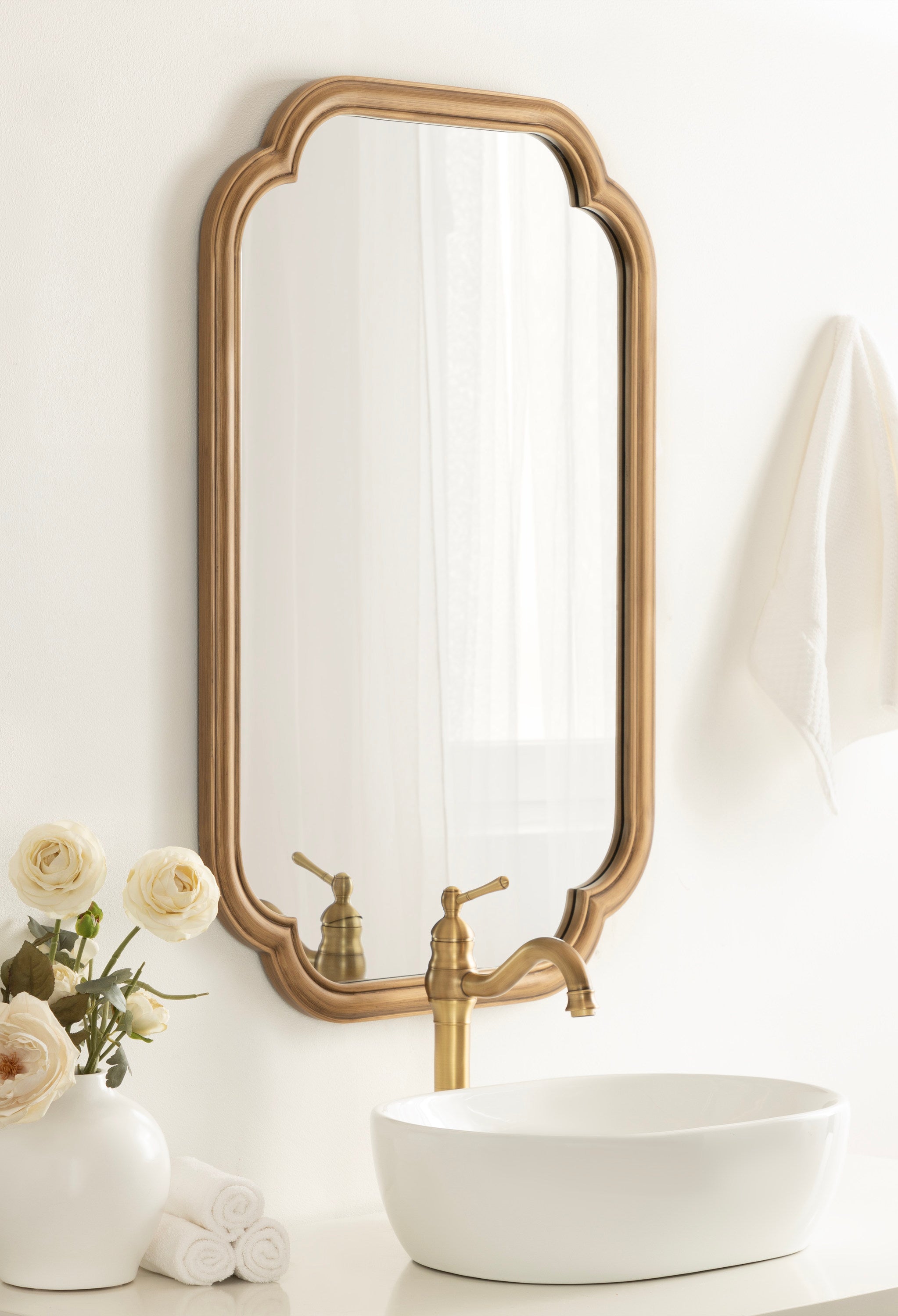 Elevate your bathroom decor with this charming scalloped wall mirror. Hang it anywhere throughout your home to fit your unique space and style. The rounded and stepped frame profile adds depth and dimension to the mirror, creating visual interest. With its attached D-ring hangers, this mirror is easy to install and will add a touch of sophistication to your bathroom. Add this mirror to your bathroom today and enjoy the beauty and functionality it brings to your space.