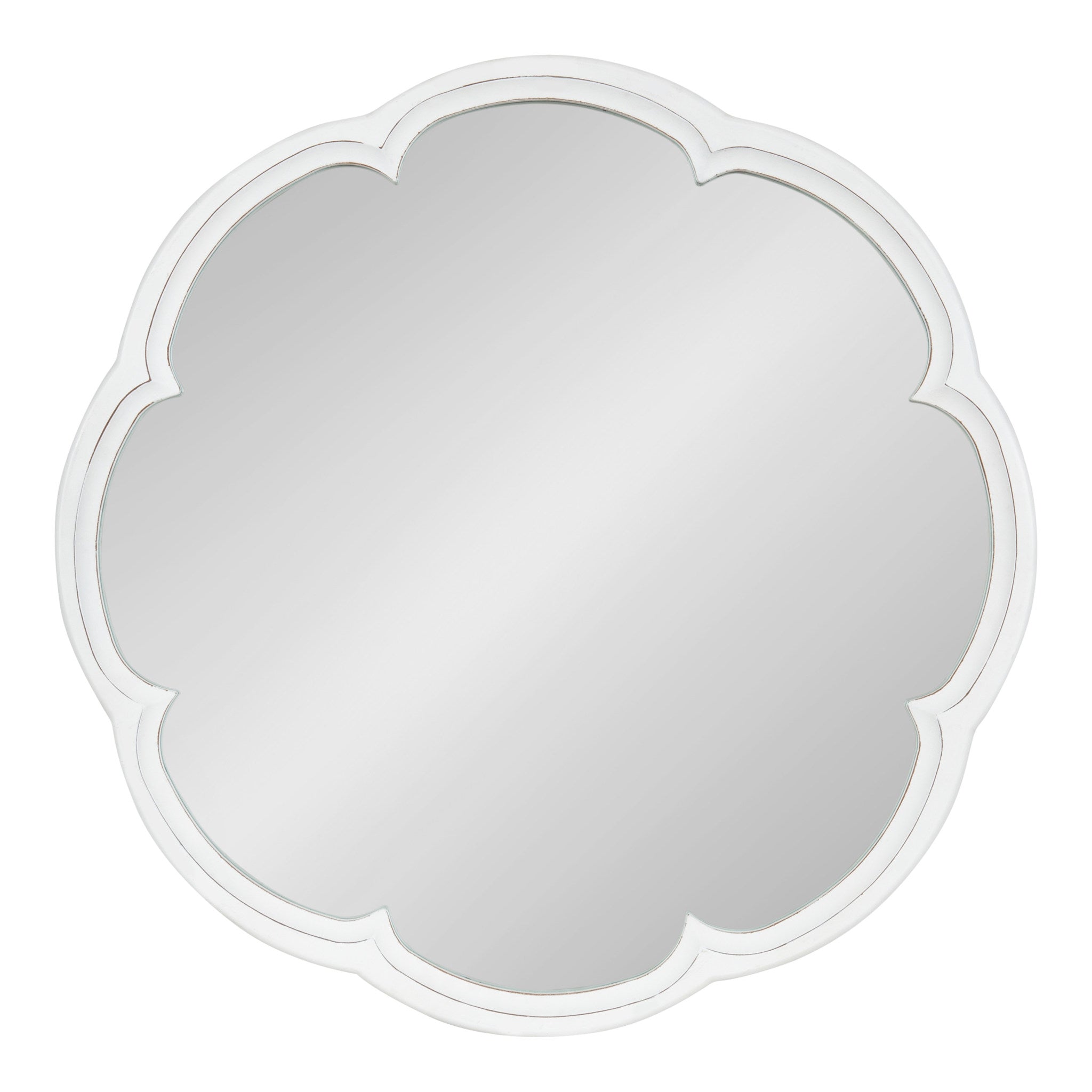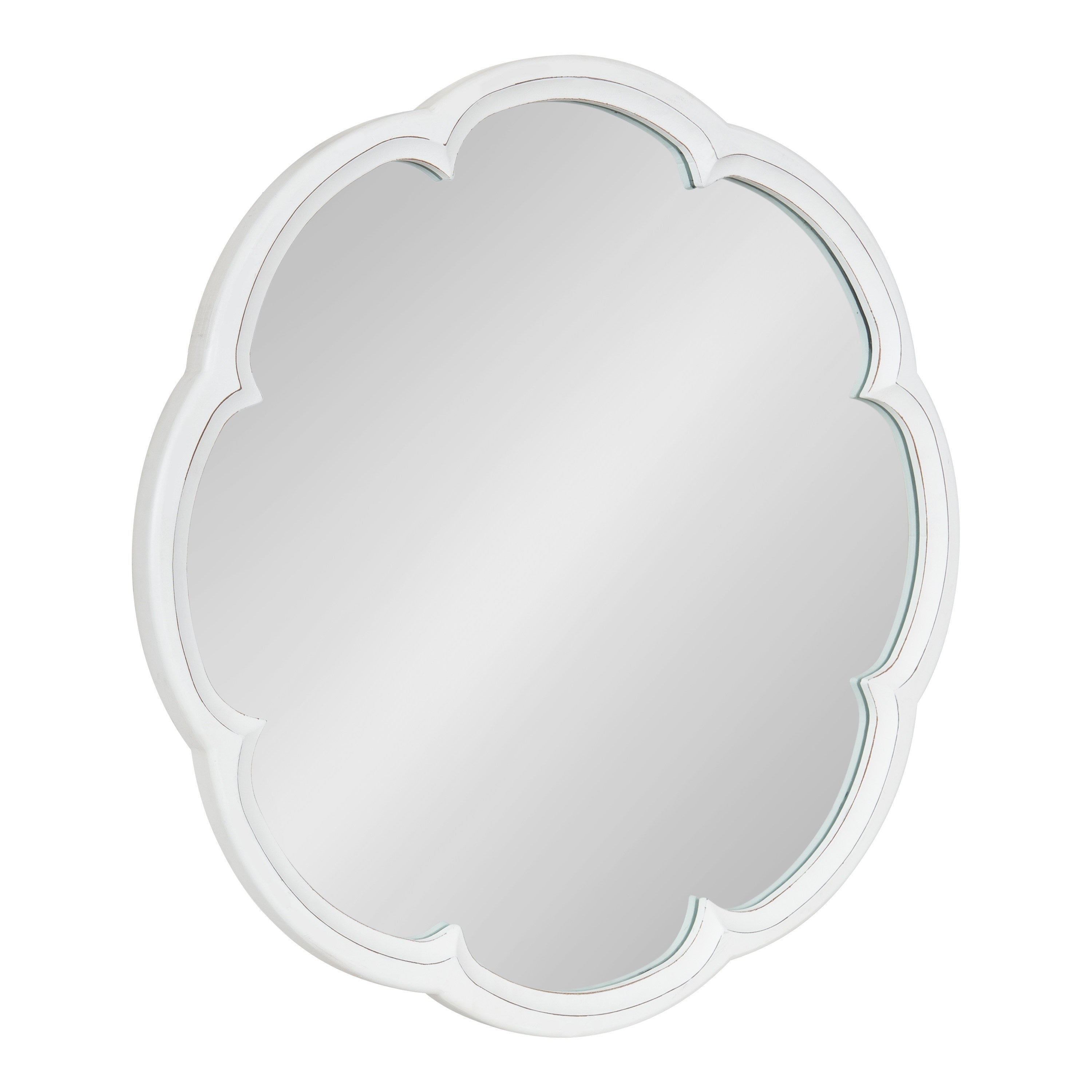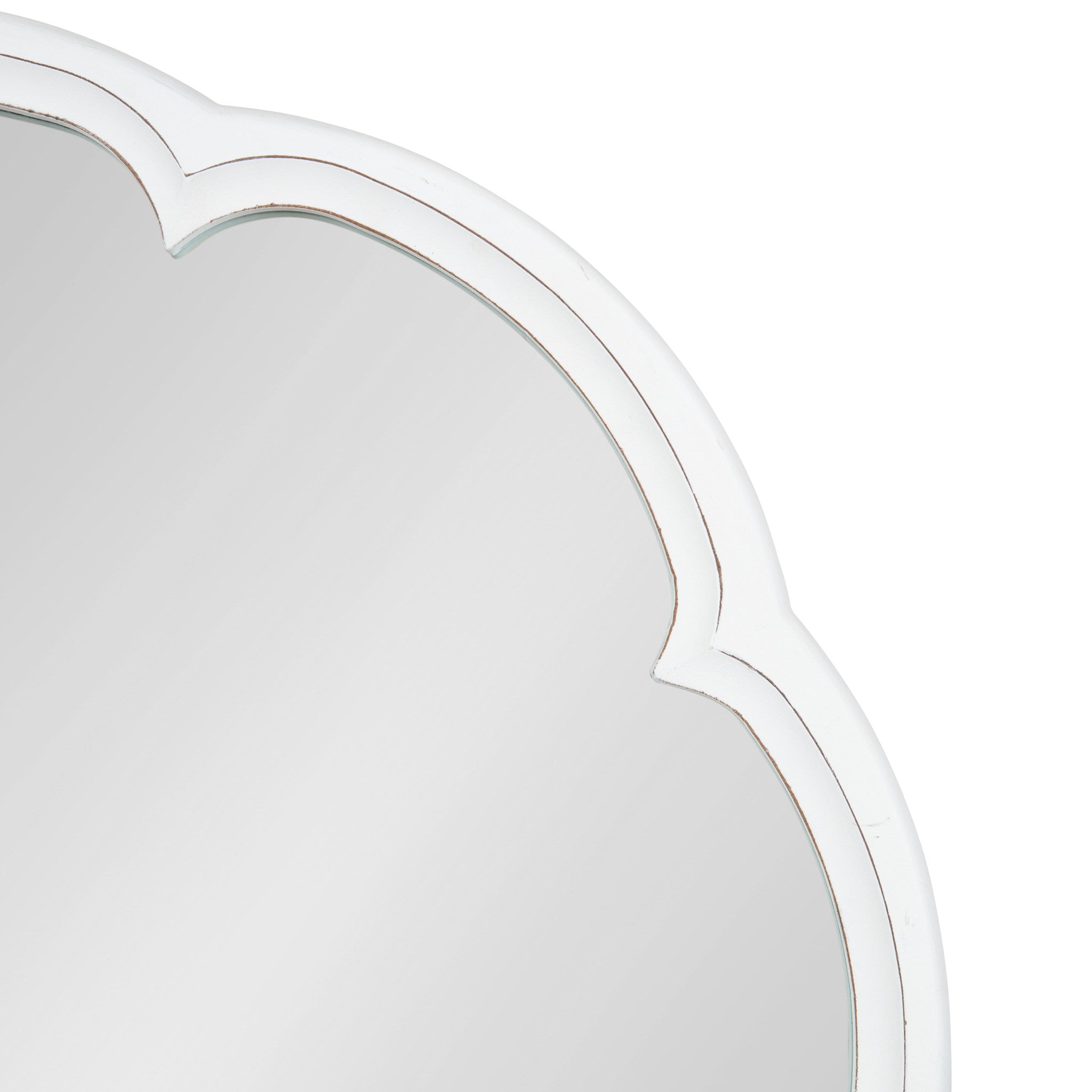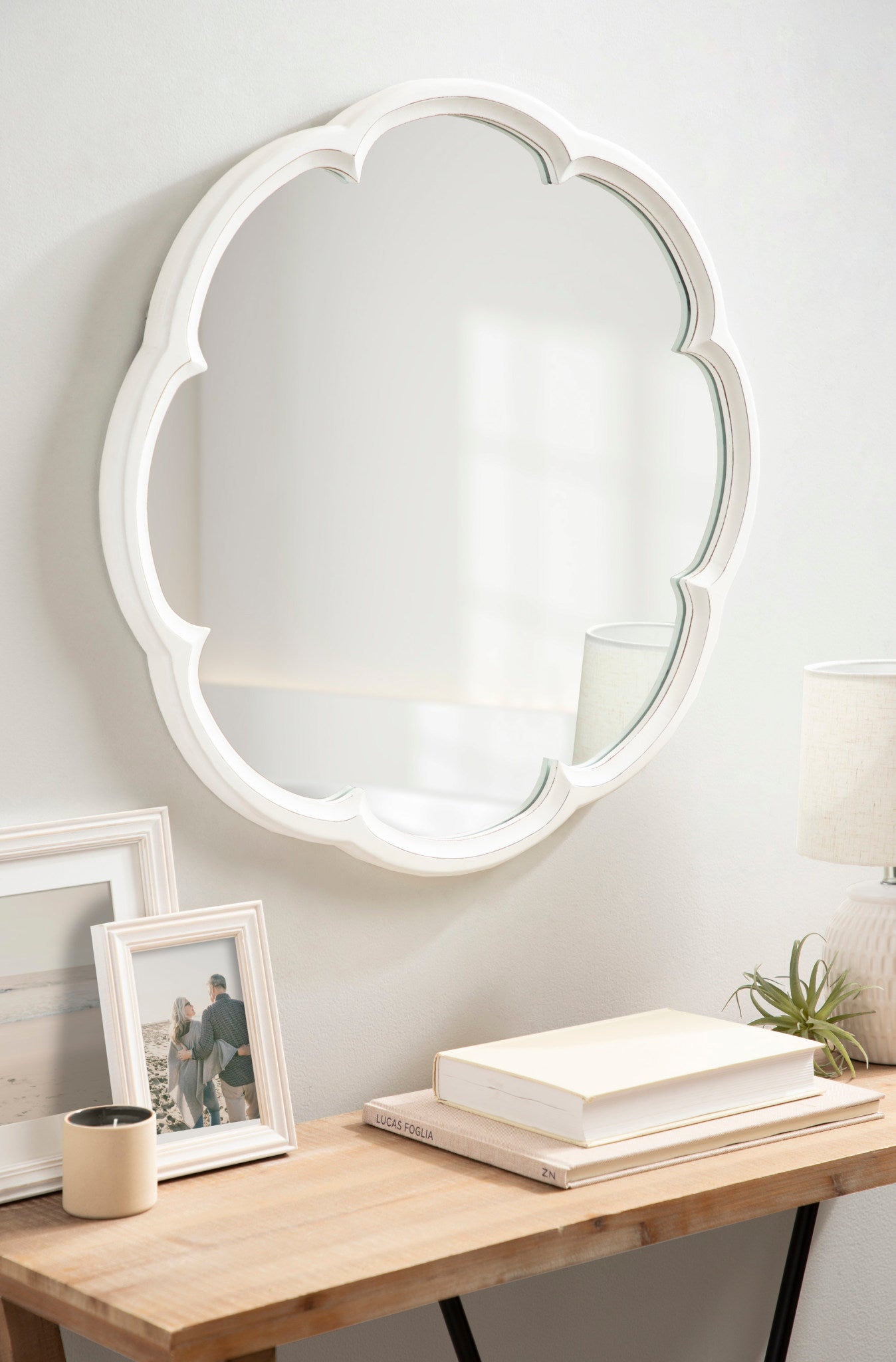Give your space a touch of coastal charm with this unique Maren round scalloped mirror. The Maren features soft, scalloped curves while maintaining a predominantly circular shape. The soft white color evokes a coastal vibe with a hint of rustic flair due to its light paint distressing along the frame. The diameter of the mirror is 26 inches with a frame profile depth of 1.5 inches. This makes the Maren a widely versatile size for many uses and spaces. From a bathroom vanity mirror to a makeup desk mirror, the Maren is the perfect size for these and other uses.