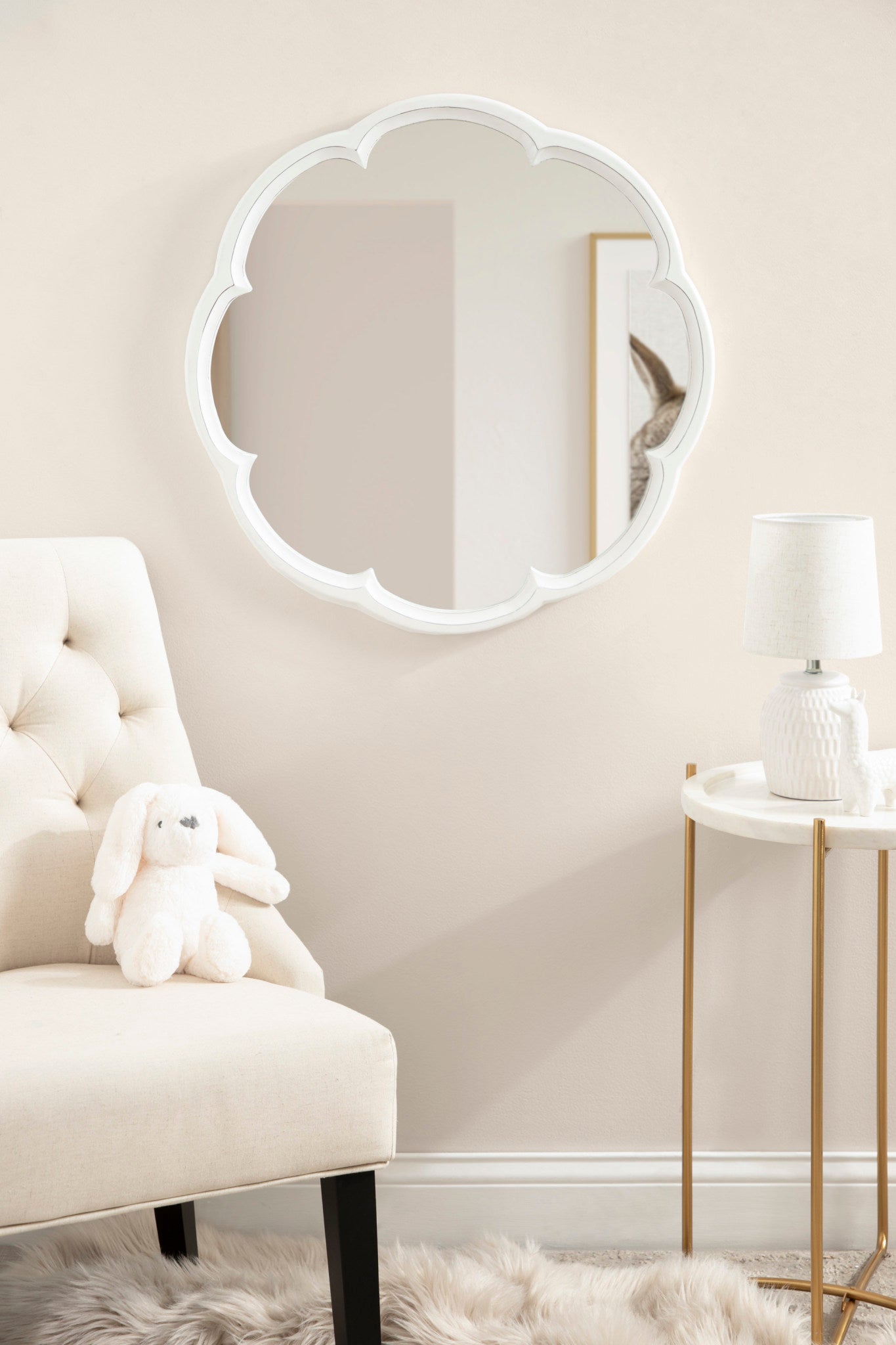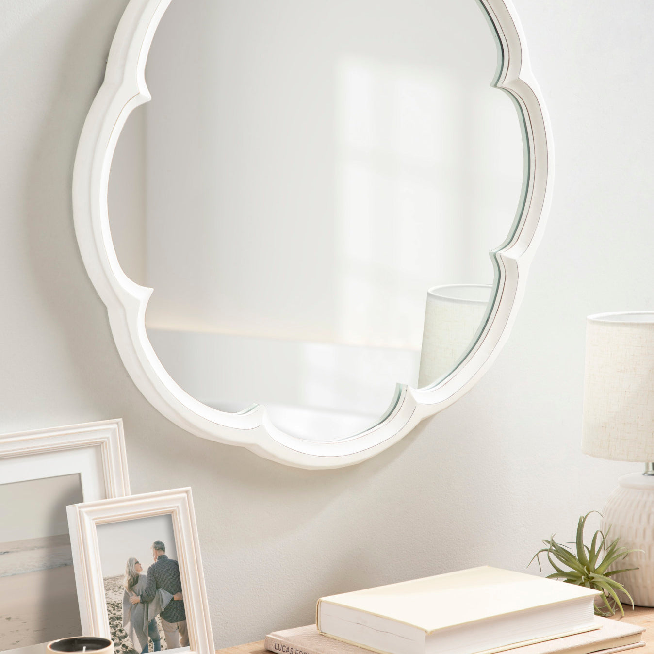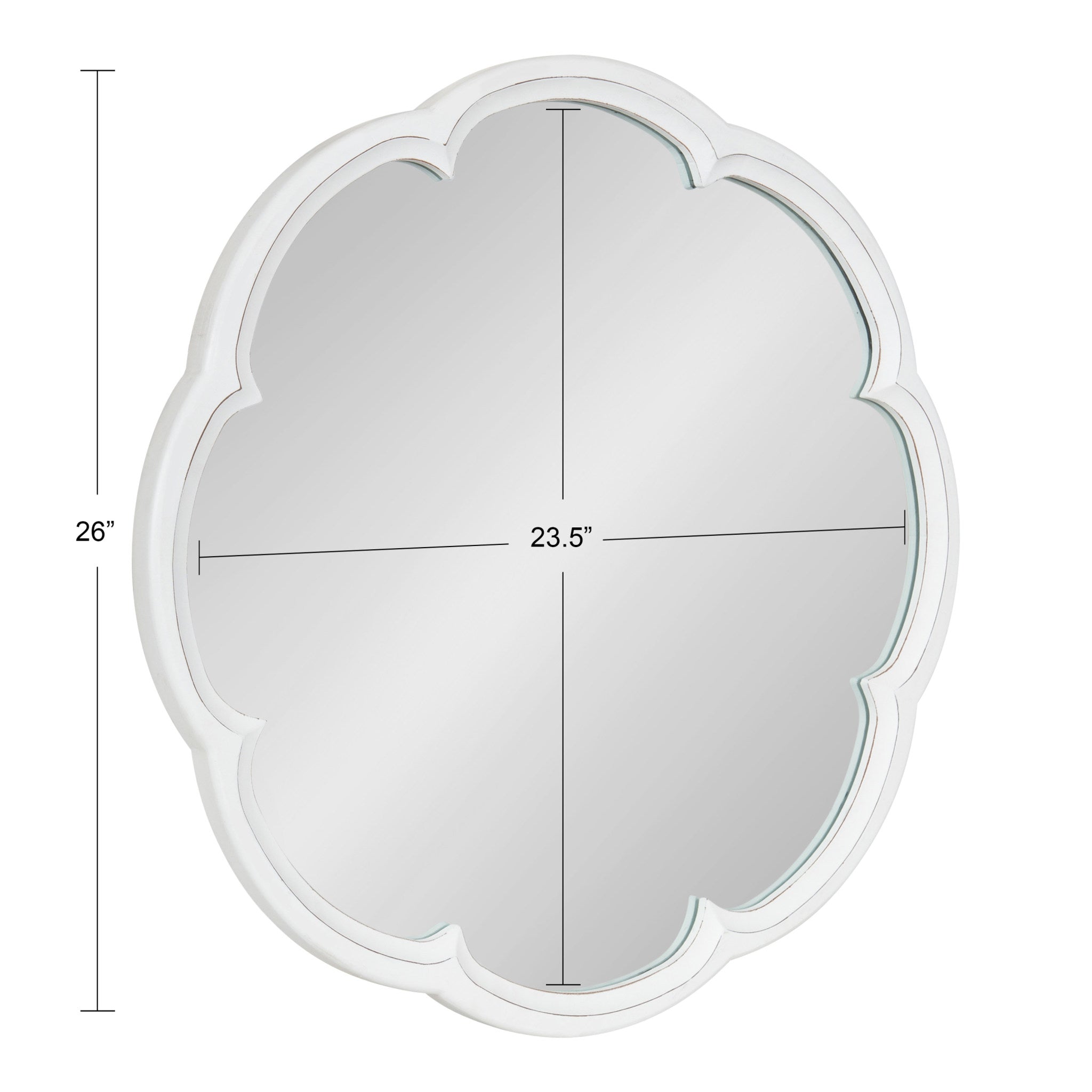 Give your space a touch of coastal charm with this unique Maren round scalloped mirror. The Maren features soft, scalloped curves while maintaining a predominantly circular shape. The soft white color evokes a coastal vibe with a hint of rustic flair due to its light paint distressing along the frame. The diameter of the mirror is 26 inches with a frame profile depth of 1.5 inches. This makes the Maren a widely versatile size for many uses and spaces. From a bathroom vanity mirror to a makeup desk mirror, the Maren is the perfect size for these and other uses.