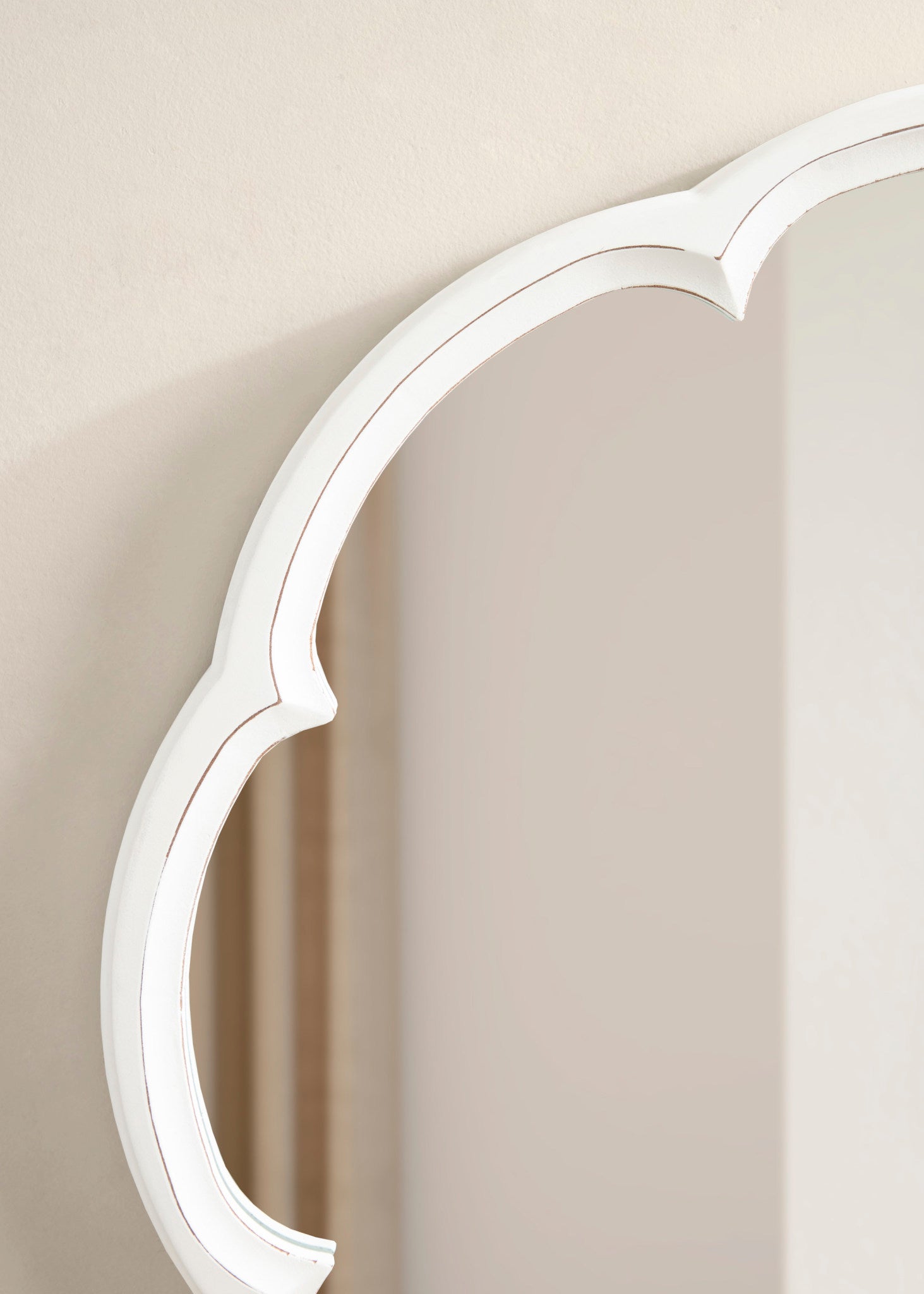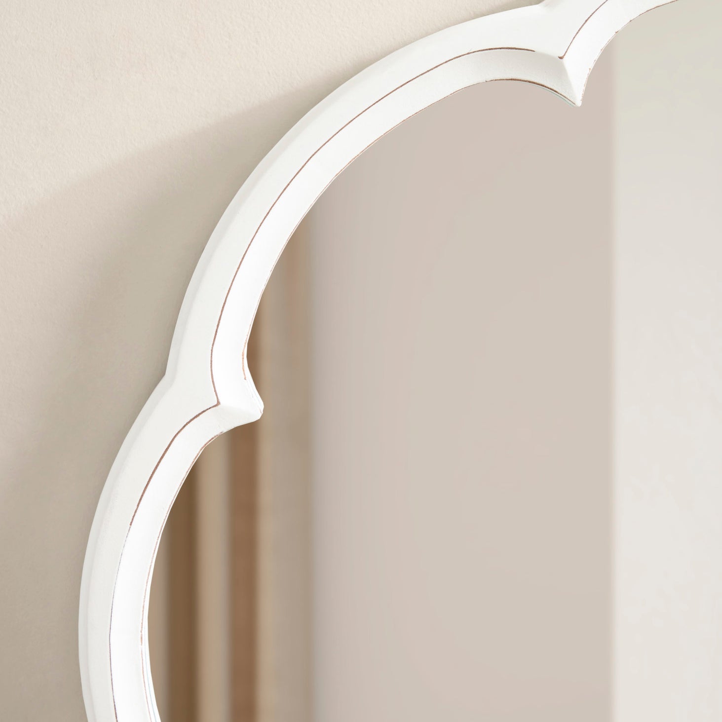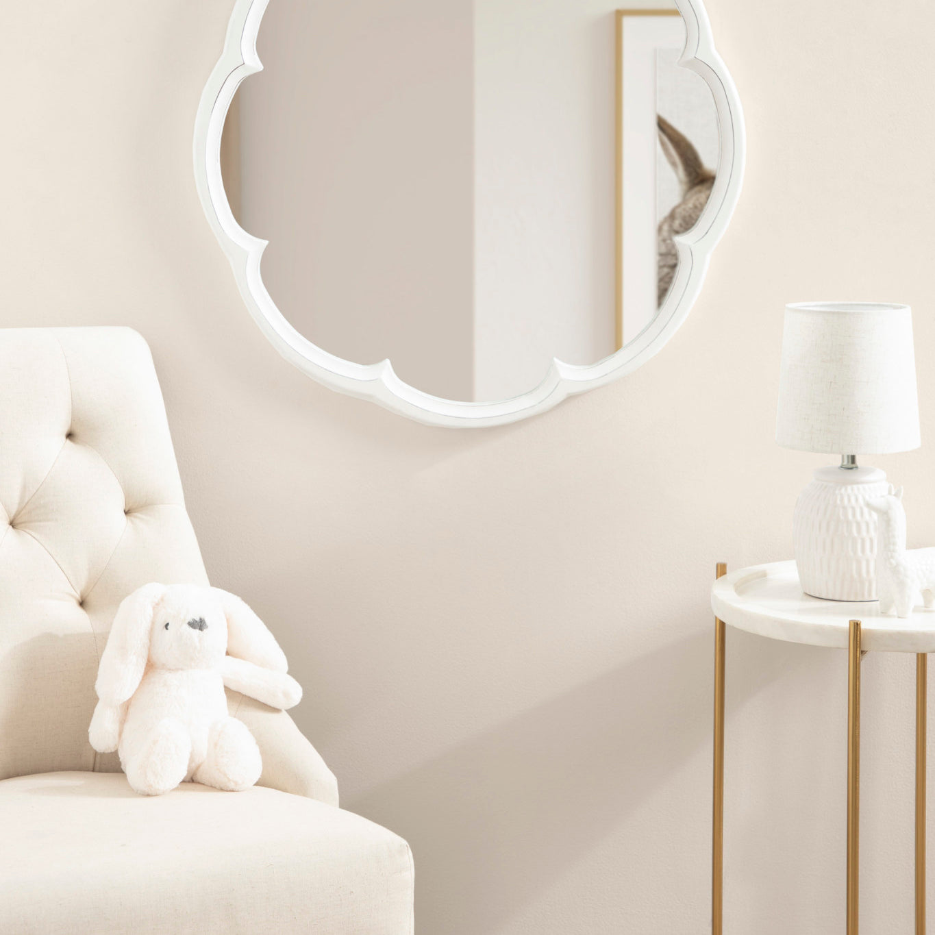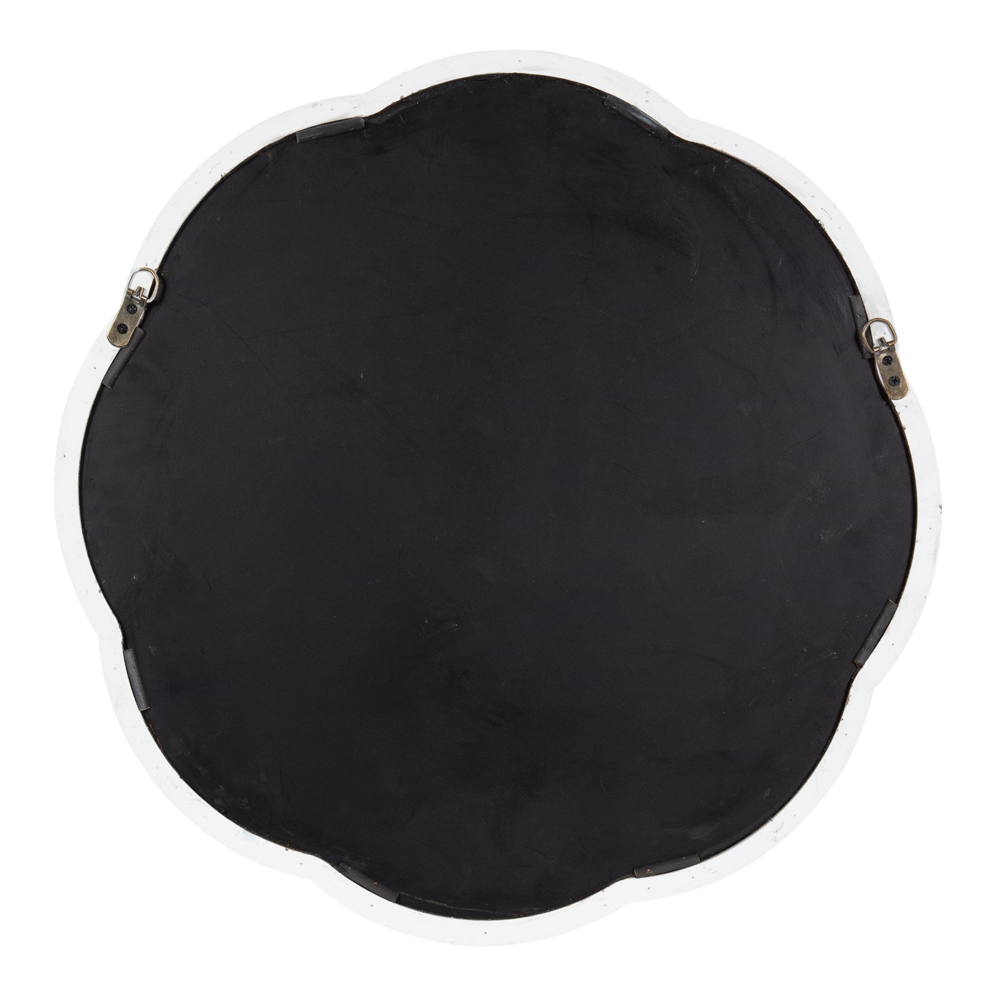 Give your space a touch of coastal charm with this unique Maren round scalloped mirror. The Maren features soft, scalloped curves while maintaining a predominantly circular shape. The soft white color evokes a coastal vibe with a hint of rustic flair due to its light paint distressing along the frame. The diameter of the mirror is 26 inches with a frame profile depth of 1.5 inches. This makes the Maren a widely versatile size for many uses and spaces. From a bathroom vanity mirror to a makeup desk mirror, the Maren is the perfect size for these and other uses.