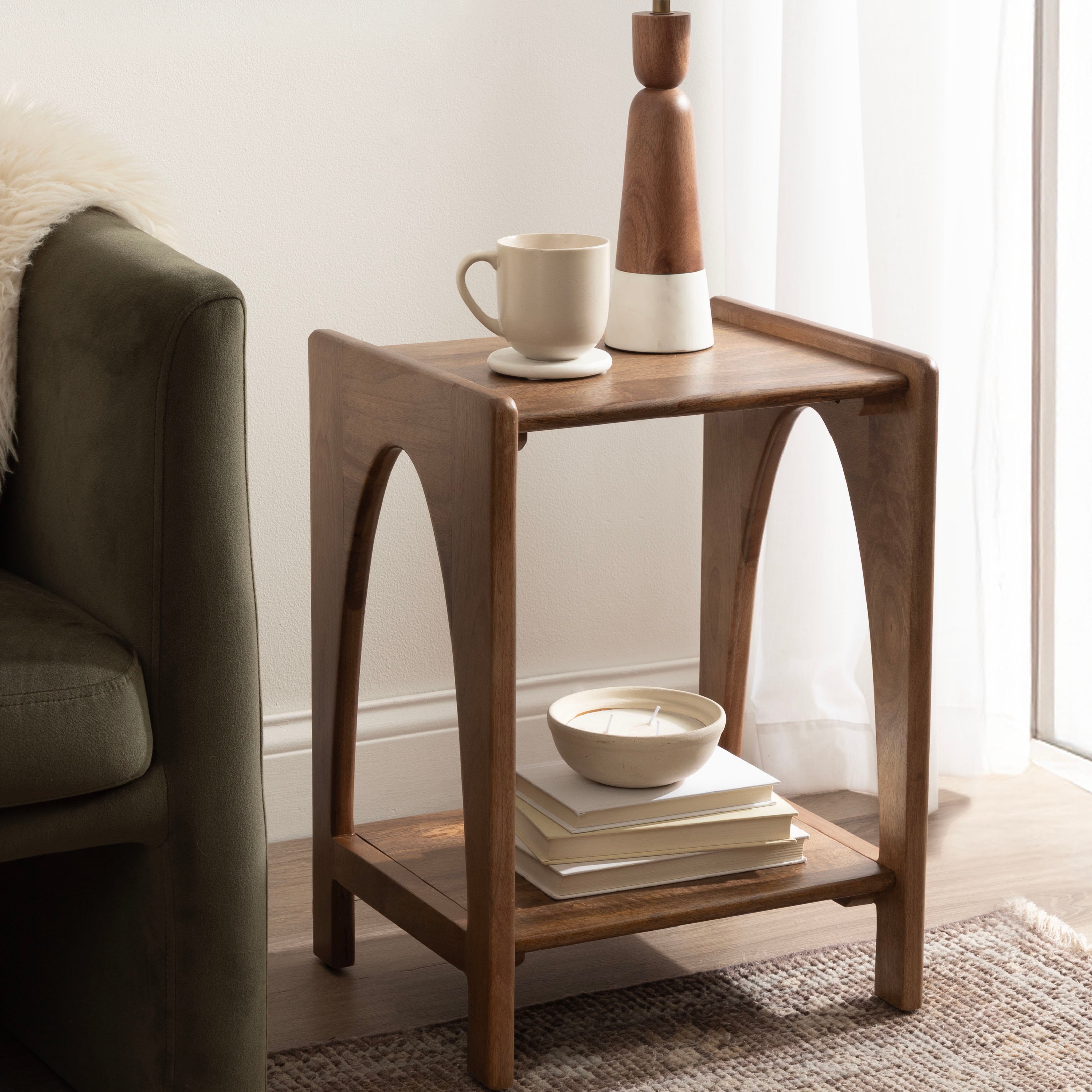 Blend your love of modern style with a dash of transitional functionality with the Aarstad side table. This rectangular table embraces a classic, uncomplicated design with its unique table shape and soft bullnosed edges. Skilled artisans craft the Aarstad by hand, and due to this careful, delicate crafting, each piece is one-of-a-kind in finish and woodgrain. It is made of 100% solid mango wood for a table that looks and feels rich and high-quality. It not only looks good; however, it also features two tiers of mango wood that can serve various purposes throughout your home. It is a perfect pairing next to a sofa, by your bed, or flanking your entryway. Assembly for this minimal table takes a matter of minutes with a simple 3-step process will have your new end table ready in no time.