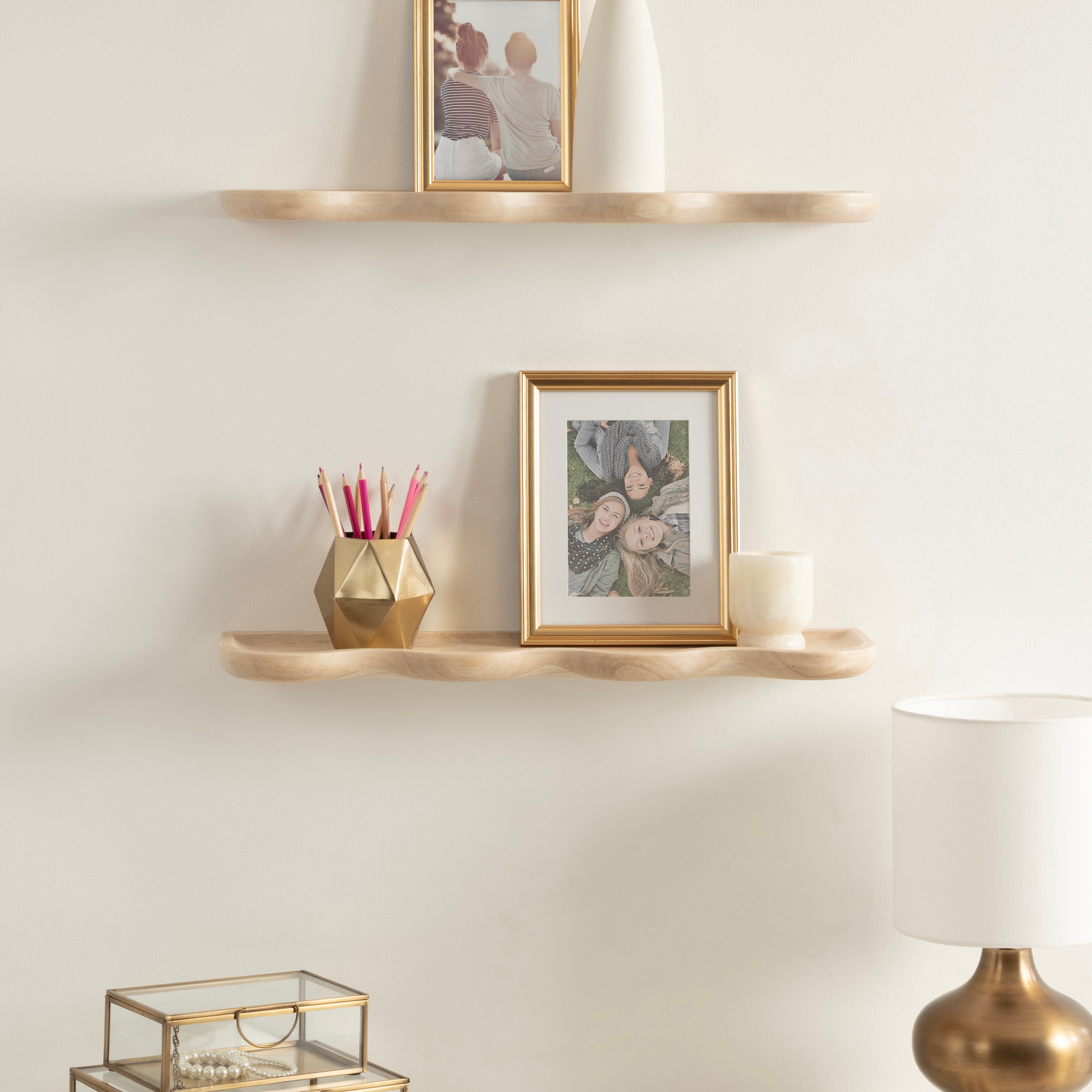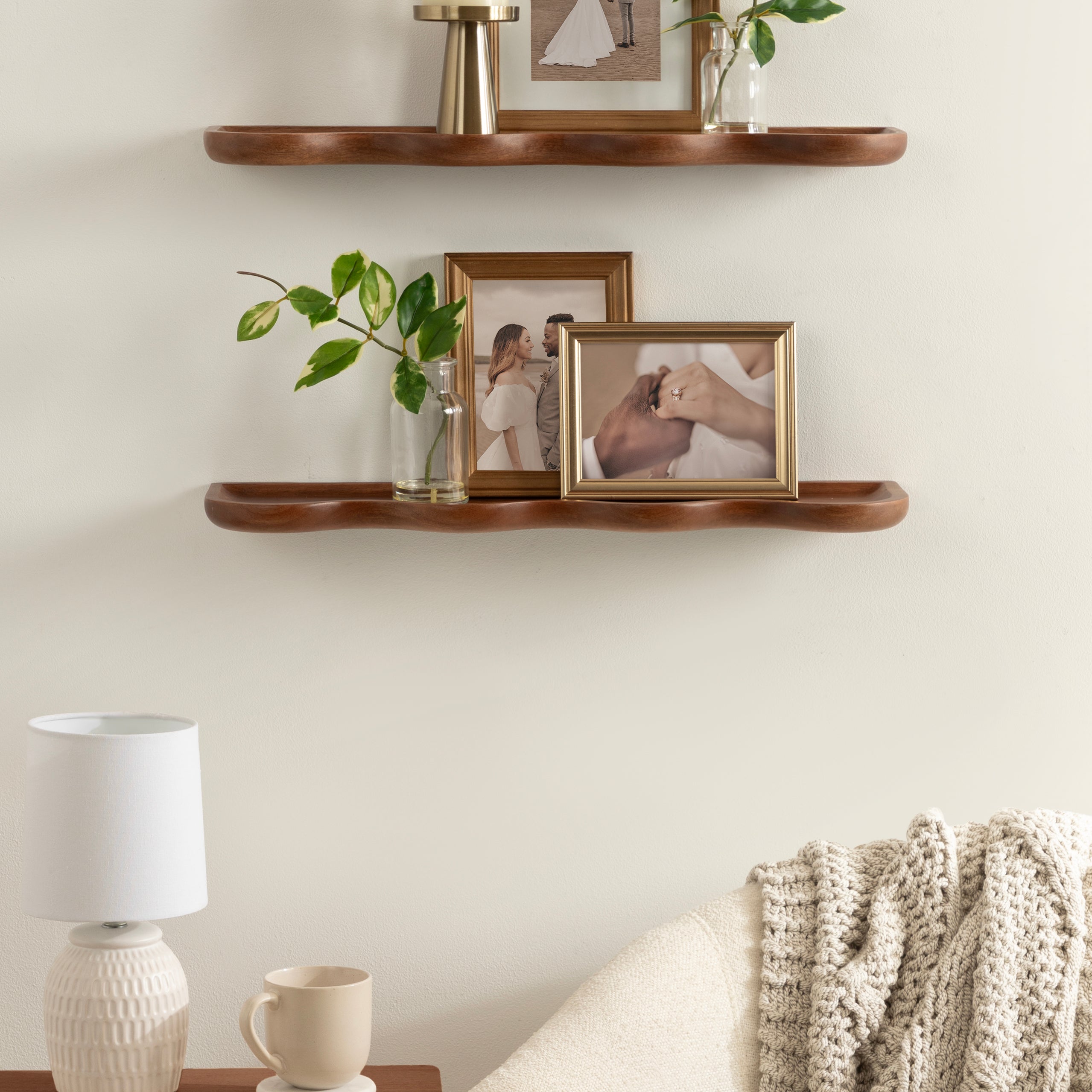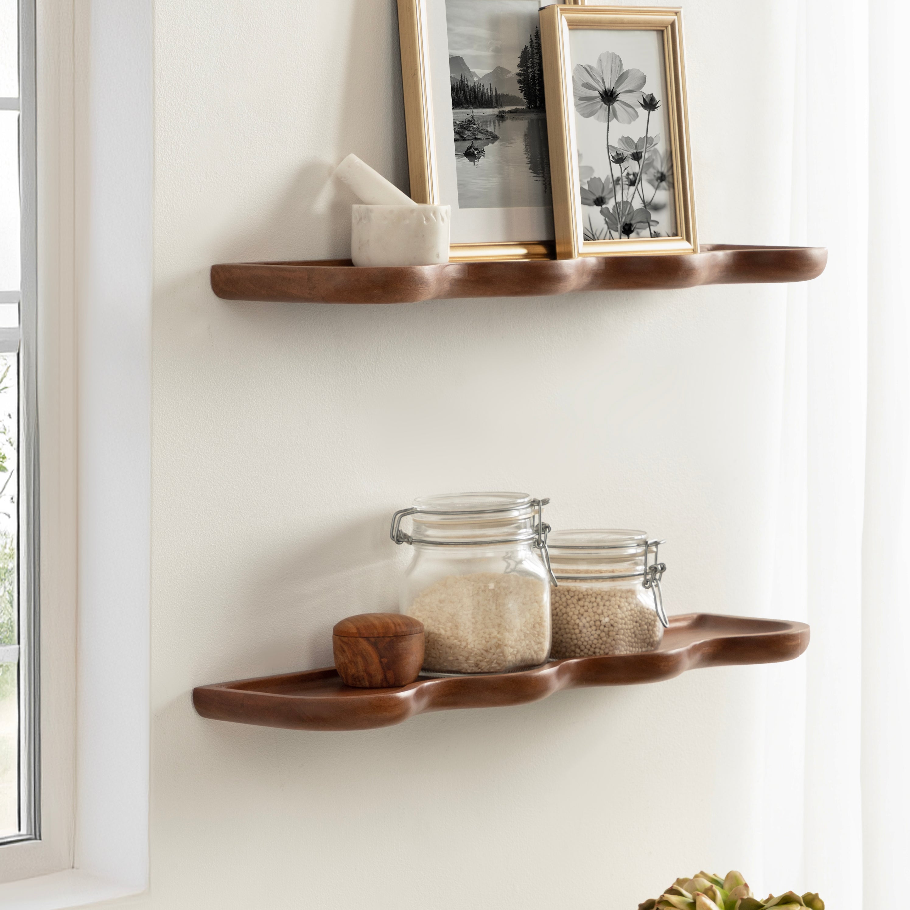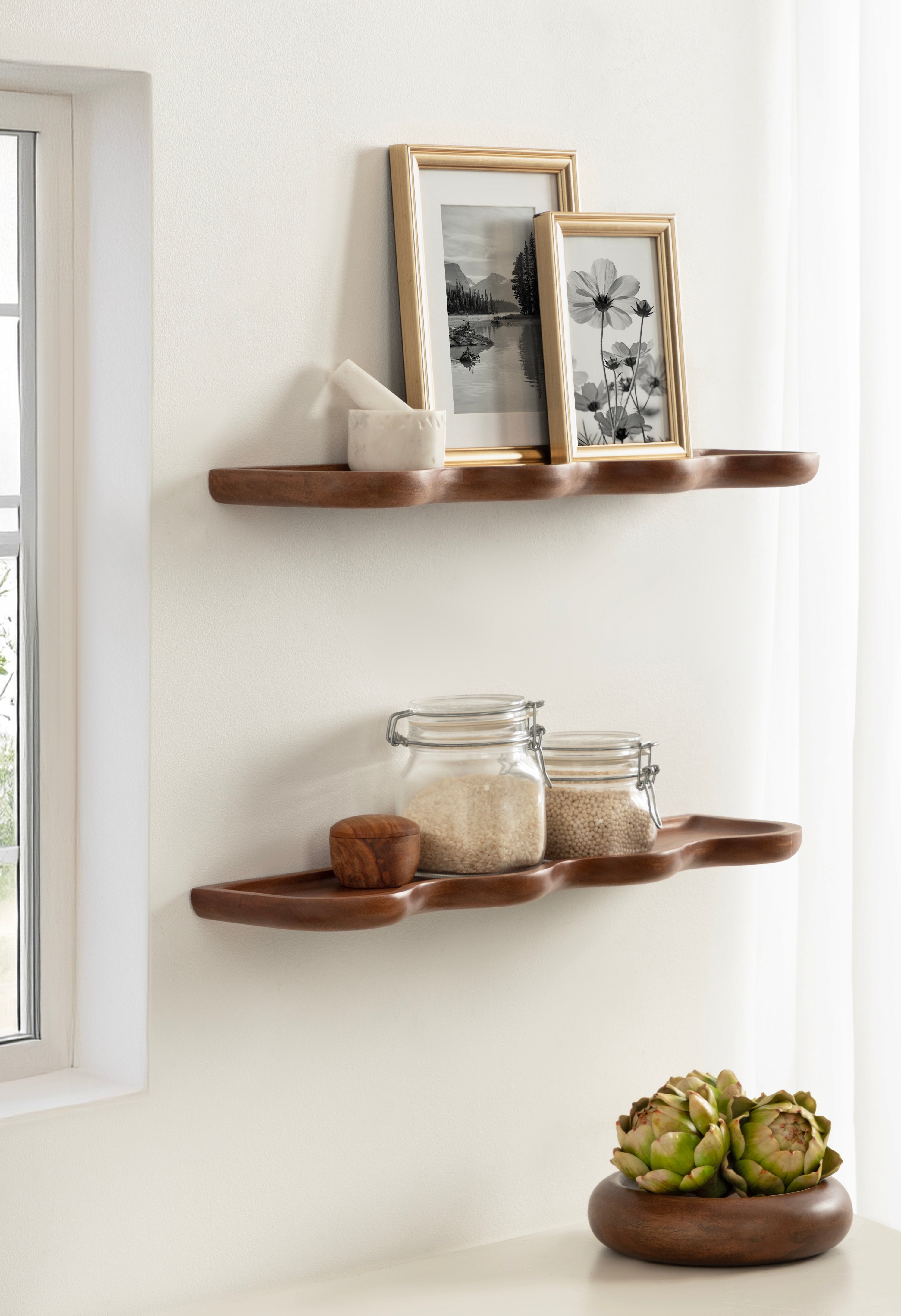 Inspire your inner interior decorator with these functional and beautiful floating shelves. Inspired by wavy curvature and convenient design, the Alezar wall shelves combine modern aesthetics with practical function. These shelves were made from solid mango wood, giving them an elevated quality and appearance. Setting it apart from a standard floating shelf, these shelves boast a youthful scalloped shape that adds a bit of character. Each Alezar shelf has a five-pound weight capacity, giving you the opportunity to store dessert plates and mugs, showcase delightful succulents, or house your favorite keepsakes and media. The two Alezar shelves hang in just a matter of minutes with the convenient hanging brackets that attach directly to the wall for a floating effect.