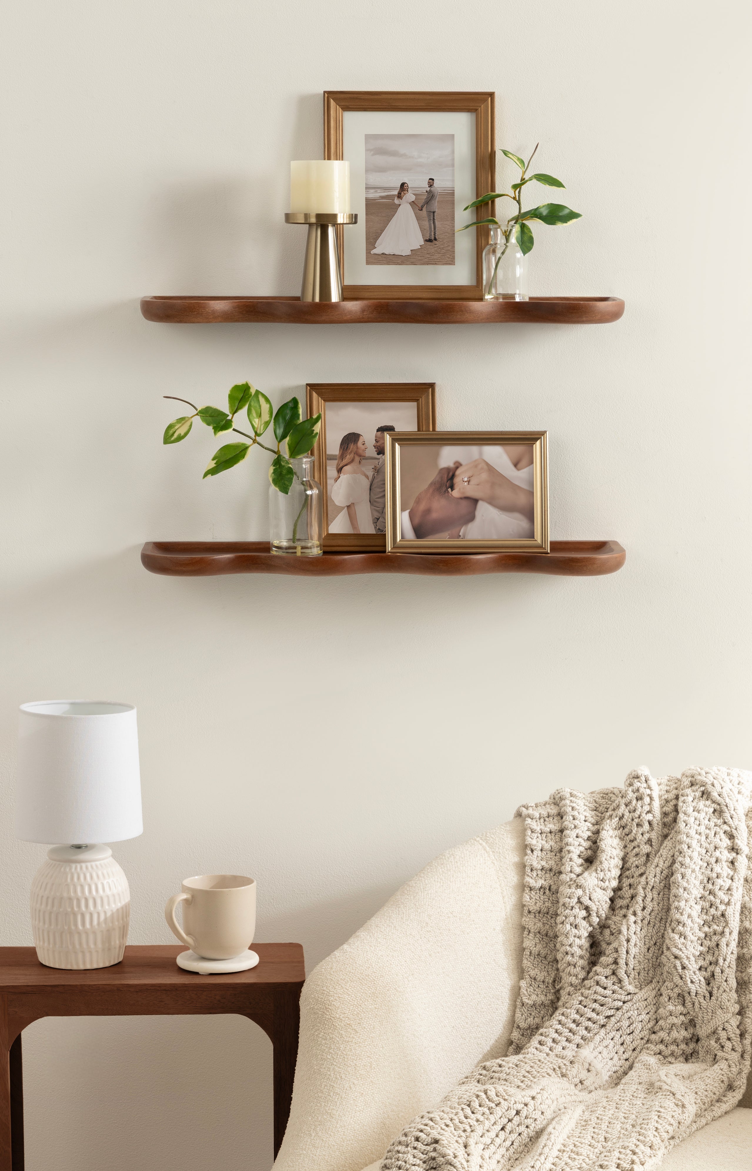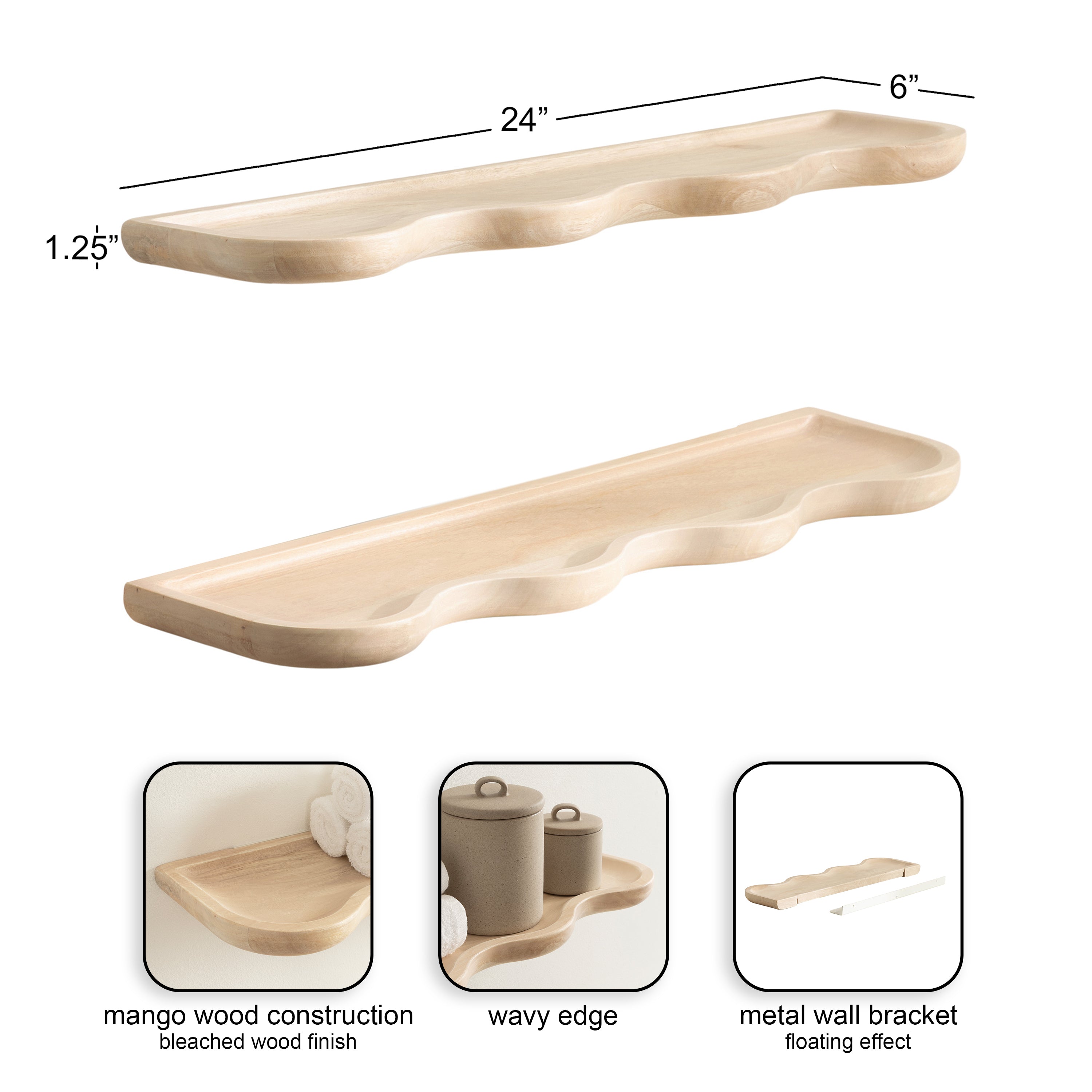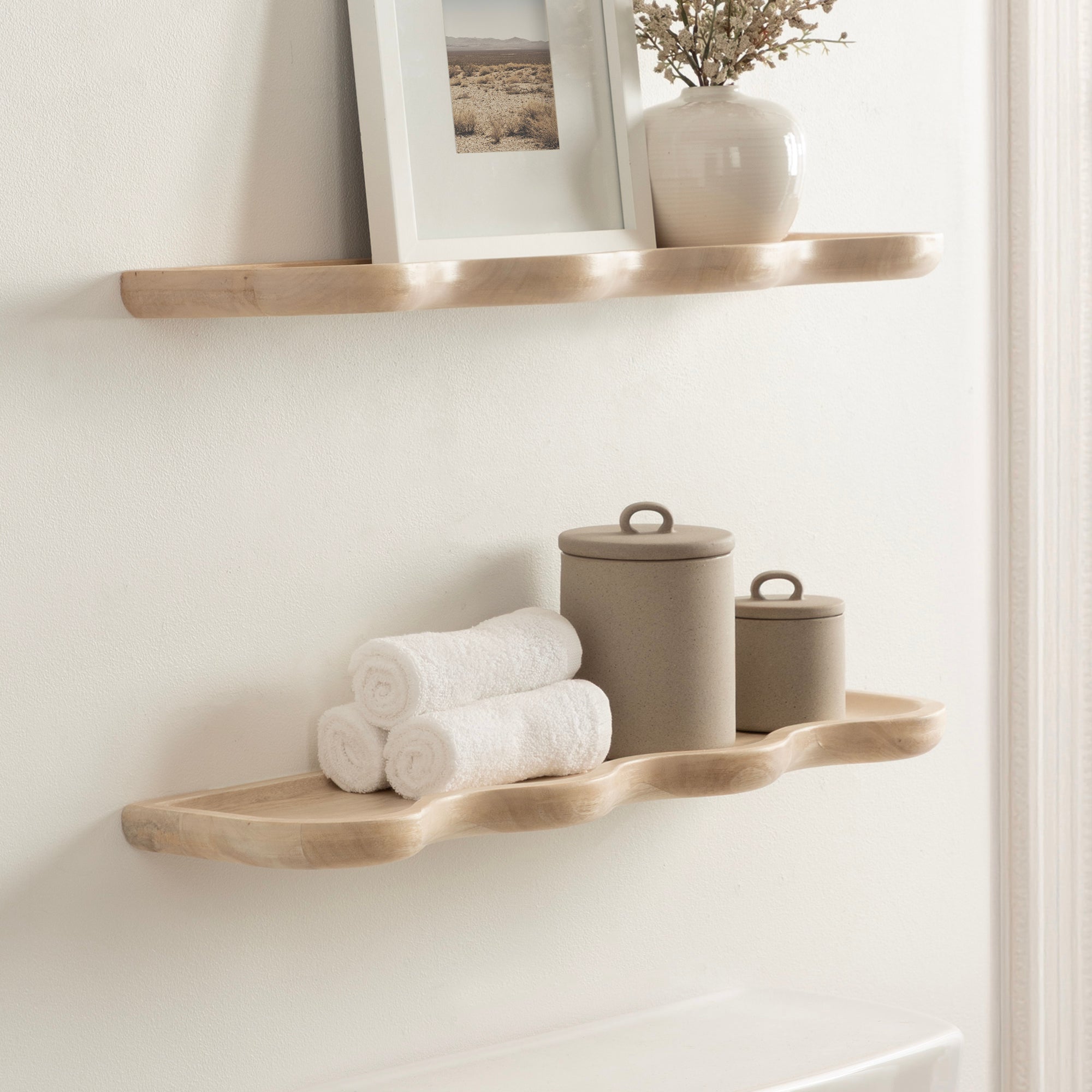 Inspire your inner interior decorator with these functional and beautiful floating shelves. Inspired by wavy curvature and convenient design, the Alezar wall shelves combine modern aesthetics with practical function. These shelves were made from solid mango wood, giving them an elevated quality and appearance. Setting it apart from a standard floating shelf, these shelves boast a youthful scalloped shape that adds a bit of character. Each Alezar shelf has a five-pound weight capacity, giving you the opportunity to store dessert plates and mugs, showcase delightful succulents, or house your favorite keepsakes and media. The two Alezar shelves hang in just a matter of minutes with the convenient hanging brackets that attach directly to the wall for a floating effect.