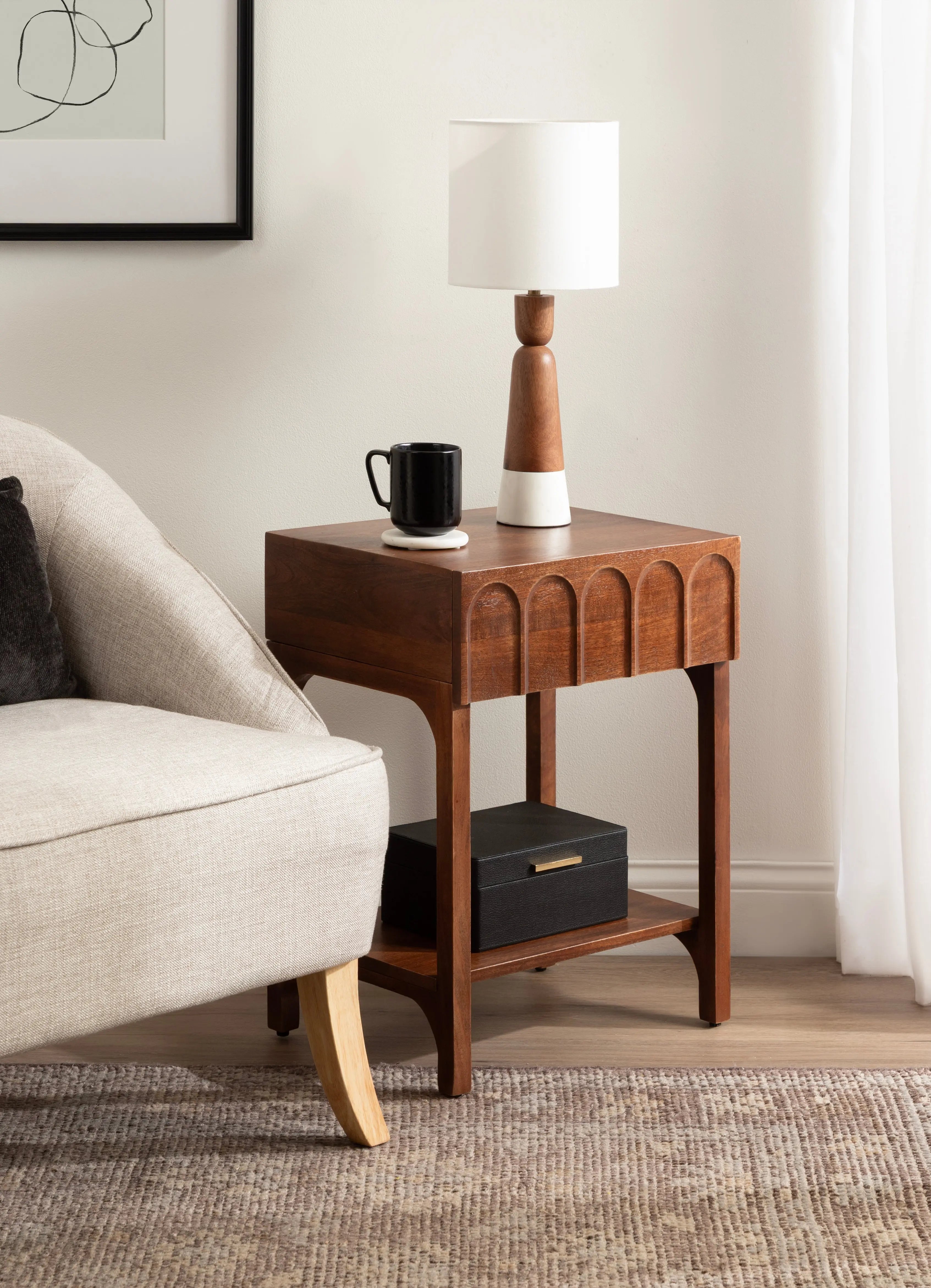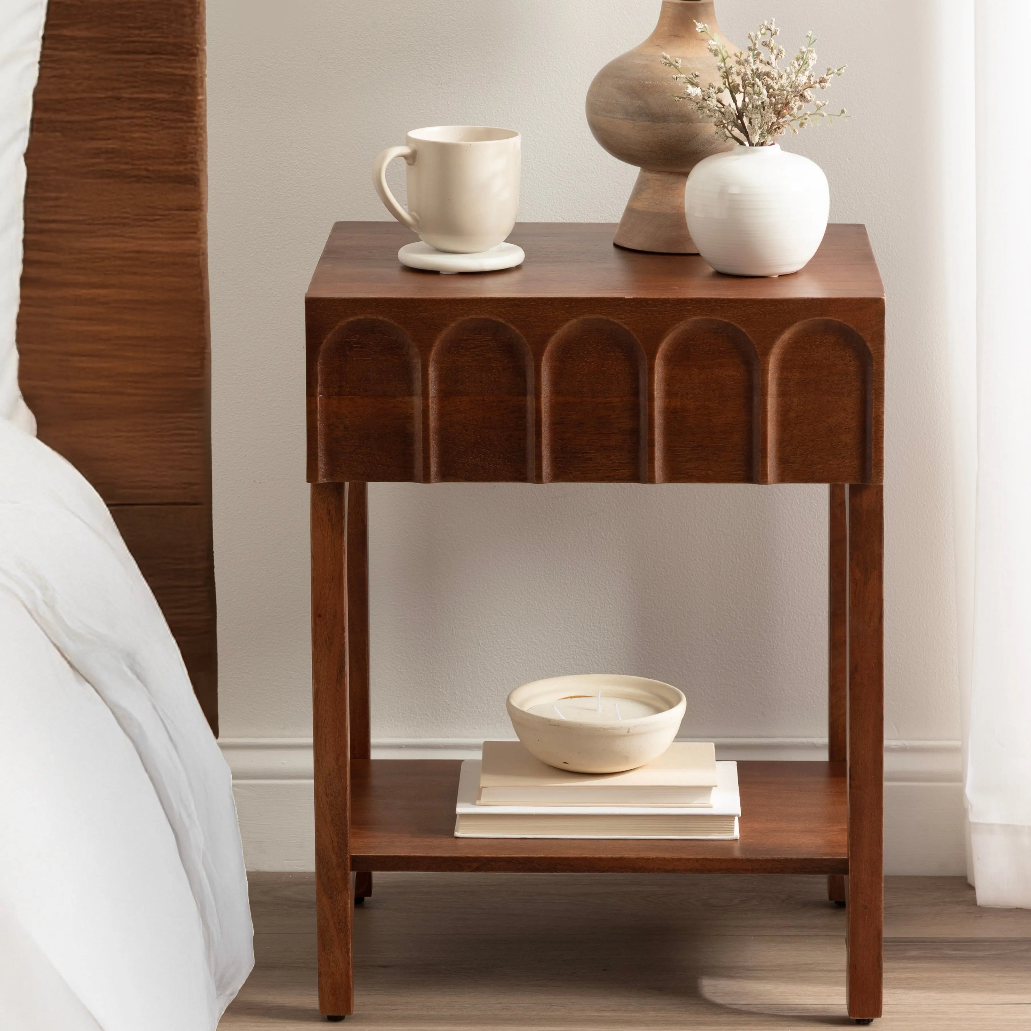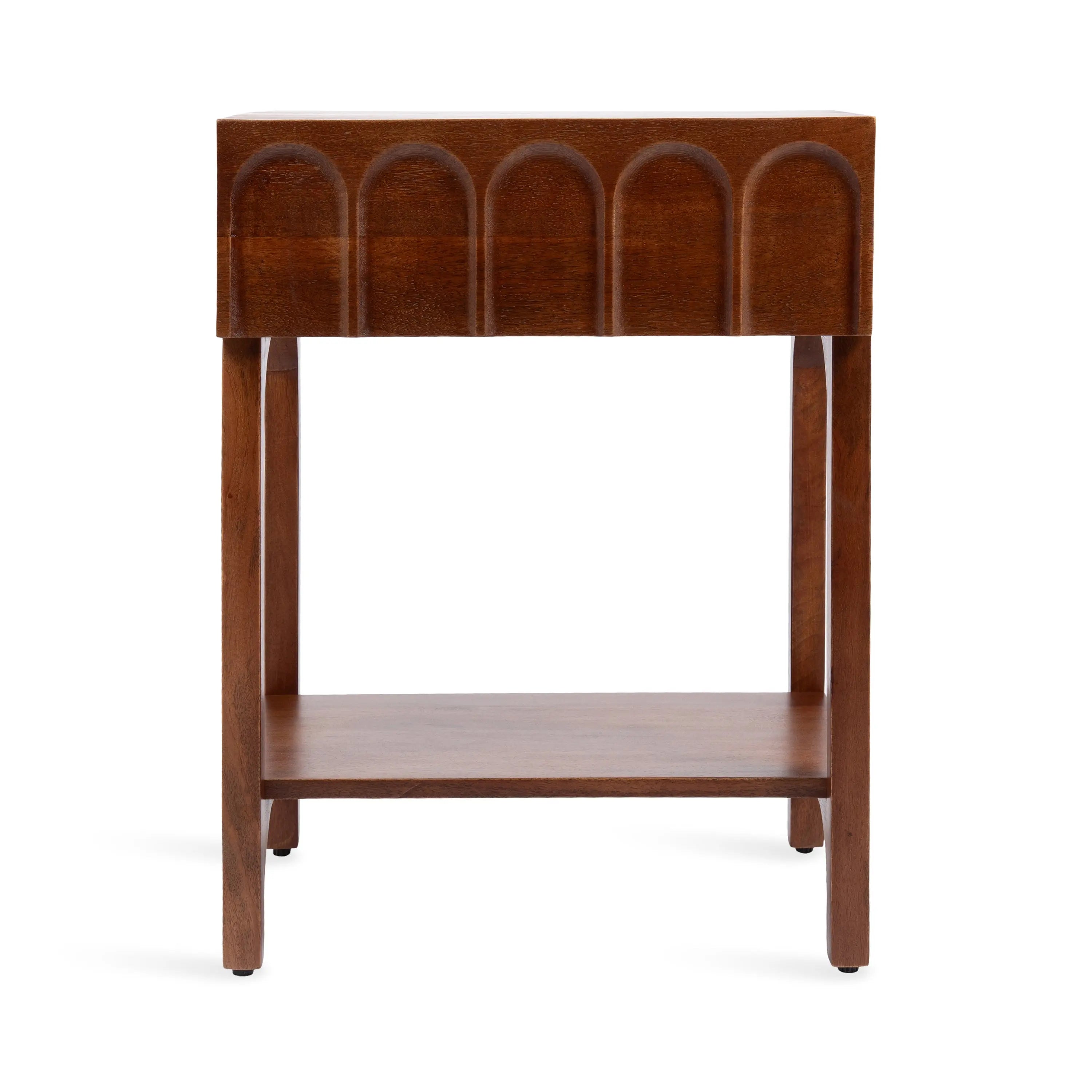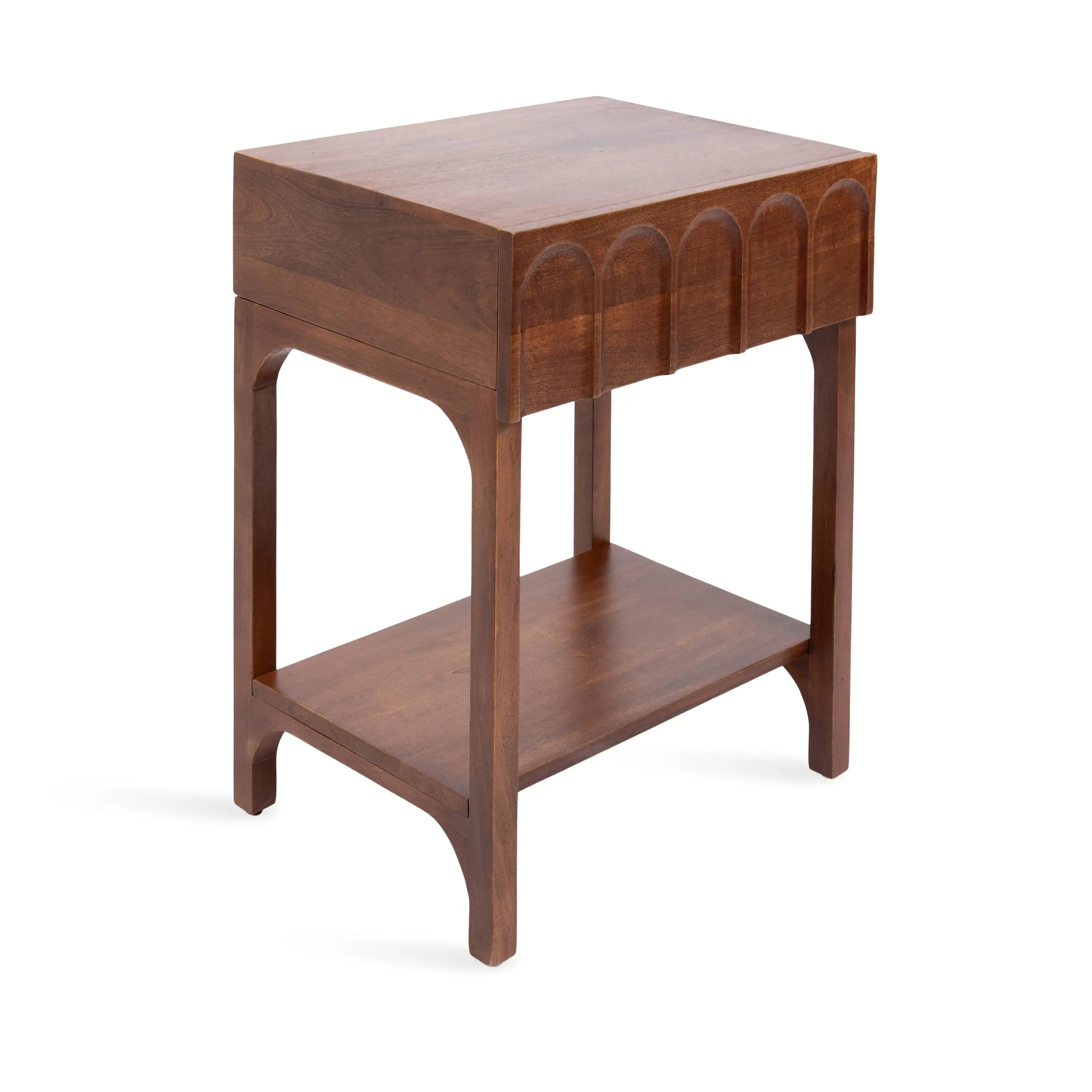 Introducing the Kate and Laurel Archvale wooden side table, a versatile and stylish piece that combines functionality and modern design. This beautifully crafted nightstand features a stunning finish, a functional drawer, and an underlying wooden shelf, offering ample storage space for your bedside essentials. Along the drawer face of this end table is carved arch detailing to provide your space with interesting dimensionality. Constructed with high-quality materials, this side table is built to last. Crafted from solid mango wood in India, each woodgrain and table is truly one-of-a-kind. The wooden shelf below adds extra storage space and is perfect for storing magazines, books, or other items you want to keep within reach. The Archvale side table is not only practical, but also a great accent piece for any room in your home. Use it in your living room, bedroom, or home office for a functional and stylish addition to your space.