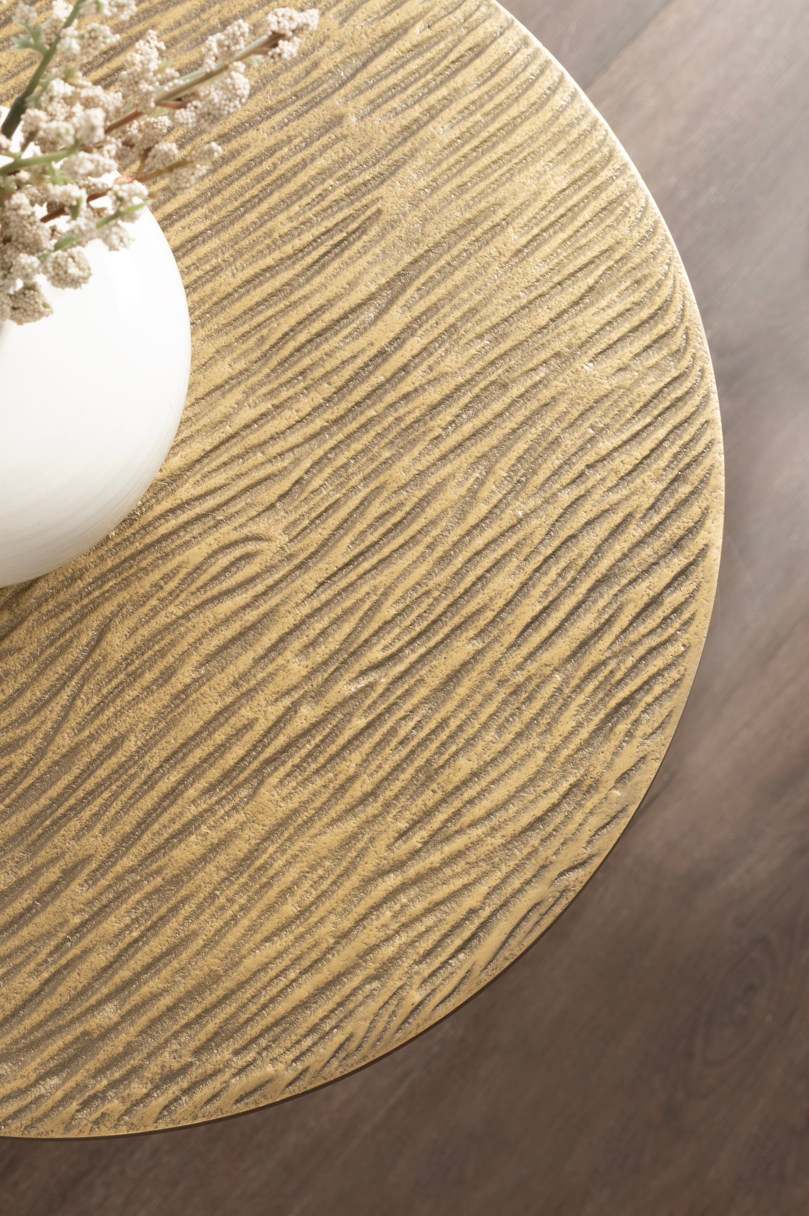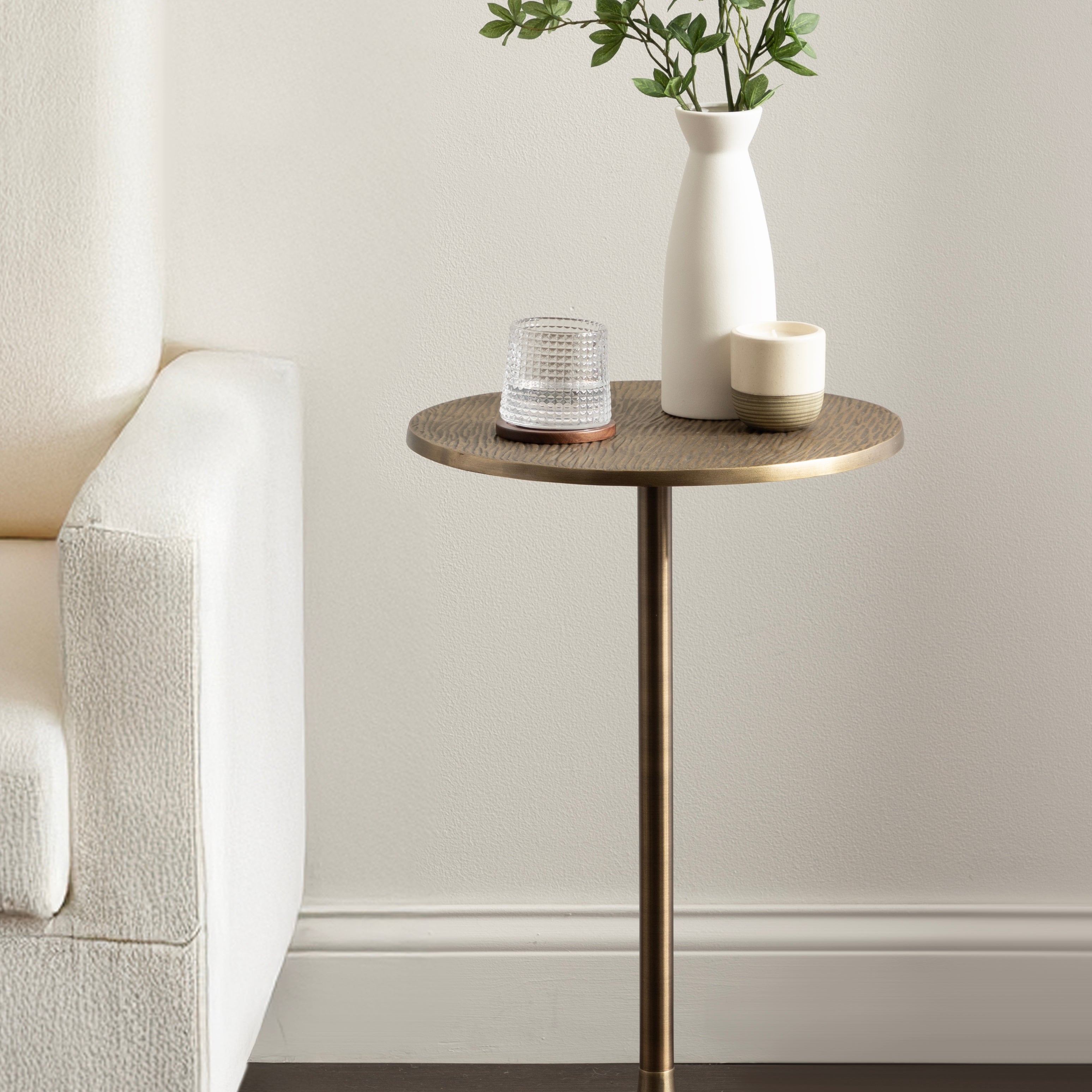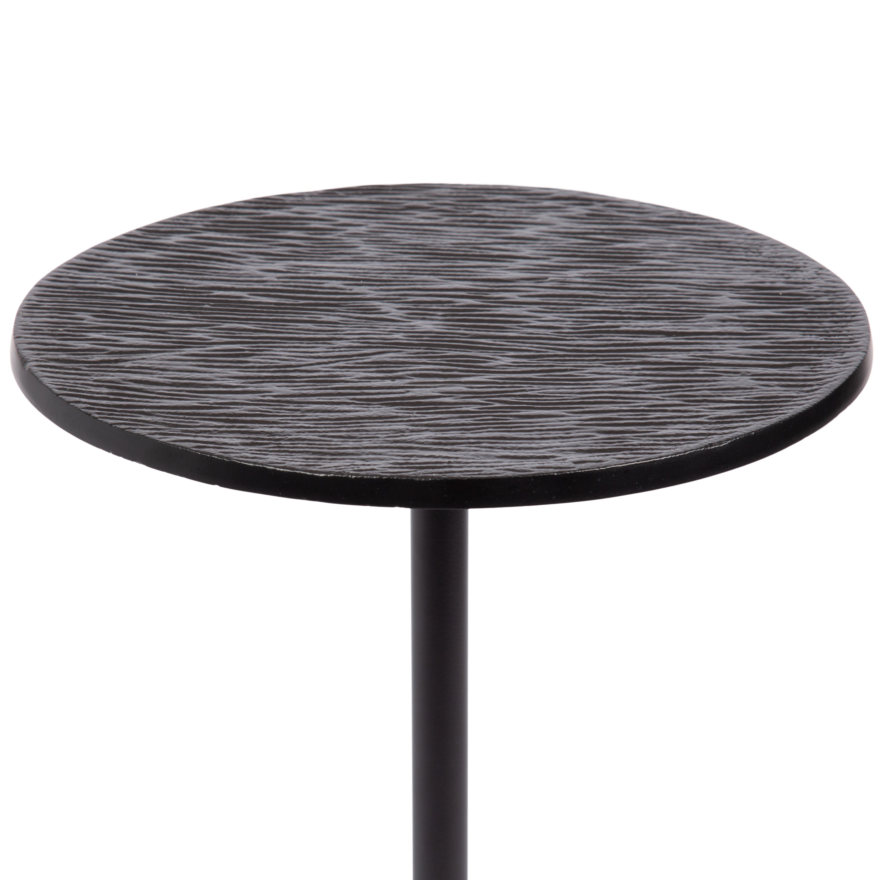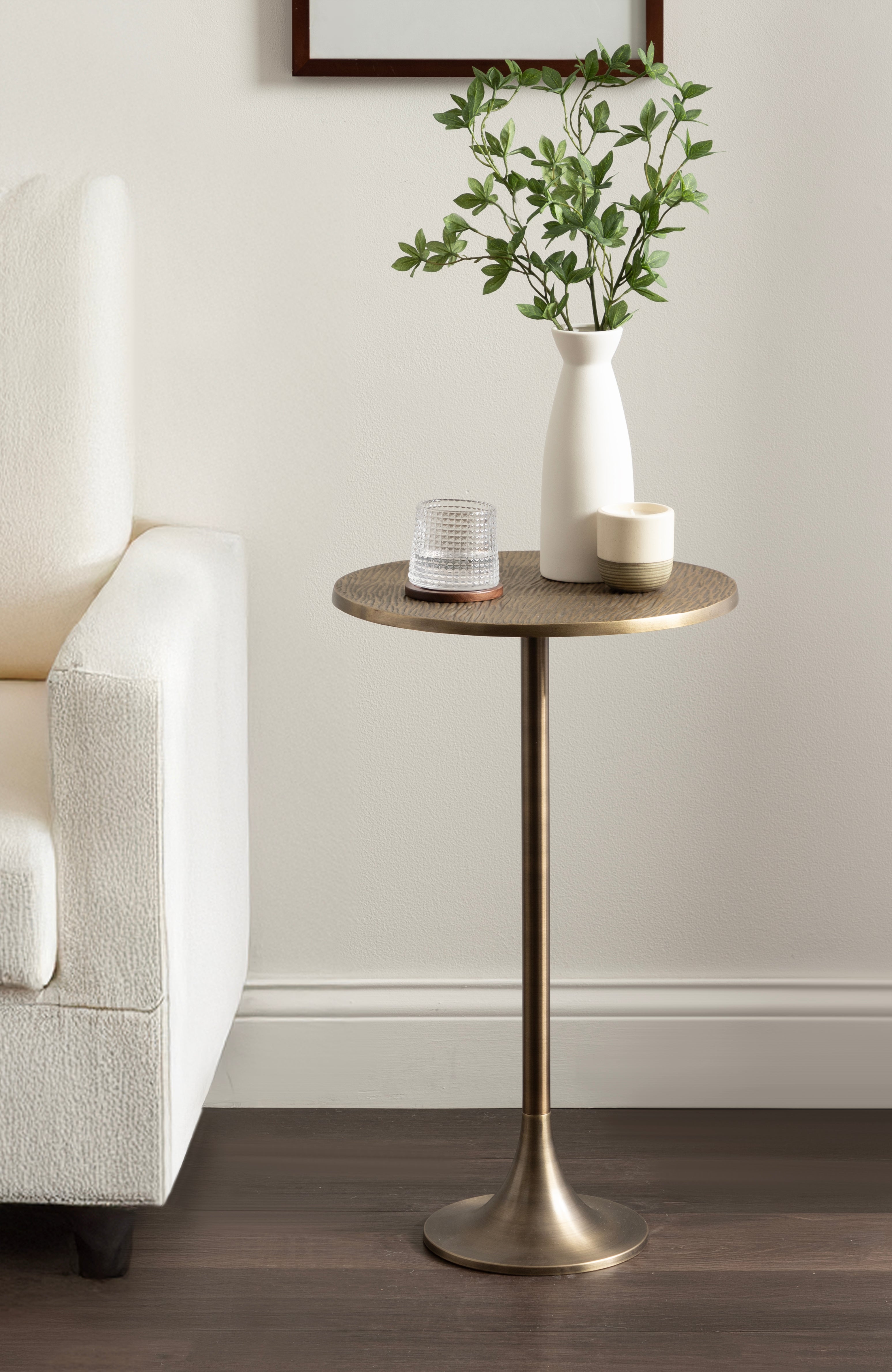 Introducing the Kate and Laurel Baronet round side table, a captivating blend of modern glam and natural elegance. The end table's striking combination of the cast aluminum tabletop and the stunning iron base creates a luxurious aesthetic that is sure to impress. That cast aluminum tabletop features a unique texture that sets this table apart and makes it a charming place to set your drinks or a tabletop lamp. This delightful cocktail table is a beautiful accent for serving and placing drinks when friends are around due to its sturdy metal base. Its versatile size and round tabletop allow for easy placement and rearrangement to suit your needs. Whether you place it next to your sofa, by your bedside, or in a cozy reading nook, this versatile drink table effortlessly enhances any space.