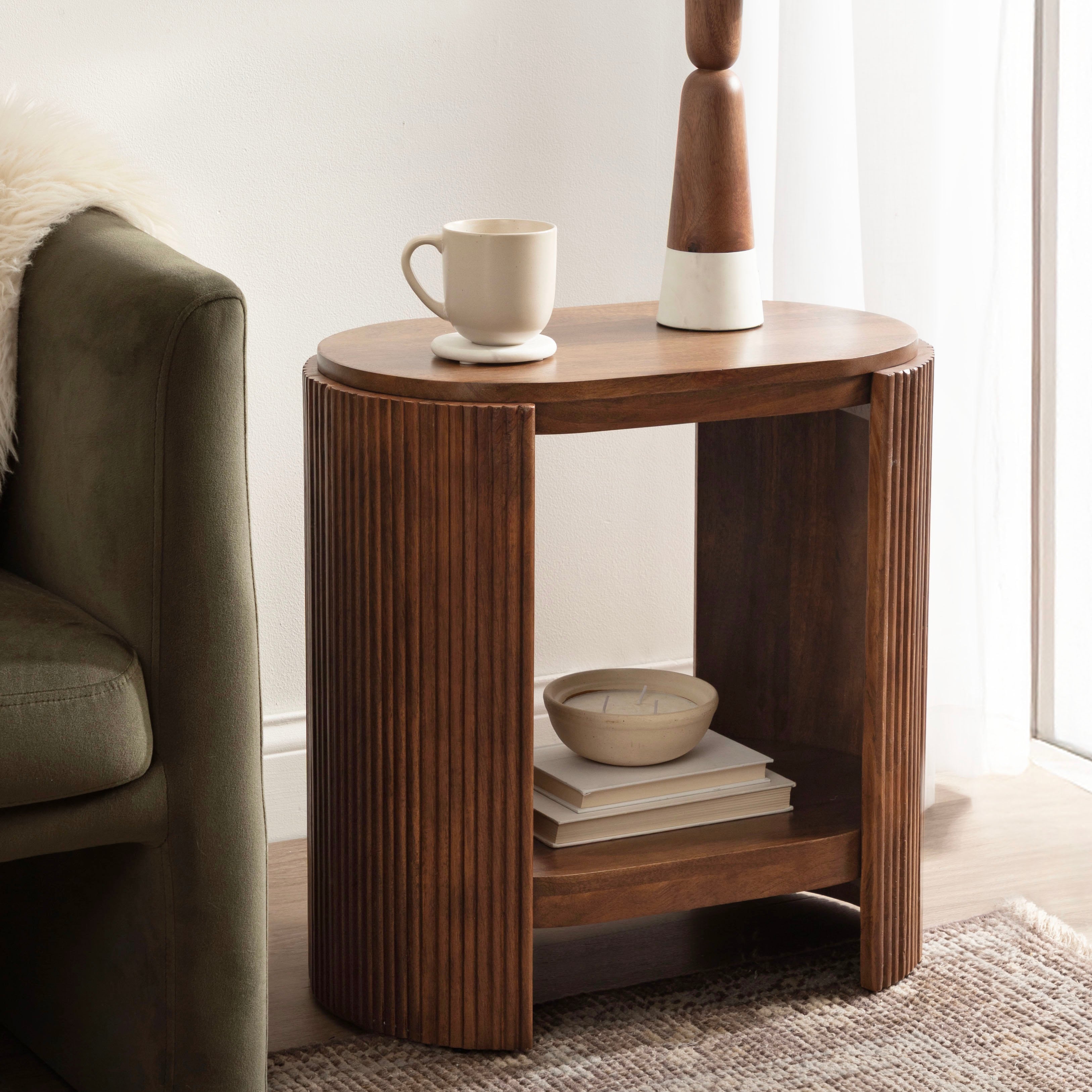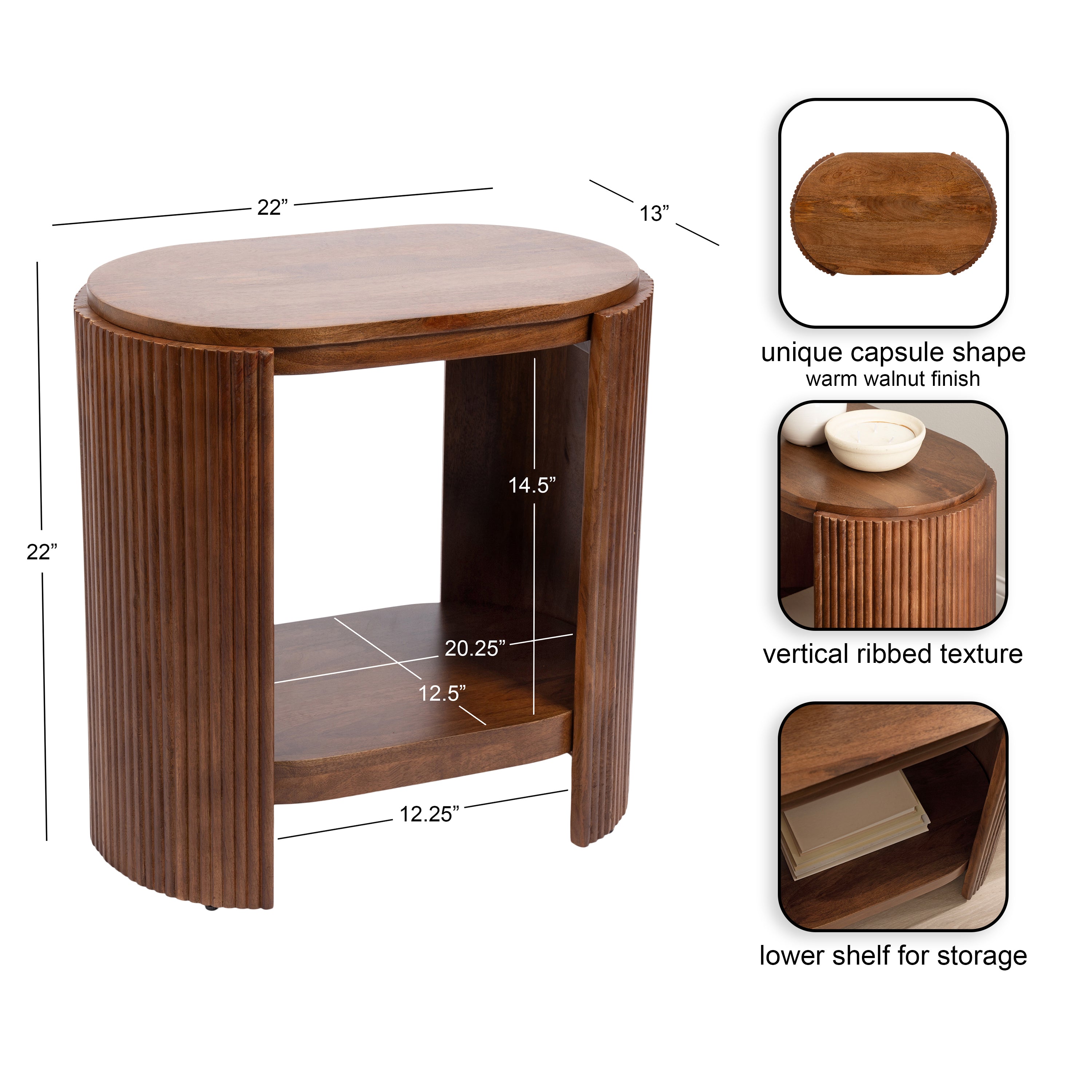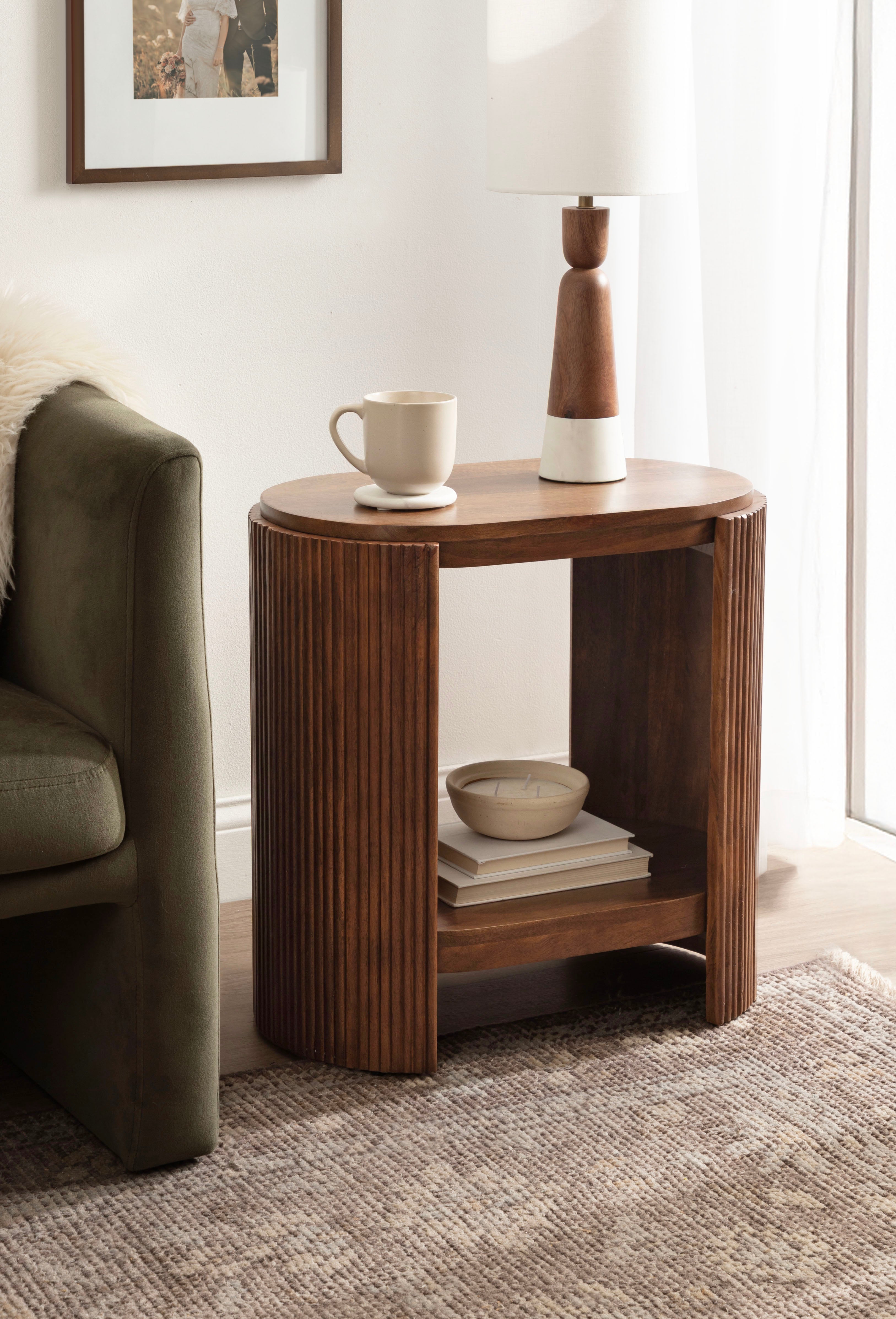 Blend your love of modern style with a dash of transitional functionality with the Cakora side table. This rectangular table embraces a fun yet refined design with its capsule table shape and ribbed table sides. Skilled artisans craft the Cakora by hand, and due to this careful, delicate crafting, each piece is one-of-a-kind in finish and woodgrain. This end table is made of 100% solid mango wood for a table that looks and feels rich and high-quality. It not only looks good, but it also features two tiers of mango wood that can serve various purposes throughout your home. It is a perfect pairing next to a sofa, by your bed, or flanking your entryway. In addition, the two tiers are ideal for storing and displaying household necessities and your most cherished decorative accent pieces. Assembly for this minimal table takes a matter of minutes with a simple four-step process will have your new end table ready in no time.