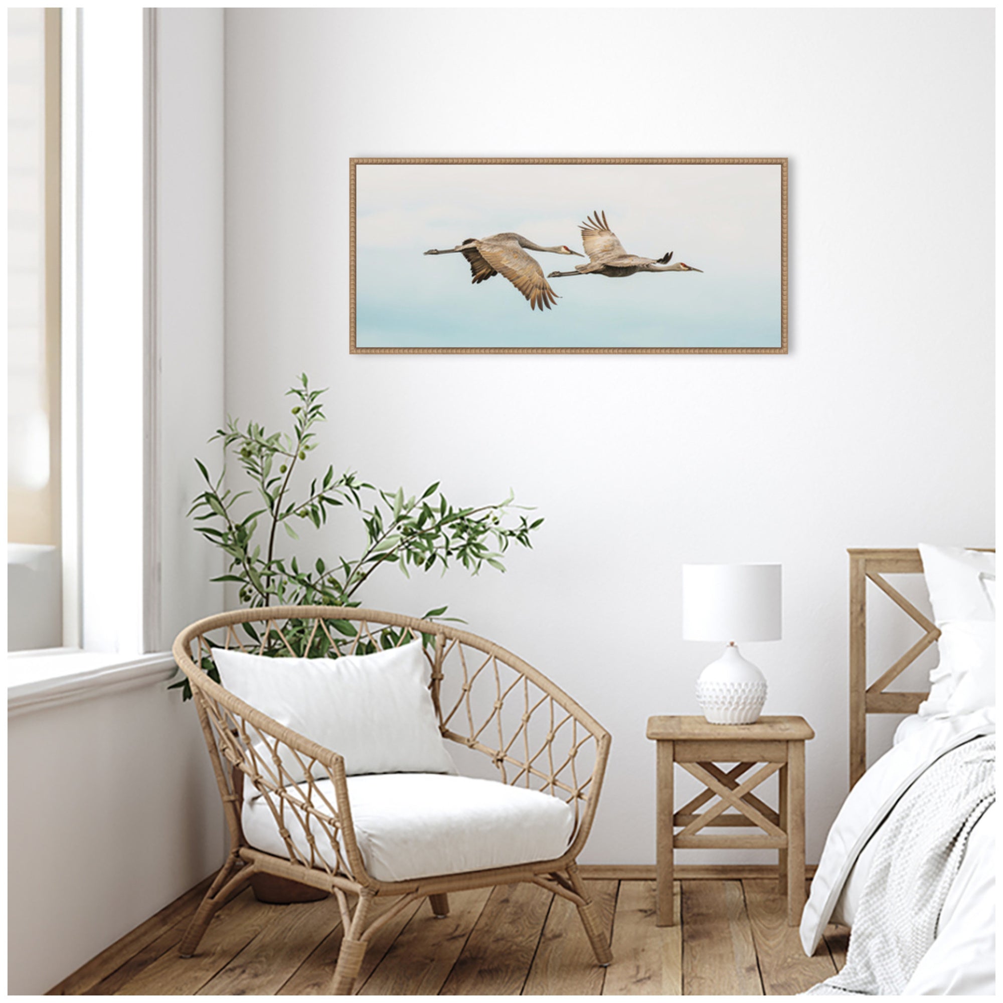 - Gallery Quality Art: Measuring 40 x 18 inches, this is beautifully presented in Sylvie Beaded Rustic Natural frame - a float frame featuring a beaded ornate design with natural woodgrain coloring and dramatic depth.. Expressive Wall Art Story:Two cranes are captured mid-flight against a soft, pale sky. Their wings are spread wide, showcasing detailed feathers and graceful movement. The image conveys a sense of freedom and harmony in nature.