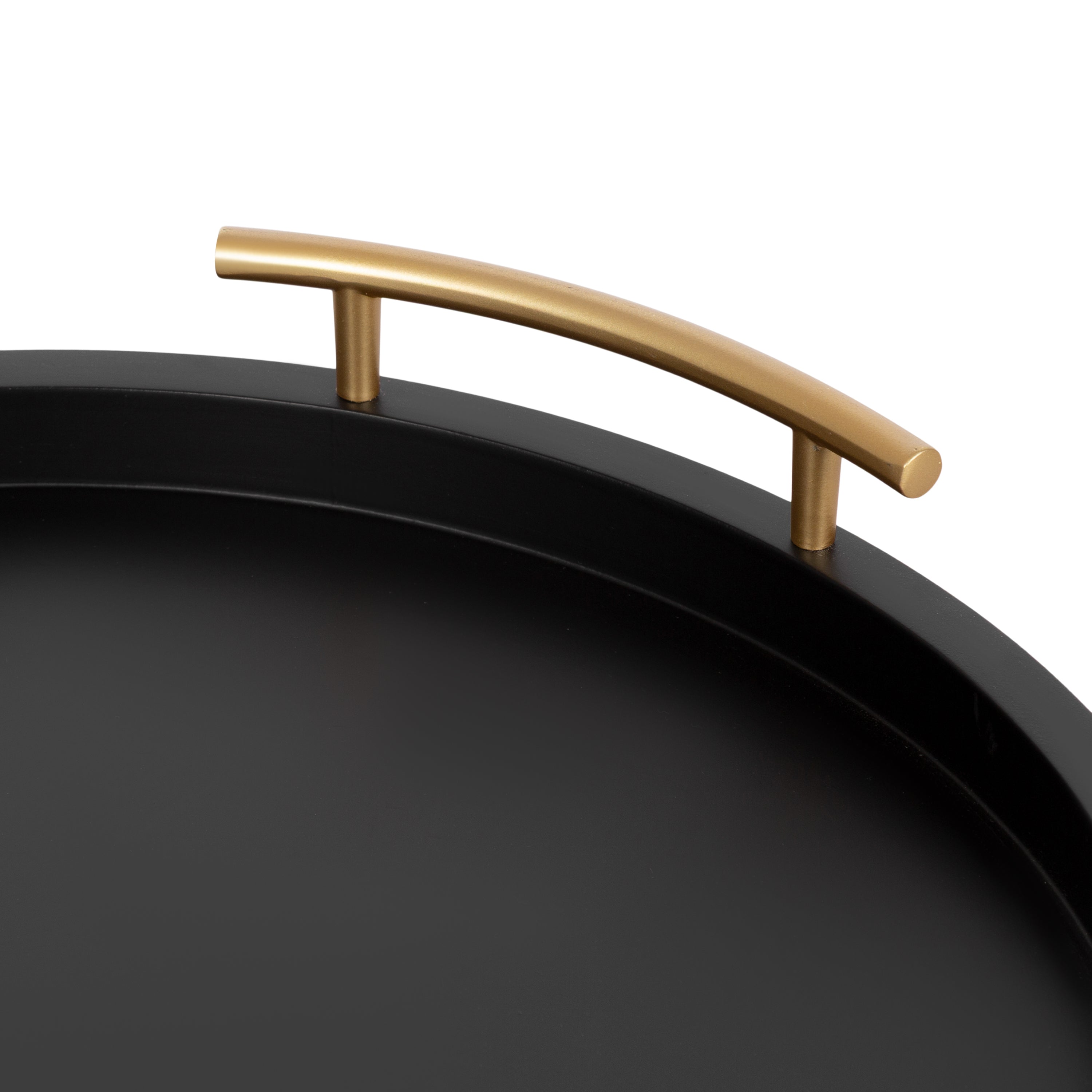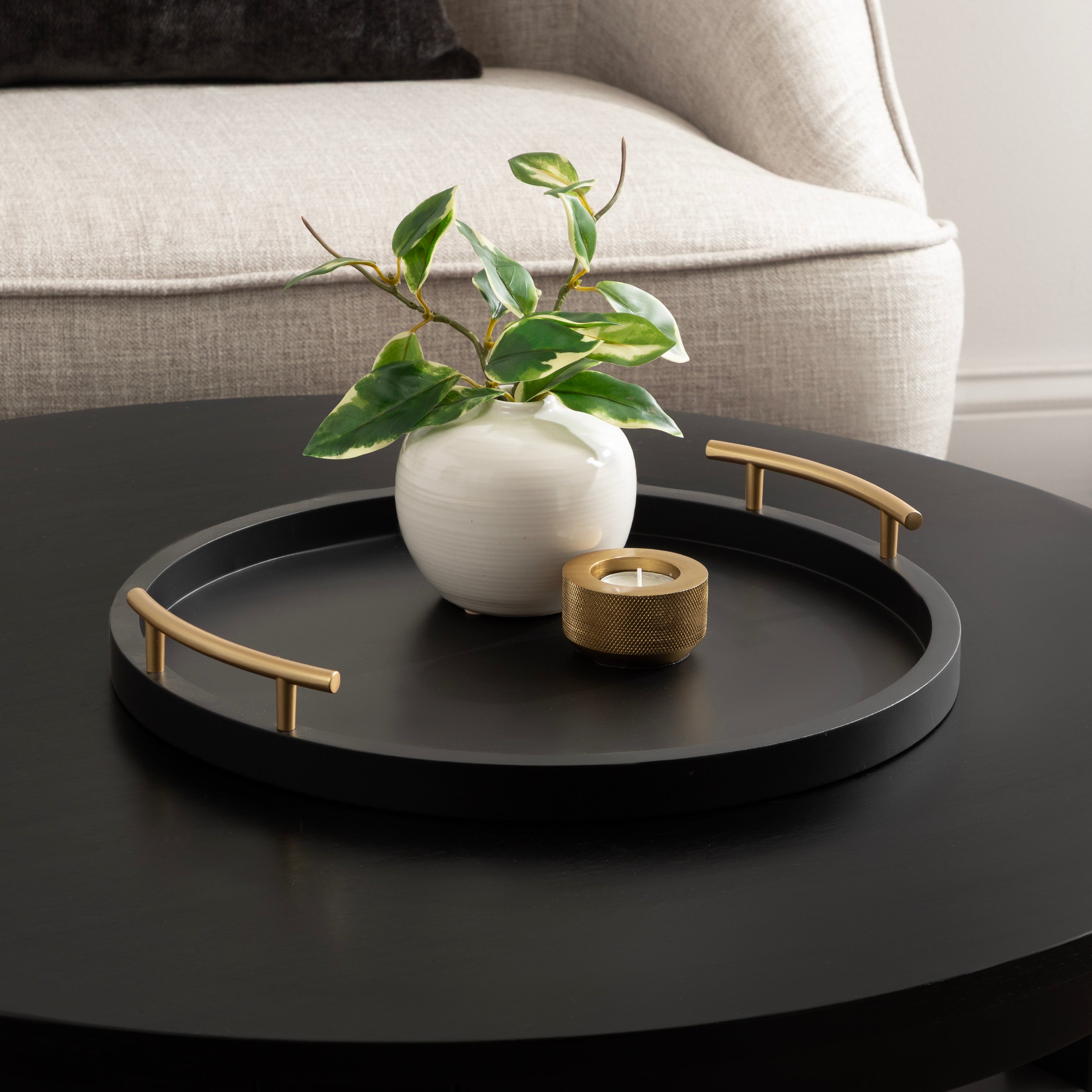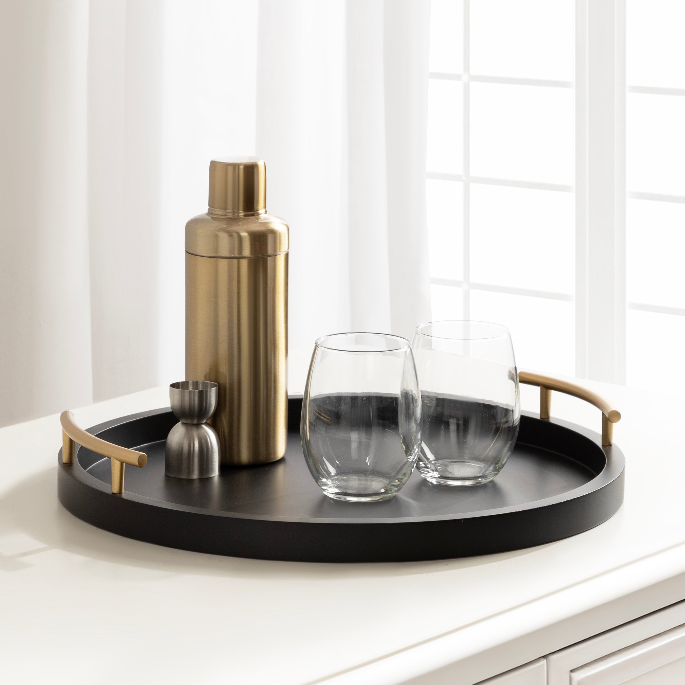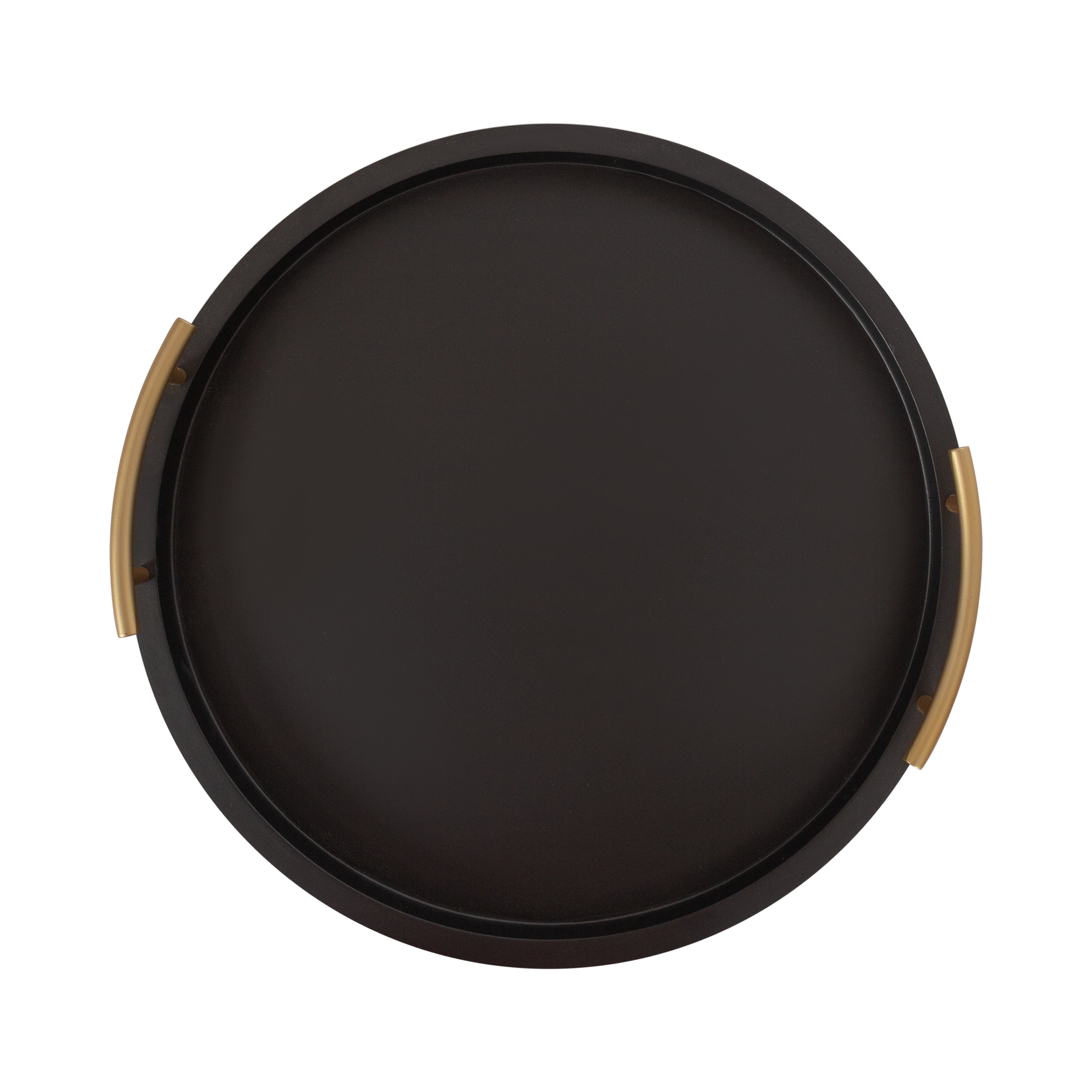 Add some elegance and serving space with the Halsey round decorative wooden tray. The polished metal handles add to its style and functionality. Place this charming tray on your entrance console table as a catchall tray to keep your keys and mail as you come and go, or it's spacious enough to be used as a decorative accent on an ottoman to hold your beverages on coasters. It has a slight lip along the outer edge to keep your items contained without interfering with its sleek nature. Bring a smart and attractive decorative accent into your home with this beautiful modern round tray. The refined metal handles allow you to easily transport this tray from room to room without worry.