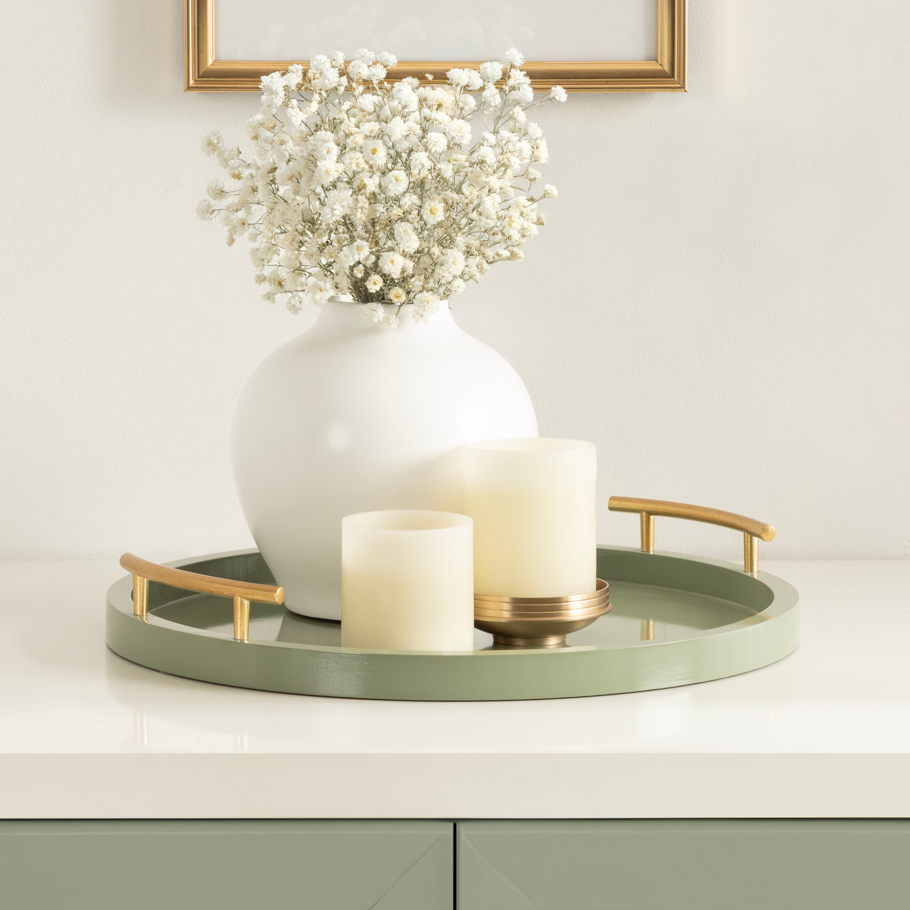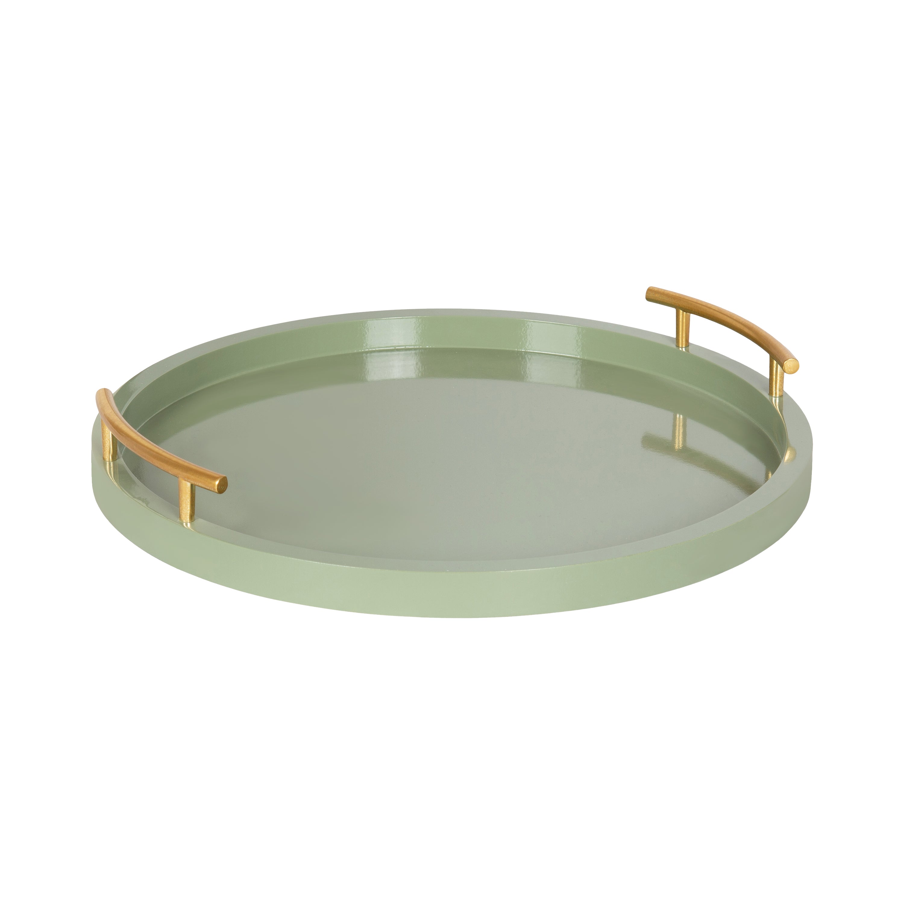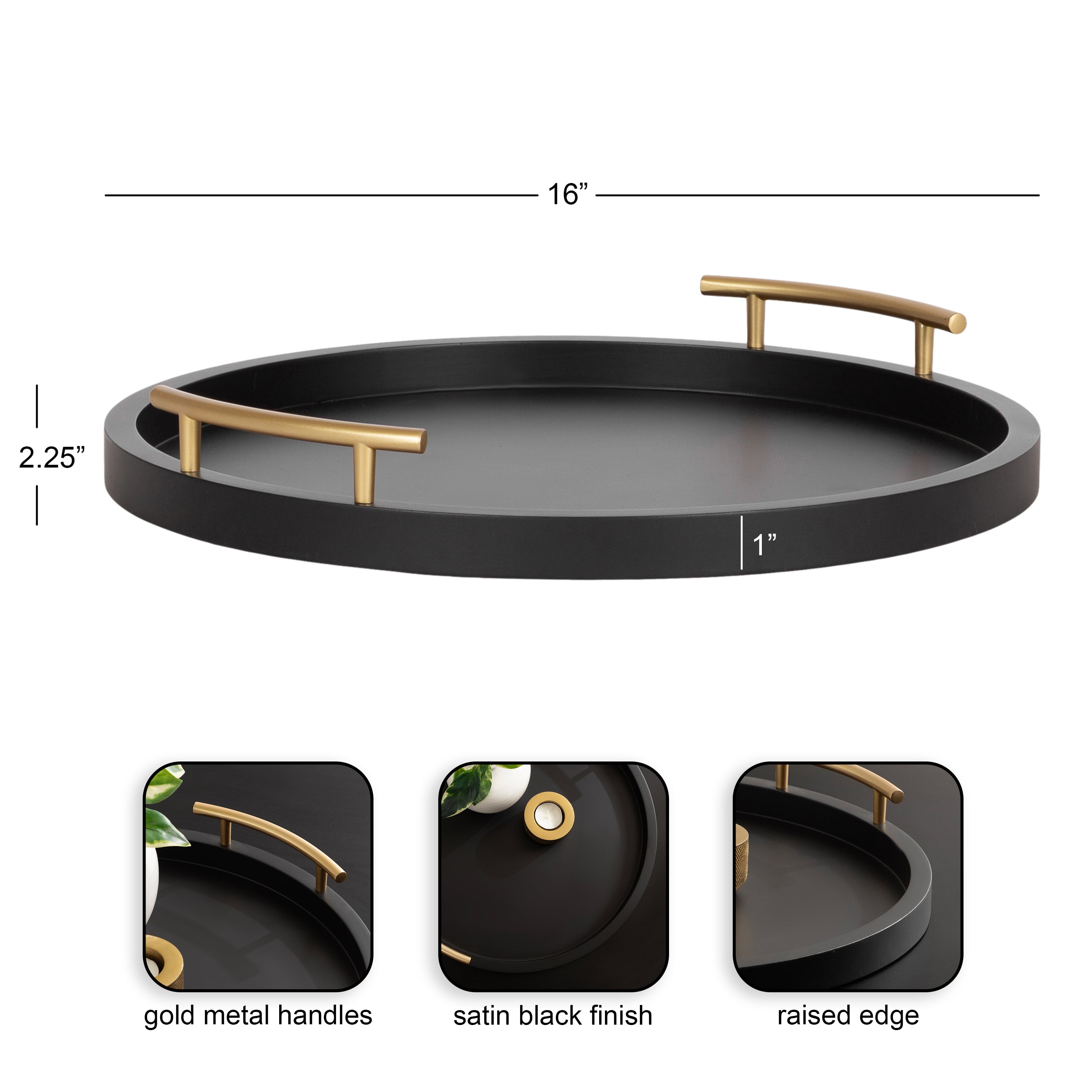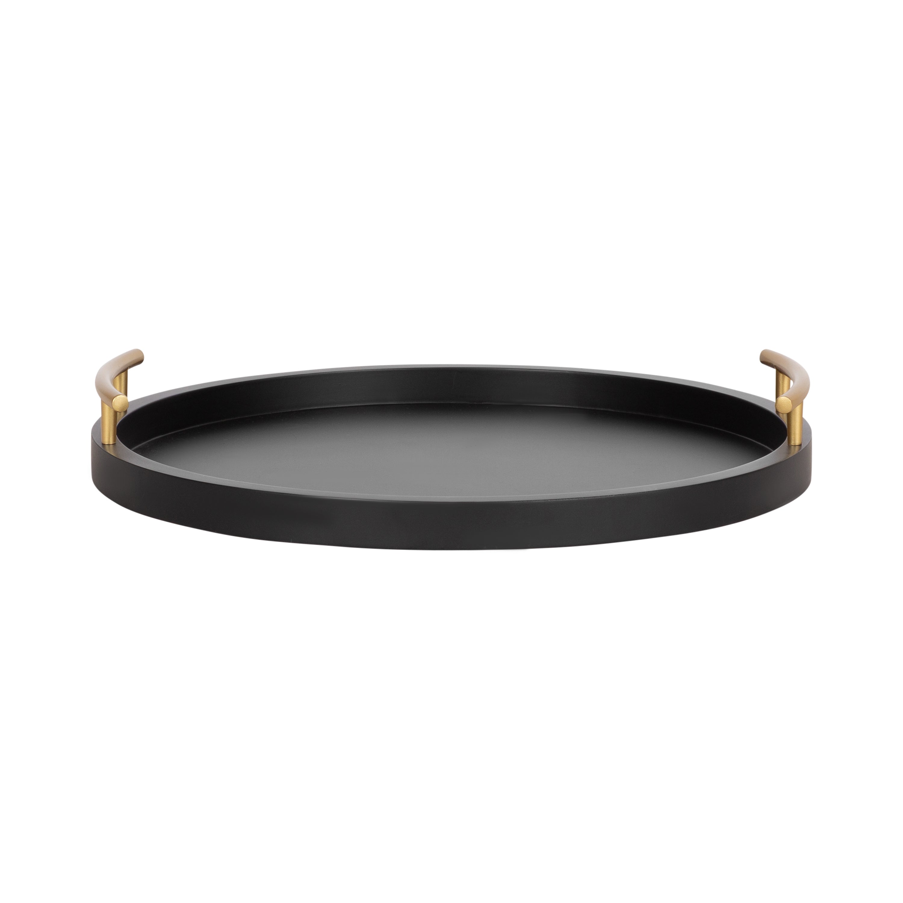 Add some elegance and serving space with the Halsey round decorative wooden tray. The polished metal handles add to its style and functionality. Place this charming tray on your entrance console table as a catchall tray to keep your keys and mail as you come and go, or it's spacious enough to be used as a decorative accent on an ottoman to hold your beverages on coasters. It has a slight lip along the outer edge to keep your items contained without interfering with its sleek nature. Bring a smart and attractive decorative accent into your home with this beautiful modern round tray. The refined metal handles allow you to easily transport this tray from room to room without worry.