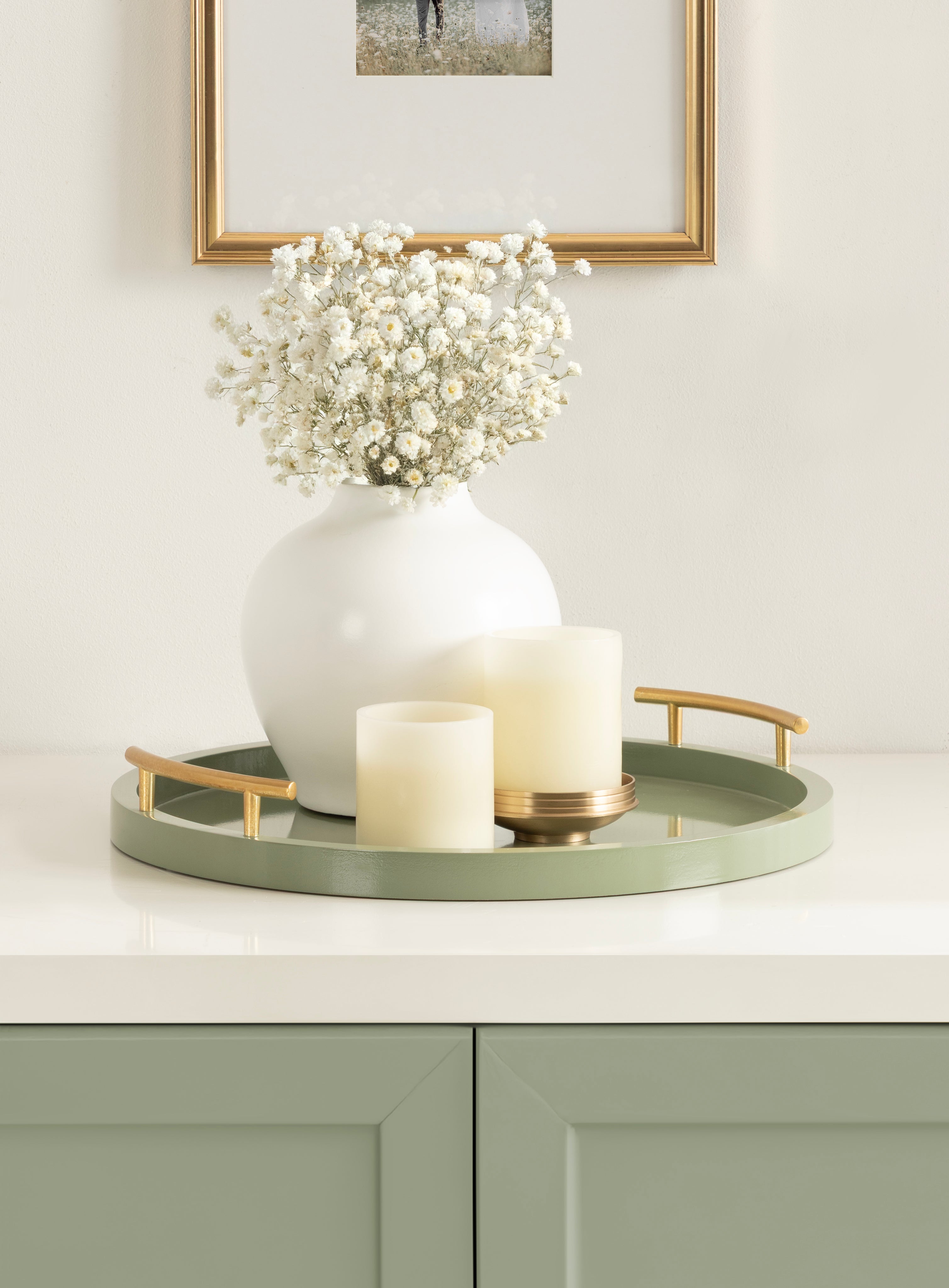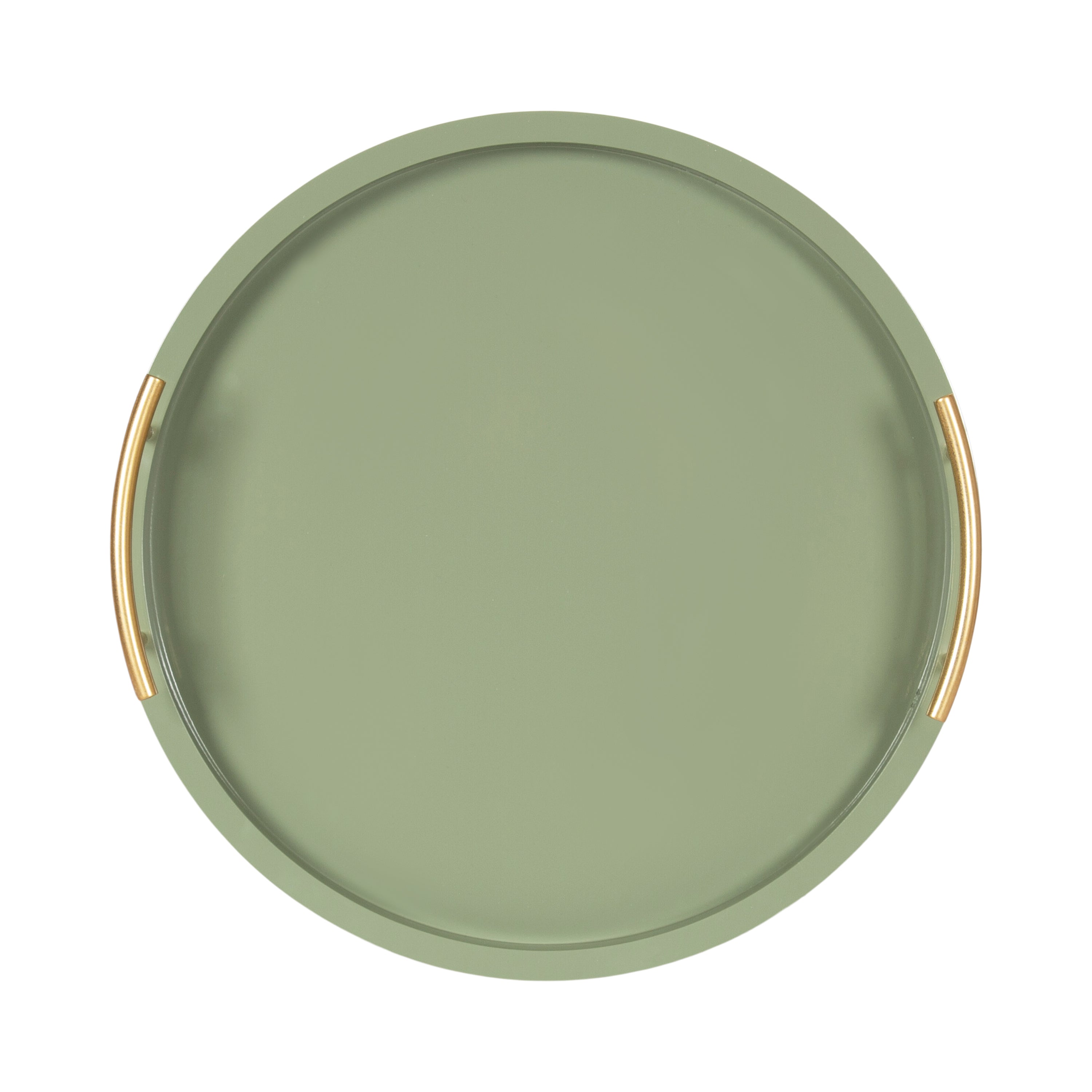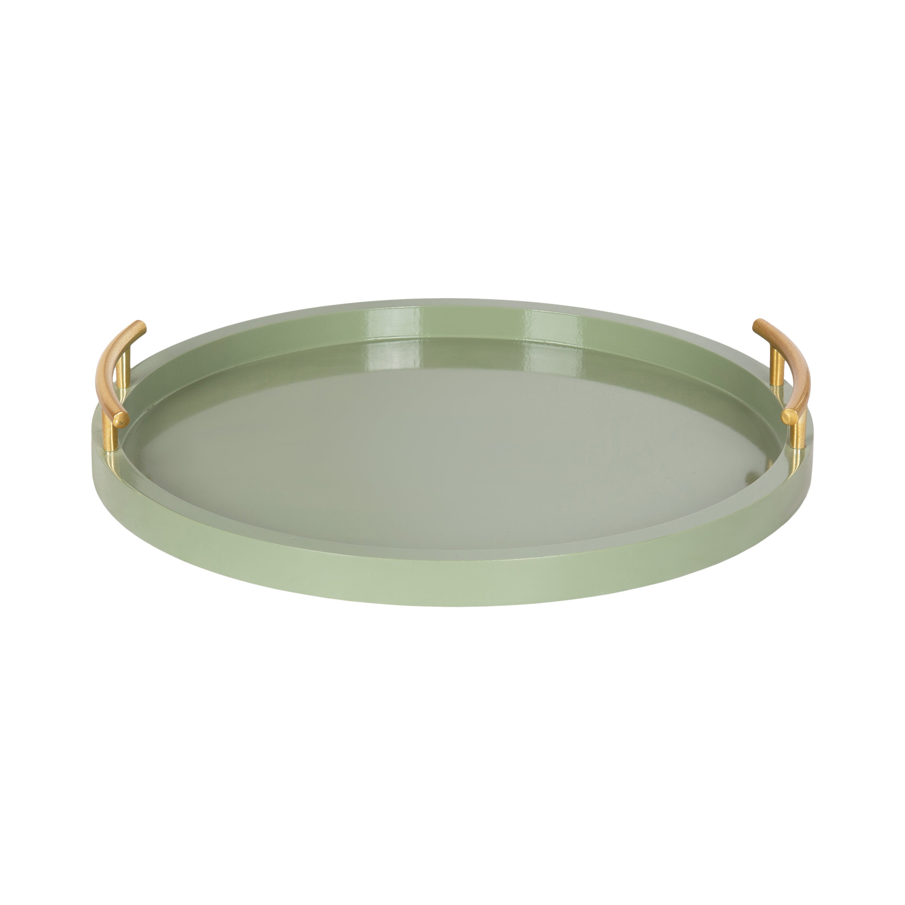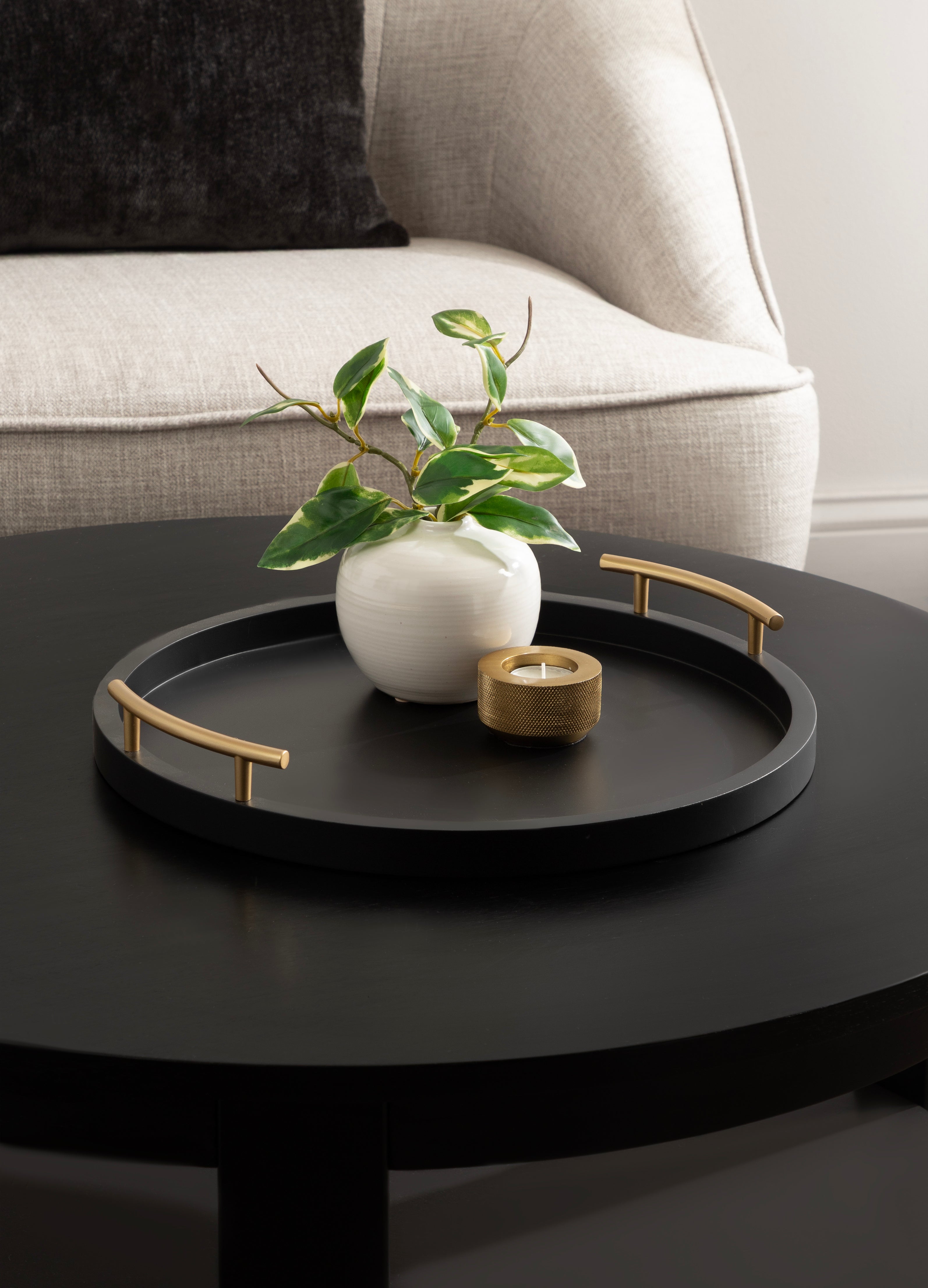 Add some elegance and serving space with the Halsey round decorative wooden tray. The polished metal handles add to its style and functionality. Place this charming tray on your entrance console table as a catchall tray to keep your keys and mail as you come and go, or it's spacious enough to be used as a decorative accent on an ottoman to hold your beverages on coasters. It has a slight lip along the outer edge to keep your items contained without interfering with its sleek nature. Bring a smart and attractive decorative accent into your home with this beautiful modern round tray. The refined metal handles allow you to easily transport this tray from room to room without worry.