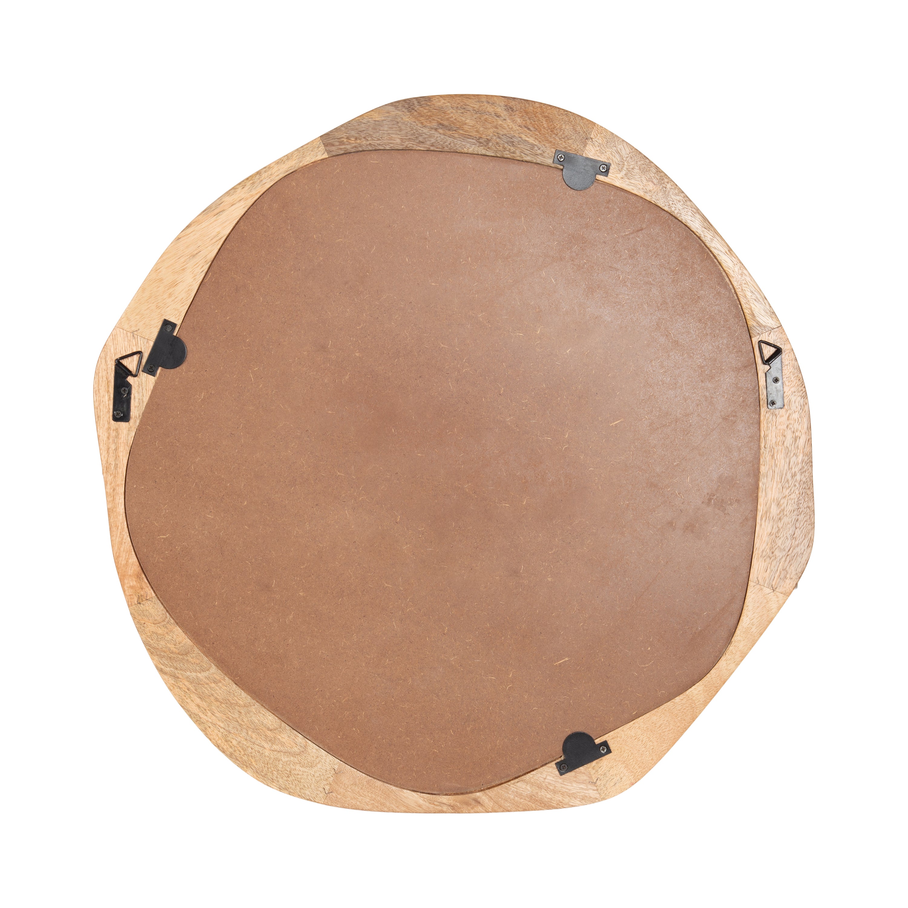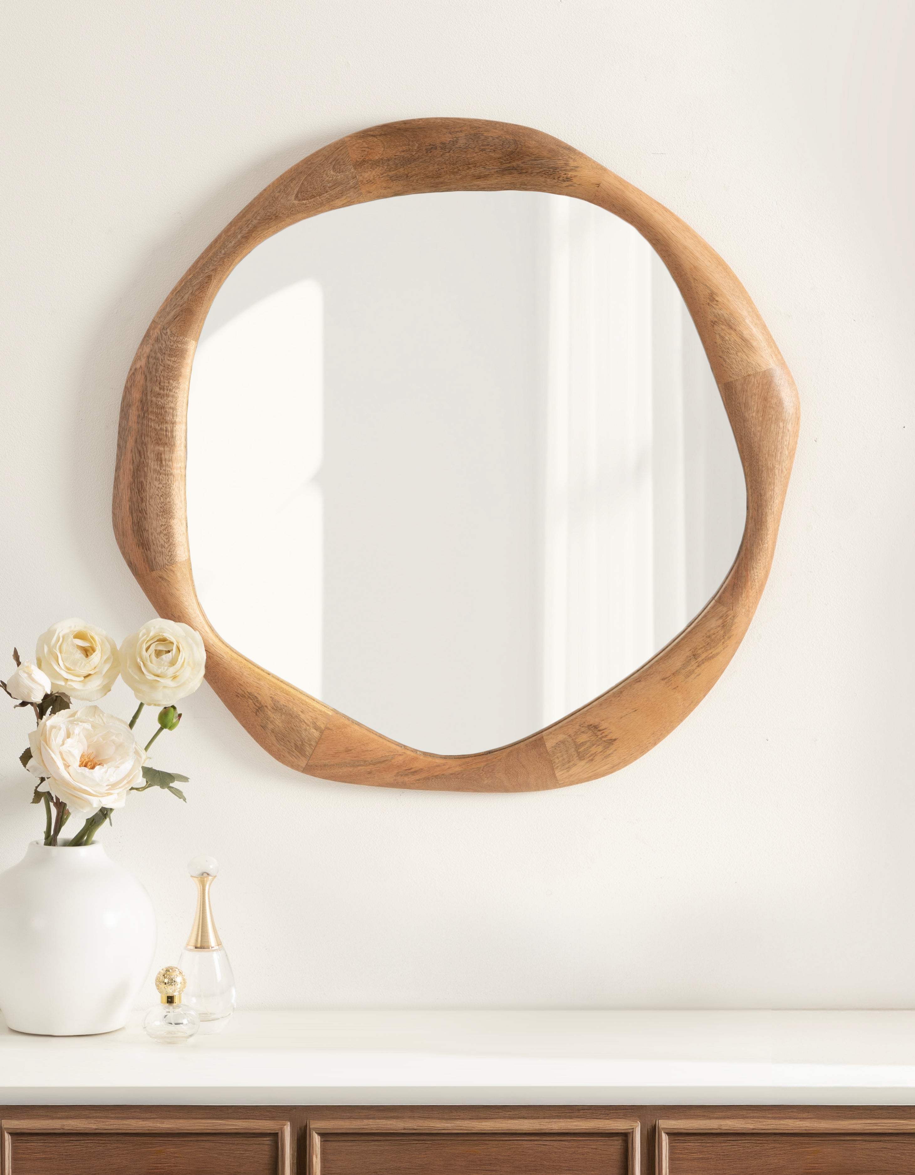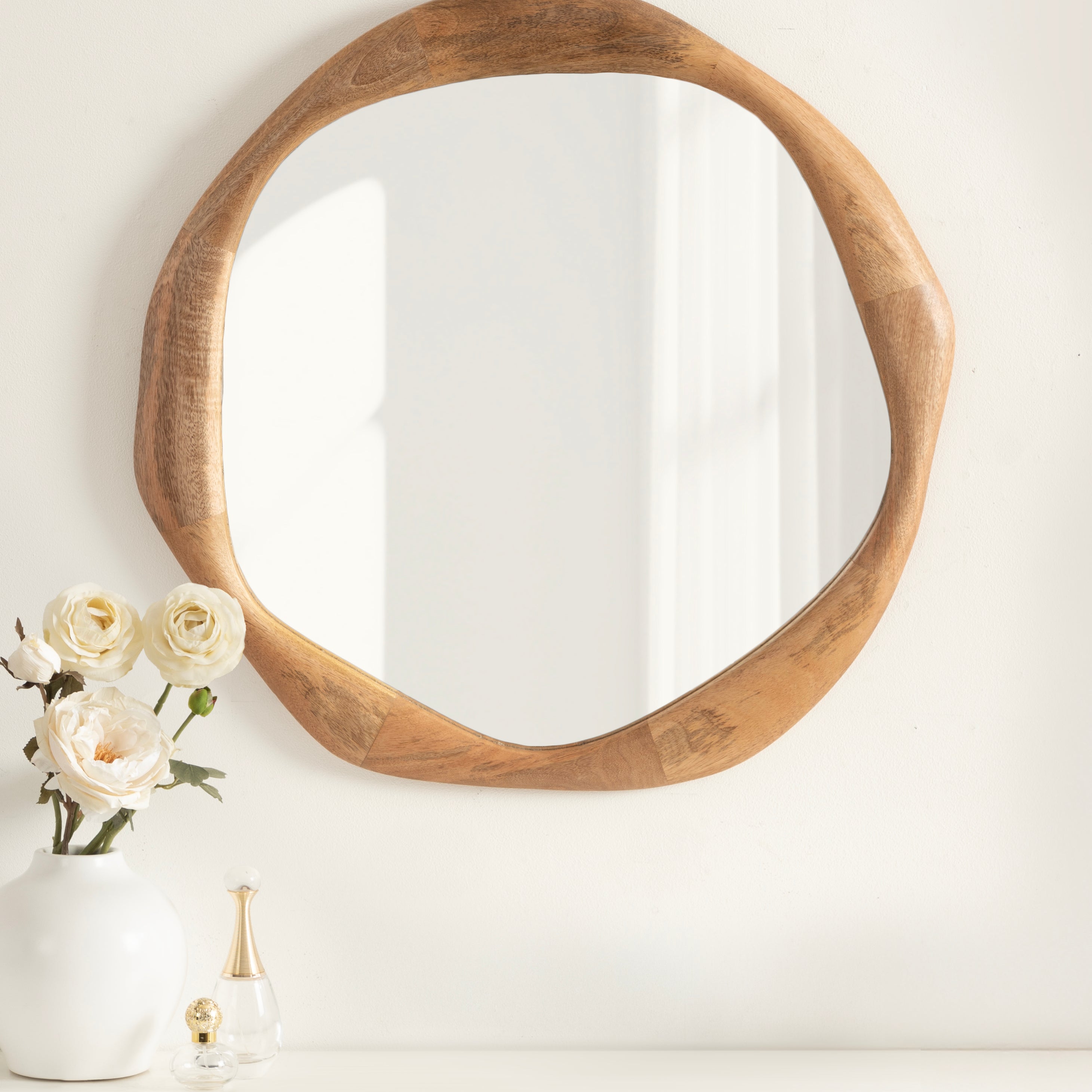 Create a youthful aesthetic in your home with this fantastic Hera irregular round mirror. This beautiful mirror is the epitome of modern design, featuring a unique look and a quality finish on the frame that pops off the wall. The beautifully wooden frame is made from solid mango wood with a stunning finish to show off its rich, authentic look. The round shape emphasizes its unique look with a dash of modernity to showcase a geometric and trendy style on any wall. Hang this stunning piece of wall decor in your bedroom, entryway, dining room, living room, or even bathroom with its stellar and unique modern design. Hang the beautiful Hera wall mirror in a matter of minutes with the convenient triangle hangers attached to the back of the frame.