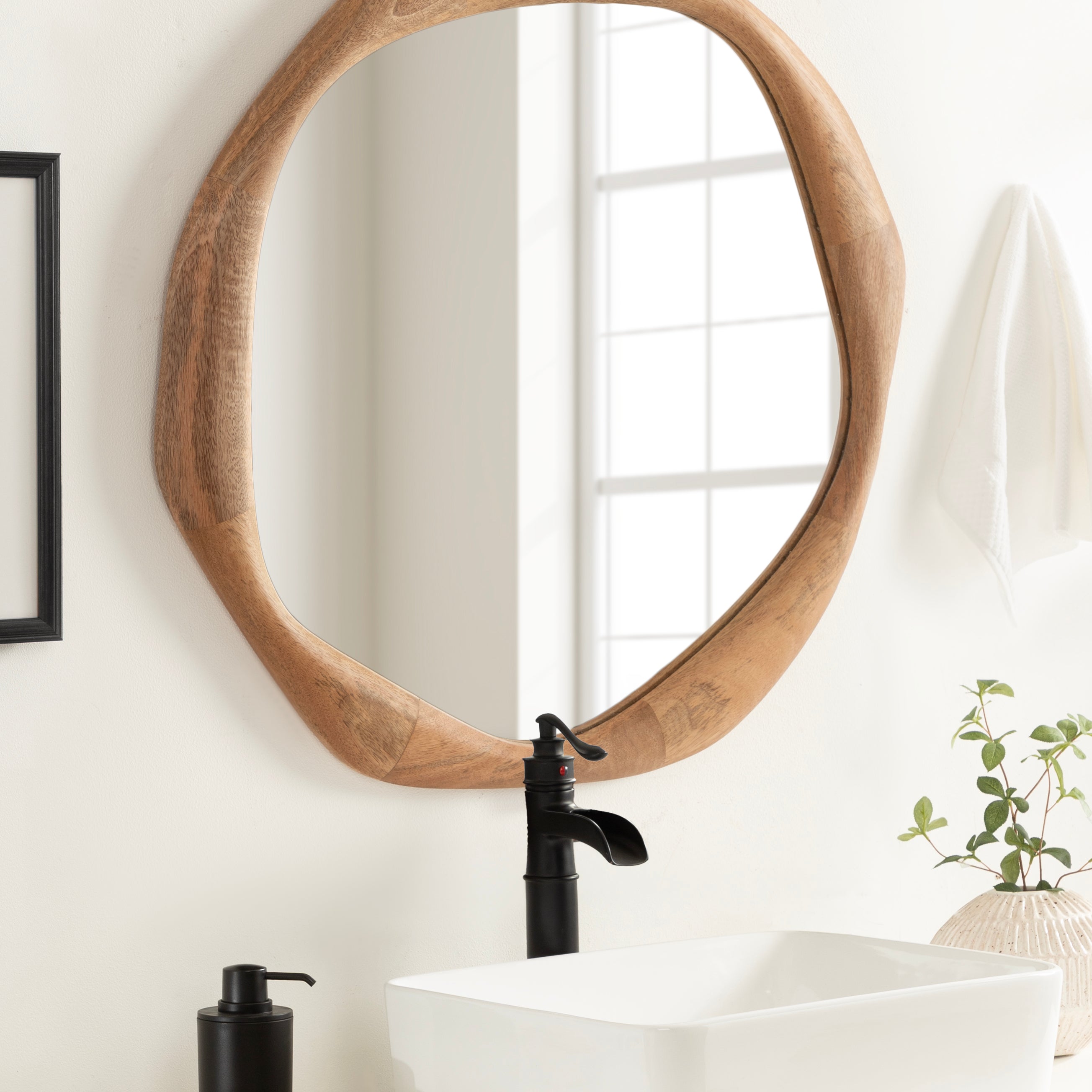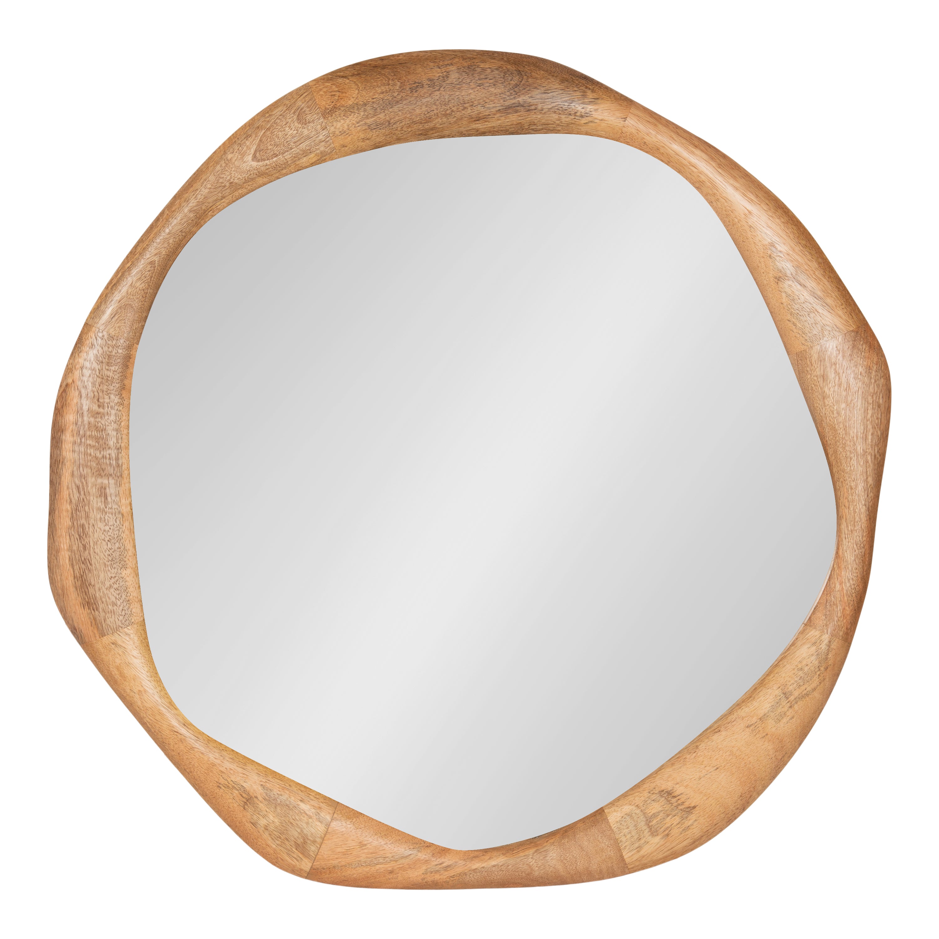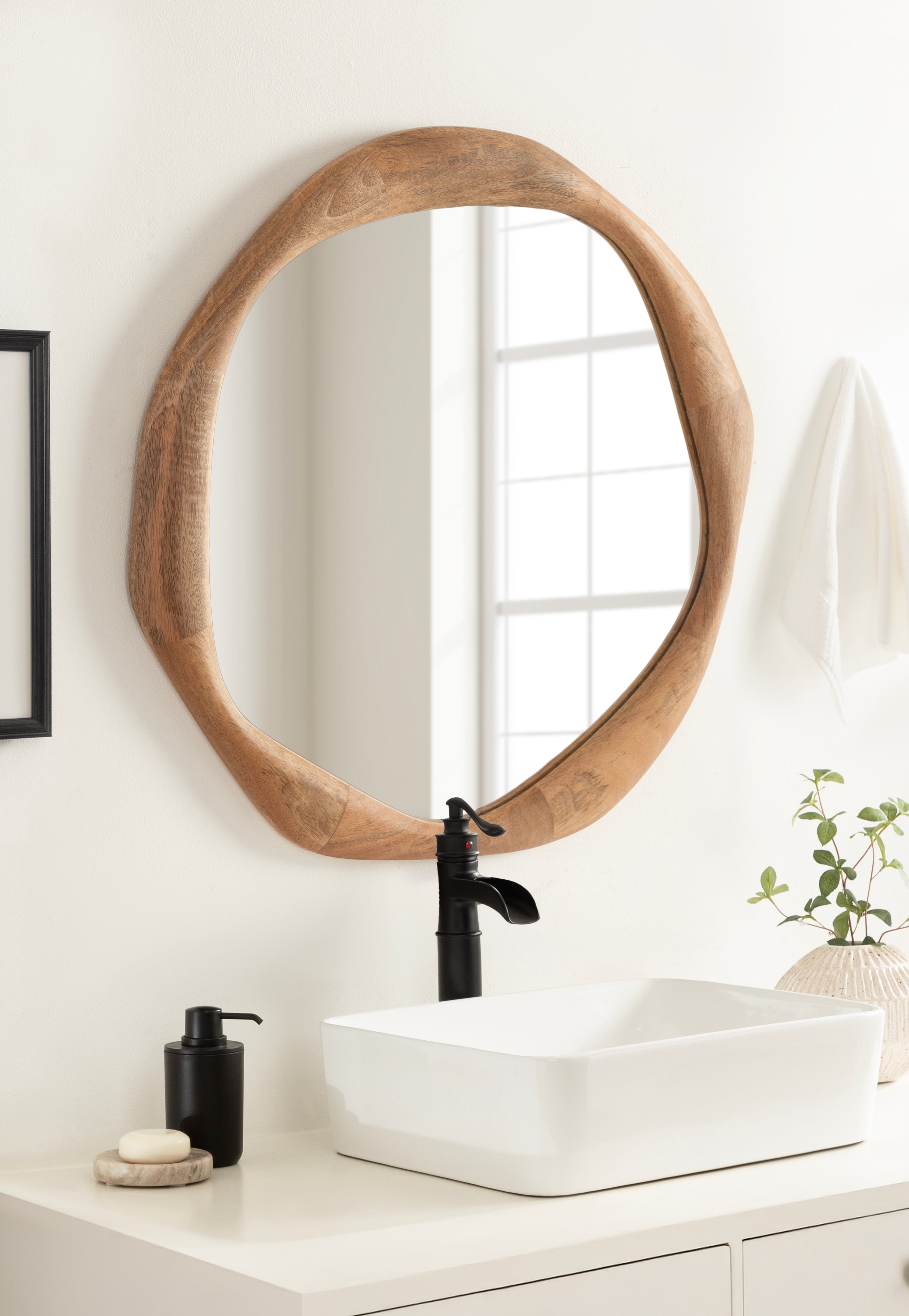 Create a youthful aesthetic in your home with this fantastic Hera irregular round mirror. This beautiful mirror is the epitome of modern design, featuring a unique look and a quality finish on the frame that pops off the wall. The beautifully wooden frame is made from solid mango wood with a stunning finish to show off its rich, authentic look. The round shape emphasizes its unique look with a dash of modernity to showcase a geometric and trendy style on any wall. Hang this stunning piece of wall decor in your bedroom, entryway, dining room, living room, or even bathroom with its stellar and unique modern design. Hang the beautiful Hera wall mirror in a matter of minutes with the convenient triangle hangers attached to the back of the frame.