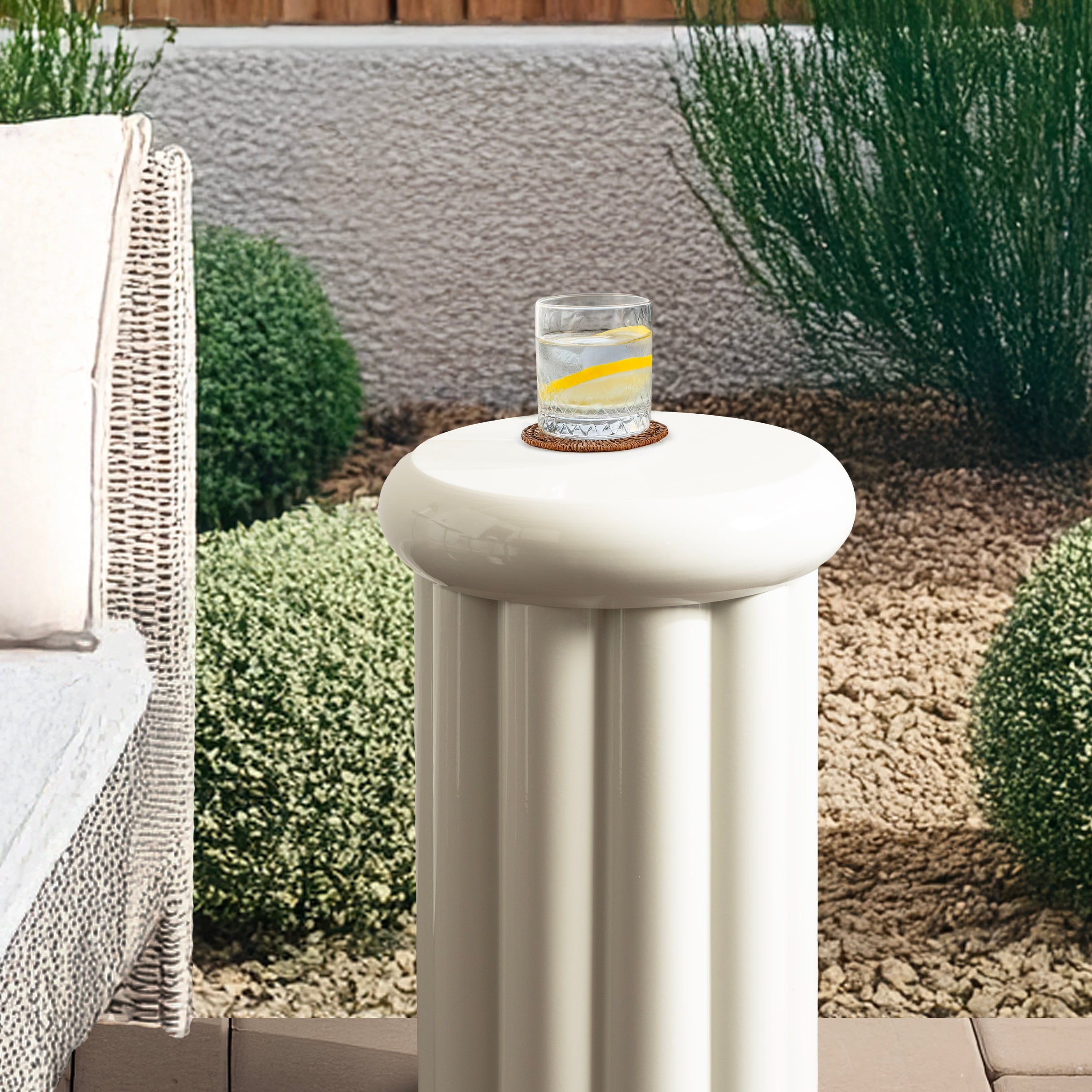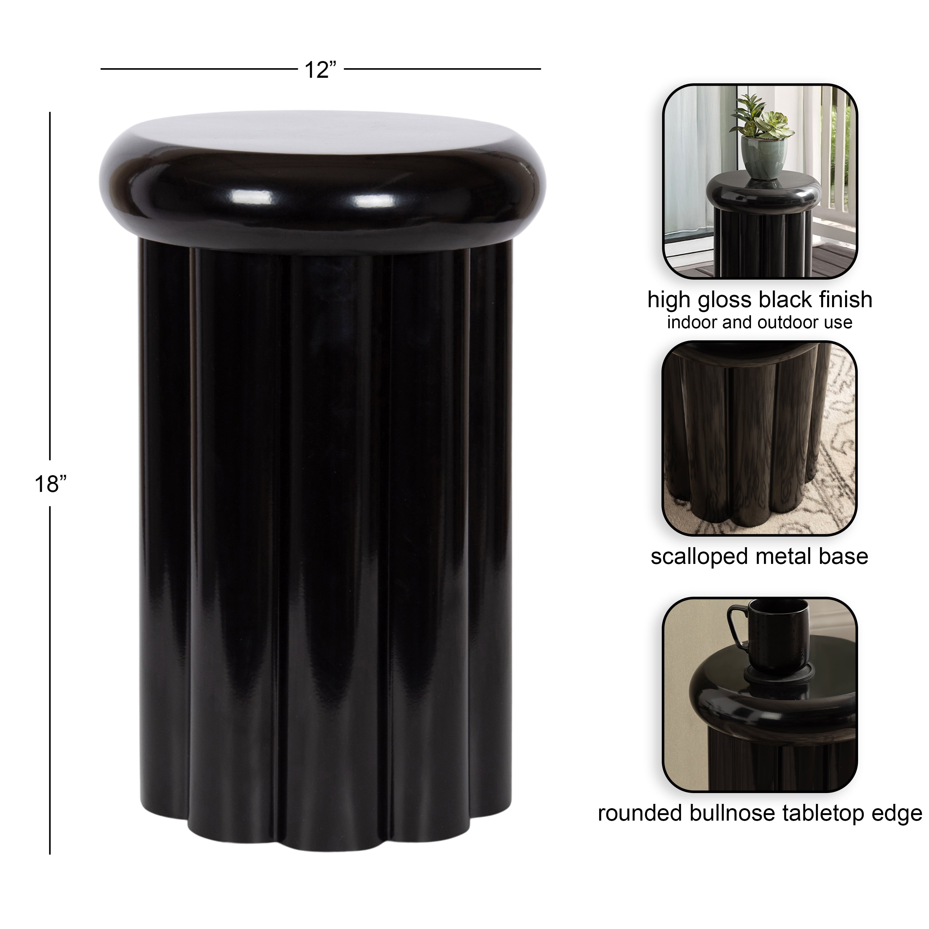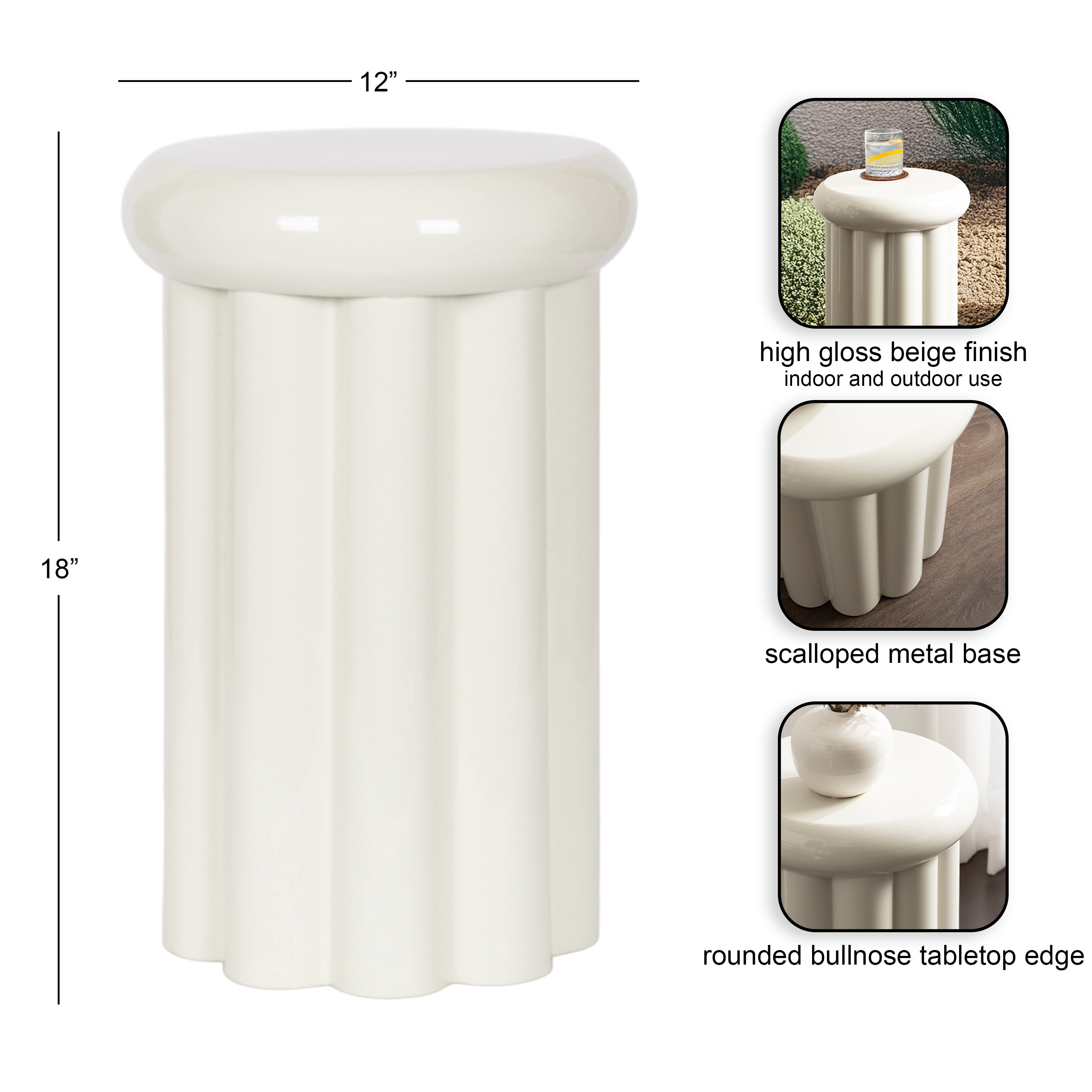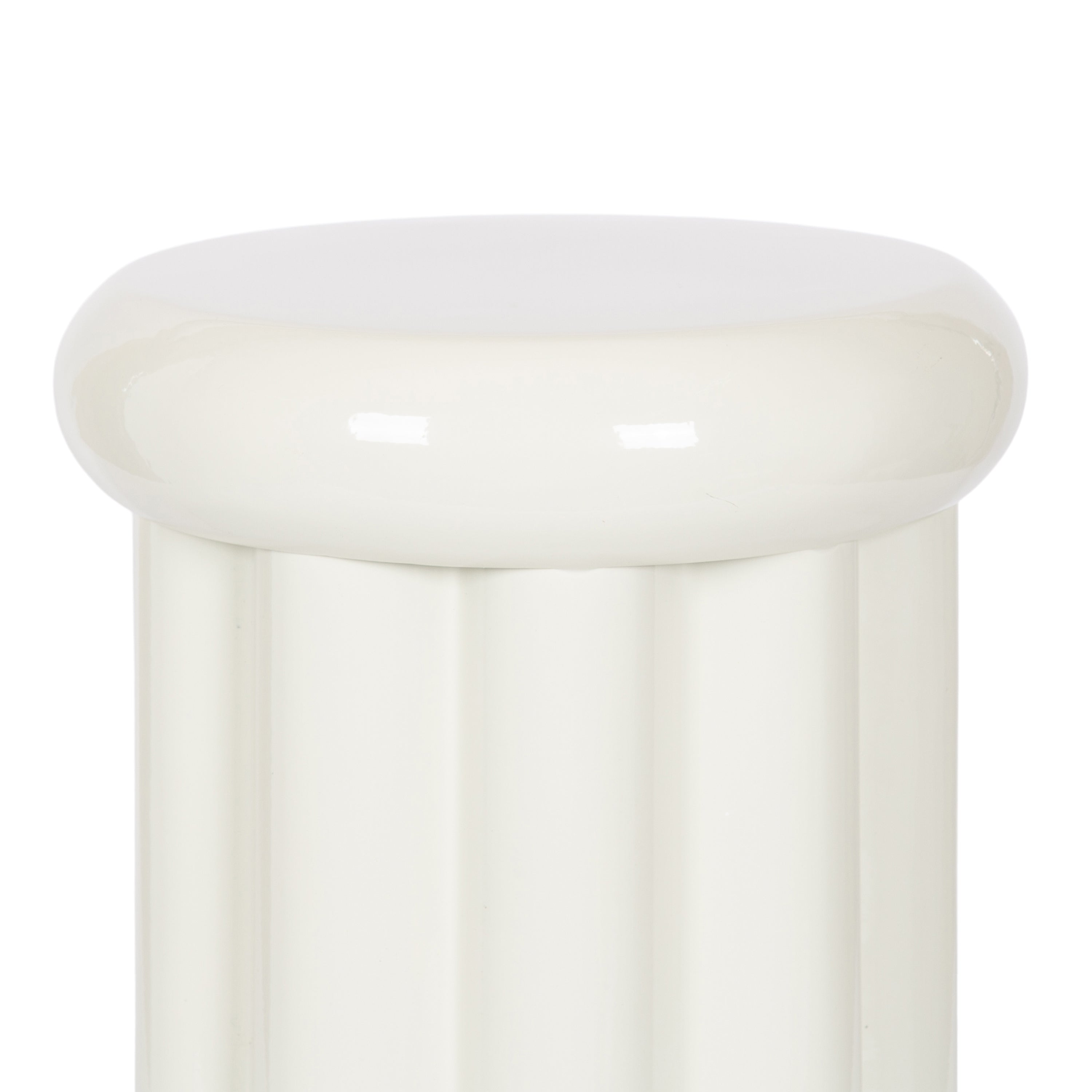 Showcase your modern-inspired style with the Jace round side table from Kate and Laurel. The timeless and modern glossy finish of the metal adds a touch of sophistication to any space, while the unique curvature of the design makes it easy to blend seamlessly with a variety of decor styles. However, the chunky ribbed table base and the bullnose tabletop edge make it a youthful living room accent table. Due to its outdoor-safe construction, this versatile end table can be used with your back patio or porch decor setup. The round tabletop is perfect for creating a curated display area for candles, small lamps, and other accents. Arriving fully assembled, this charming outdoor table can be showcased right out of the packaging.